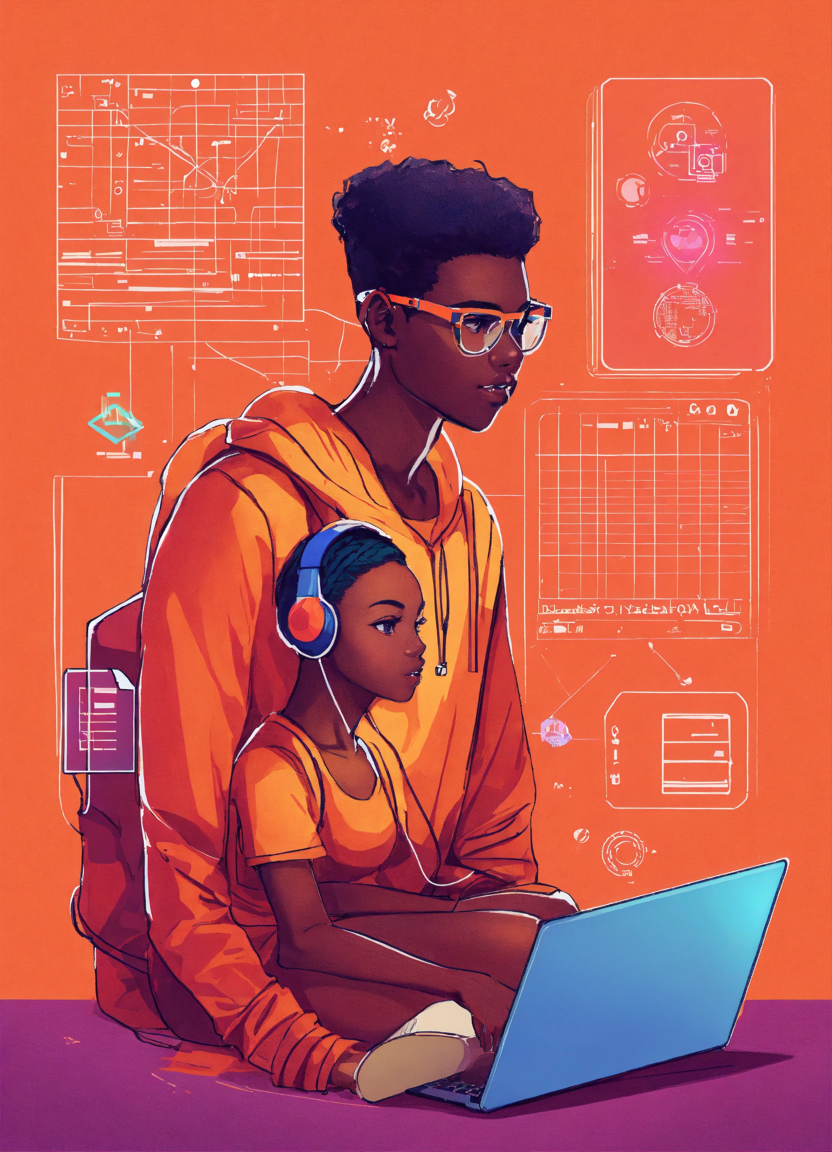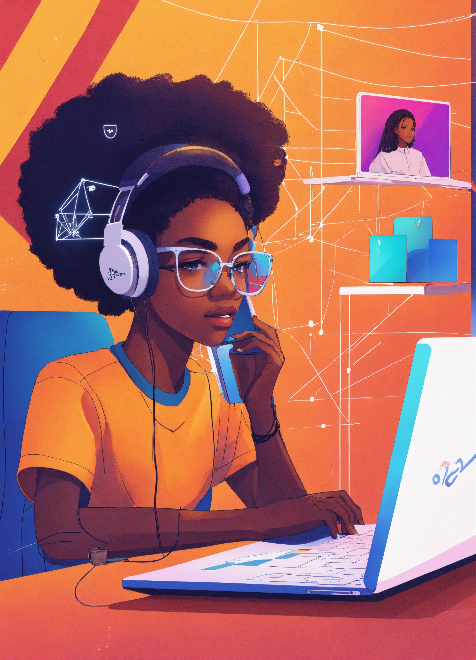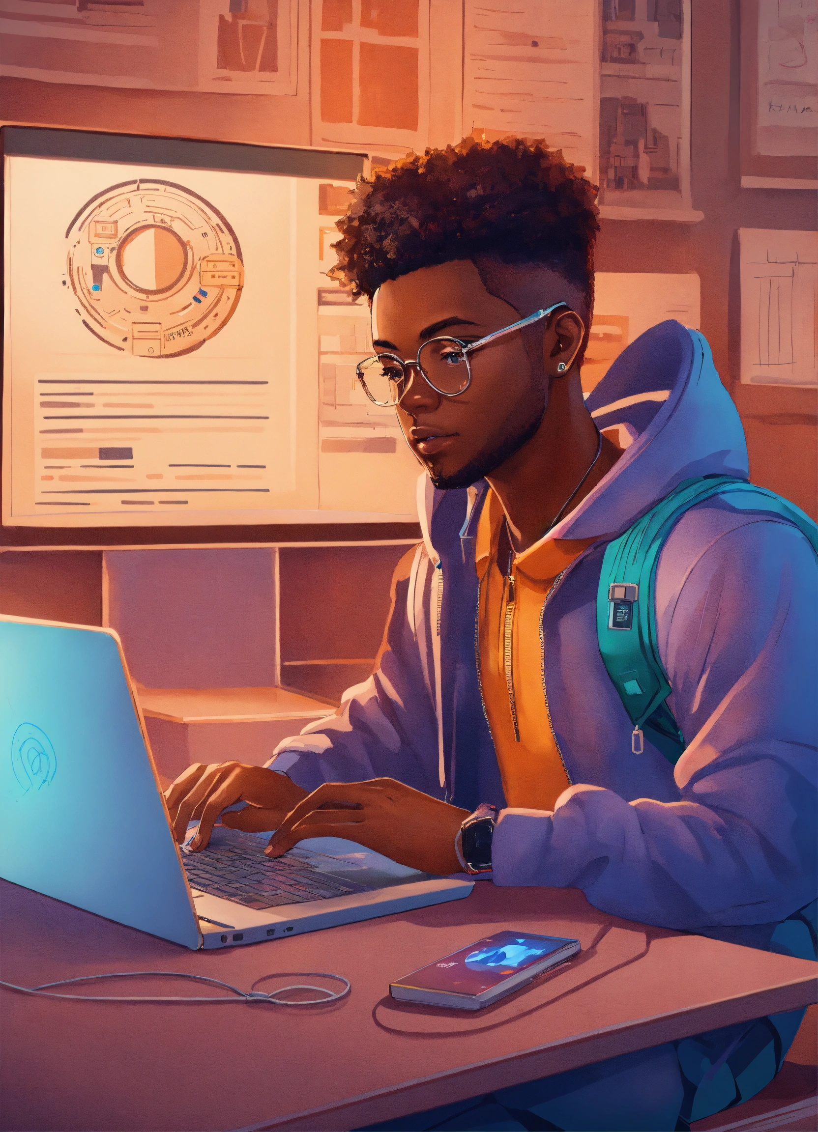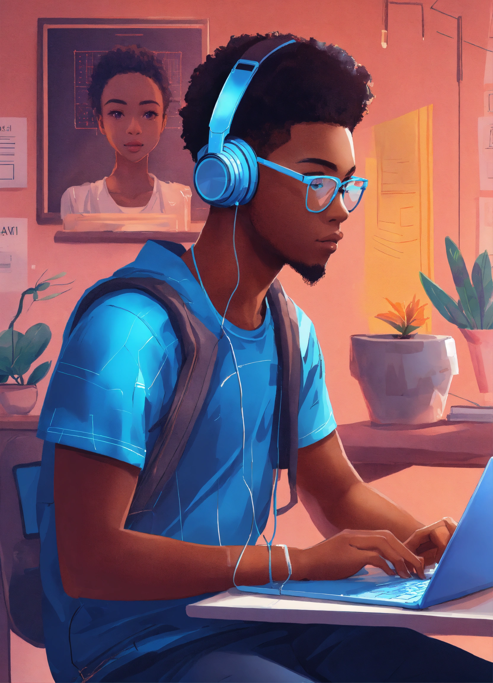 High quality illustration, trending on artstation, african student sitting in front of a laptop, taking an online exam. above the laptop, an icon of a camera with facial recognition lines scanning the student's face.