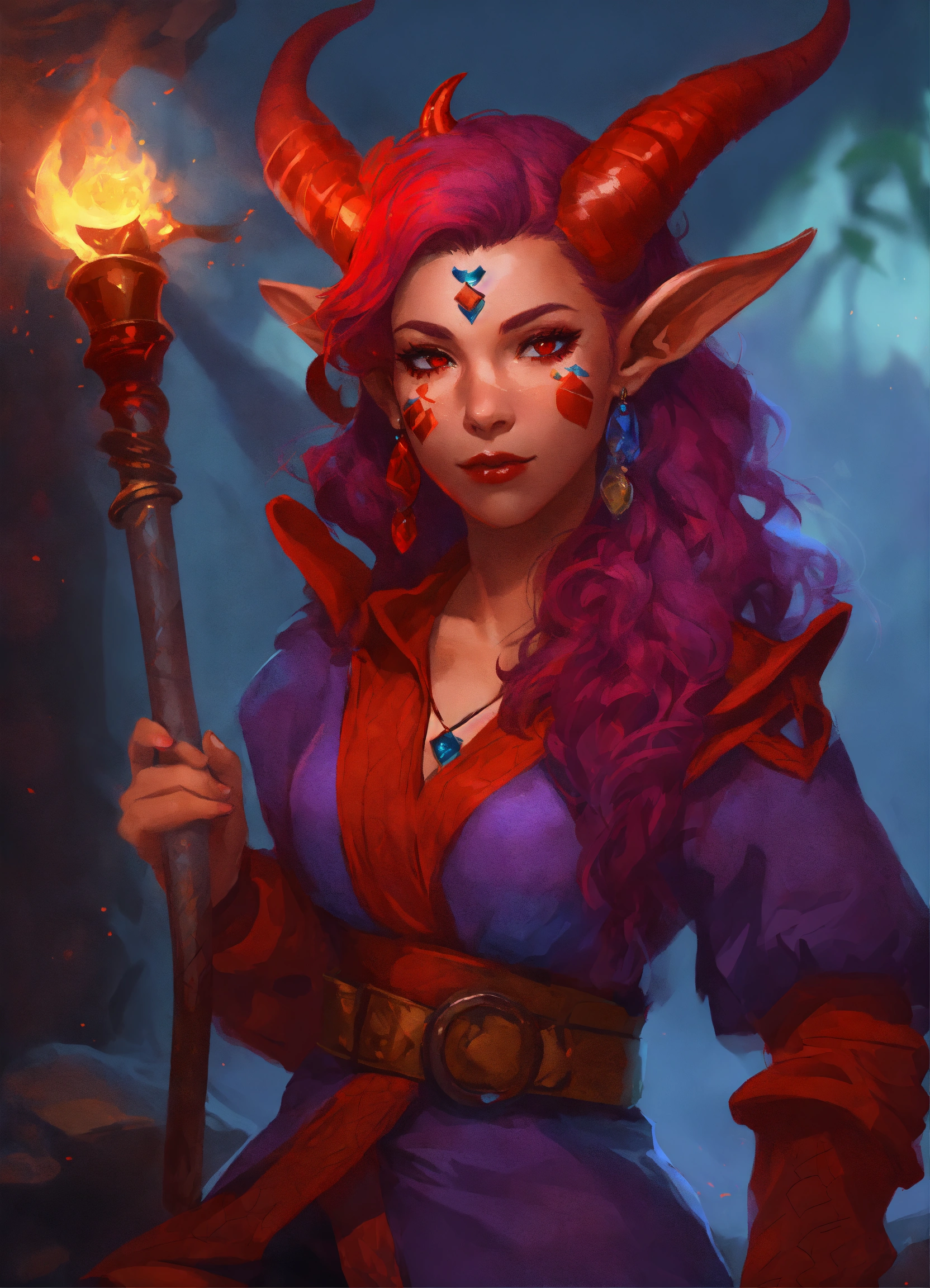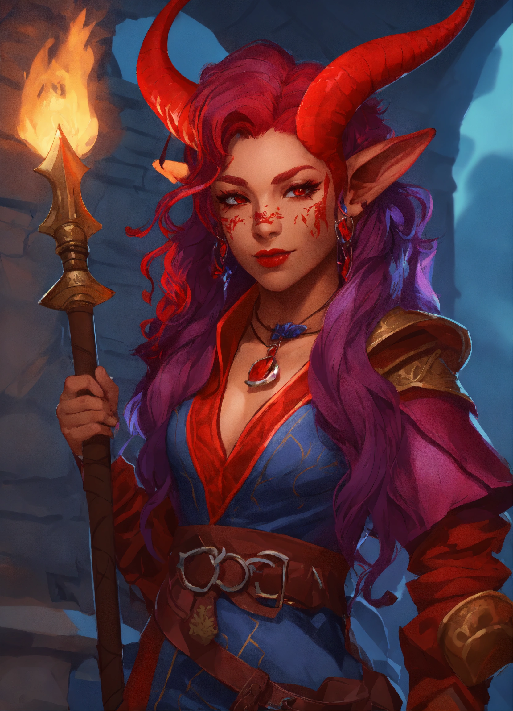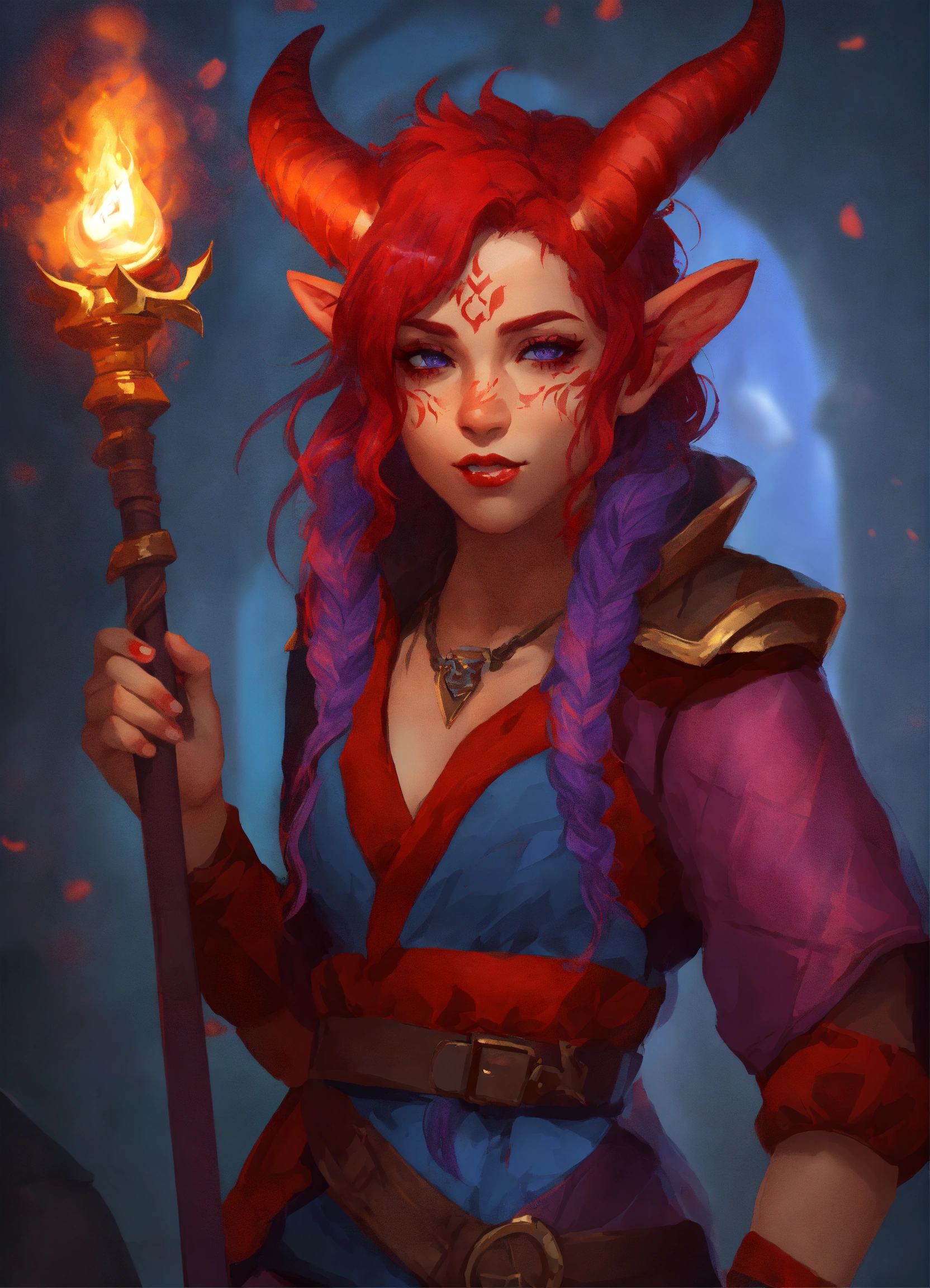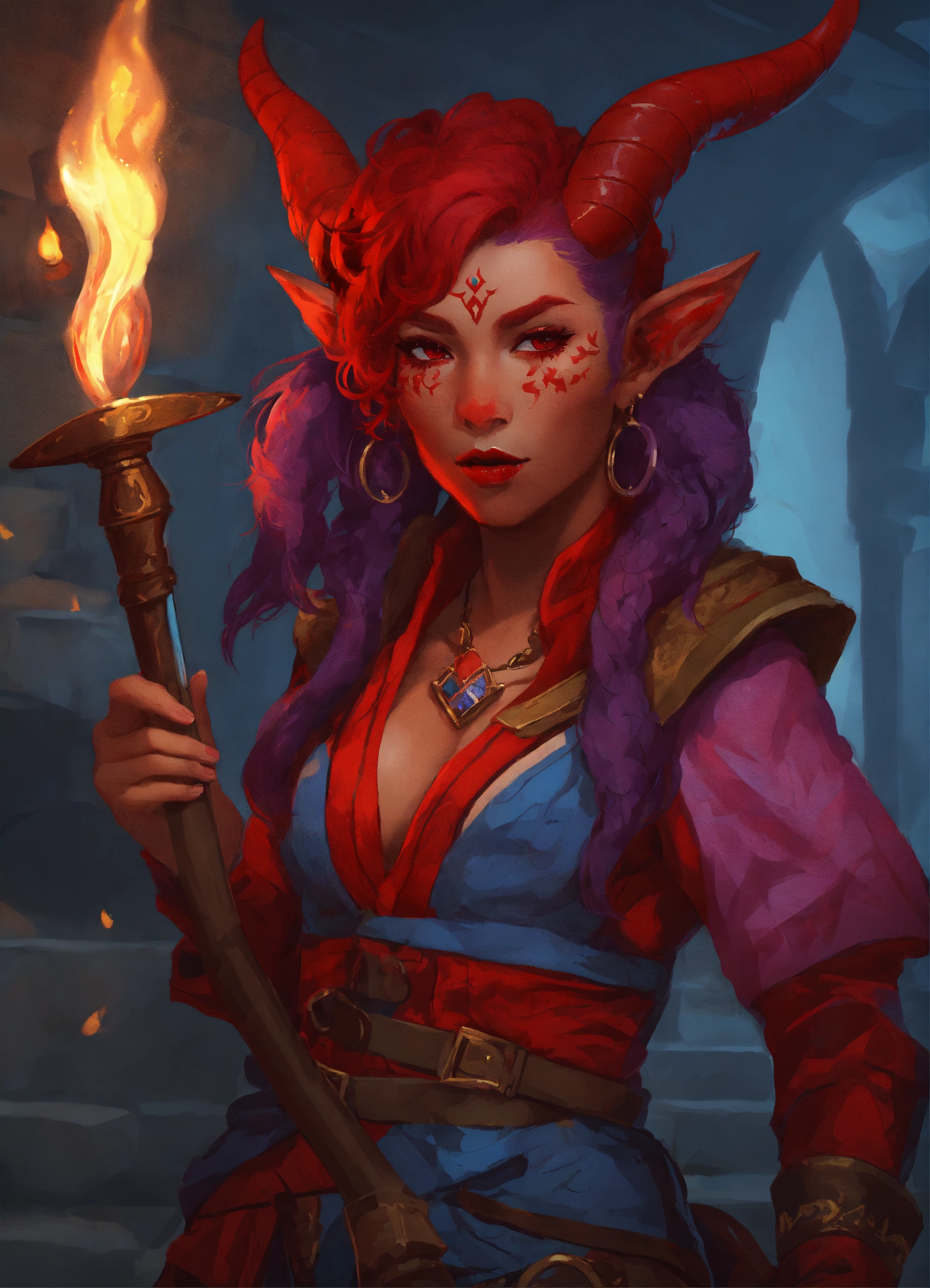 A teifling from dnd 5th edition with red curled horns and red skin, she has red skin with some patches of blue dragon scales and purple hair