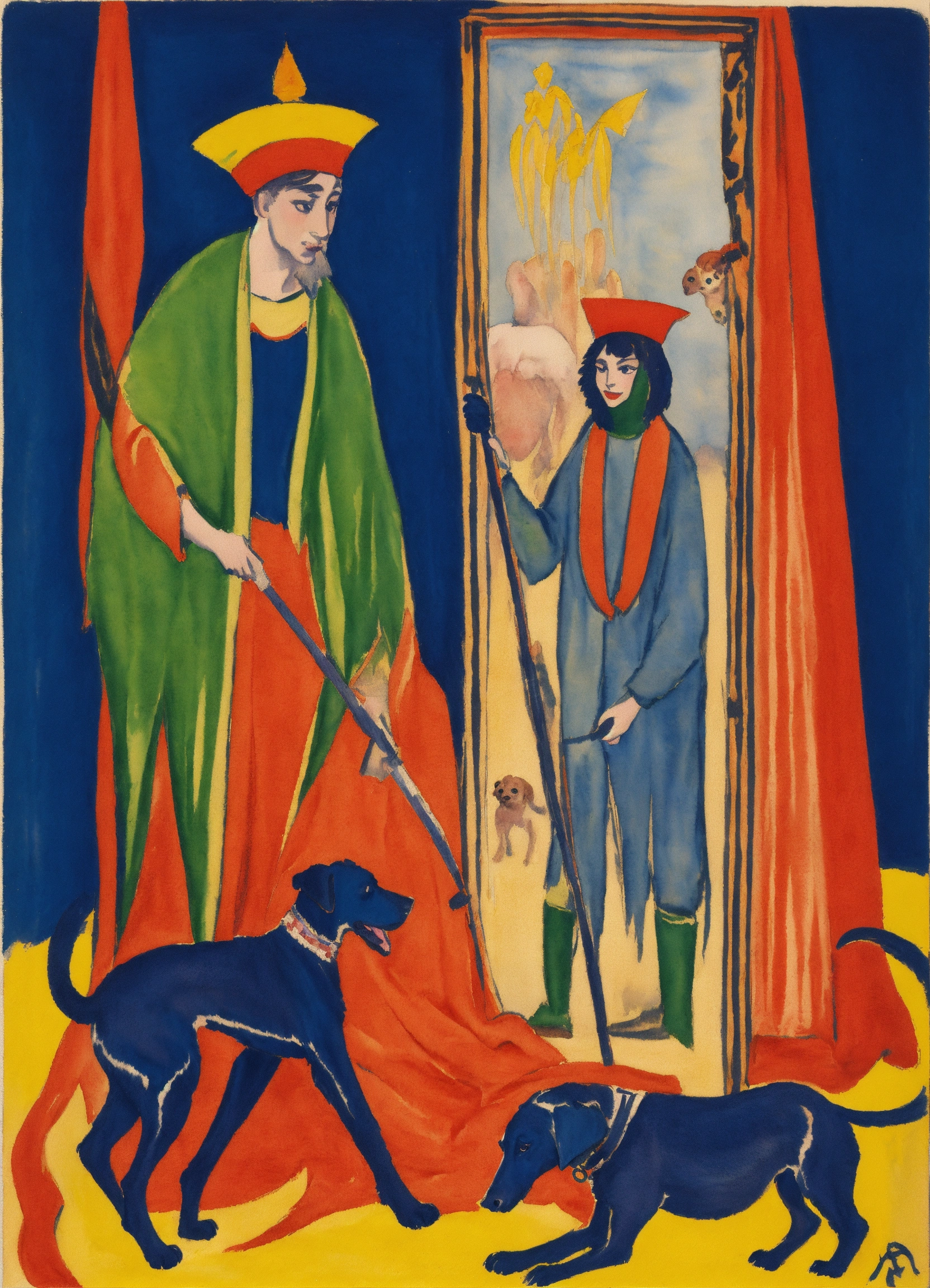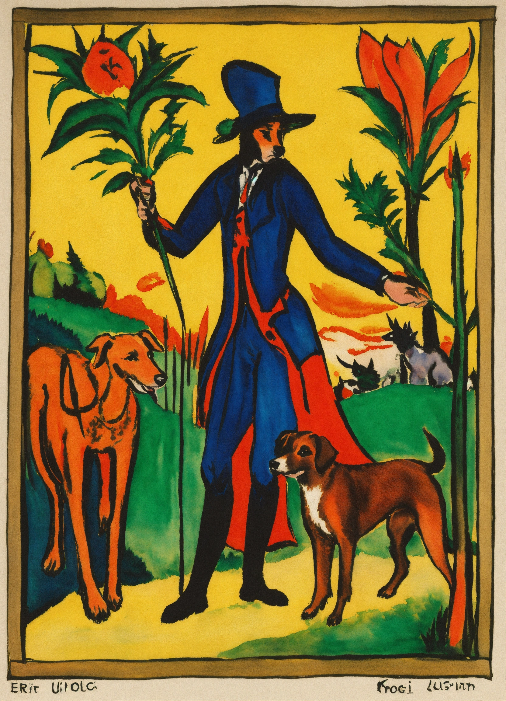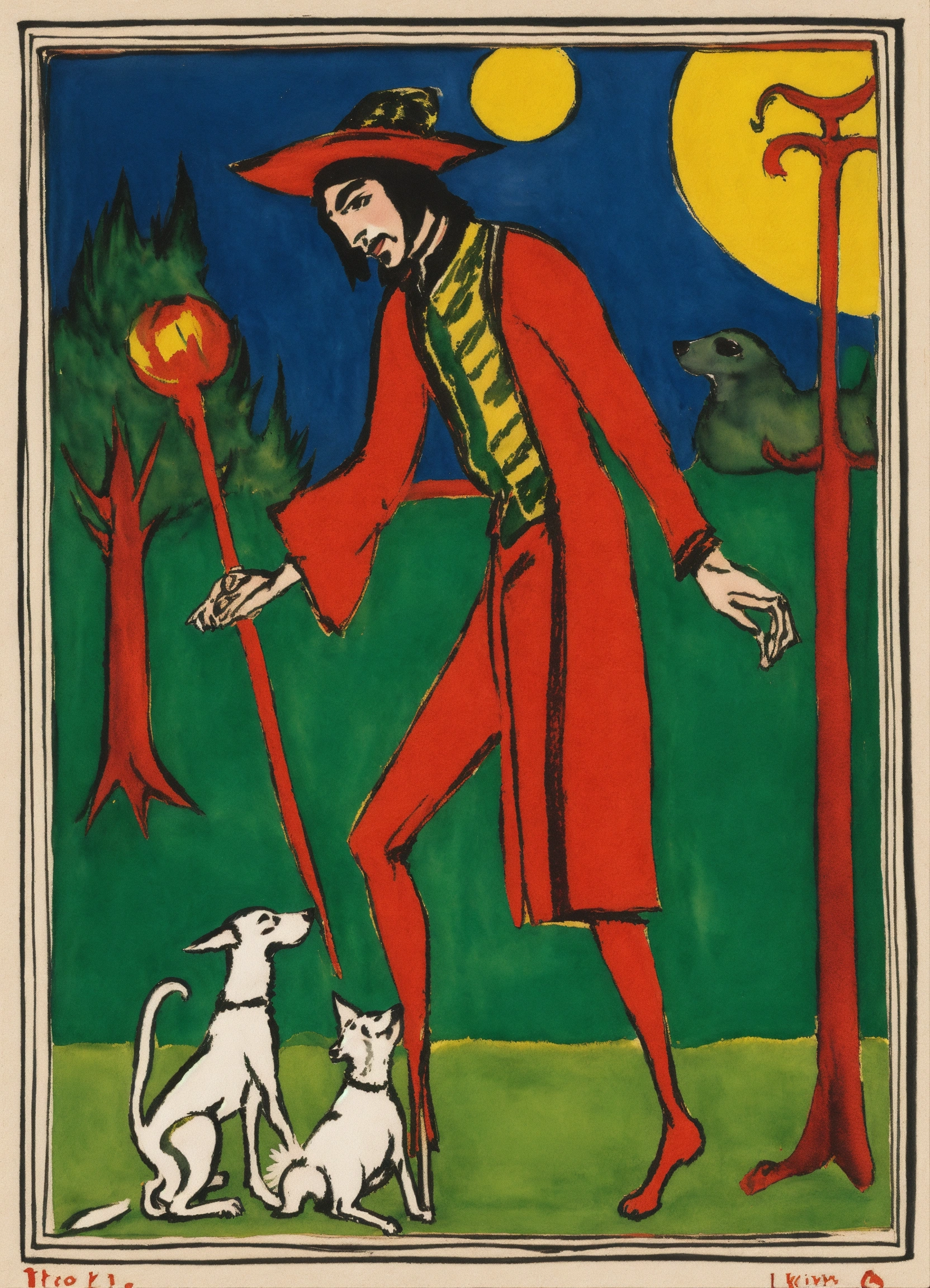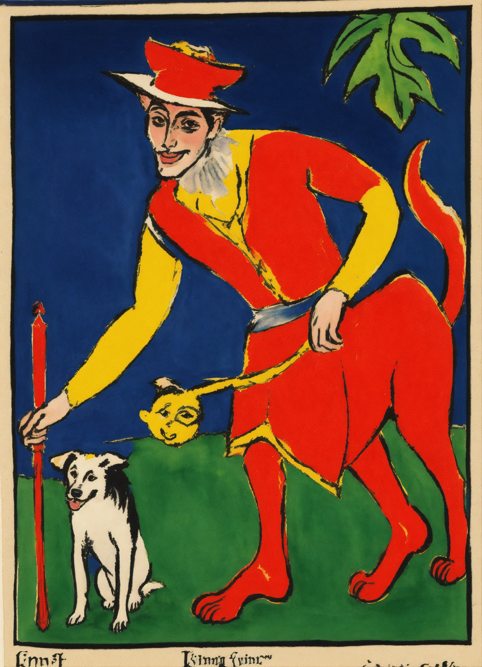 Ernst ludwig kirchner peinture, aquarelle, representation of the fool card, in the tarot. a character with a bundle followed by a dog that kills his calves