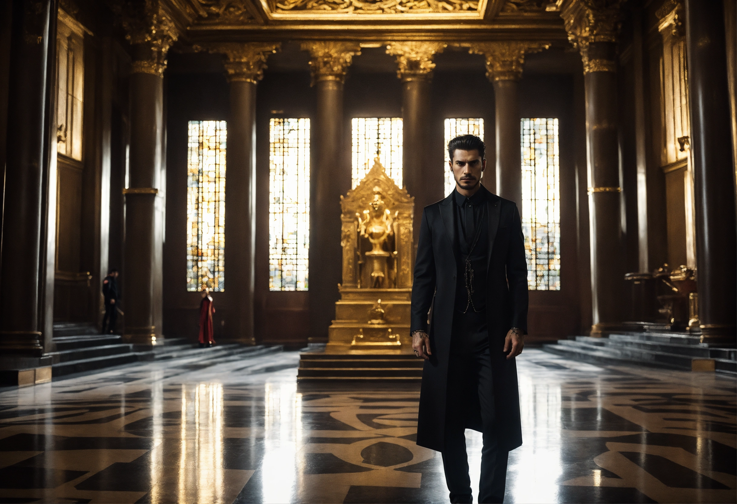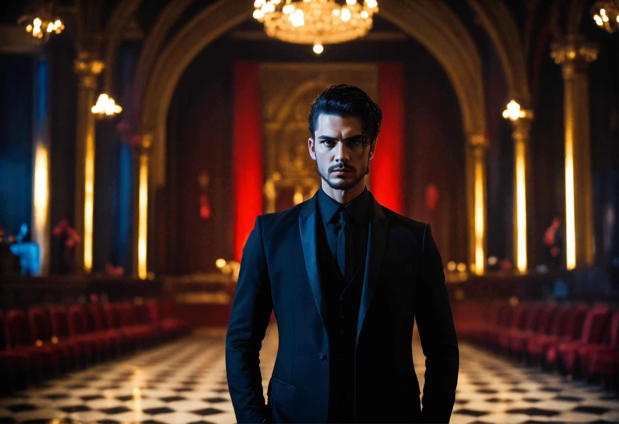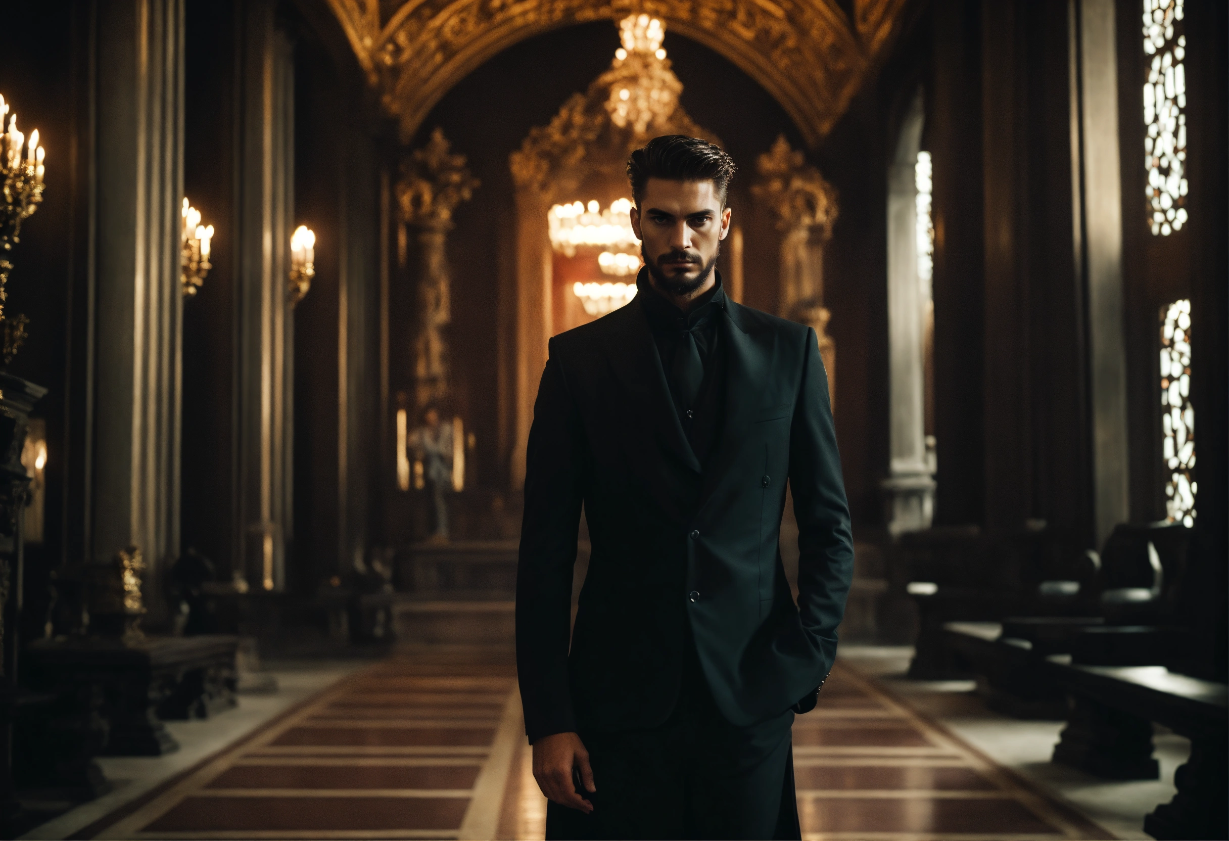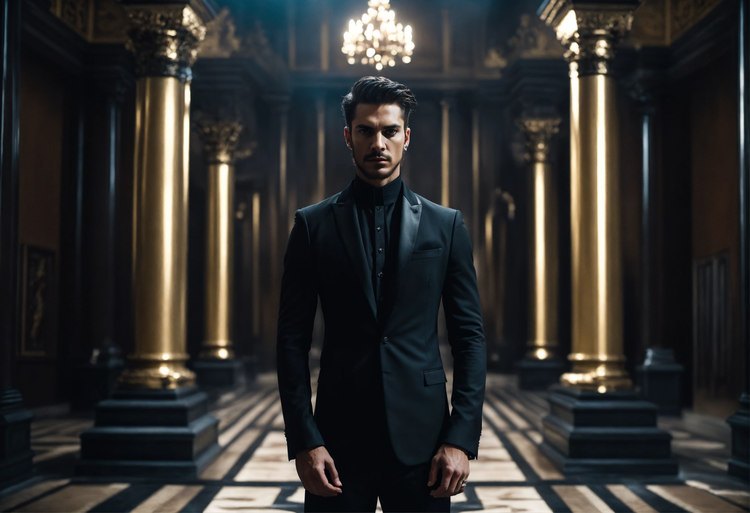 Sinister and dramatic portrait of a young handsome cult leader wearing luxurious dark clothes, in a sinister looking modern temple hall