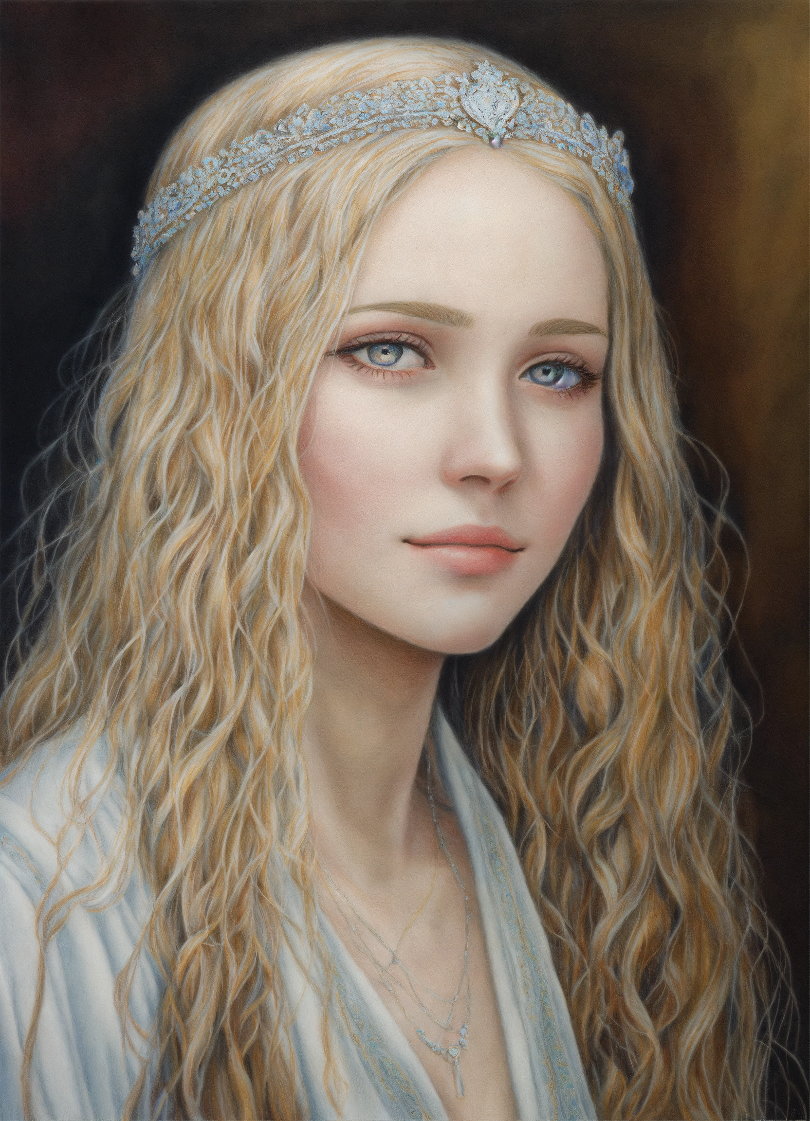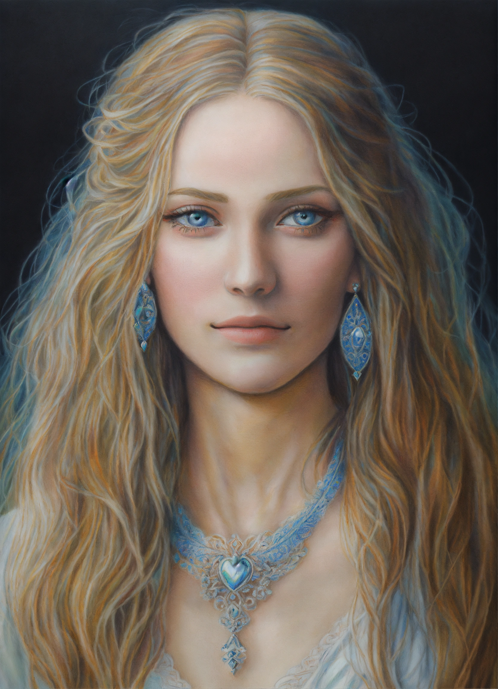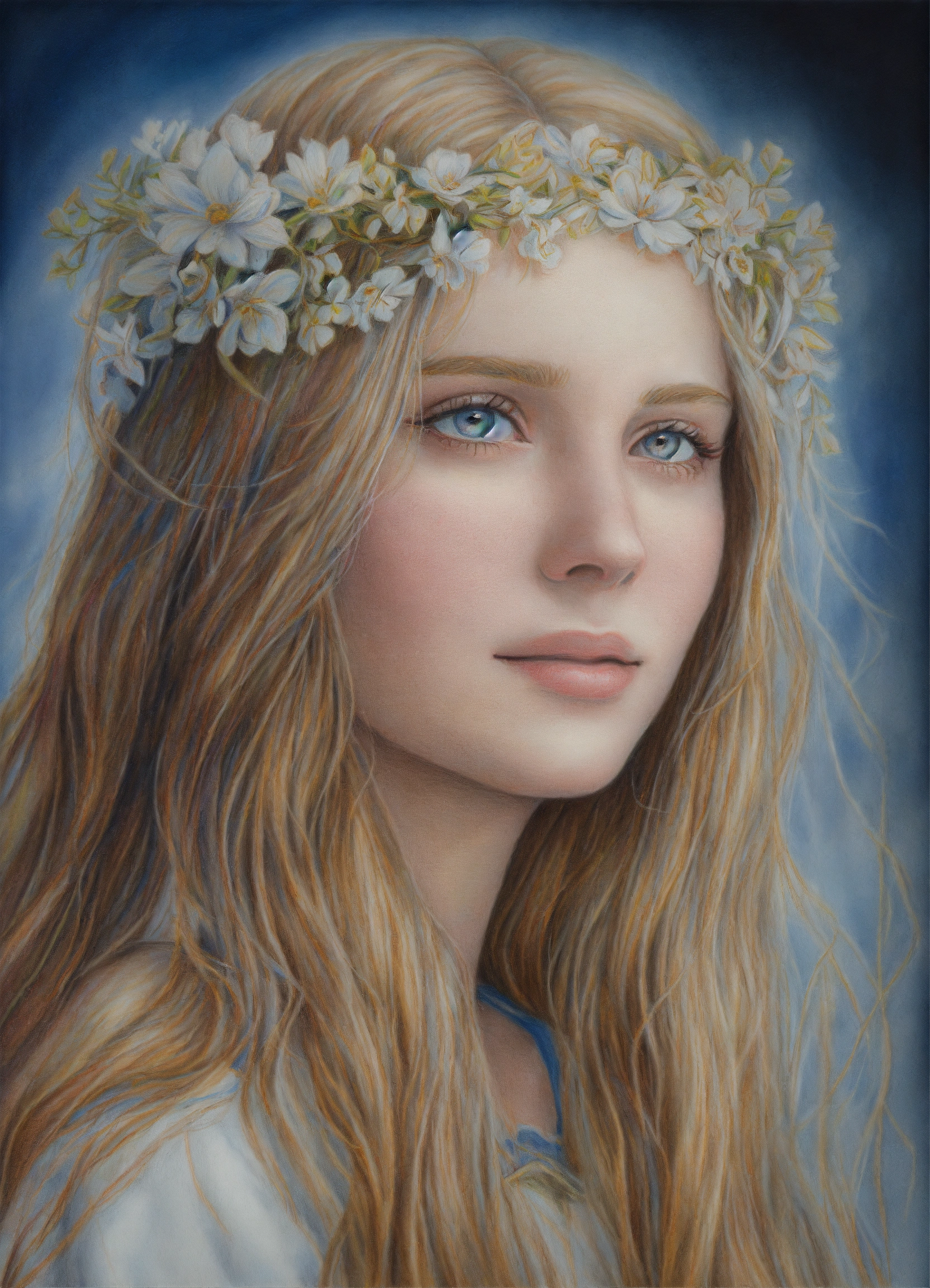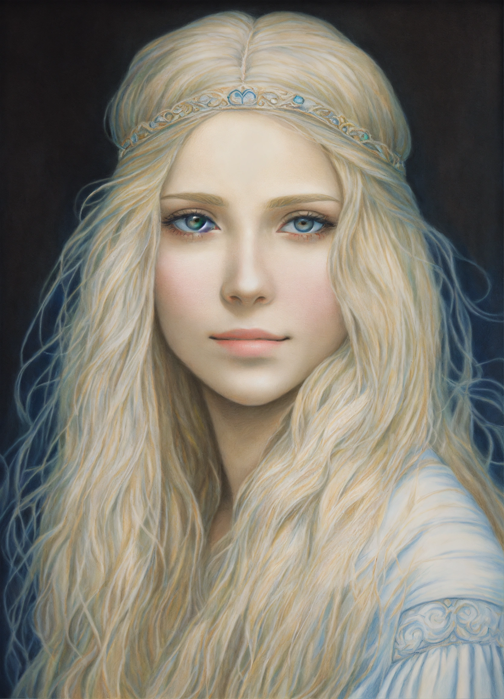 Realistic colored pencil drawing portrait of a blind spiritual princess. extremely long hair, white eyes, extremely white skin, sad smile. loving. innocent.