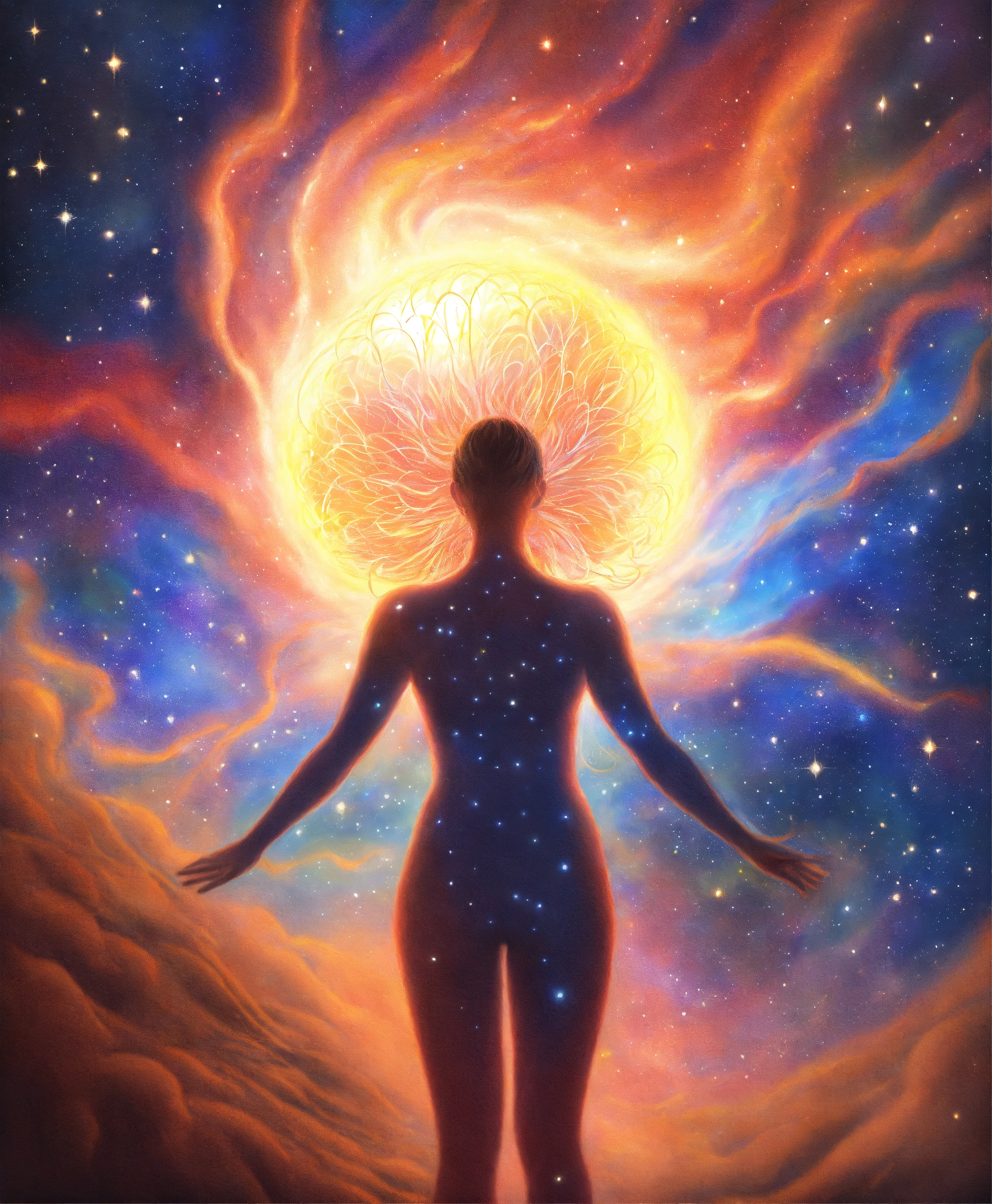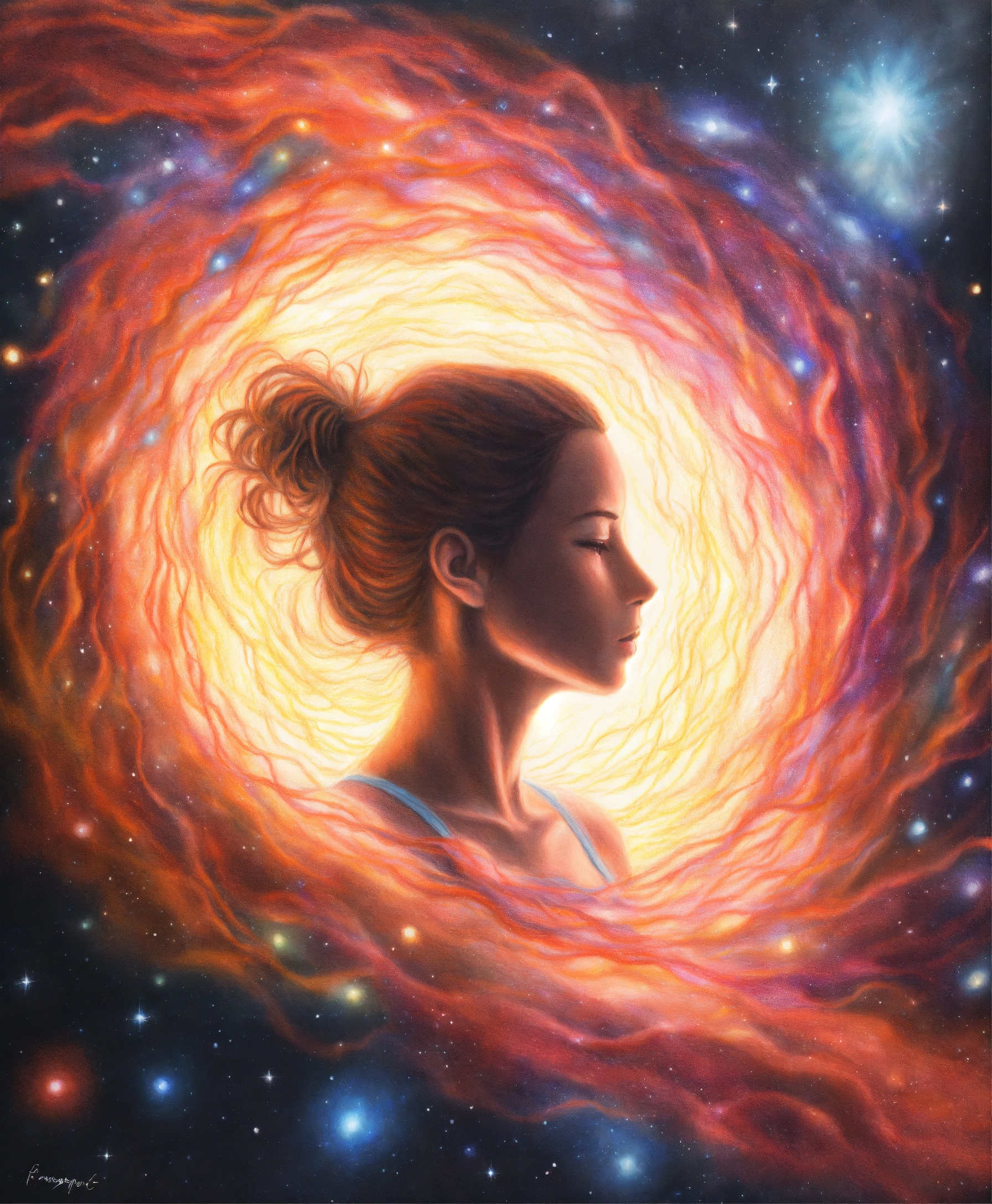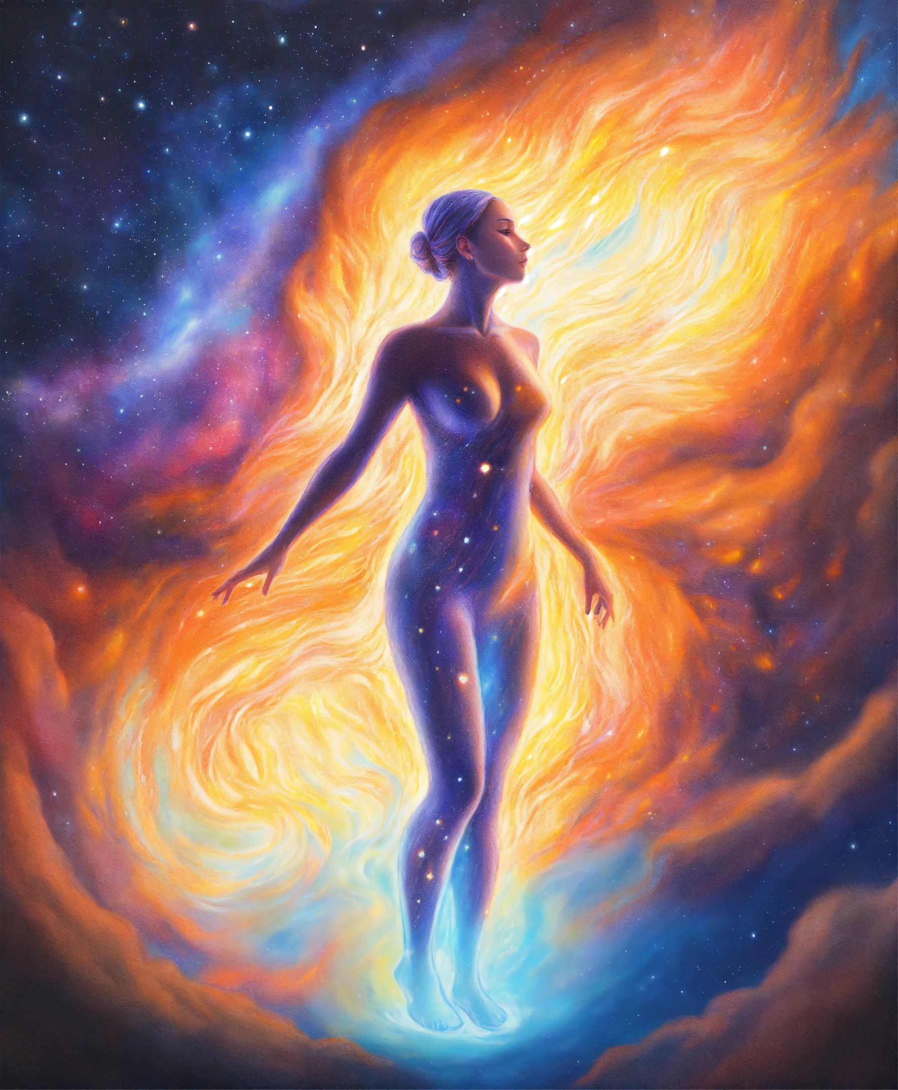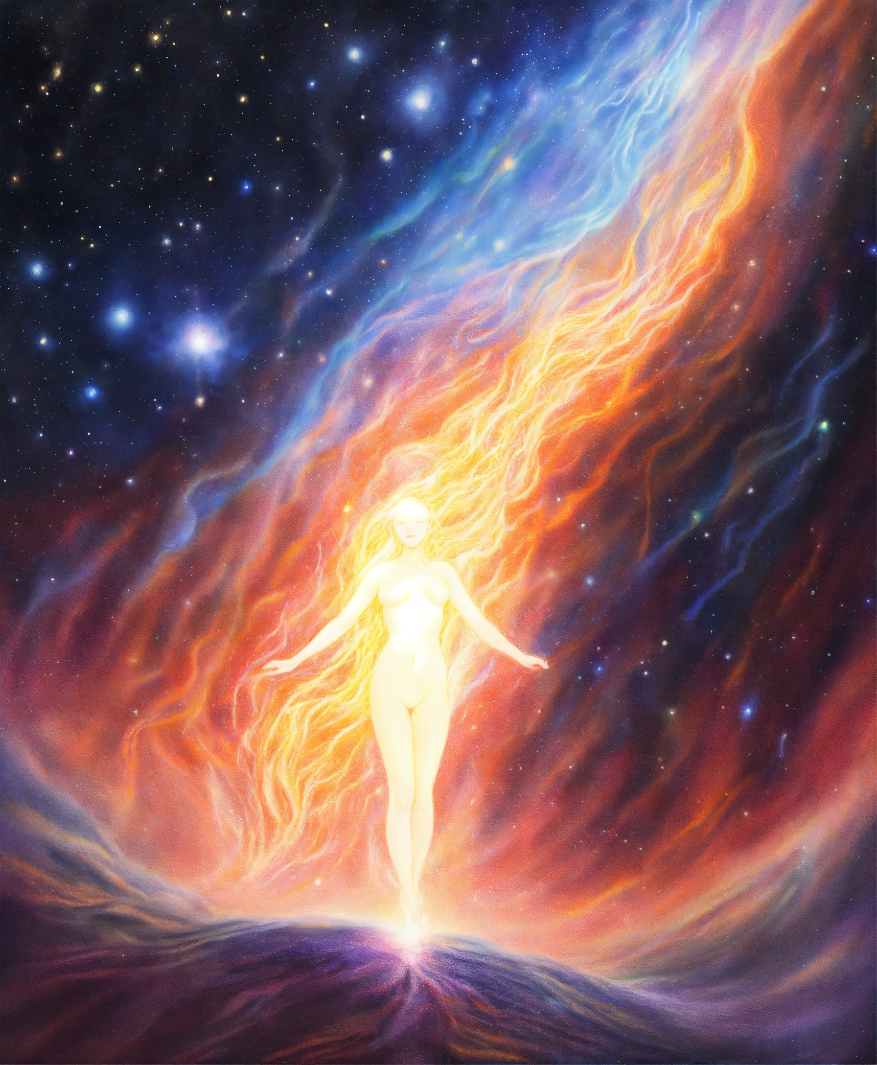 Realistic colored pencil drawing of a current of energy around a formless female human silhouette of light, galaxy nature background
