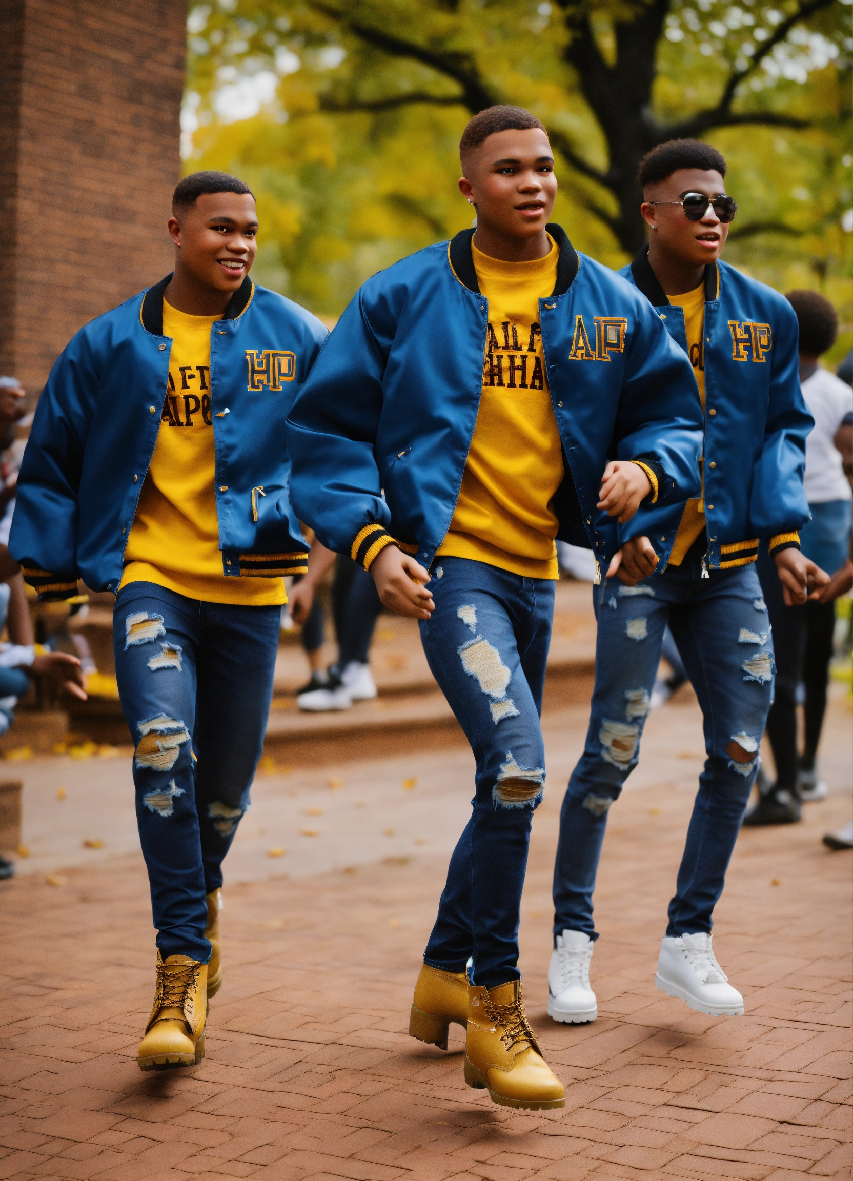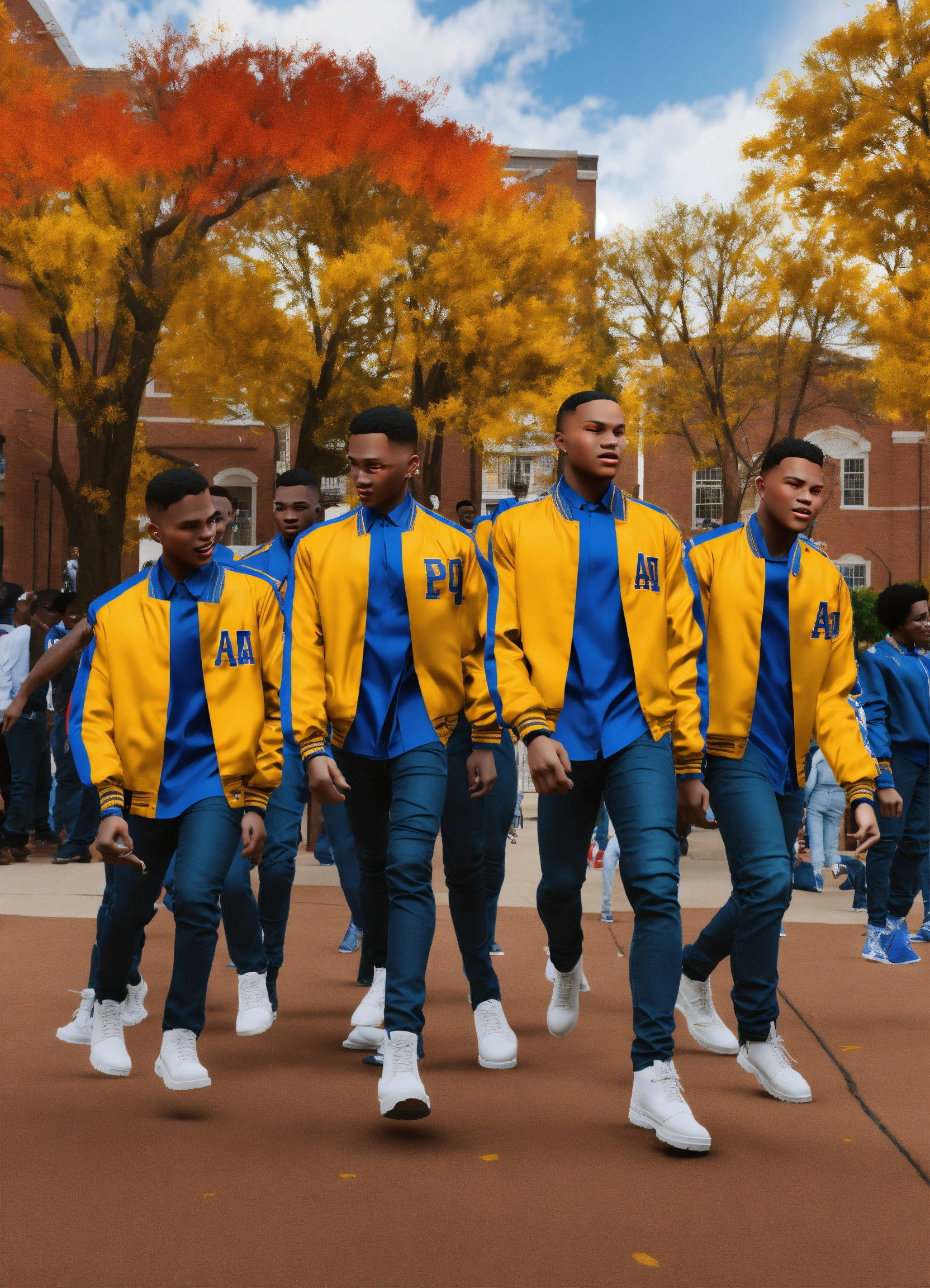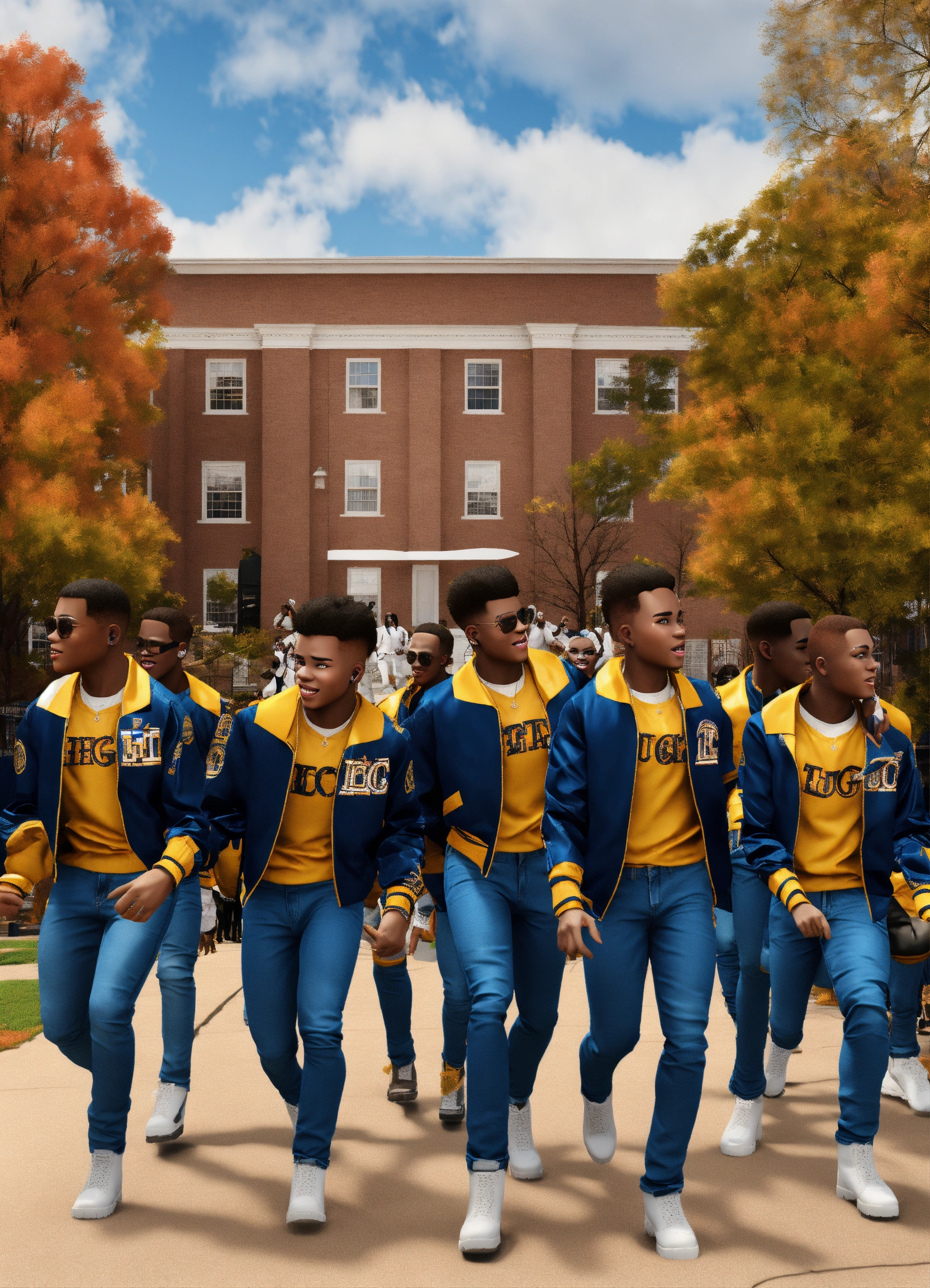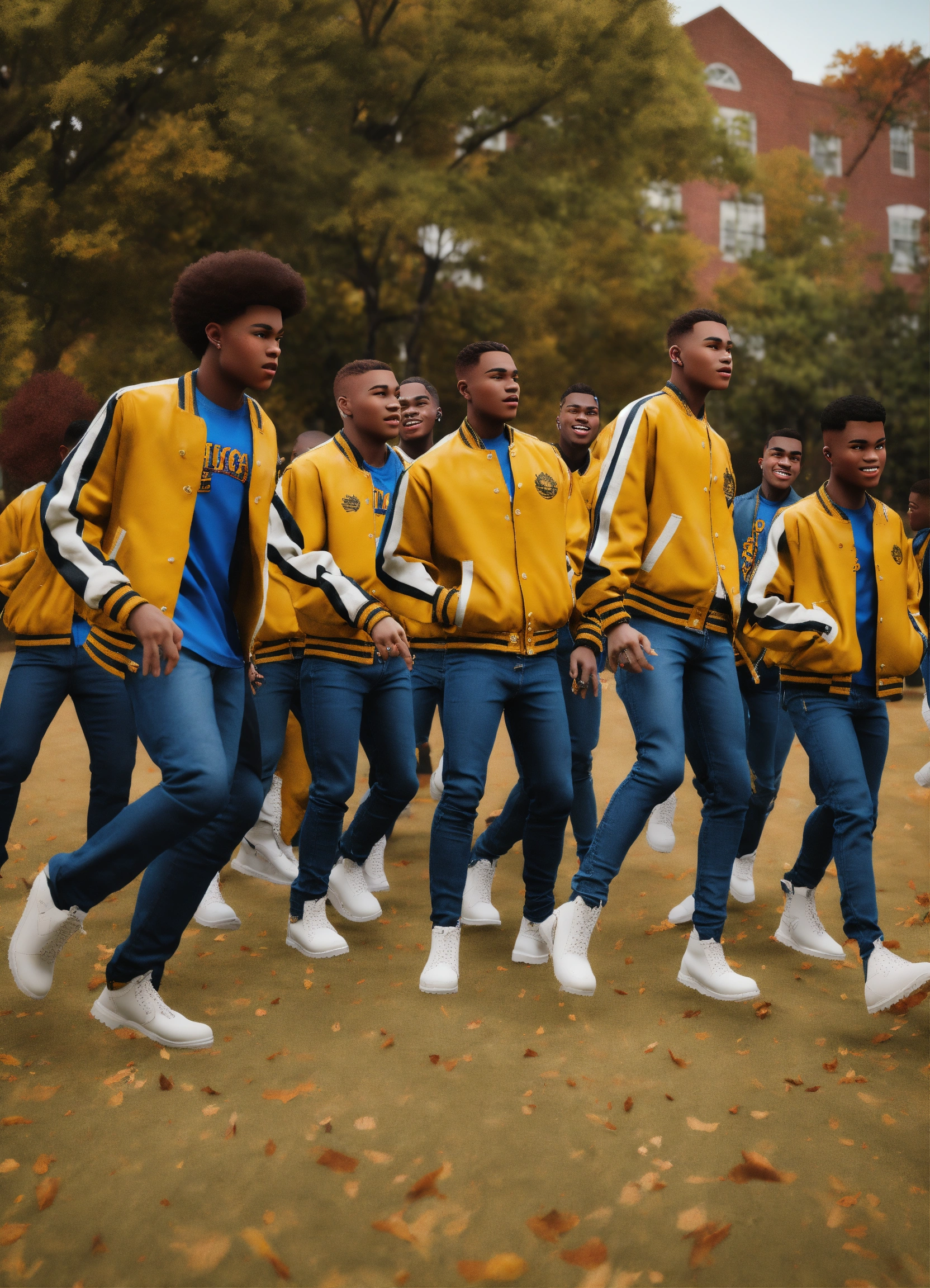 Hbcu at morehouse college in the fall, a diverse group of handsome african american young boys with tapered short haircuts, step dancing at a step show with their black alpha phi alpha jackets, gold shirts, black timberlands, loose blue jeans, 3d animation, 3d render (((no deformation))), (((no extra fingers))), (((no ugly people)))