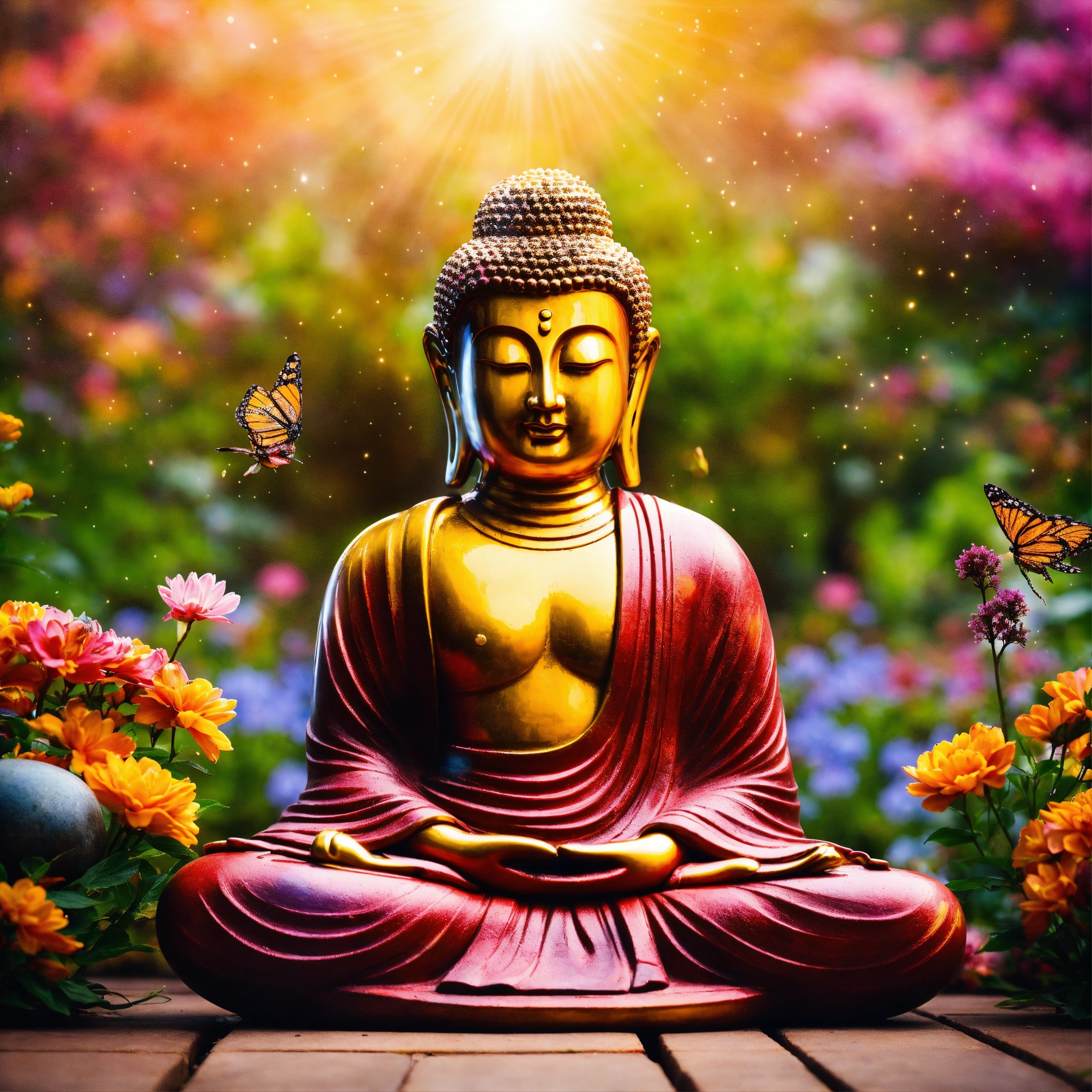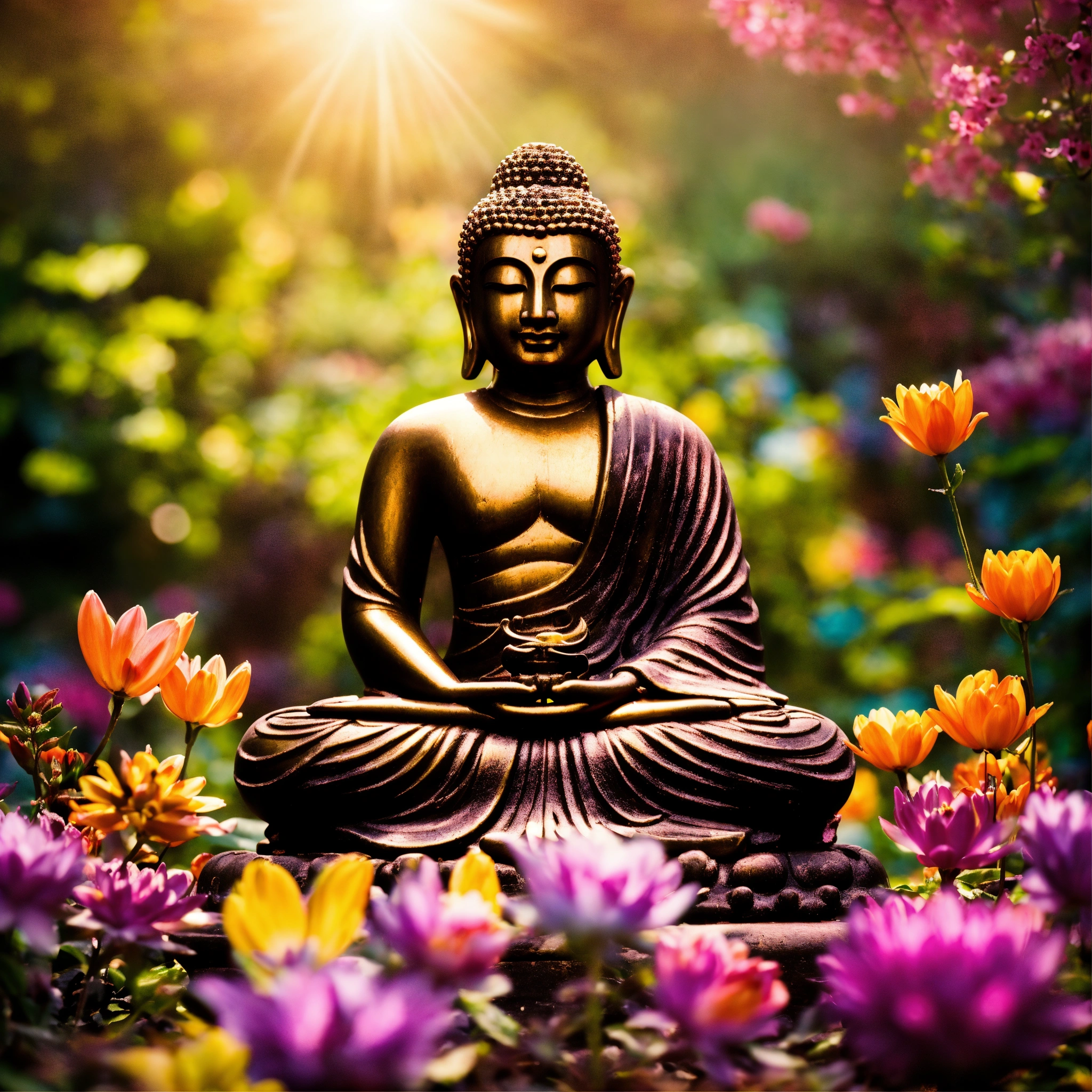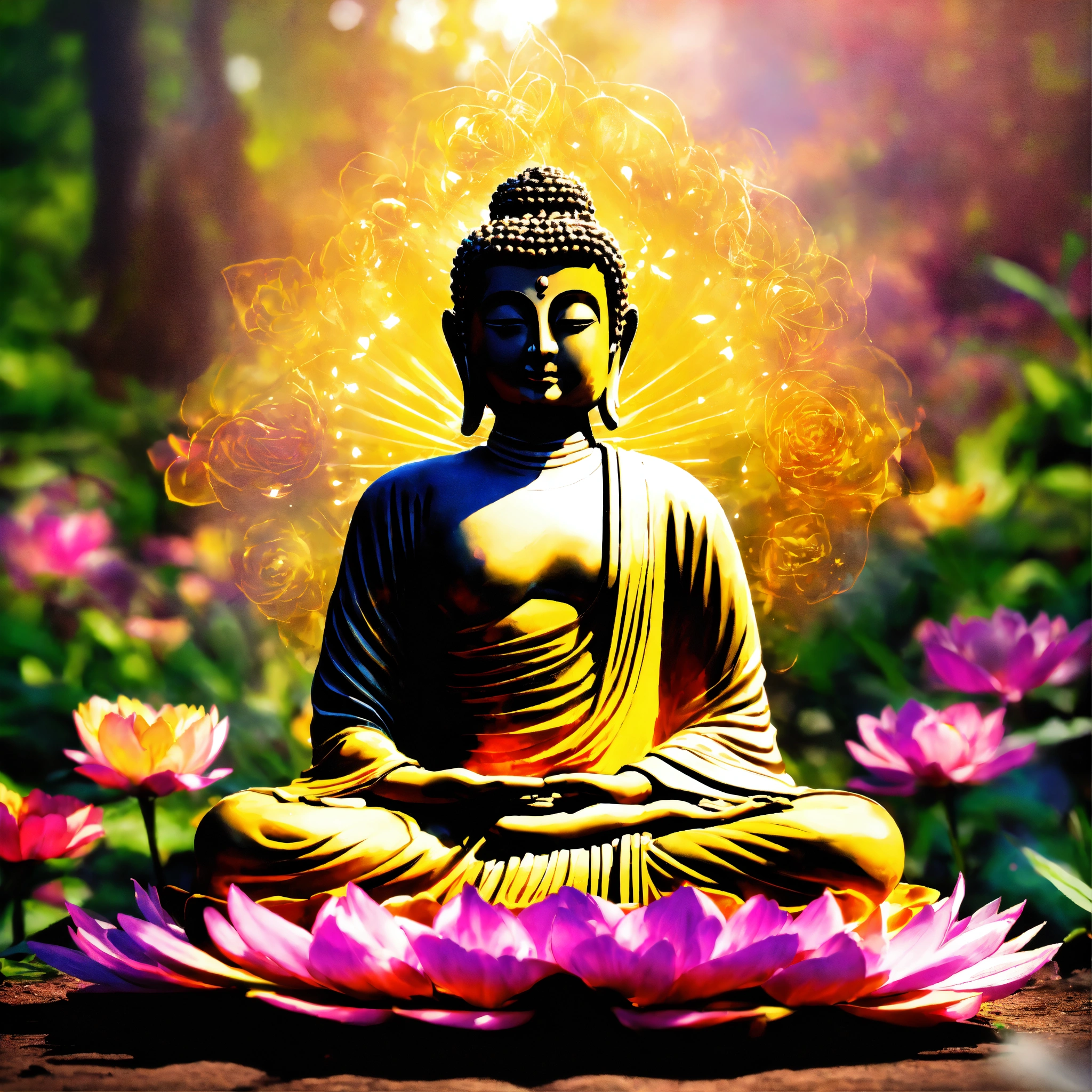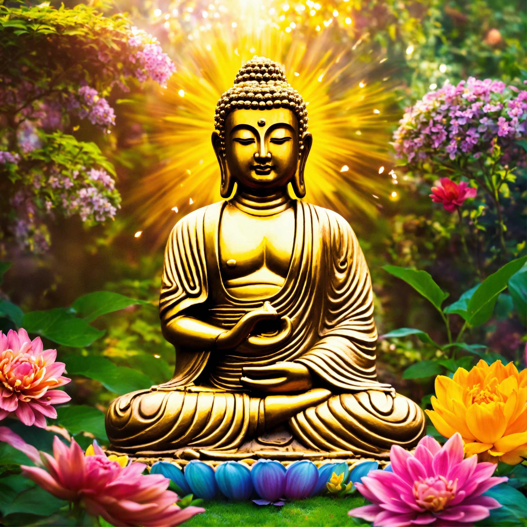 Buddha in a garden with vibrant flowers in meditation with mystical light emanating from him