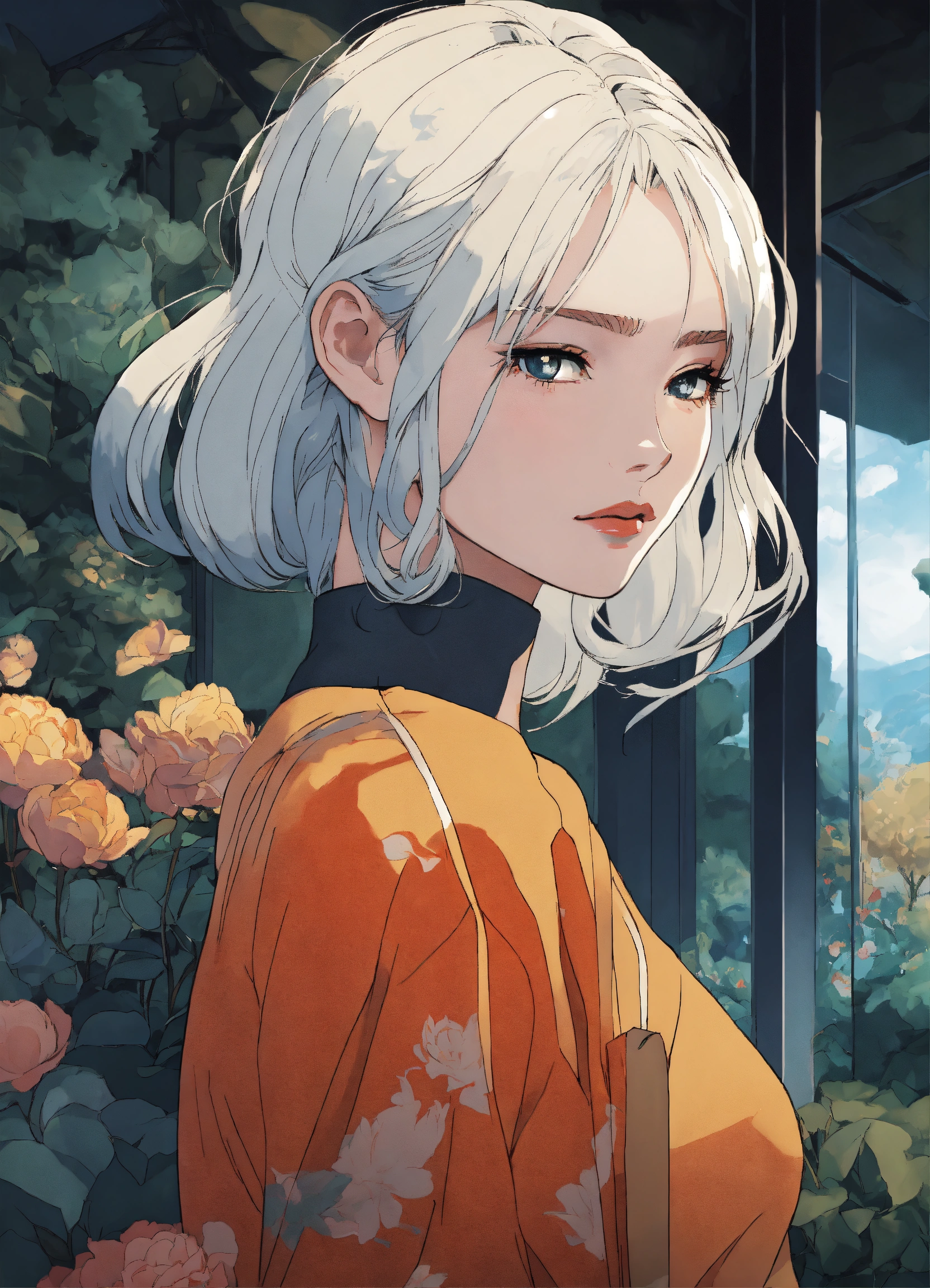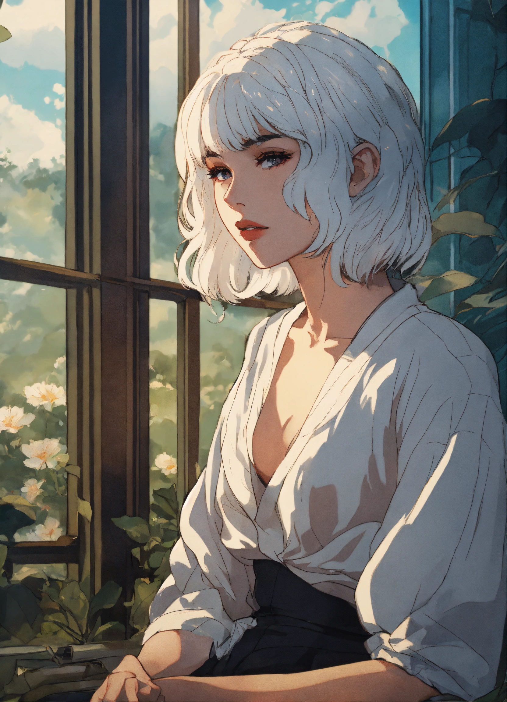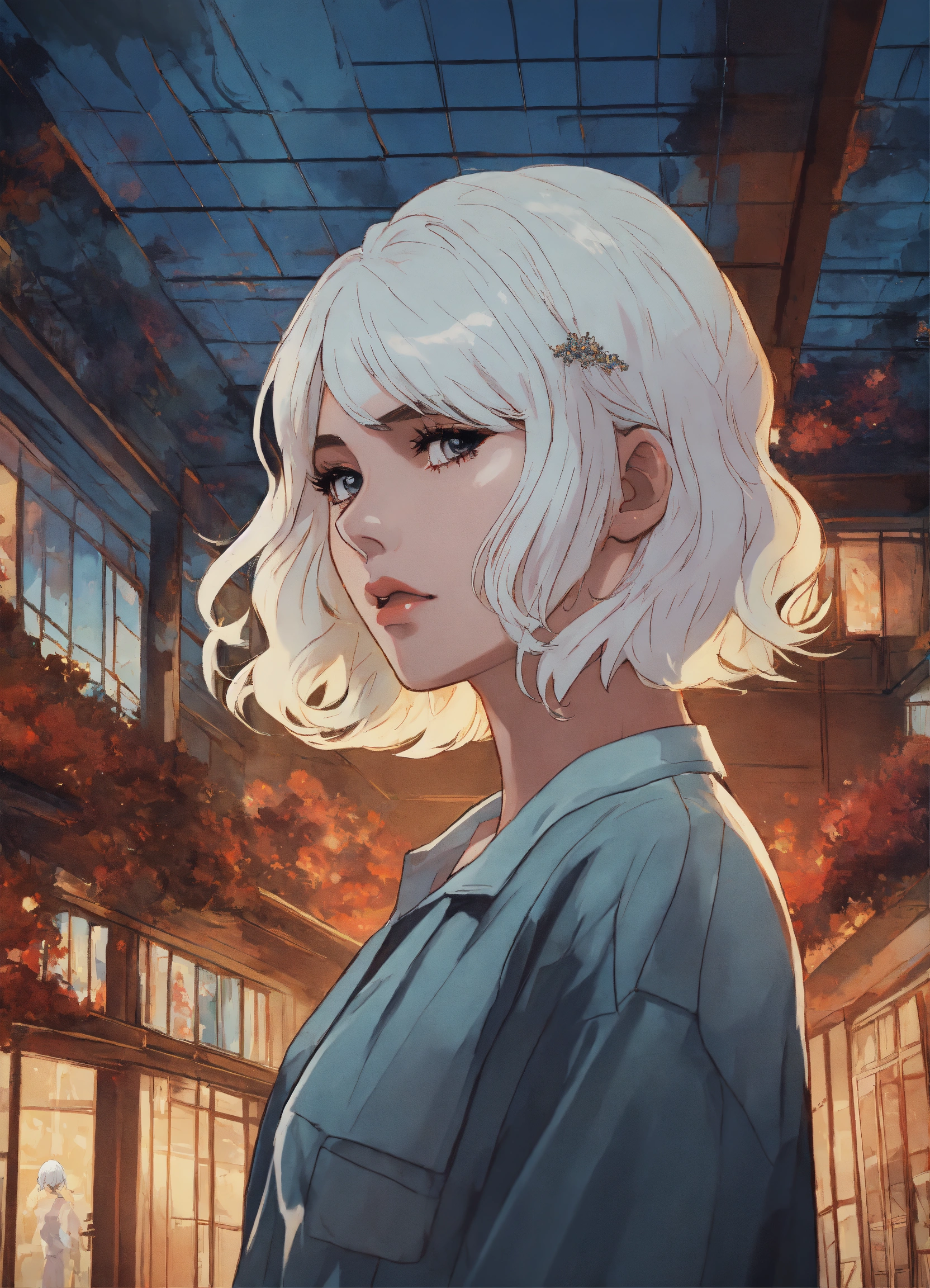 Glass house. a young woman with white hair, bang. stunning beautiful artwork, gloomy, 8k, maximalist, 8k retro anime art, vintage 90's anime, akira style