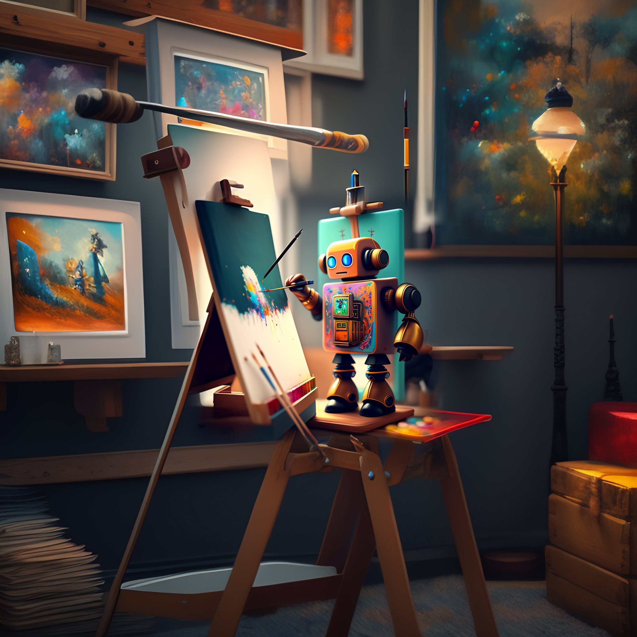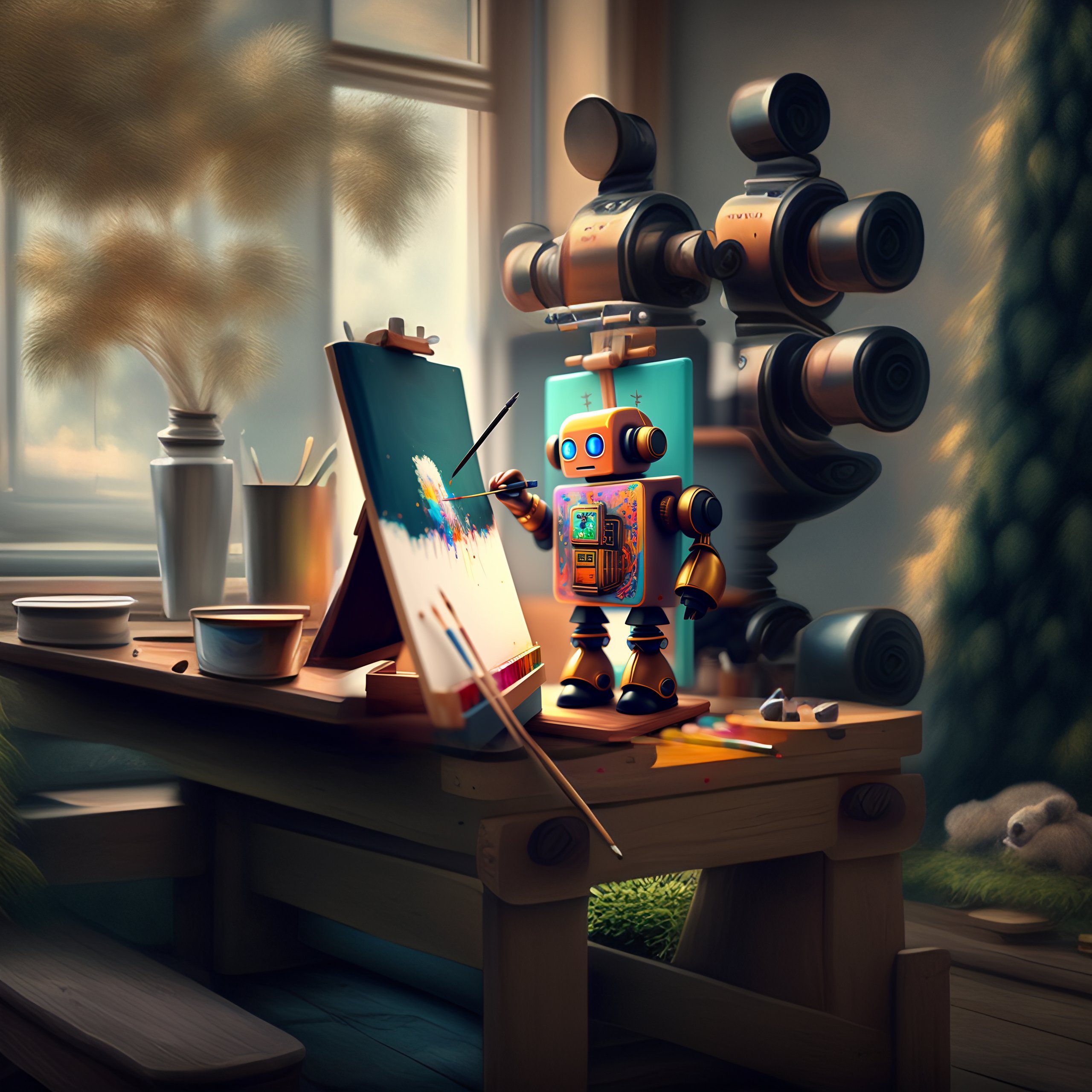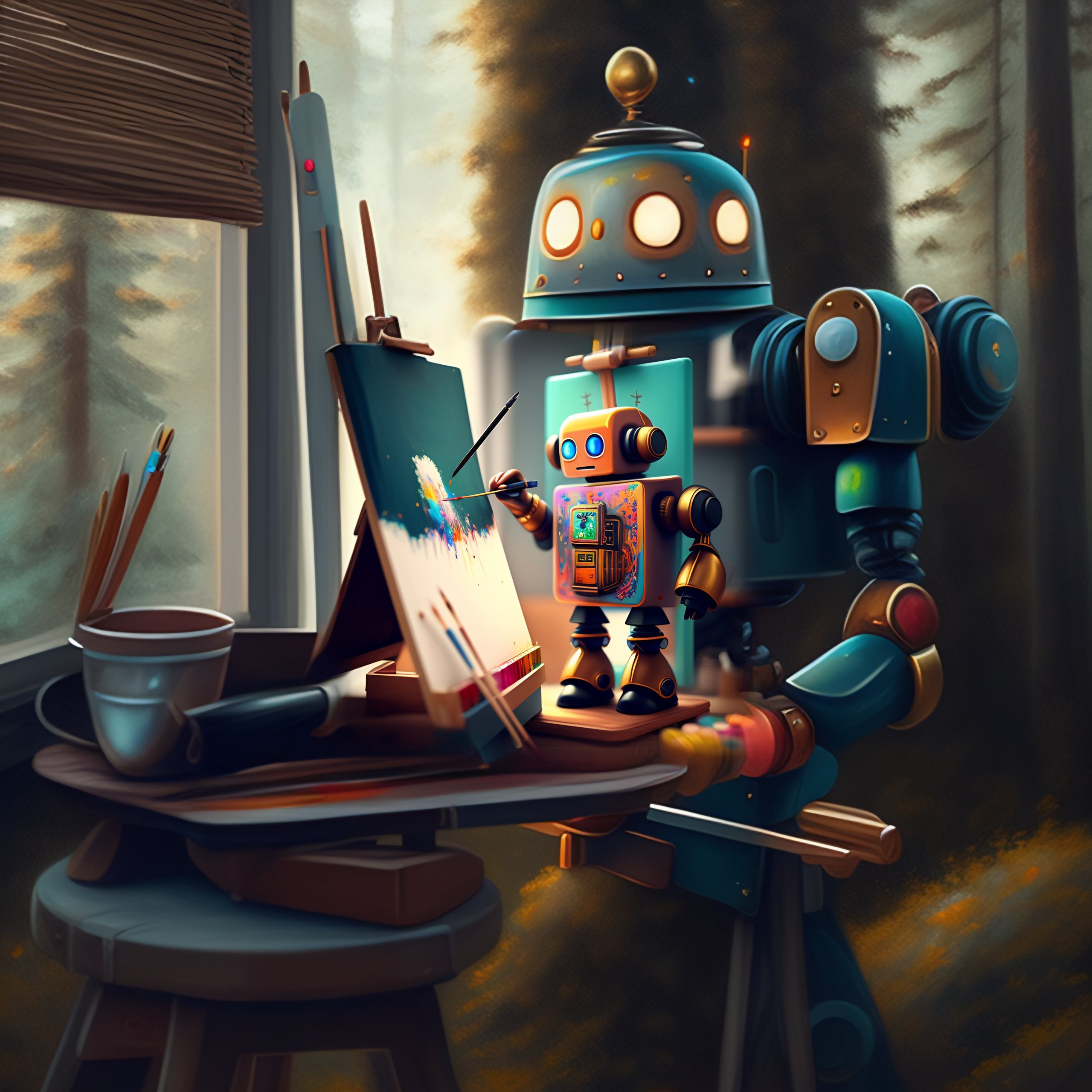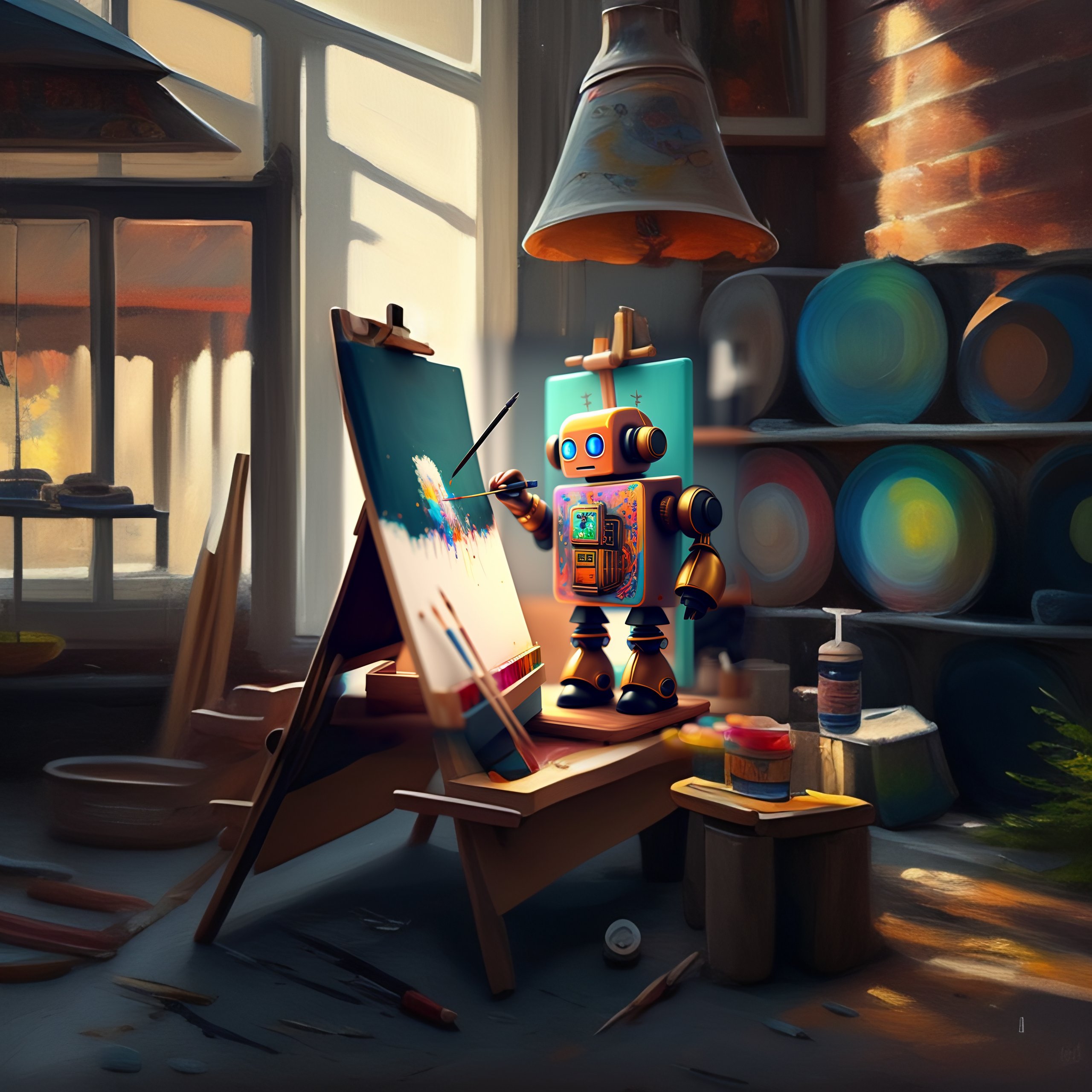 A cute robot artist painting on an easel