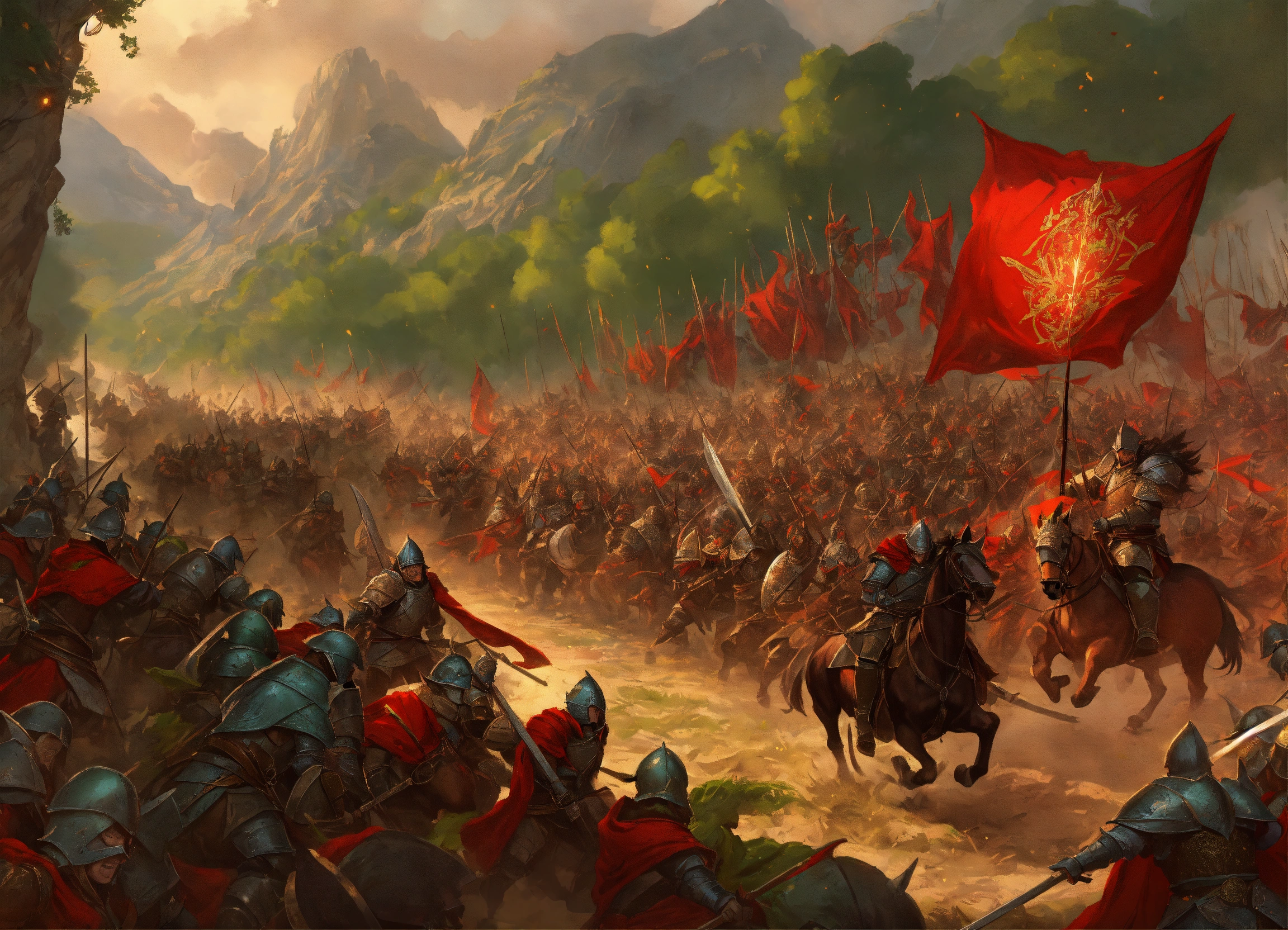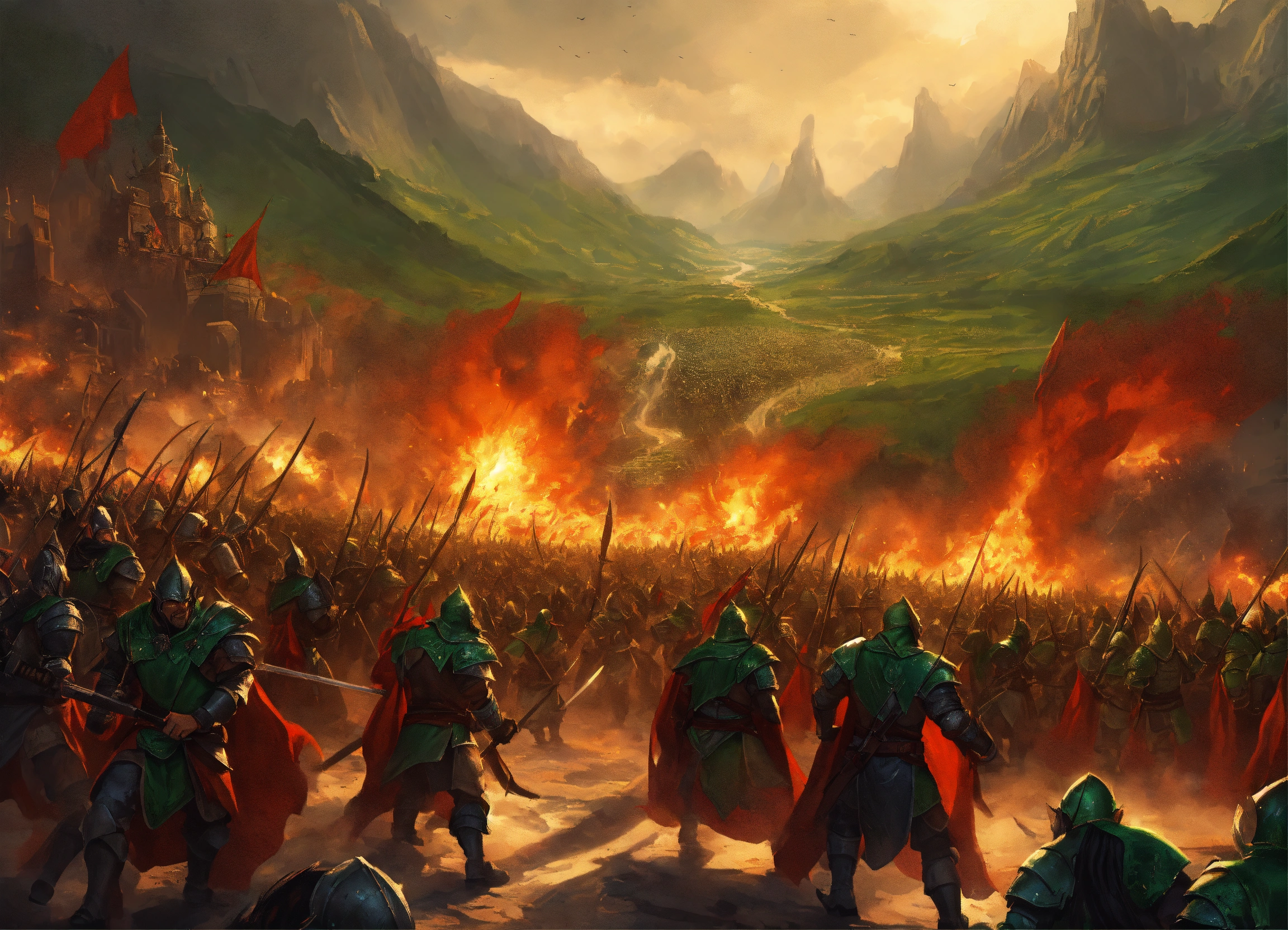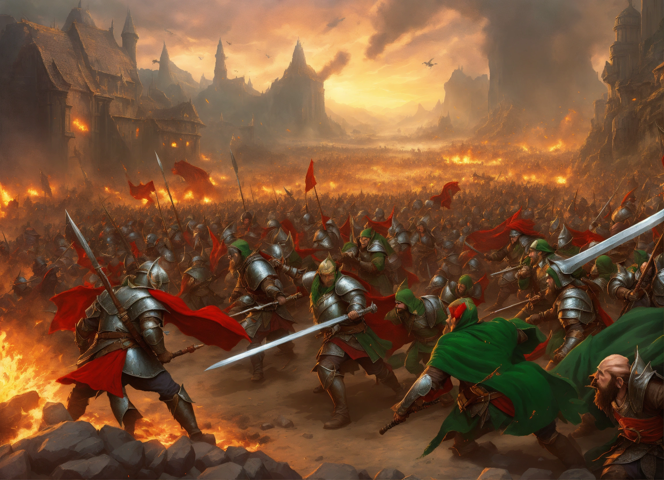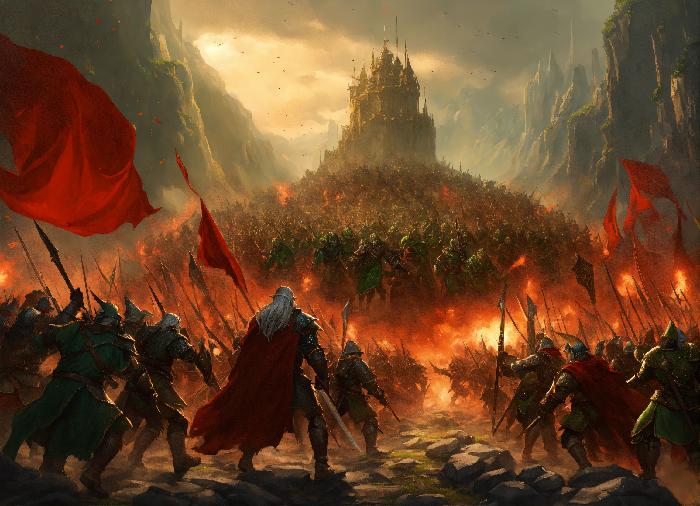 A devastating fantasy battle of massive armies of elves with green cloaks, dwarves in plate armor, human cavalry with red cloaks, fighting and evil hoard of orcs and goblins, emanating explosive power, killing people, causing havoc on the lands, fantasy setting, comic book art