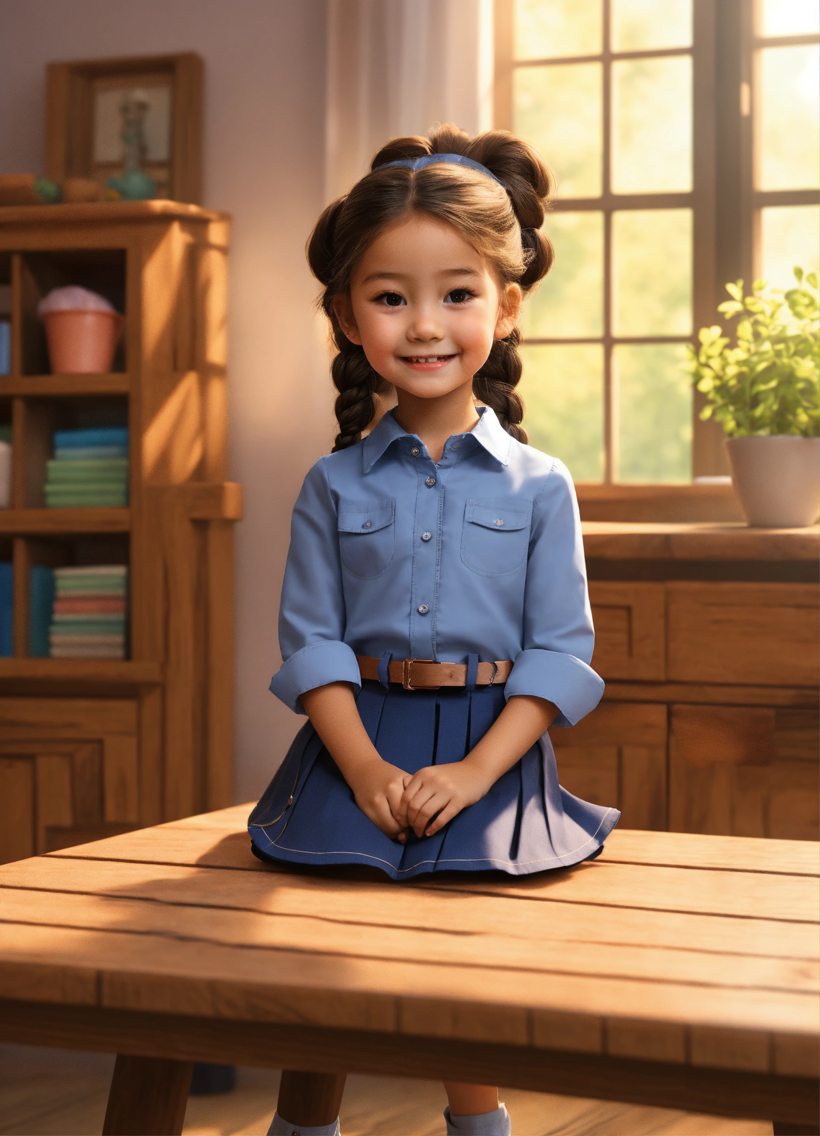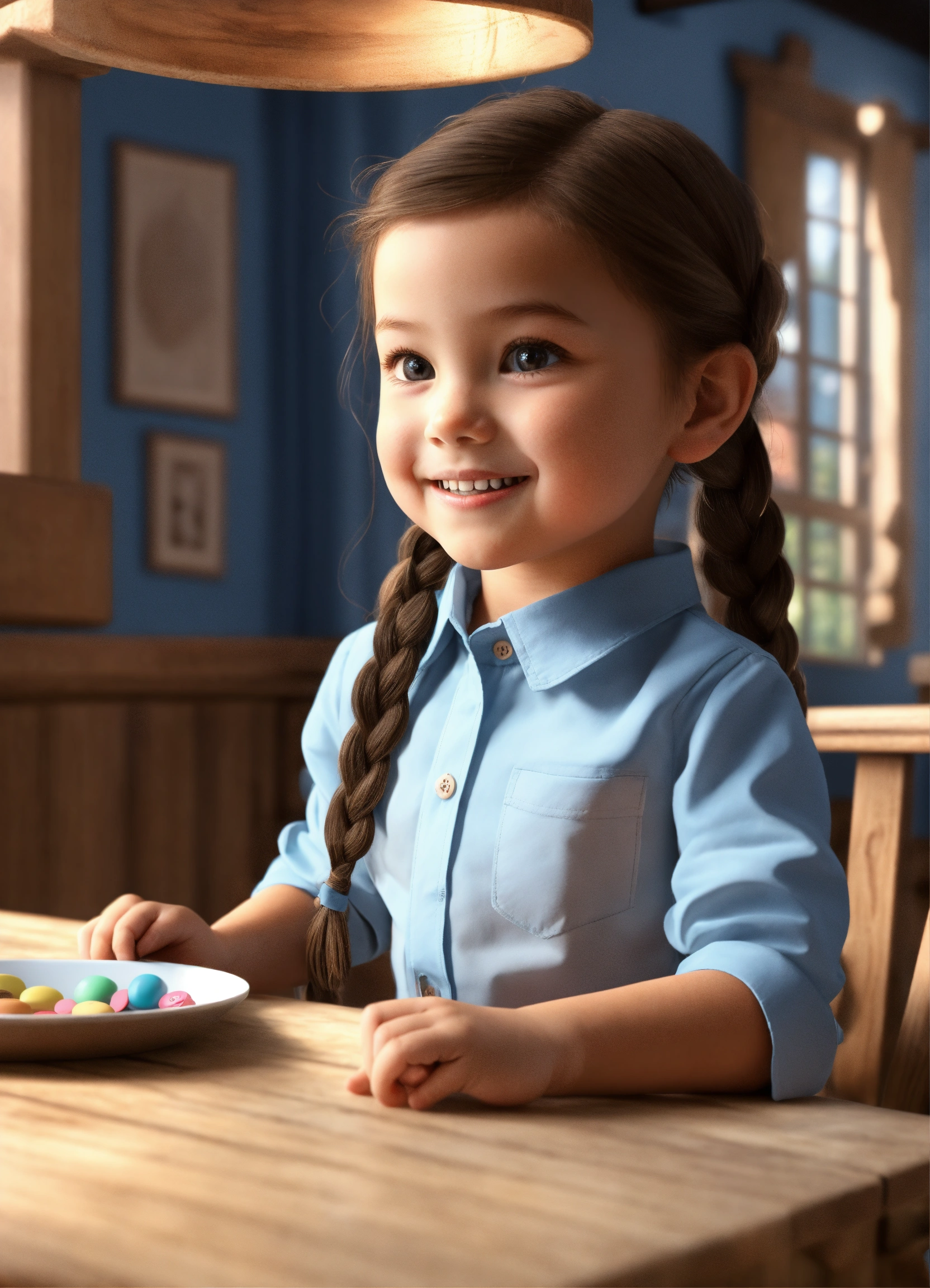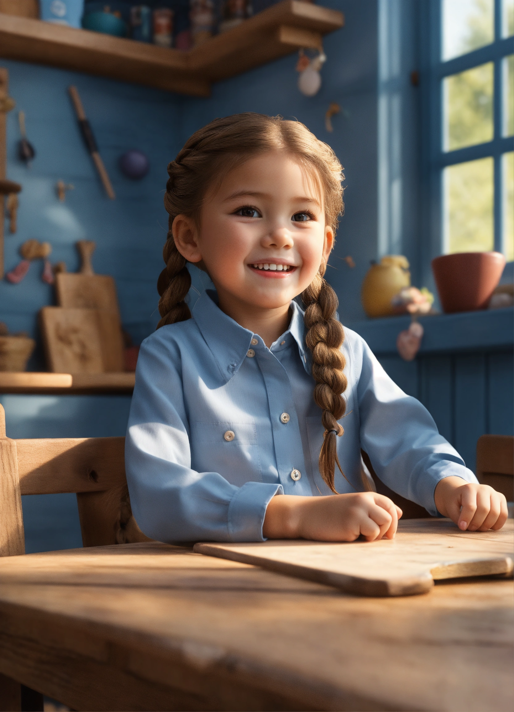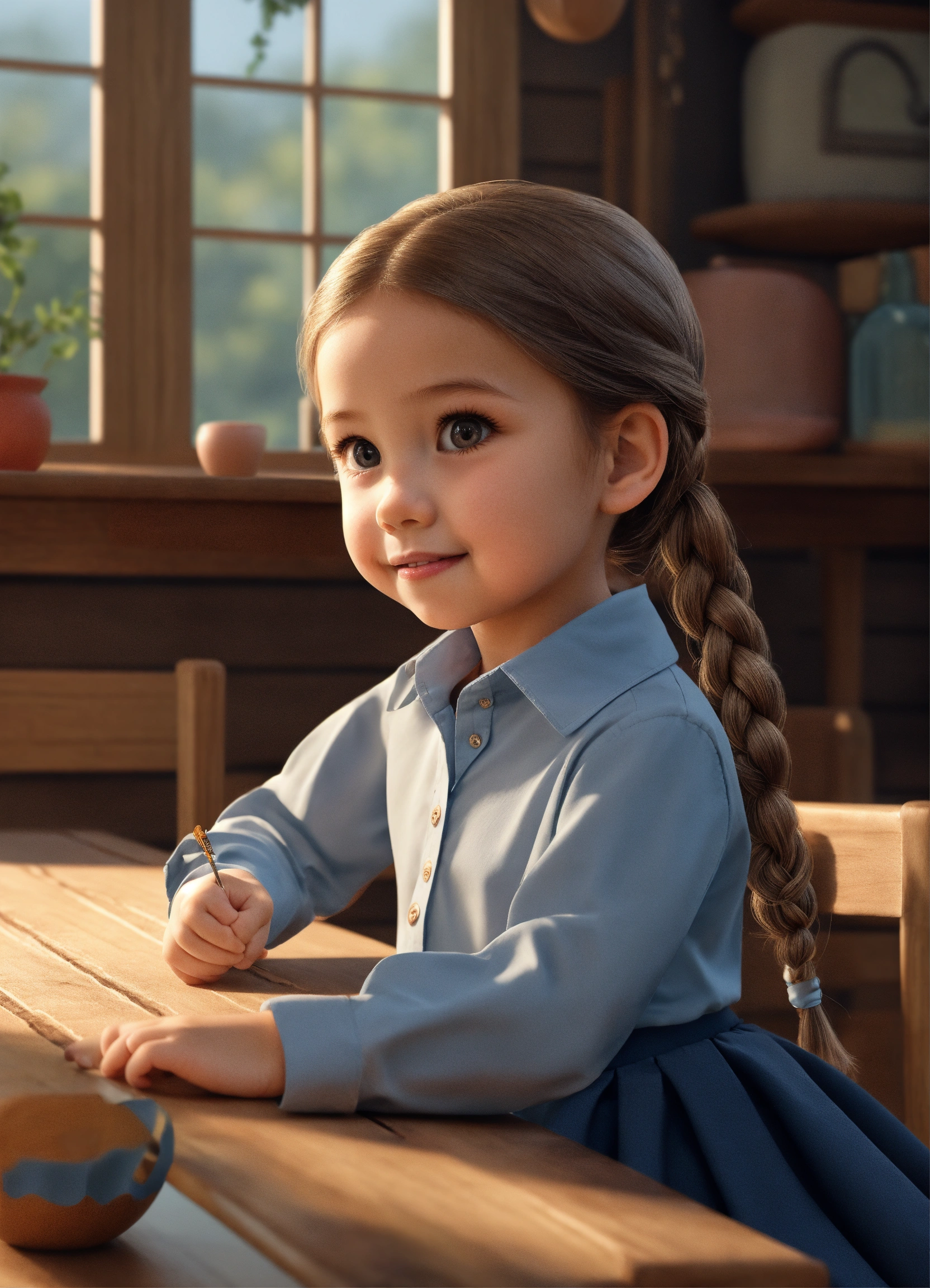 One sweet and happy 5-year-old girl, wearing a light blue long-sleeved button-down shirt with a closed collar, a dark blue skirt, hair in a braid. sitting at a wooden table, pointing her finger up to the ceiling, cute 3d realistic style