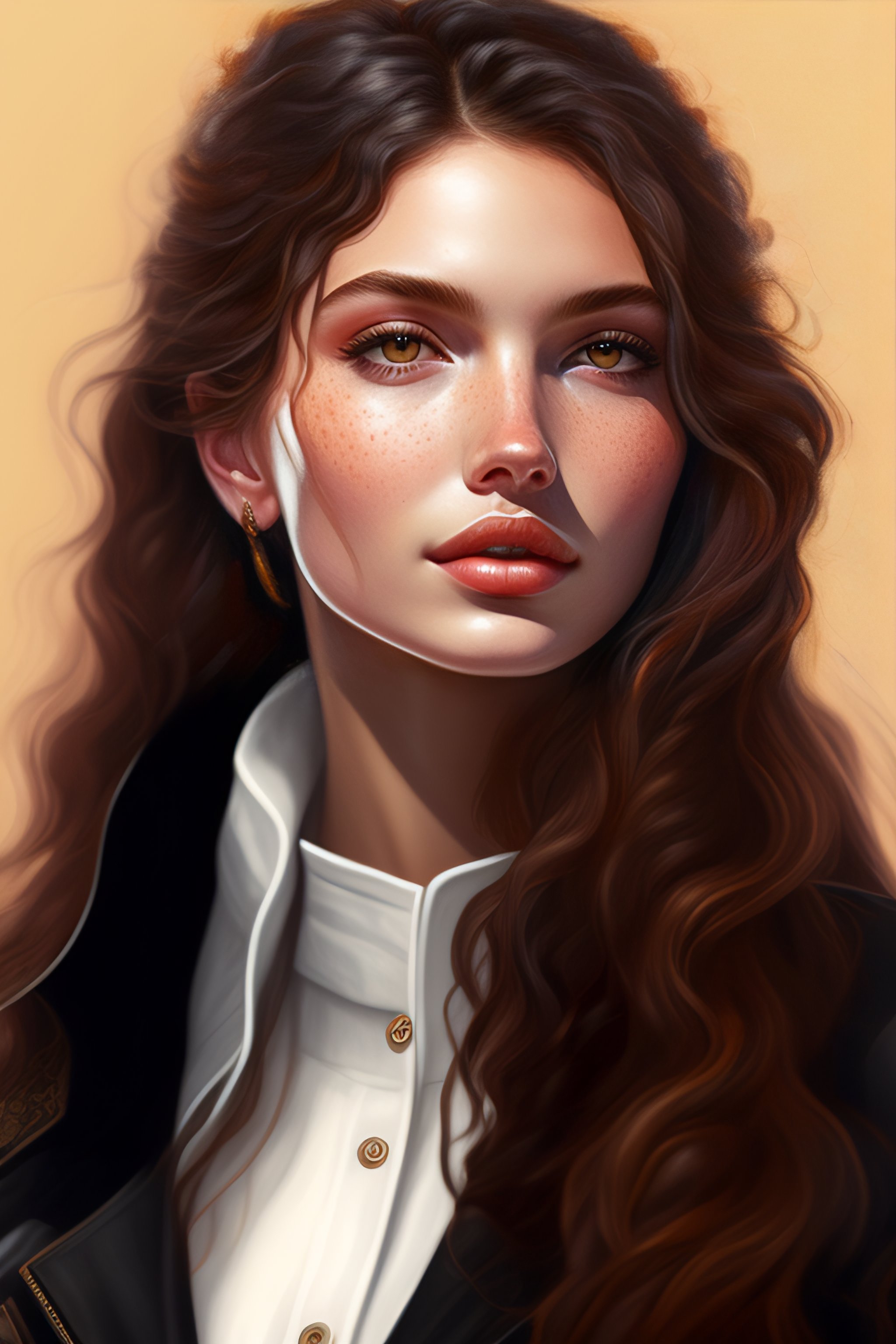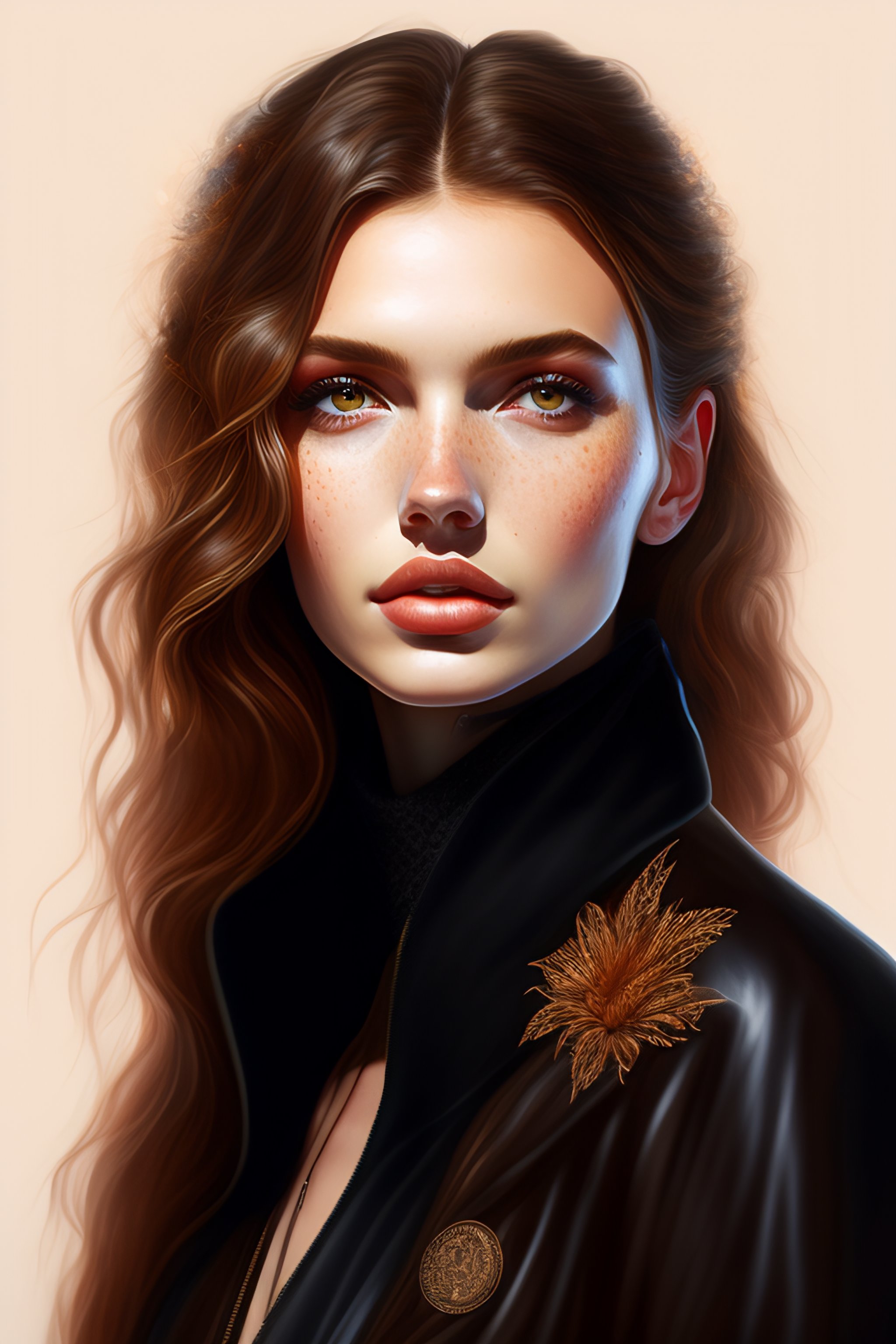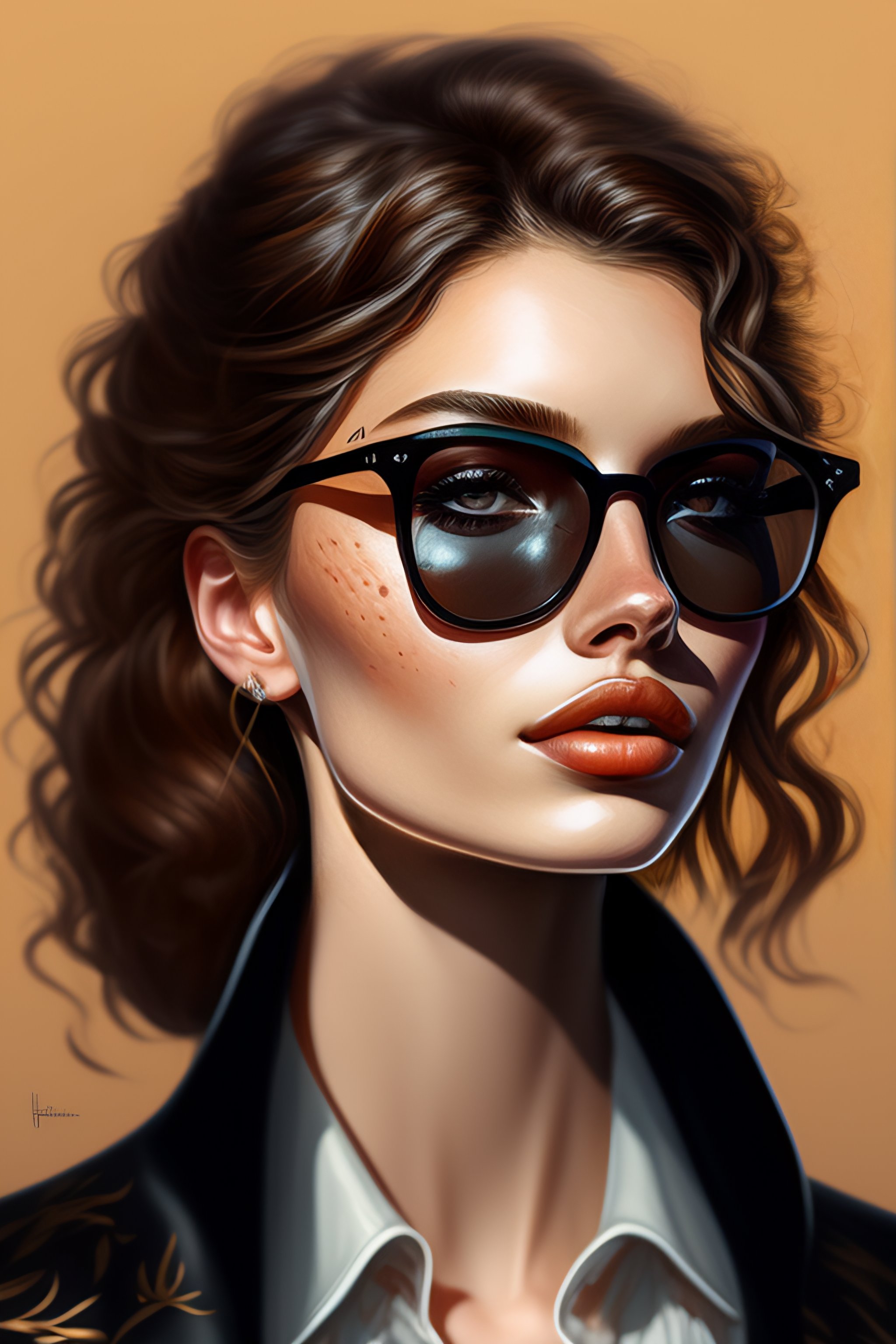 Black round shades, a full body portrait of a beautiful wild, intricate, elegant, highly detailed, digital painting, artstation, concept art, smooth, sharp focus, illustration, brown hair, black jacket, youthful, hannah murray, round face, messy hair, hippy, freckles