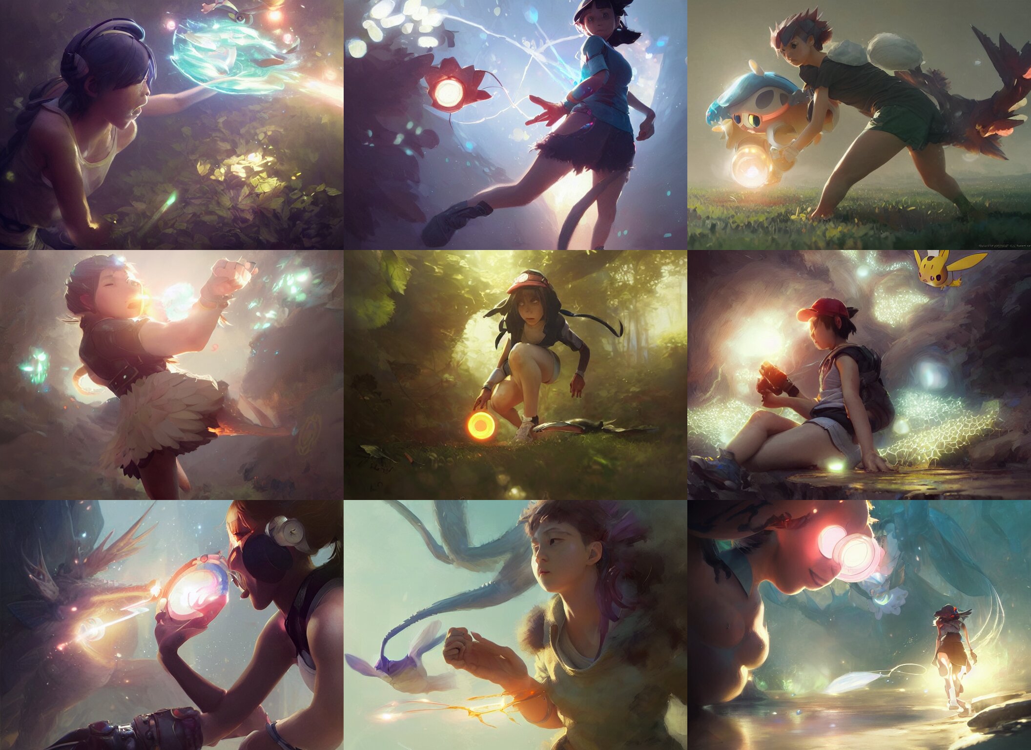 Worm's eye view of a female pokemon trainer, intricate, sharp focus, lens flare, bloom, illustration, highly detailed, digital painting, concept art, matte, art by ruan jia and wlop and greg rutkowski, masterpiece