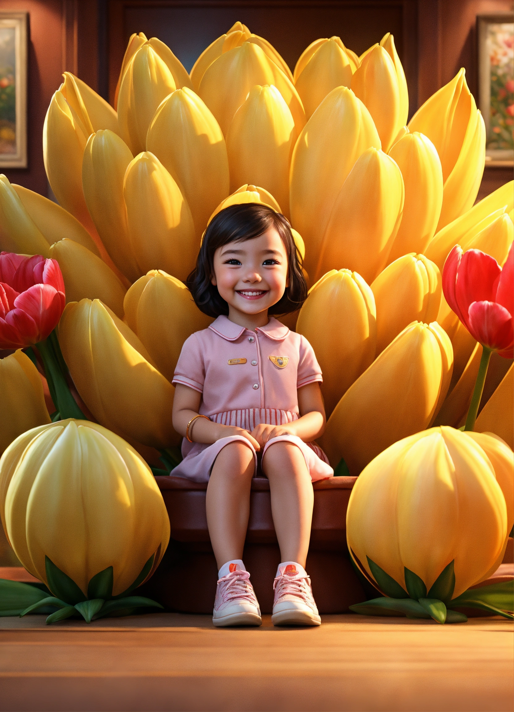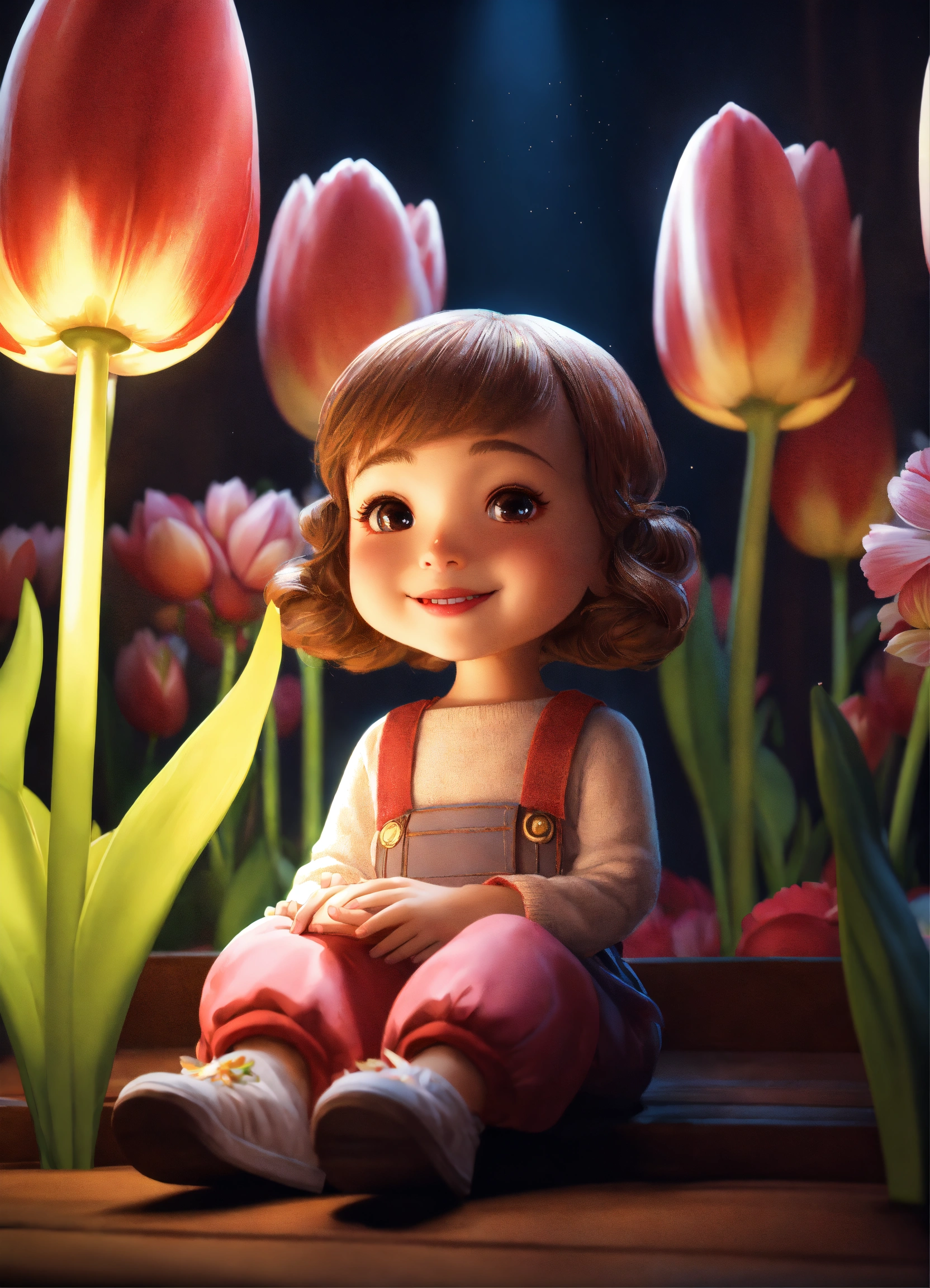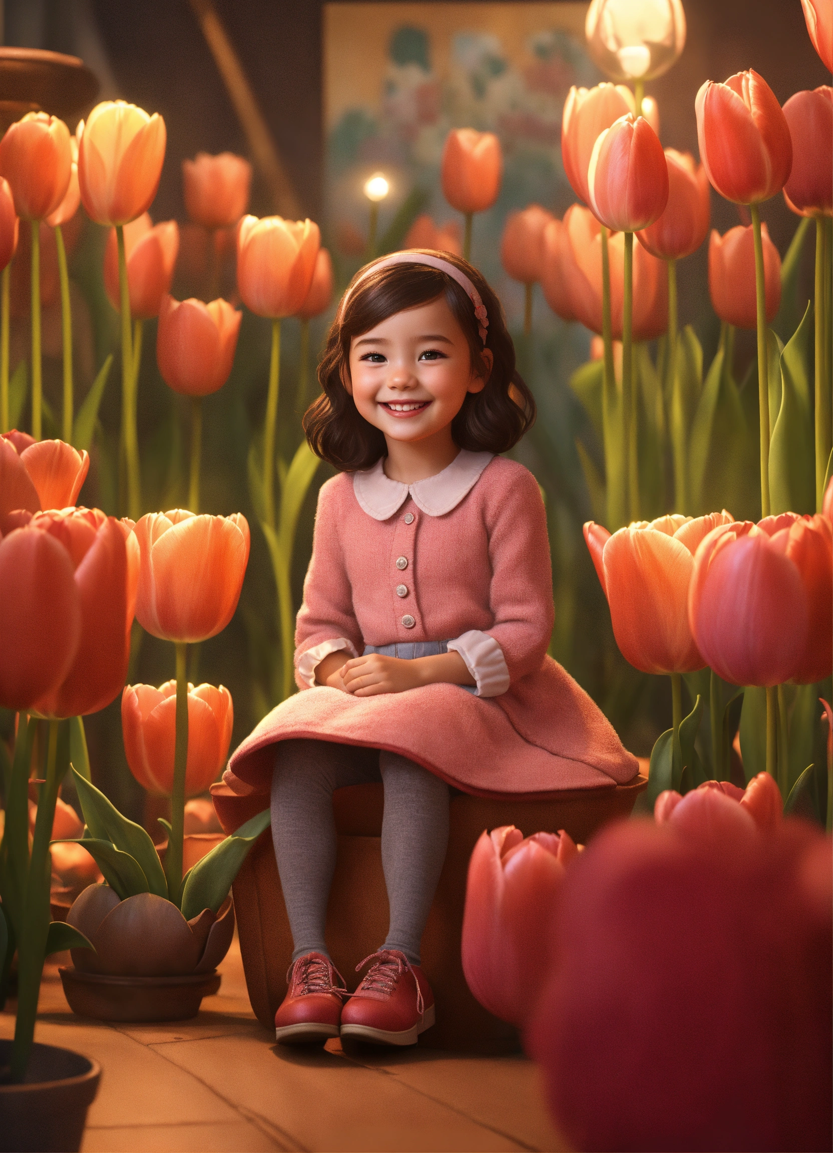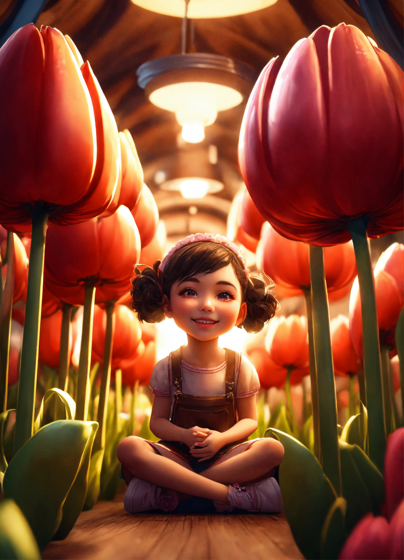 Cute adorable tiny girl smiling greeting me, unreal engine, she is seated inside a giant tulip flower, cozy interior lighting, art station, detailed digital painting, cinematic, character design by mark ryden and pixar, unreal 5, daz, hyper realistic