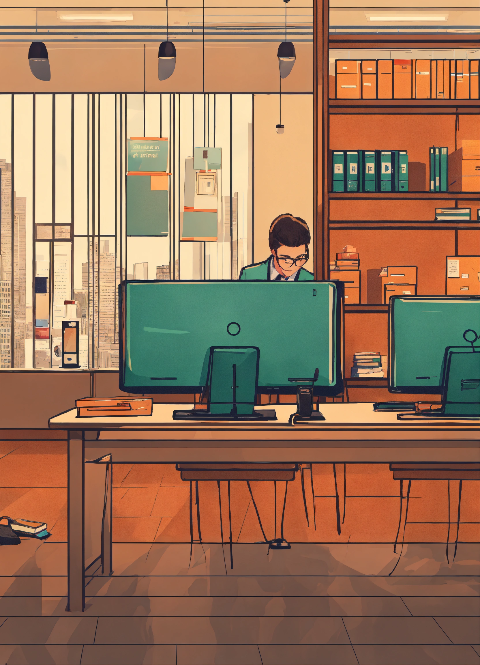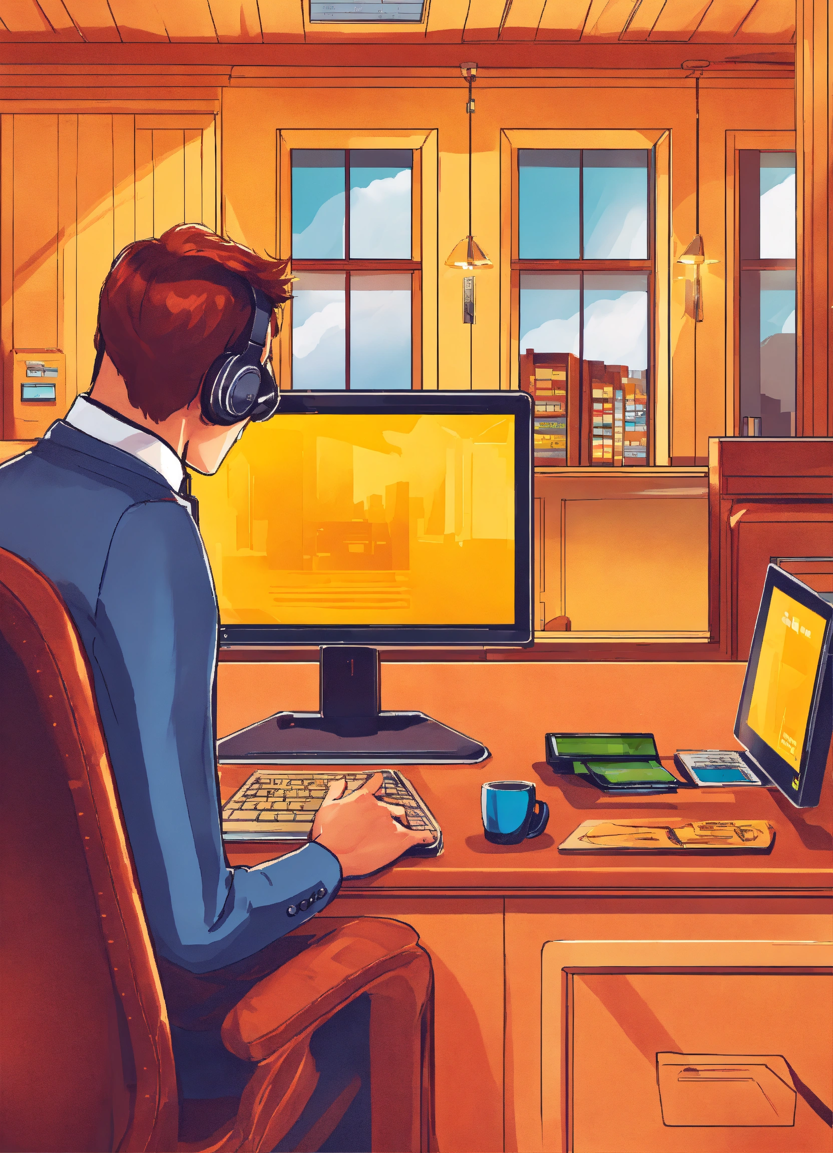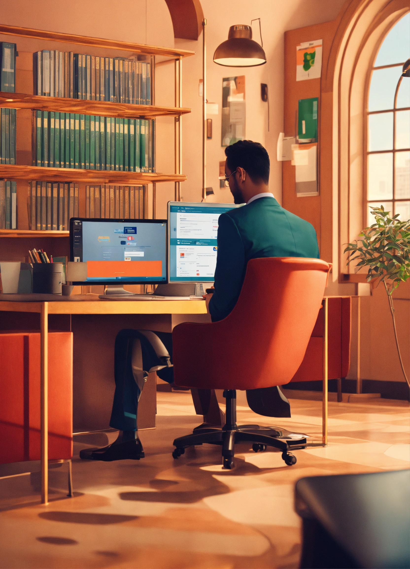 Office of a bank where a customer is educating another the use of mobile apps, the office has a laptop.