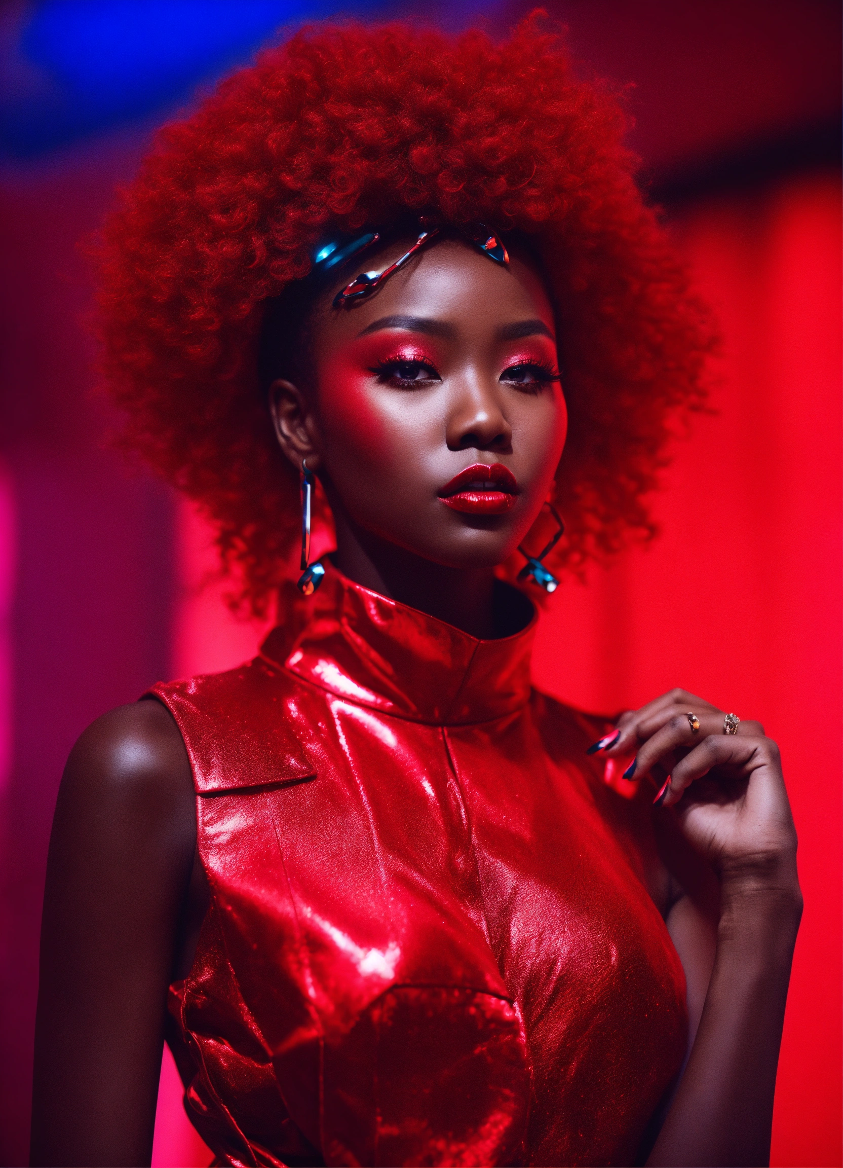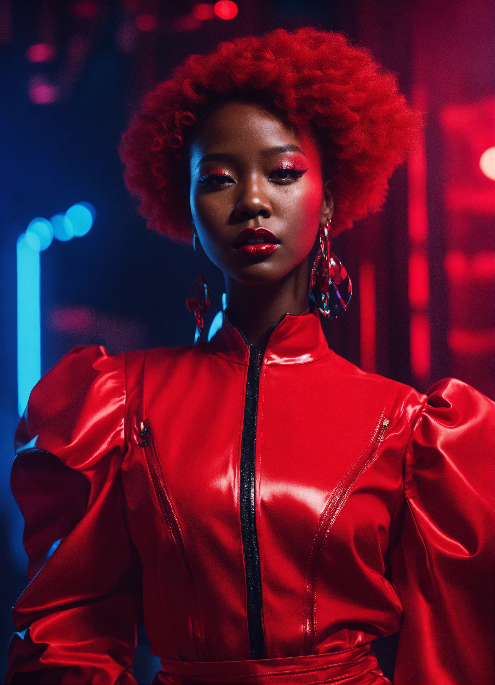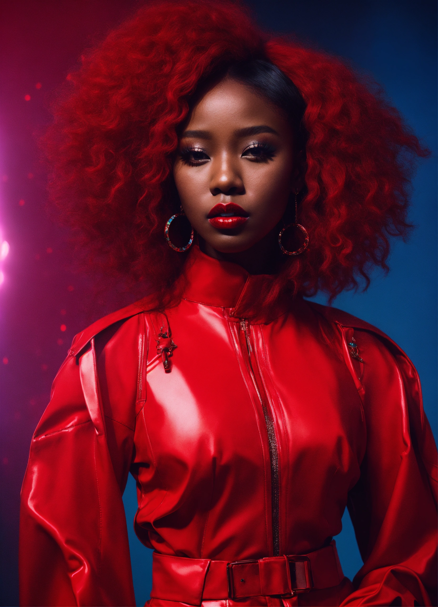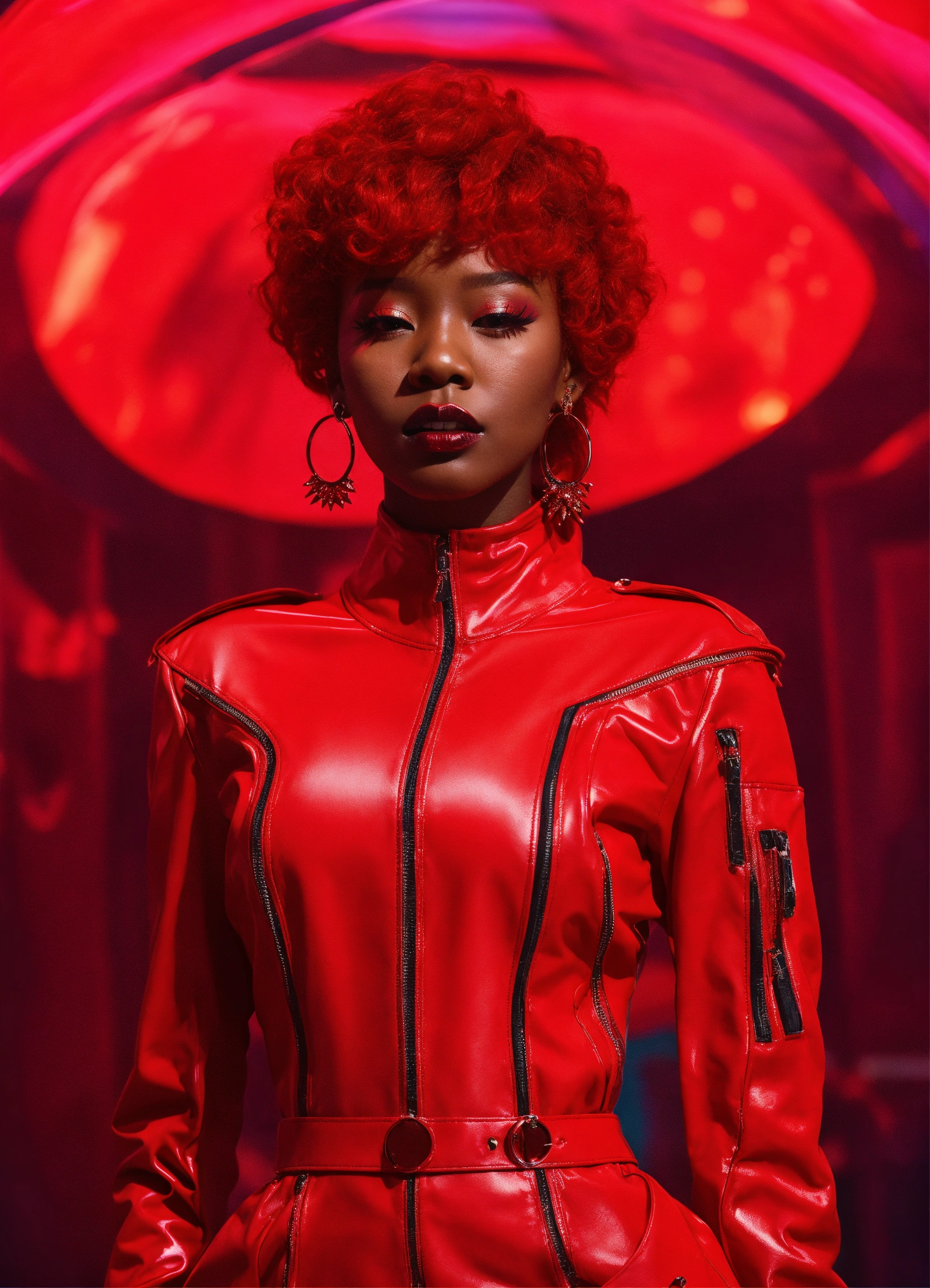 A dark skin black female kpop idol in a all red sleek futuristic outfit, clean makeup with oversized red hair, with depth of field, fantastical edgy and regal themed outfit, captured in vivid colors, embodying the essence of fantasy, minimalist
