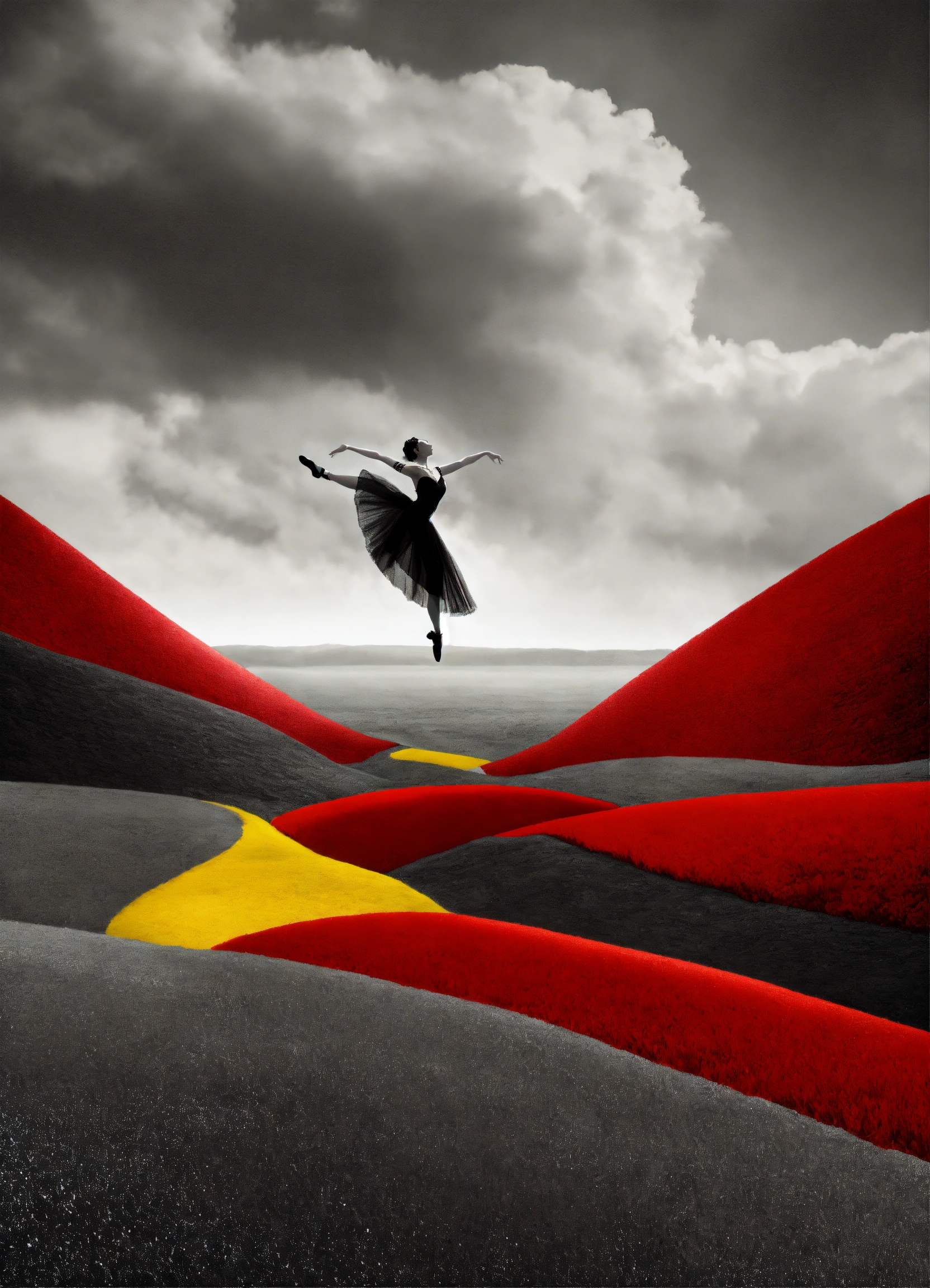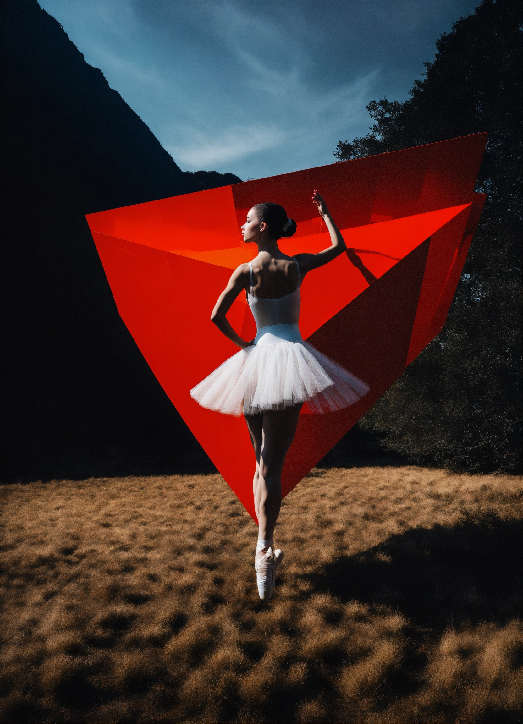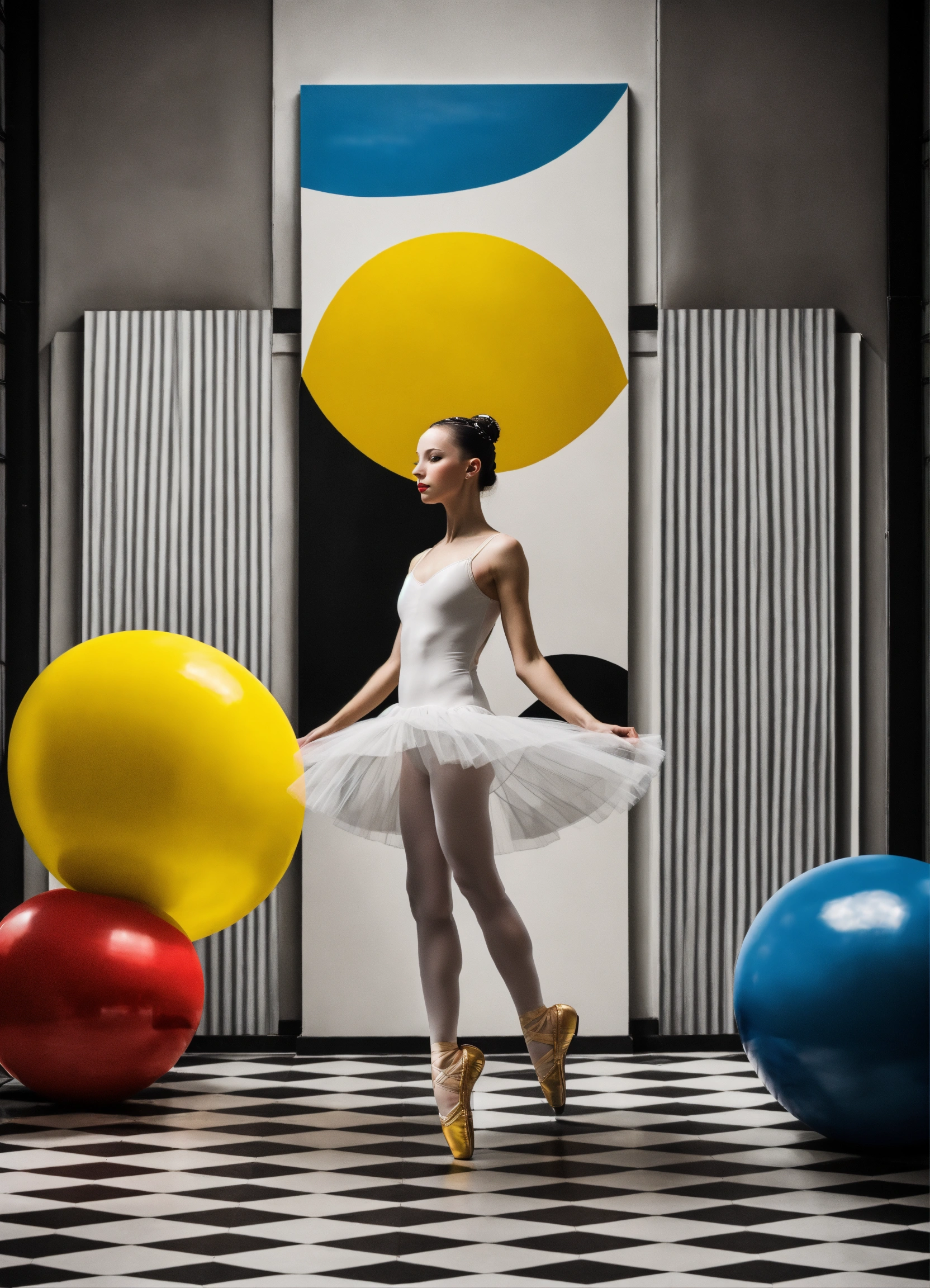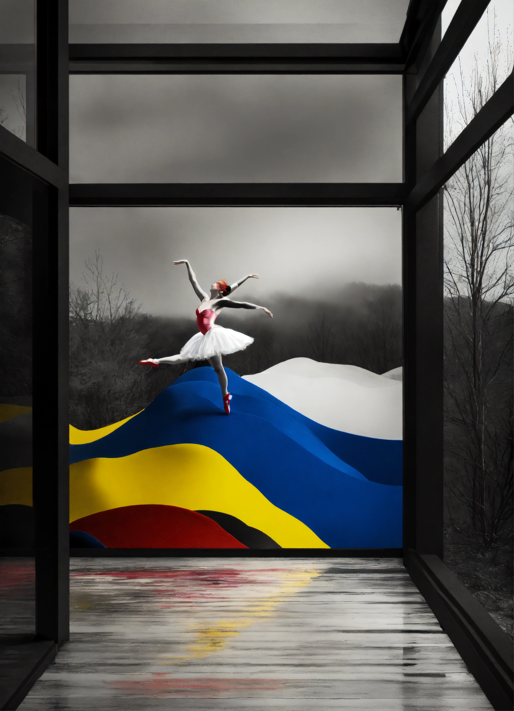 Black and white, primary colors, 3d abstract landscape, original ballerina photography, immersive-inspired art deco, inside and out landscape, rene magritte inspiration.