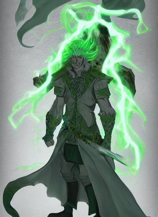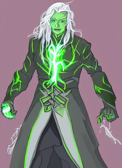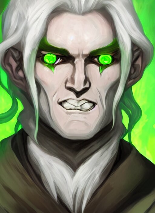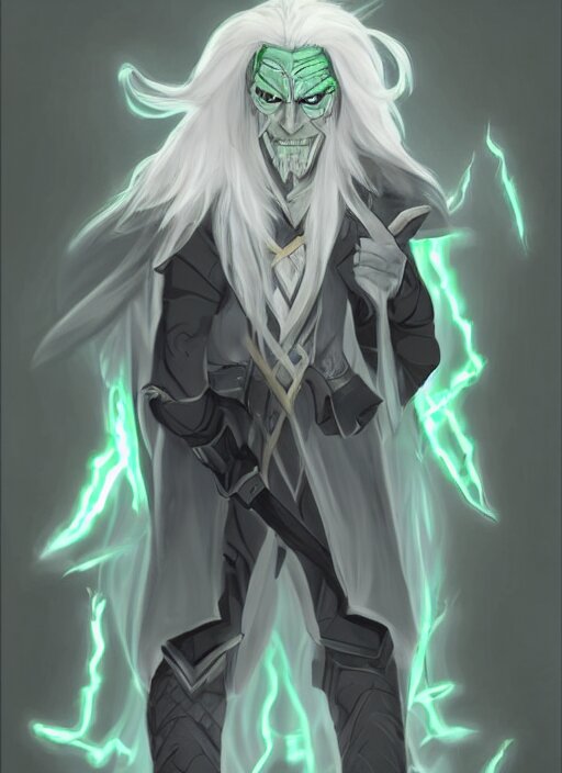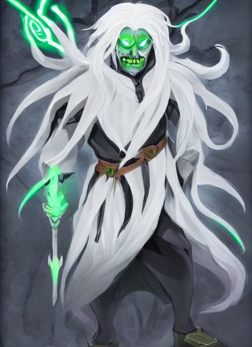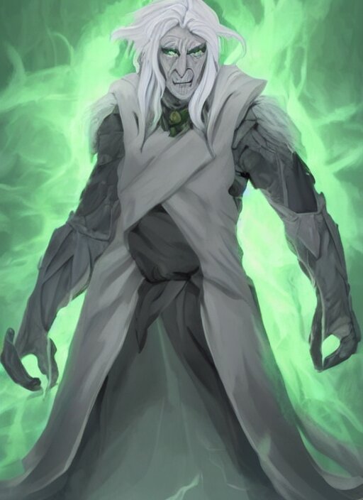 Dnd character concept of a man with ash gray skin and long white hair, glowing green eyes, eldridge green!!!! eyes and energy, lich demon mage class