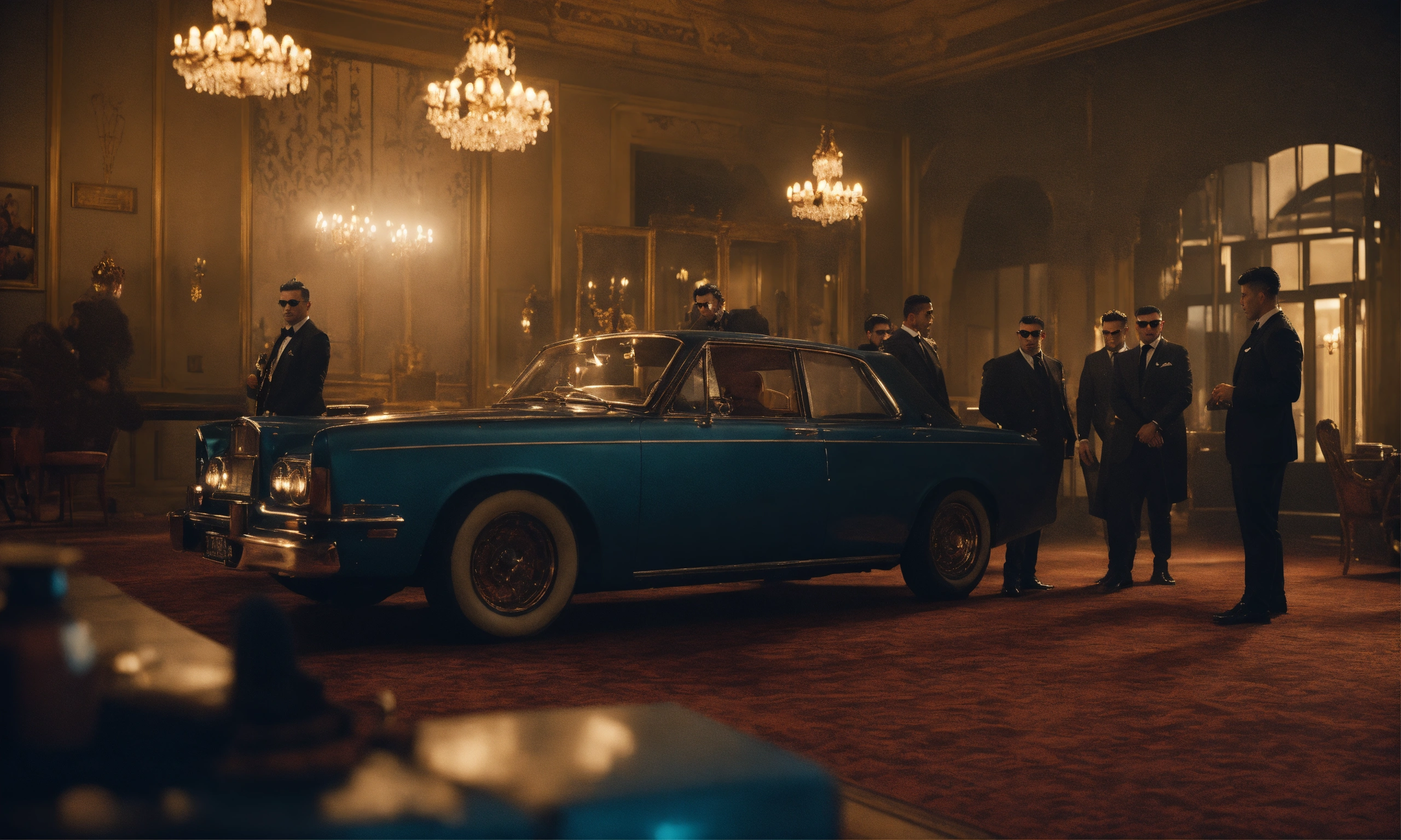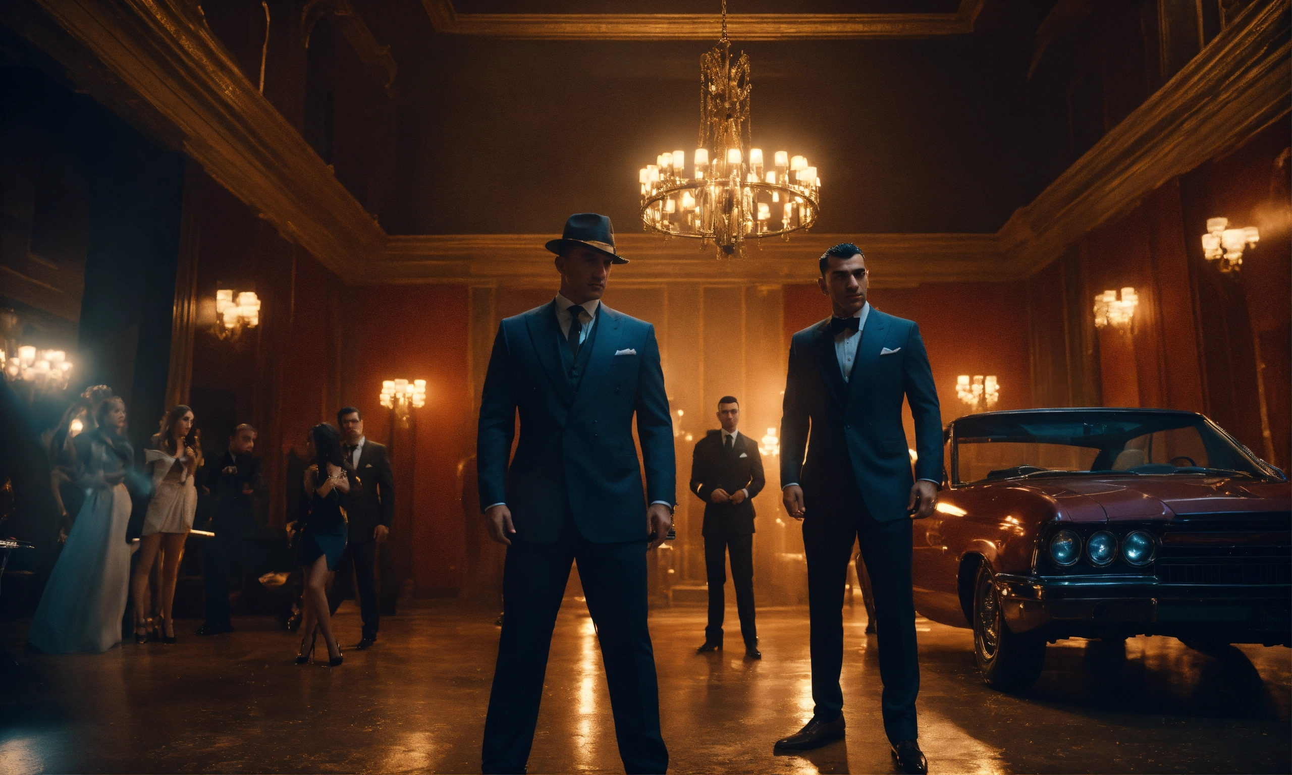 Group of mafia male with riffles surrounded by girls, interior set design night time, mood lighting, wide front shot, 8k, luxcorerender, earthly colour, cinematic photography, real humans, real images, matte finish, shot on arri anamorphic, extreme wide shot, smooth, sharp focus, ornate, highly dynamic, particulate, hyperreal, wide shot