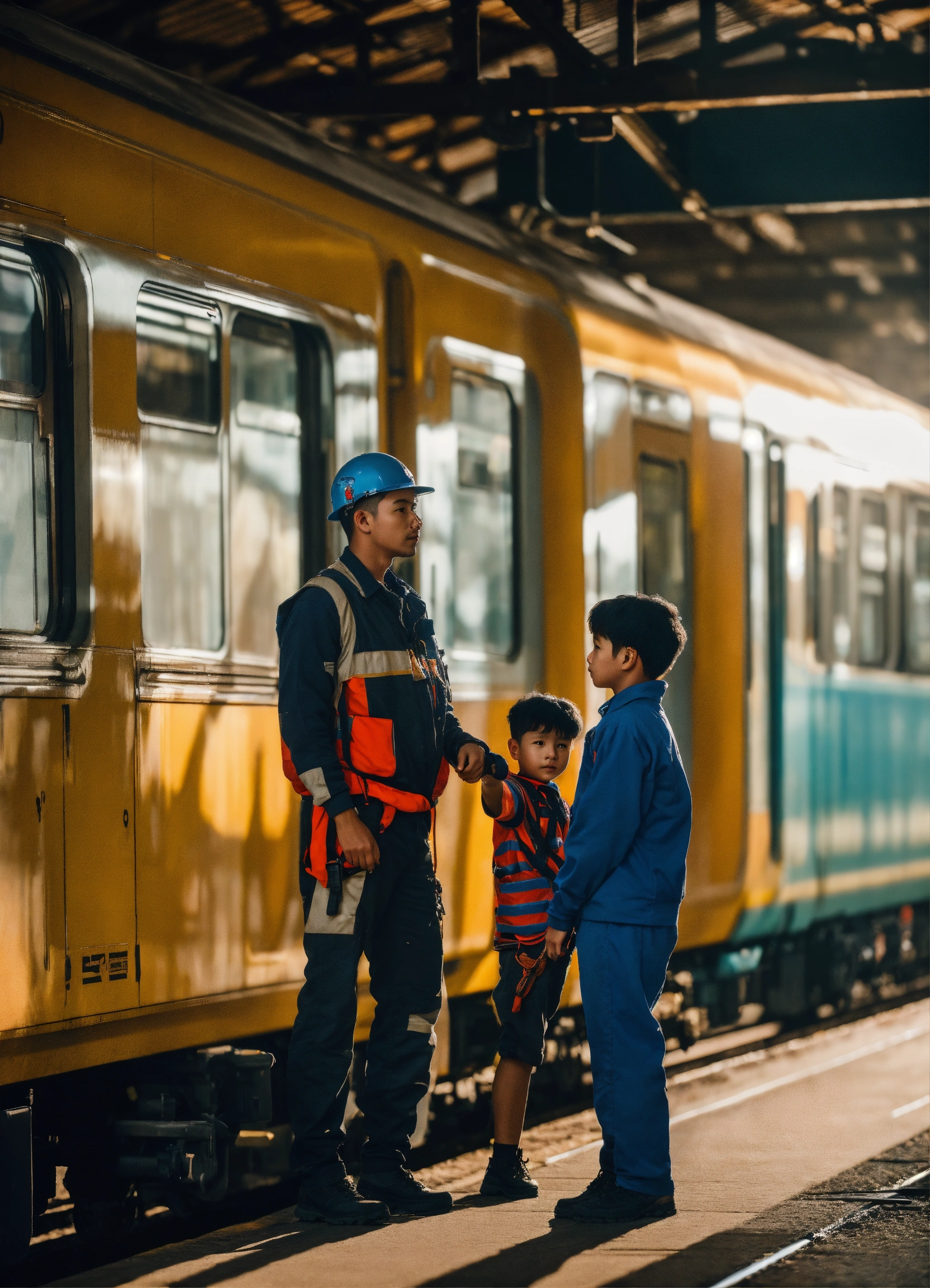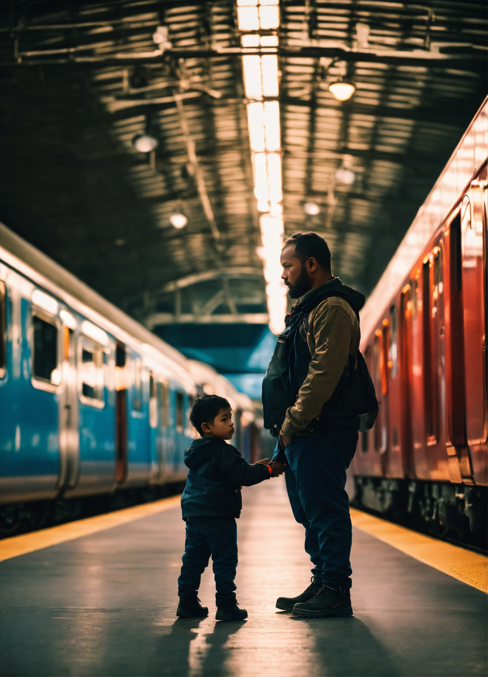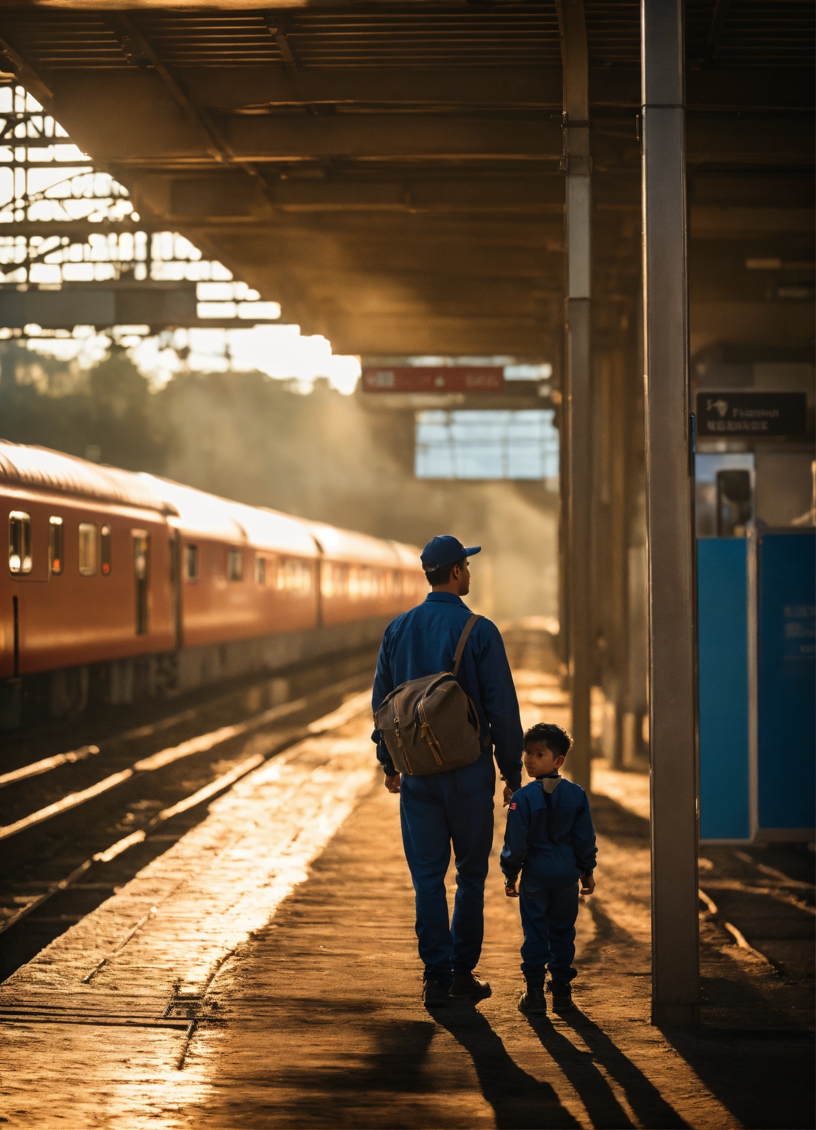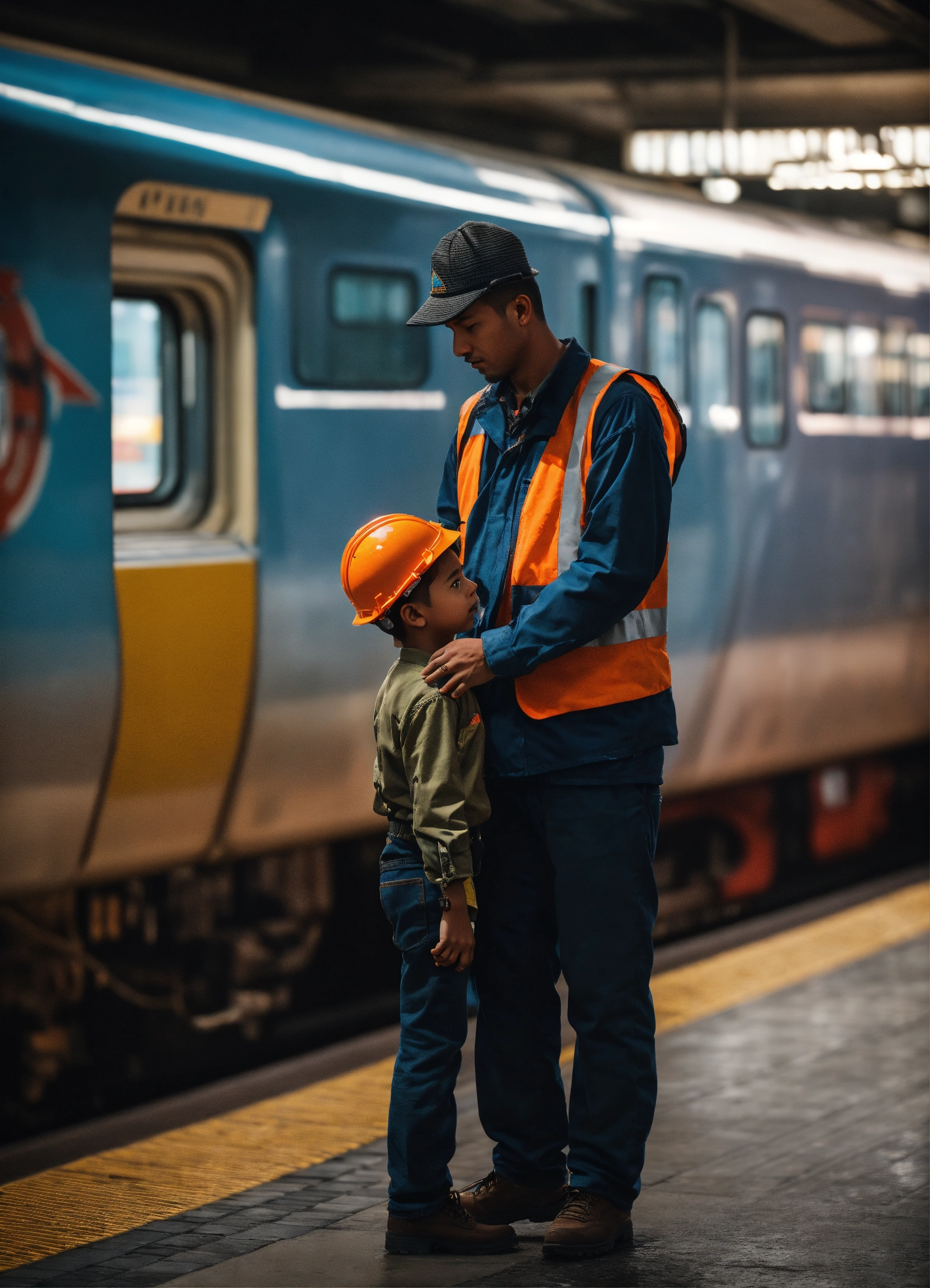A worker in a train station standing with his young son, surreal photo, fujifilm xt3, outdoor, good lighting, raw photo, 8k uhd, film grain, unreal engine 5, ray trace
