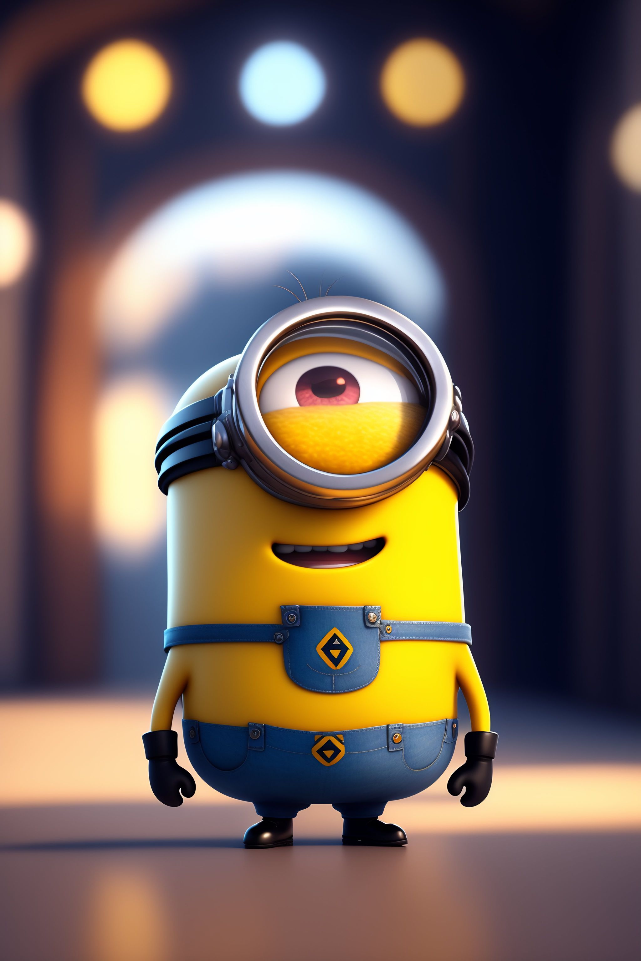 Cute and adorable minion waving and smiling greeting me, unreal engine, cozy interior lighting, art station, detailed digital painting, cinematic, character design by mark ryden and pixar and hayao miyazaki, unreal 5, daz, hyper realistic, rendering octane