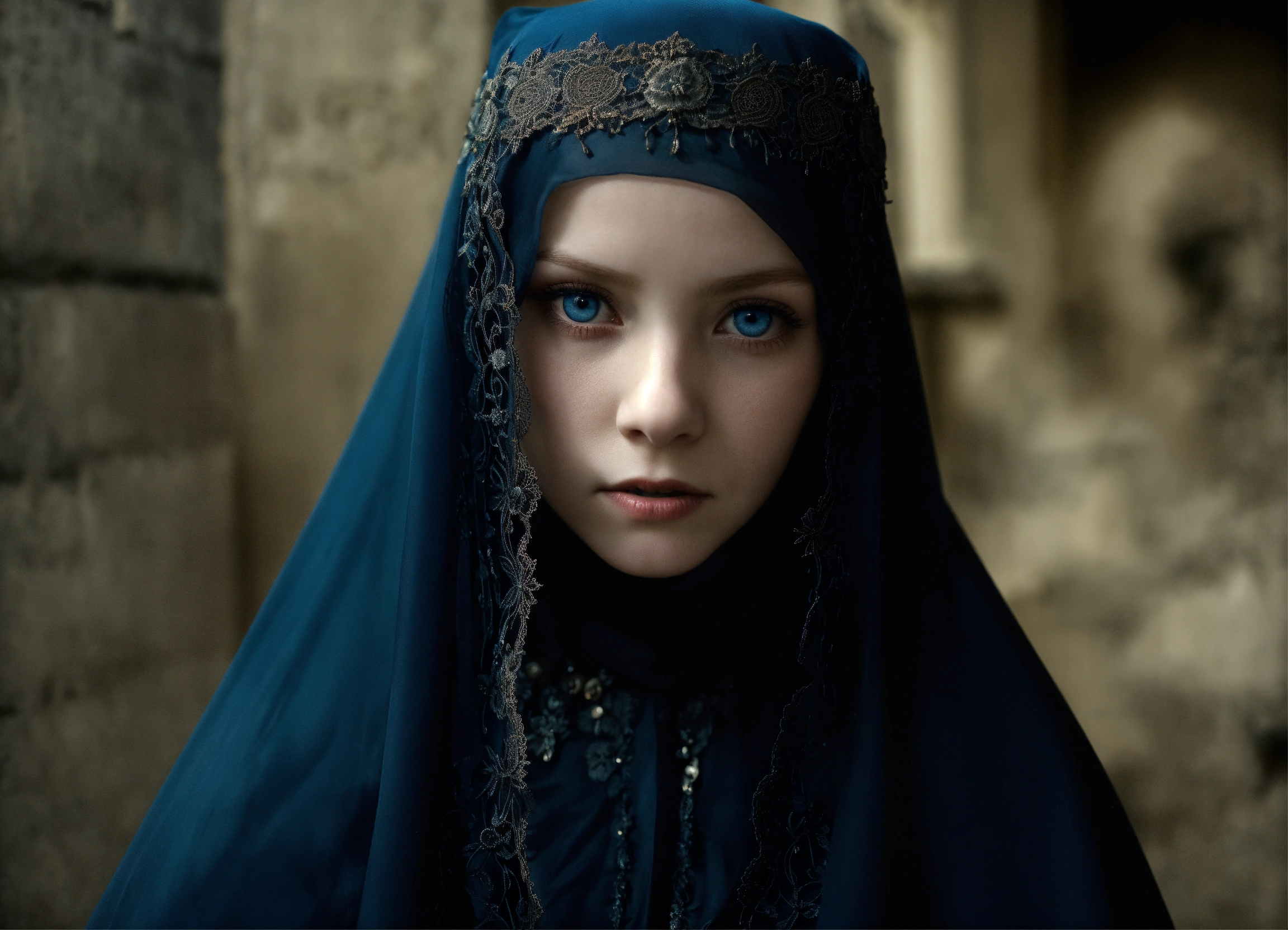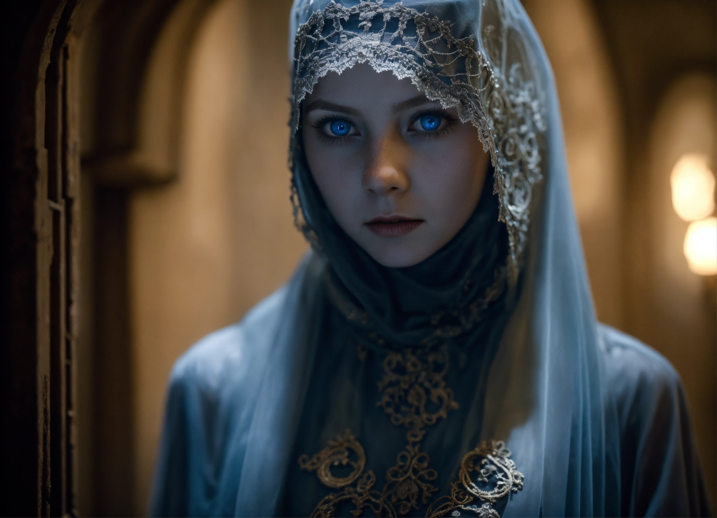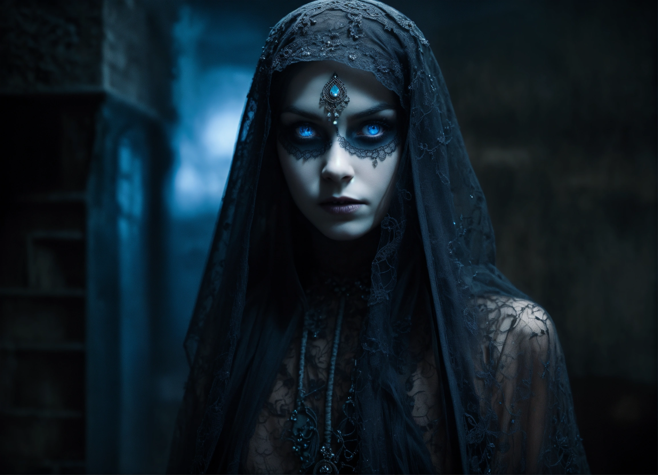 Body portrait of a very childish deadly-pale ultra slim twelve year old female child, she is a ultra skinny goth necromancer with waist long silverwhite hair, a lace niqab with a silk face veil covers up her face, narrow clothing, ultra skinny, ultra slim body, ultra emaciated body, completely emaciated, ultra narrow face, alabaster skin, pale as a corpse, glowing blue eyes, ultra slim face, innocent looking, in a gloomy crypt, lasziv, kindlich, unschuldig, childlike, graceful, wispy, glowing blue eyes, ghostly, dead, evil, demonic, undead, darkness, grotesque, mysterious, dark, cold ambient lighting, extremely detailed, fantasy, medieval setting