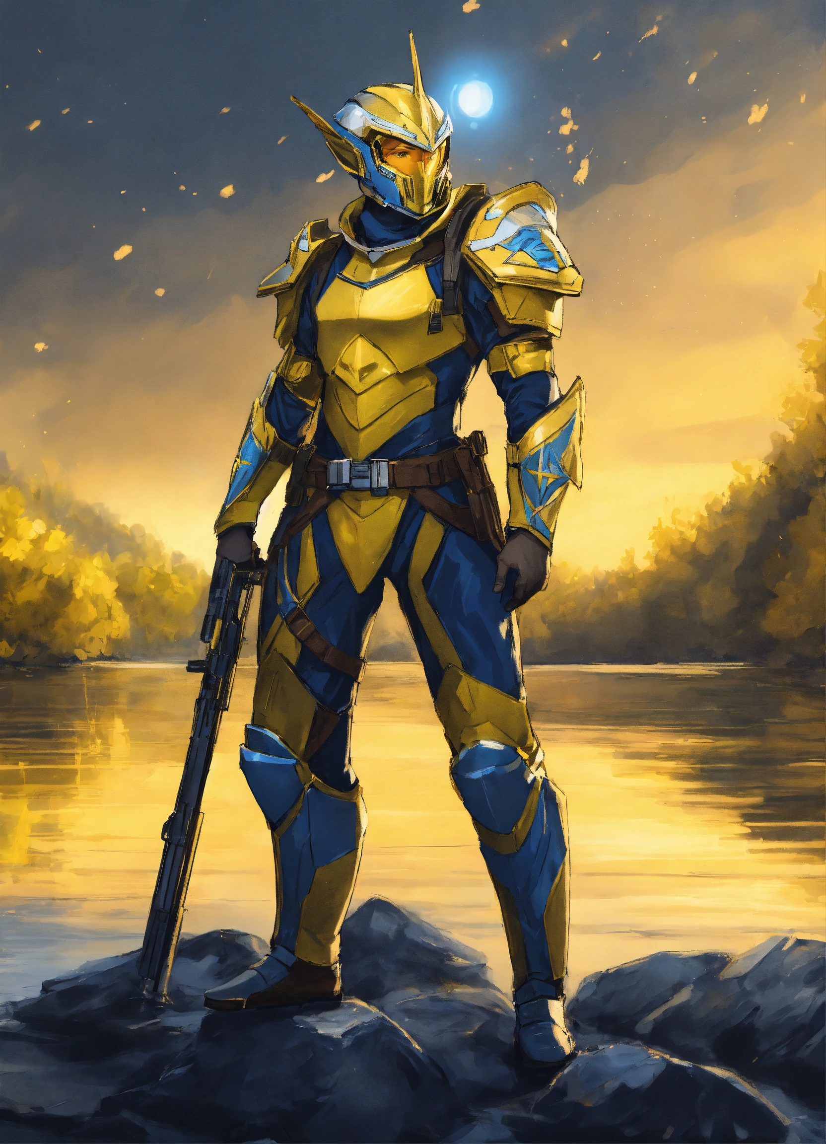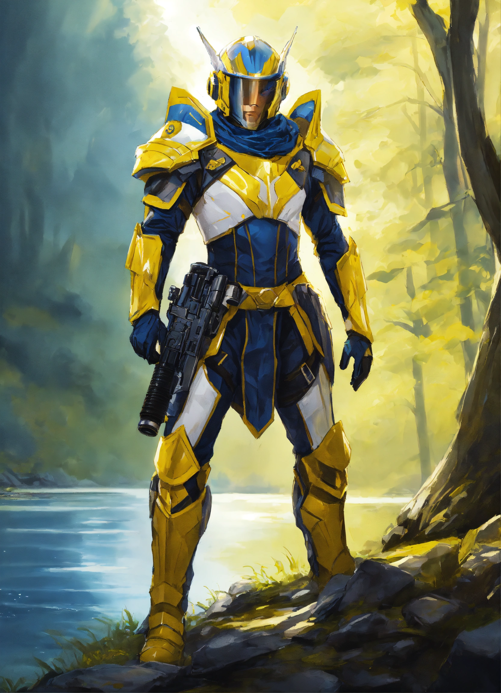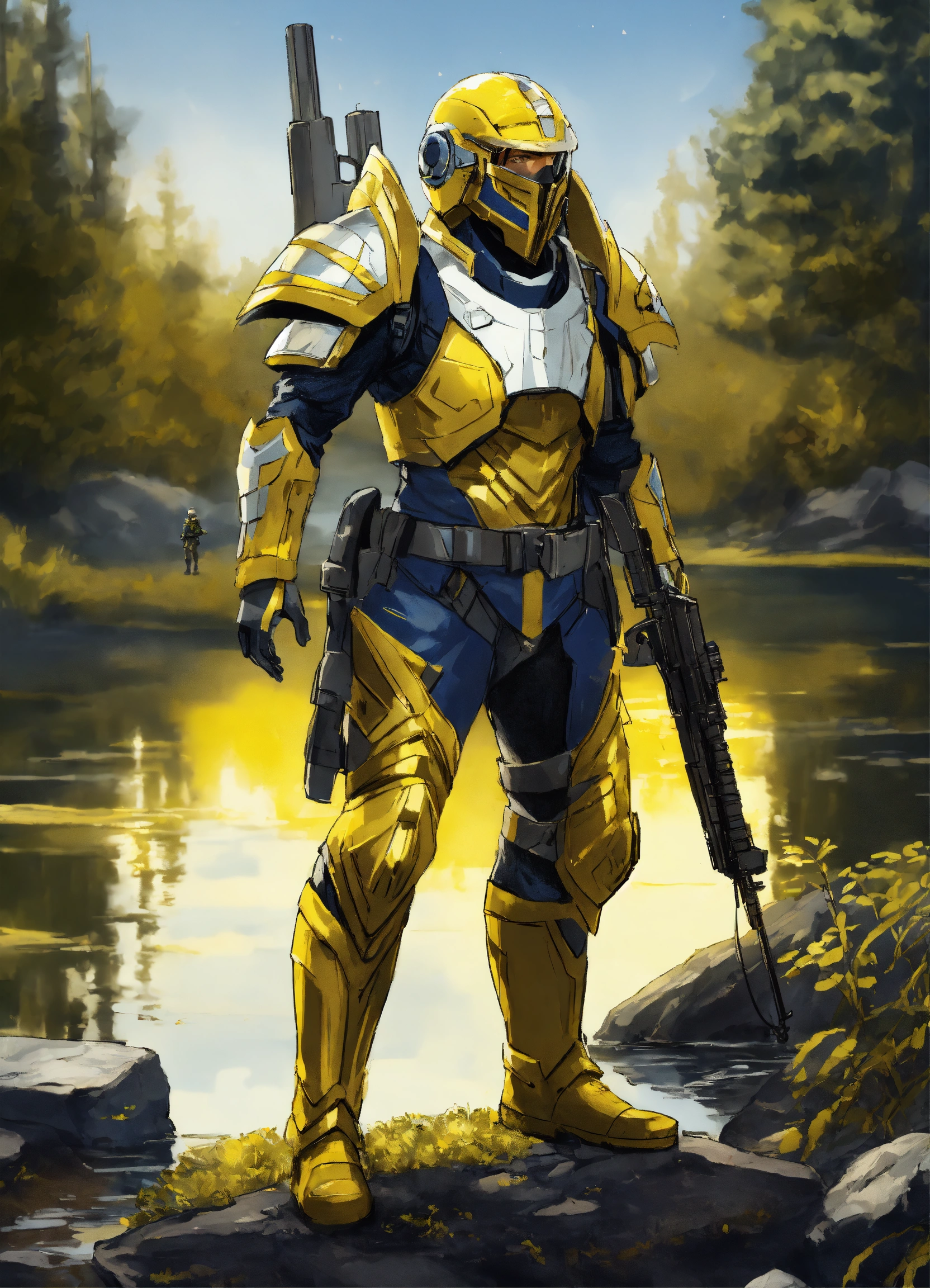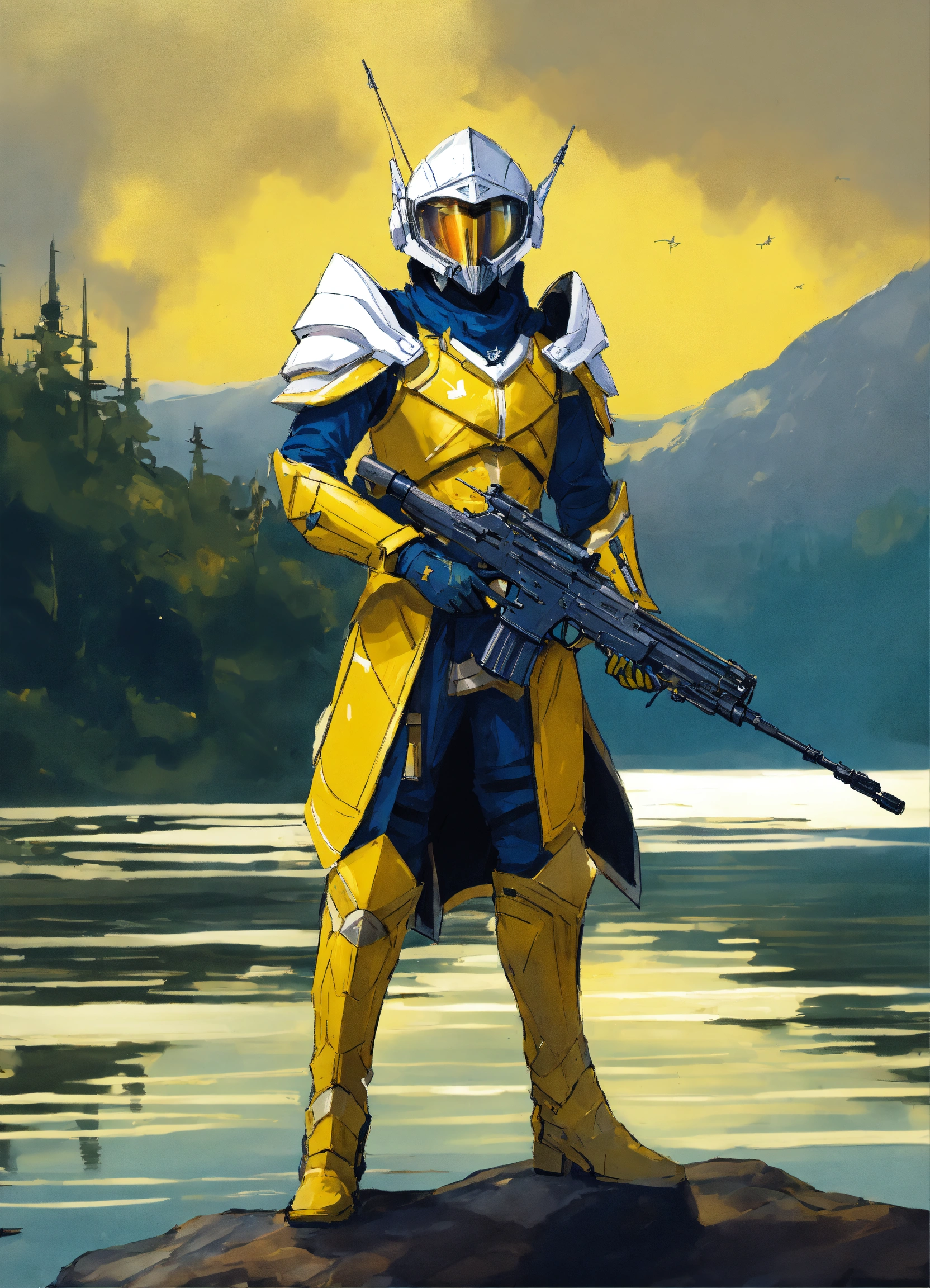 Drawing of a full body of a high elf sci fi soldier wearing sci fi elven armor, navy blue and yellow and white sci fi armor and helmet, visor, boots, male, holding a light machine gun, standing on a lake