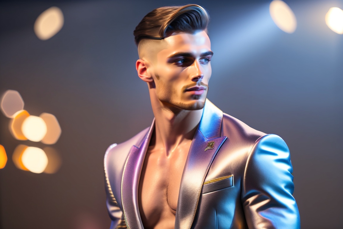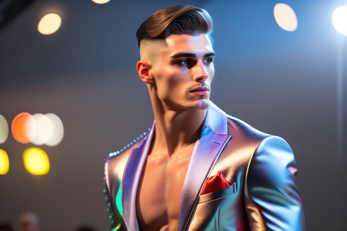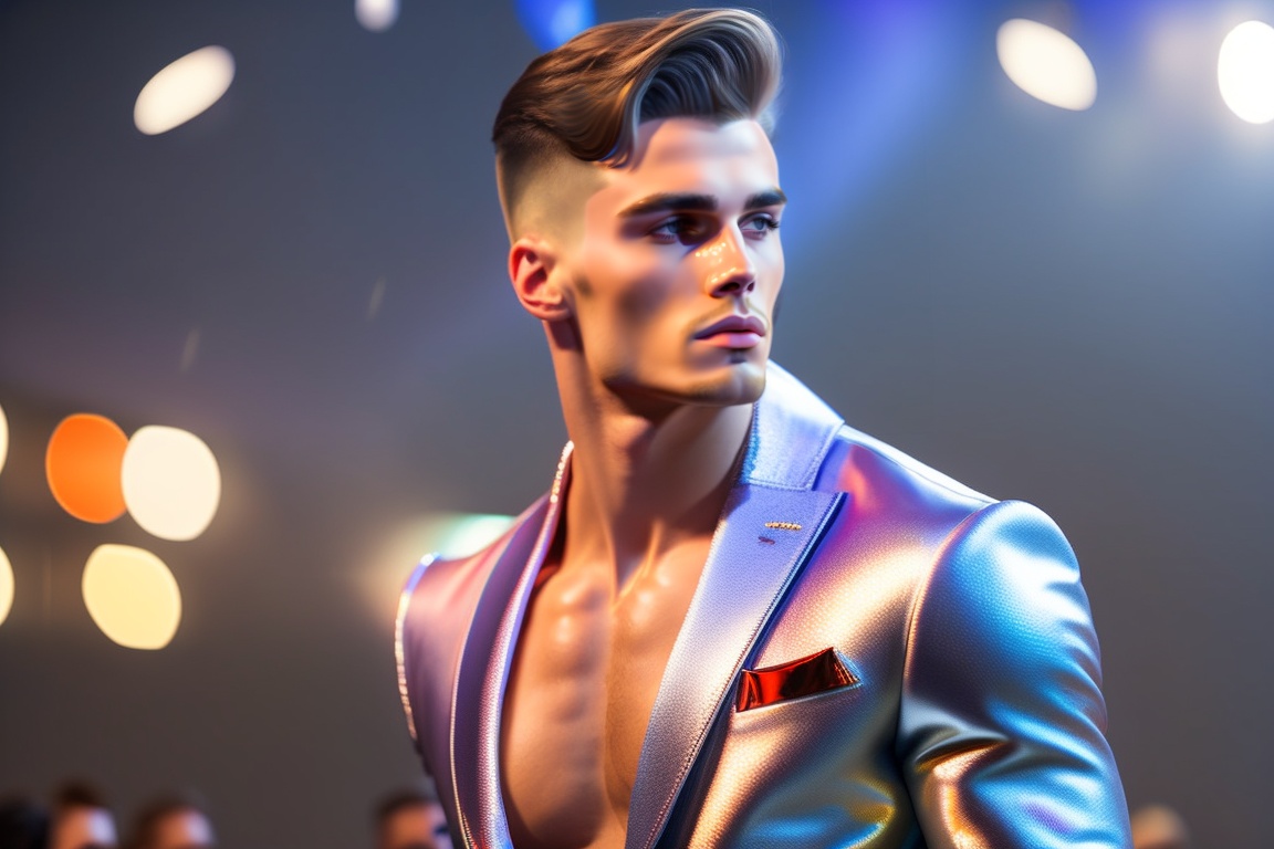 Full-body russian model male thin boney model, nyc runway model, many models, on runway, volumetric lighting, bokeh