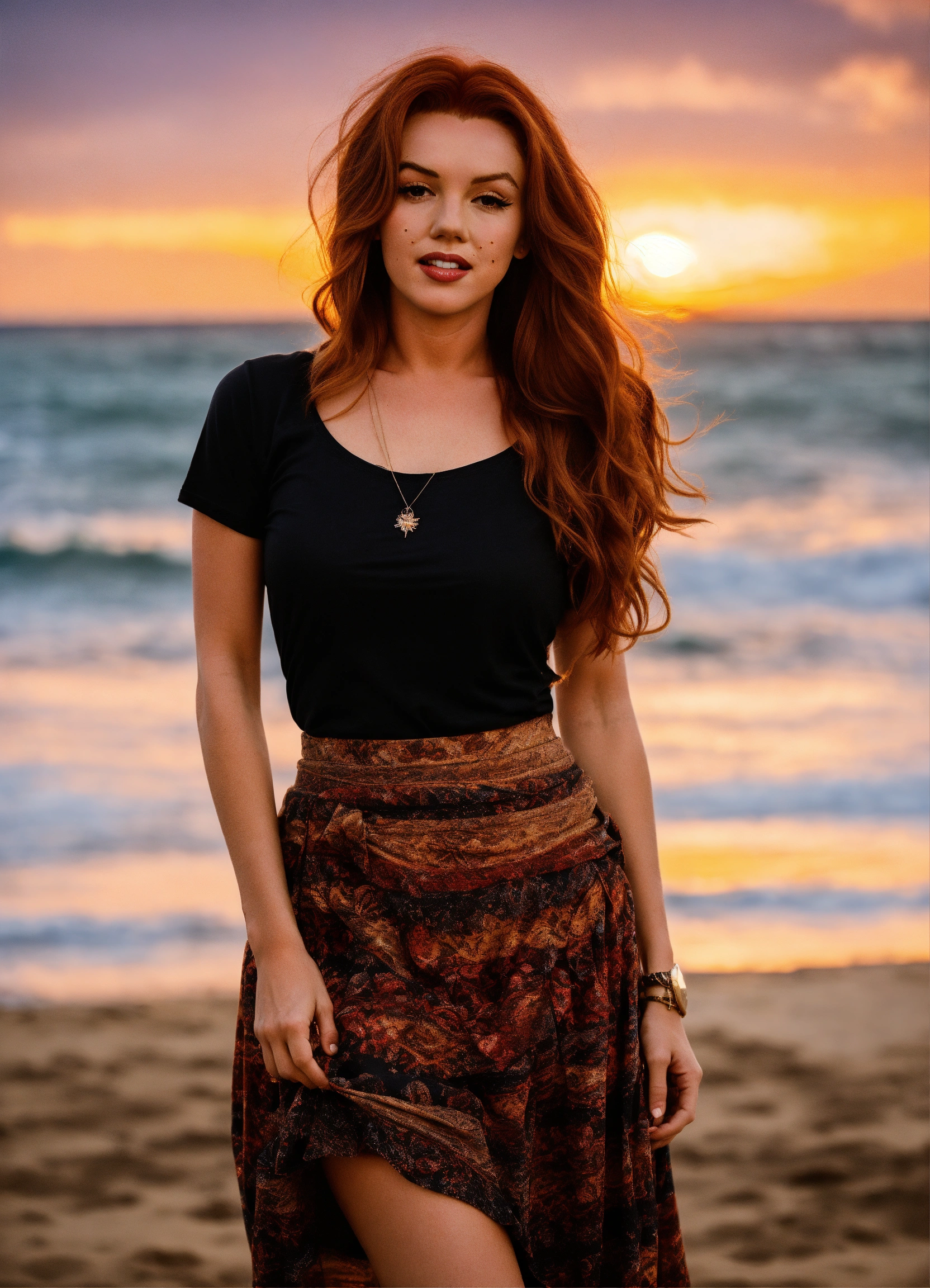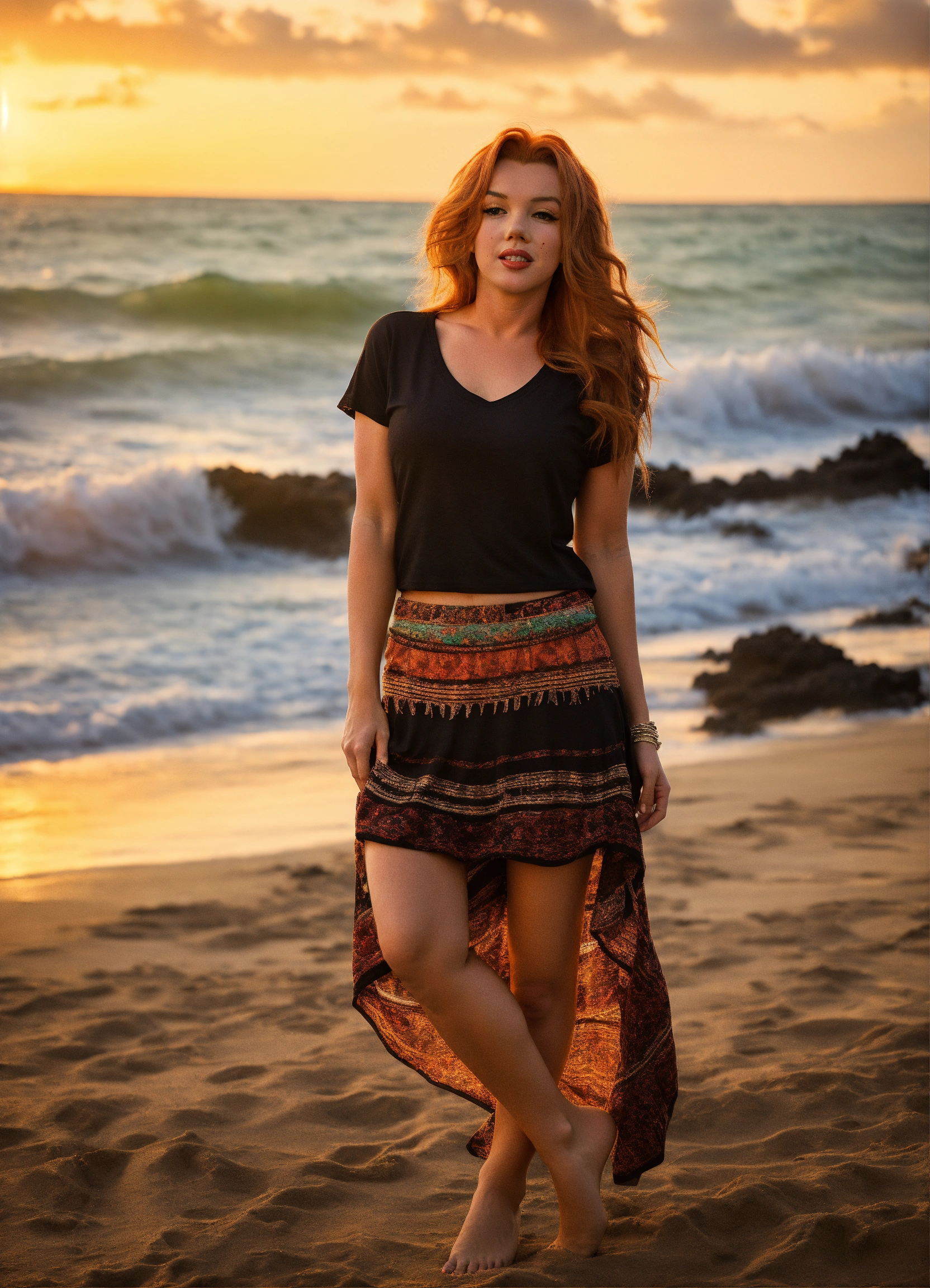 Full body photo of one marilyn monroe type model with with long auburn hair, modeling plain blank black t-shirt, with pretty boho skirt in hawaii at sunset. front of shirt needs to be visible and blank.