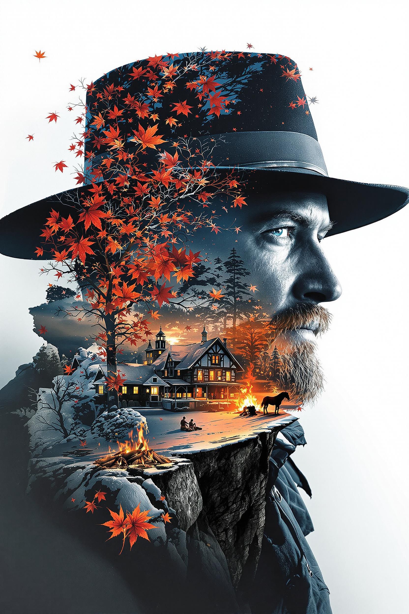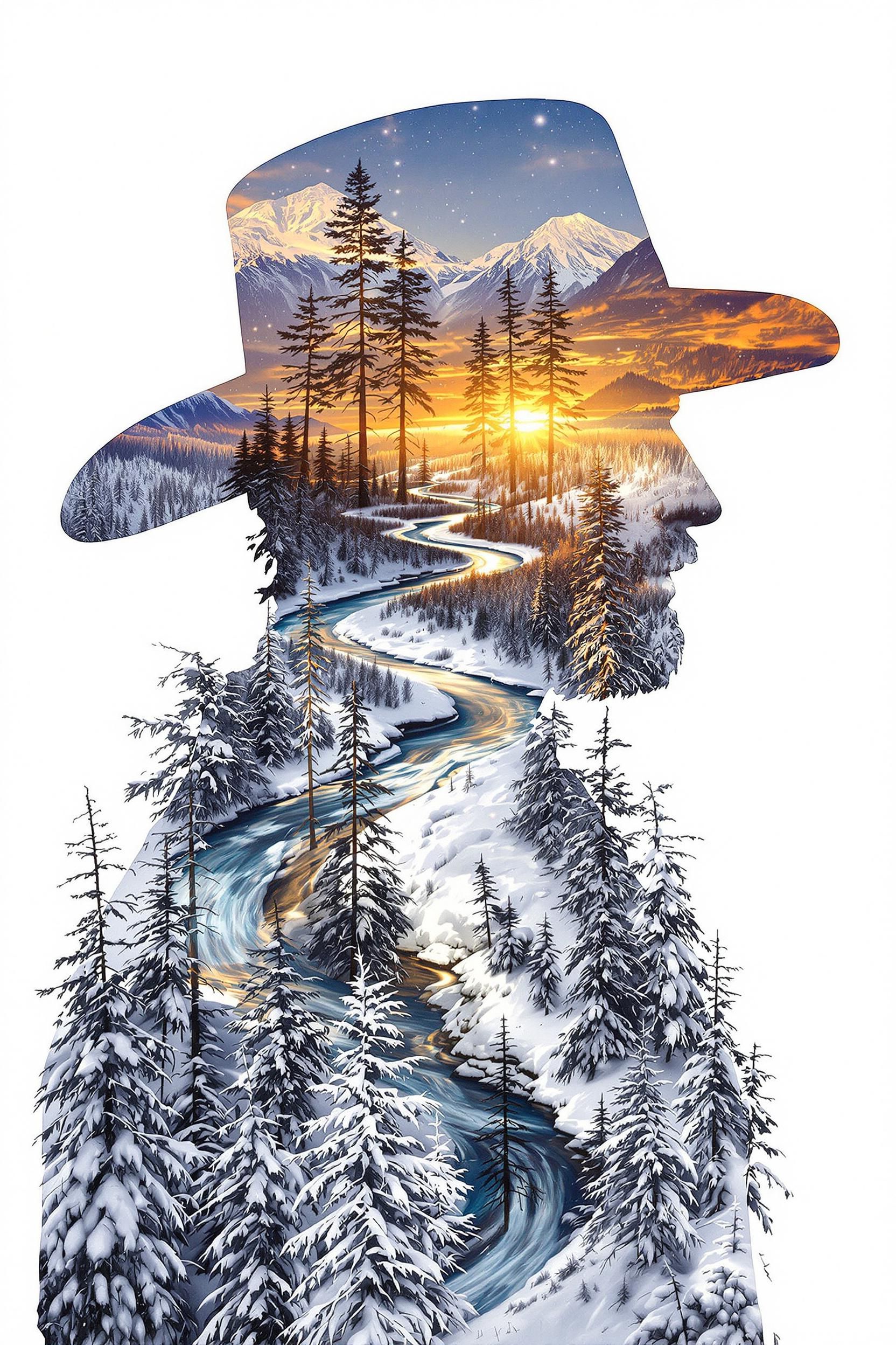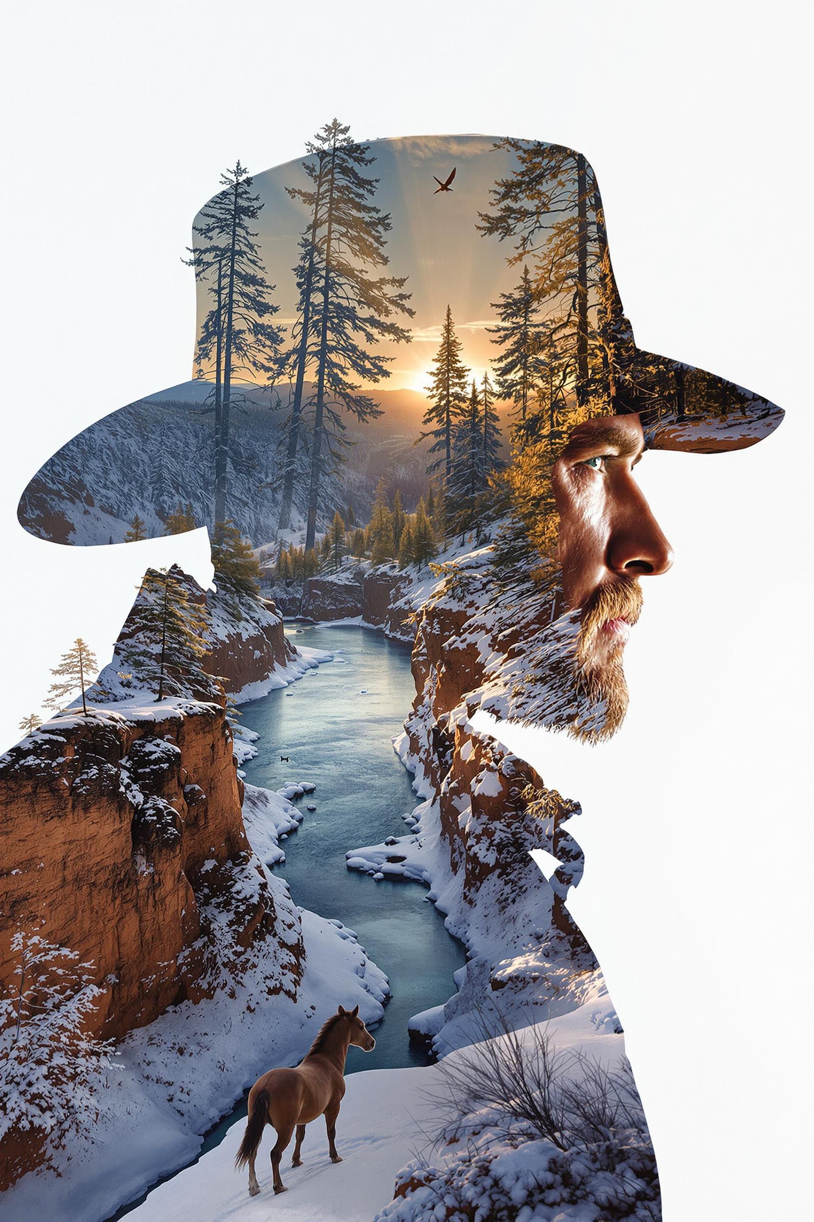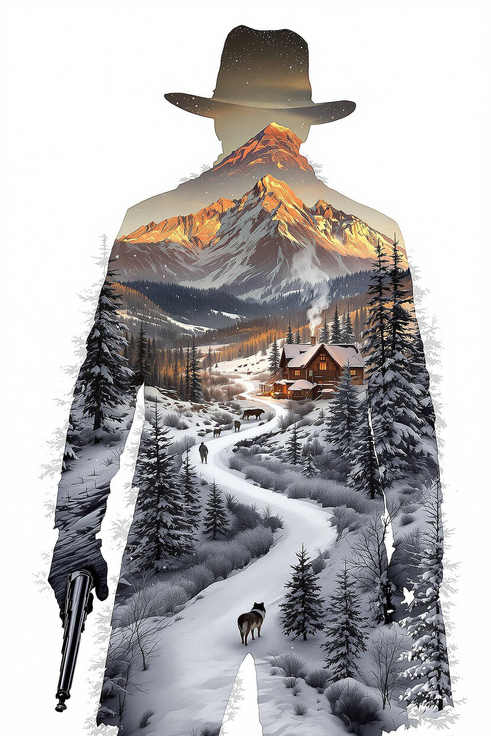 Double exposure, midjourney style, merging, blending, overlay double exposure image, double exposure style, an exceptional masterpiece by yukisakura revealing a fantastic double exposure composition of arthur morgan’s silhouette harmoniously intertwined with the visually striking, rugged landscapes of the american frontier during a cold winter. snow-covered pine forests, frosty mountain peaks, and a lone horse cutting through the trail echo outward through the fabric of his figure, adding layers of narrative and solitude. beautiful tension builds as the stark monochrome background maintains razor-sharp contrast, drawing all focus to the richly layered double exposure. characterized by its vibrant full-color scheme within arthur’s silhouette and crisp, deliberate lines that trace every contour with emotional precision. (detailed:1.45). (detailed background:1.4).