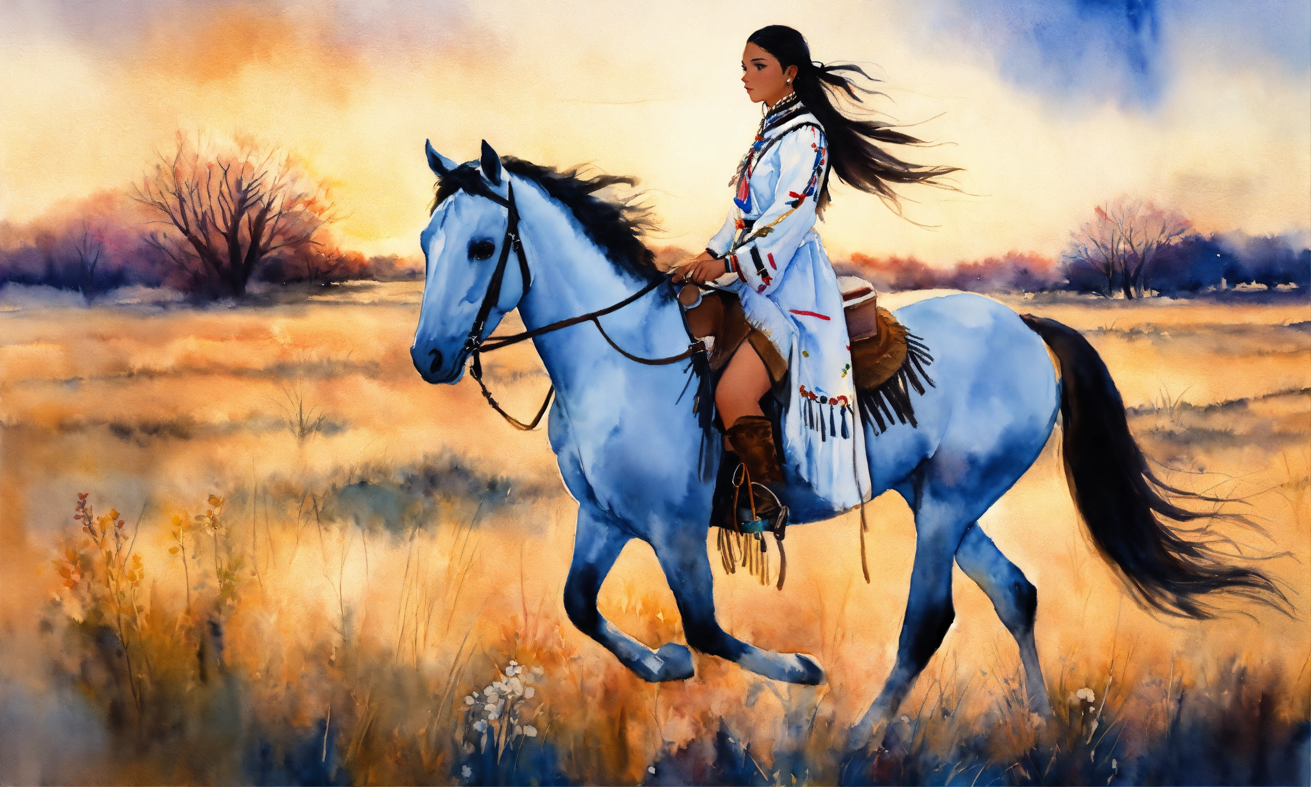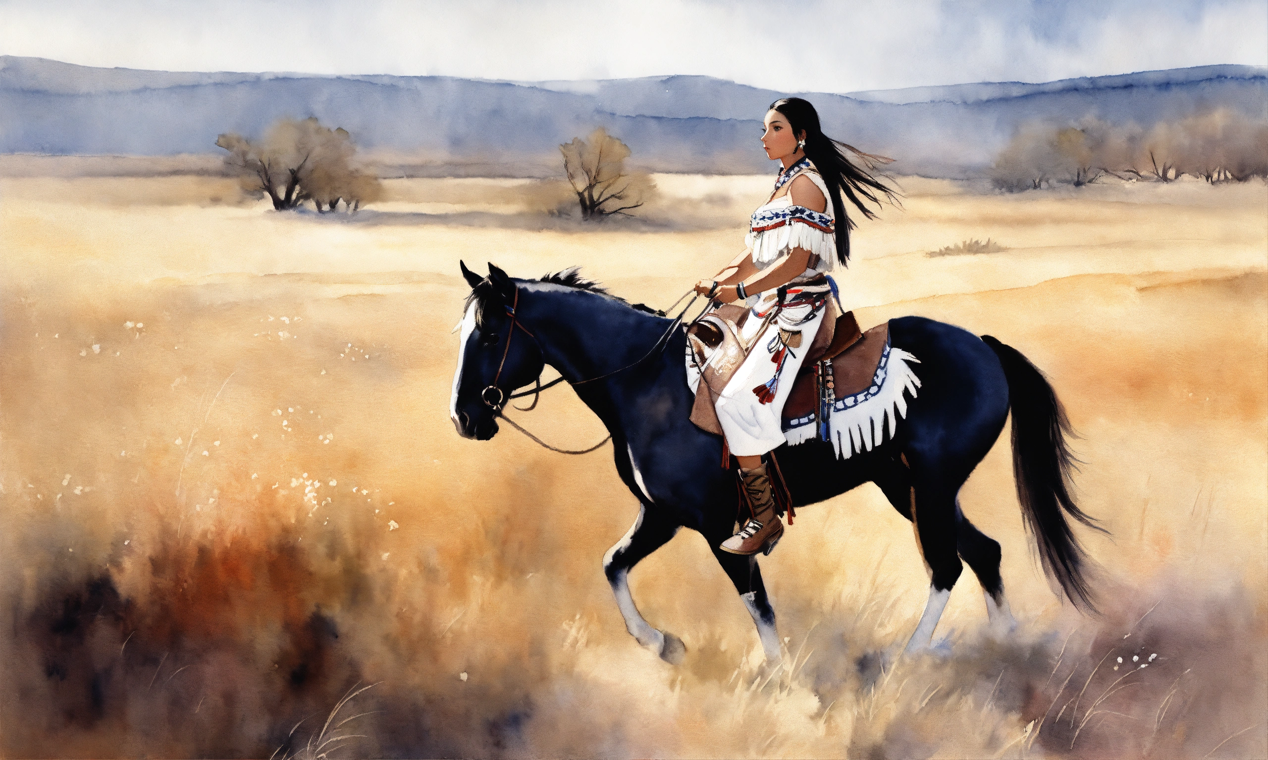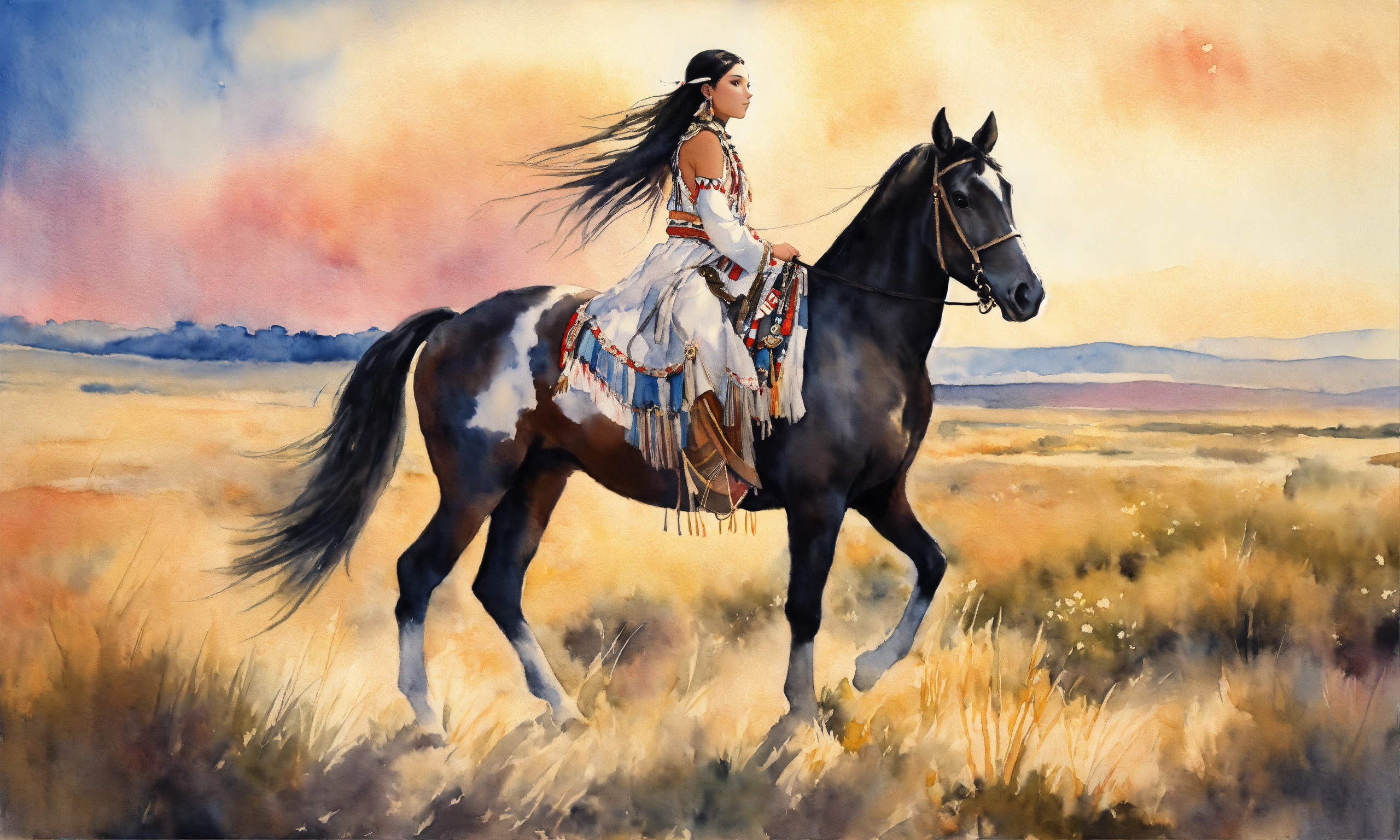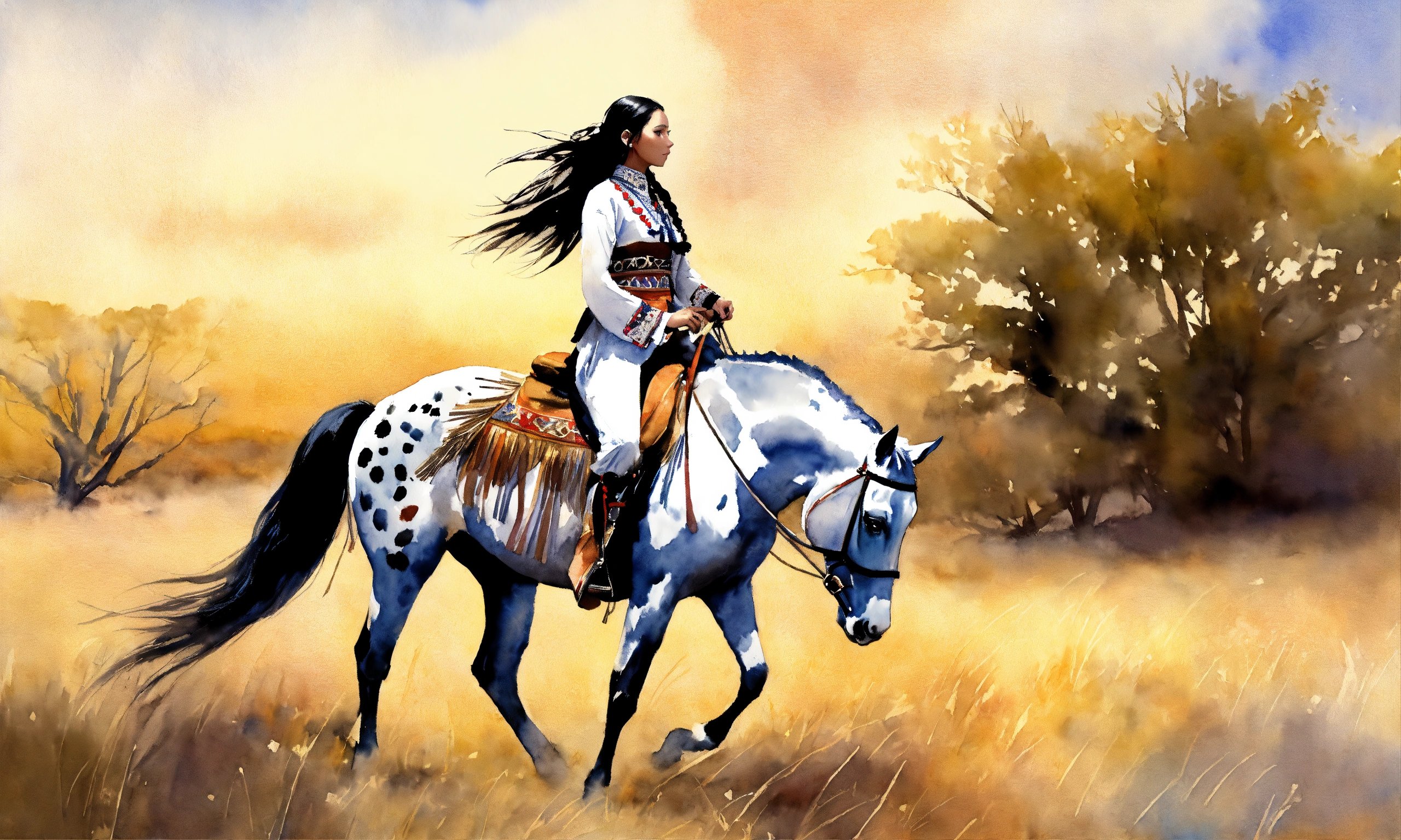 Create a full figure image, watercolor painting, of a beautiful, young, native american woman, wearing a traditional costume, she is riding a beautiful black and white spotted pinto horse across the oklahoma prairie in the spring