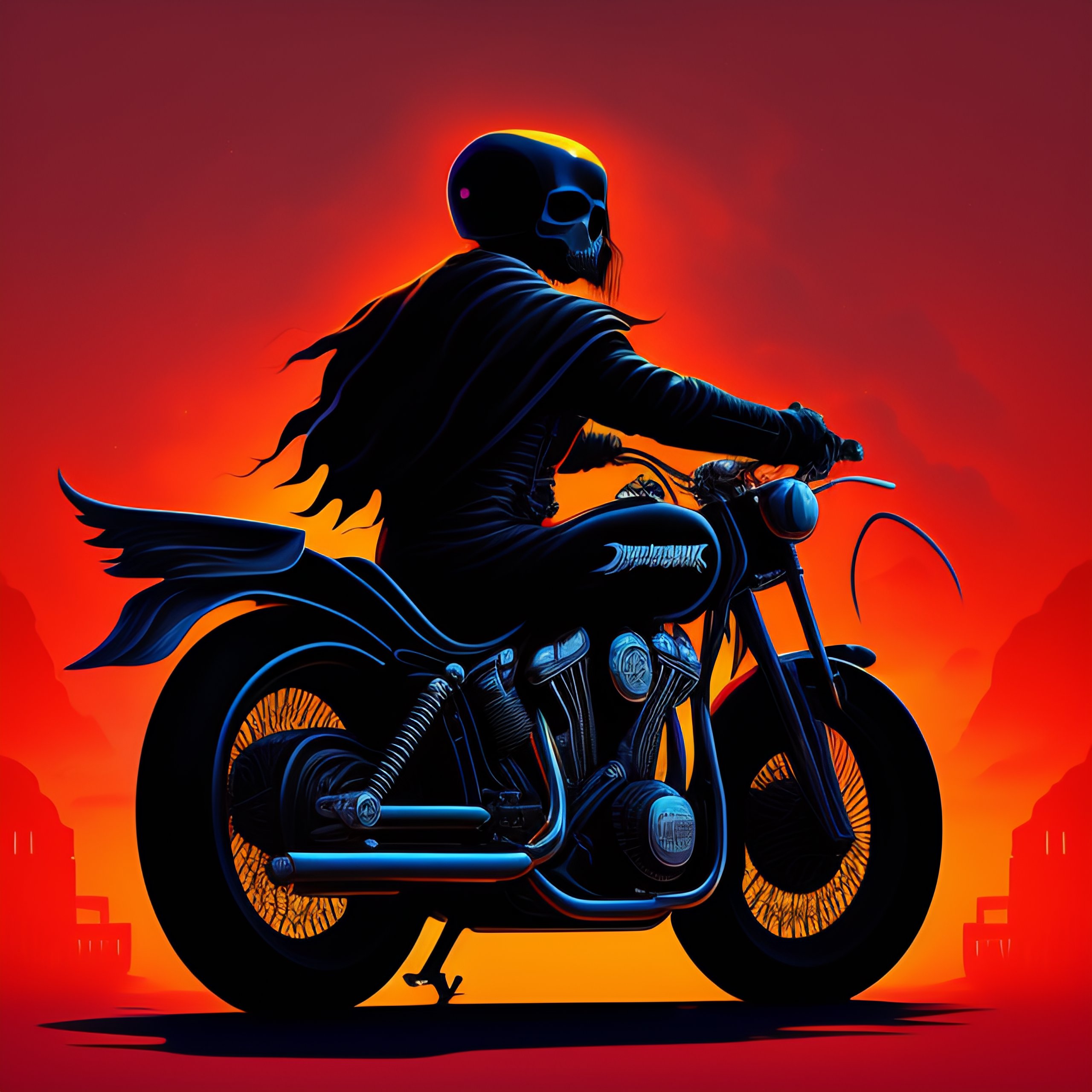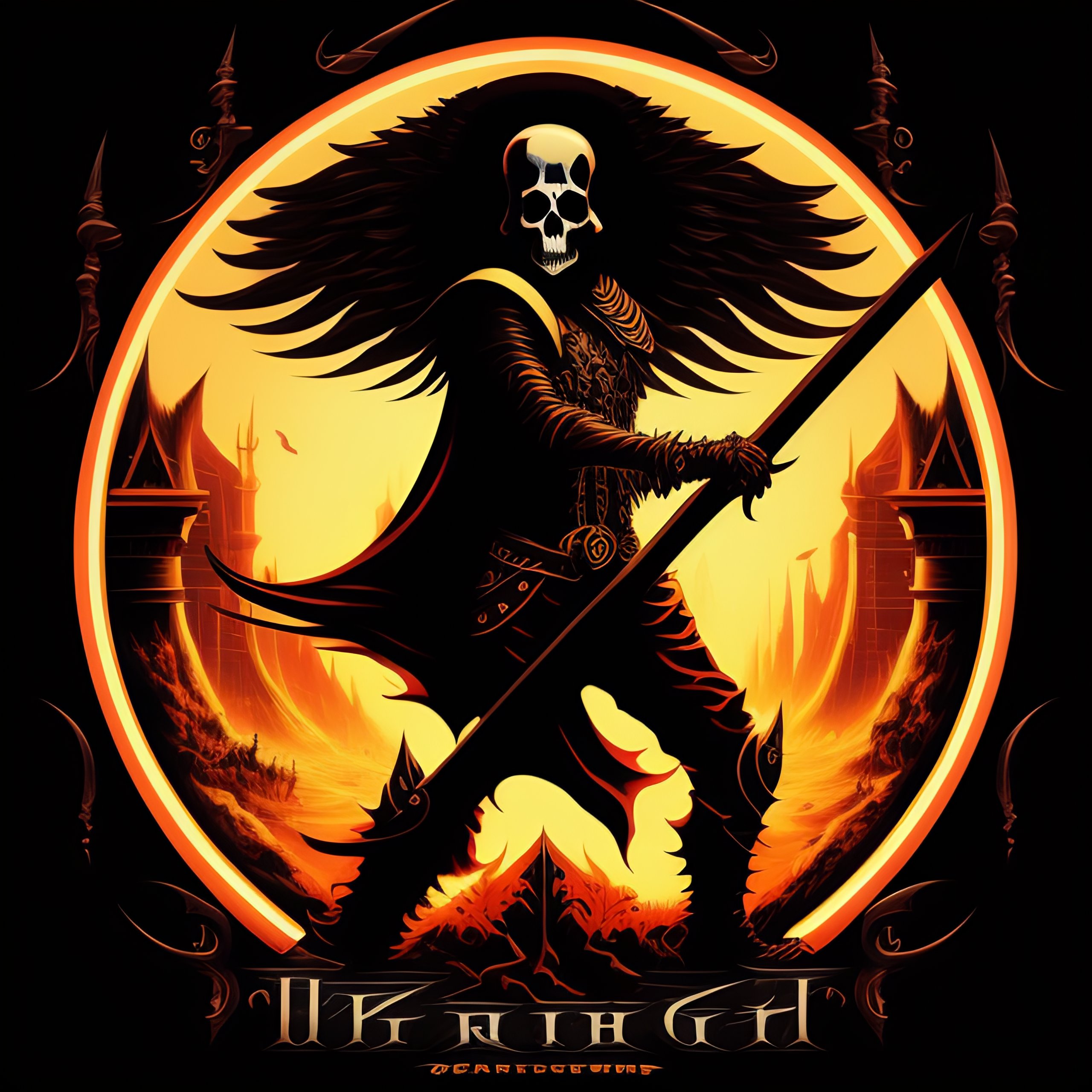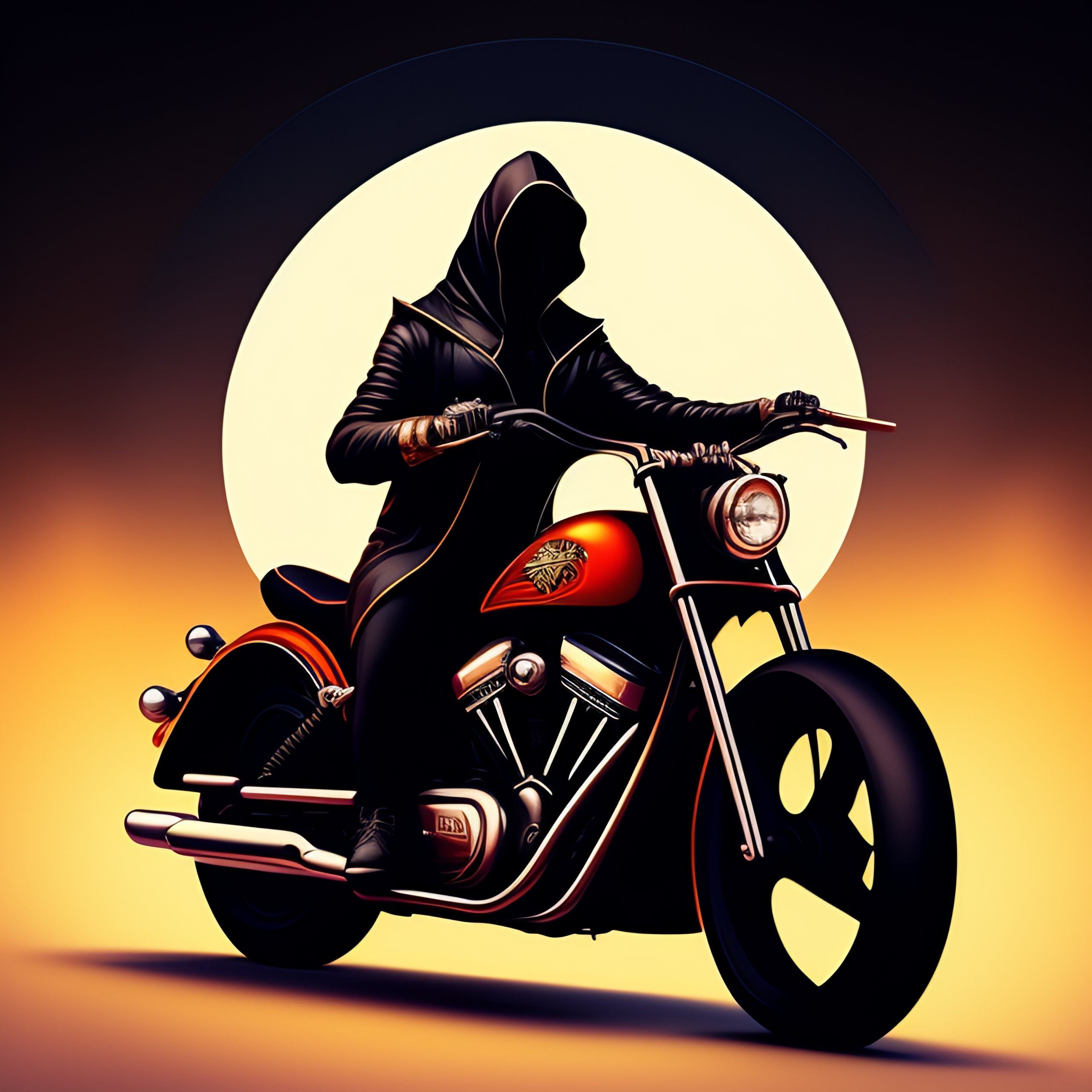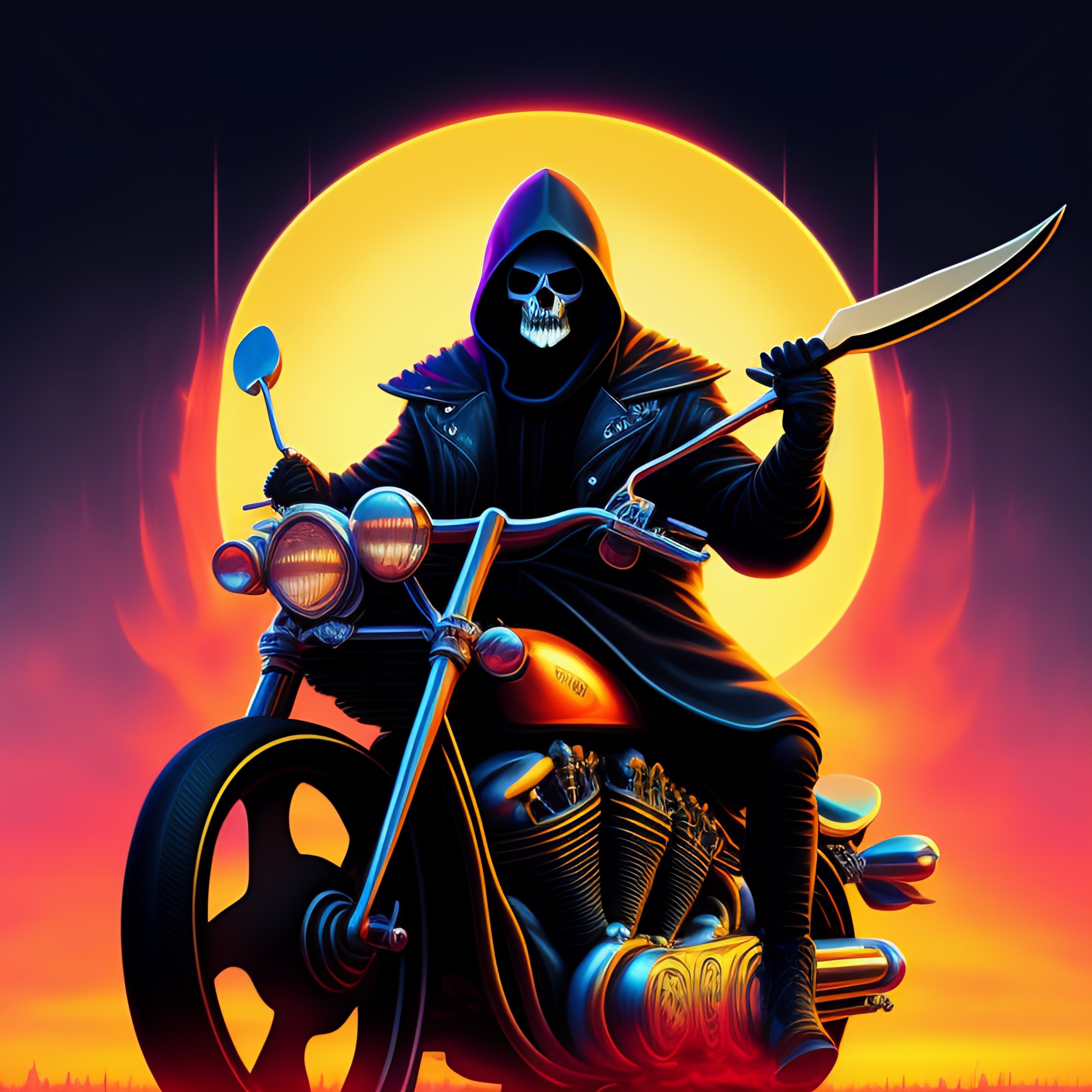 Death metal band album cover art, the grim reaper riding a motorcycle and holding a scythe, typography logo