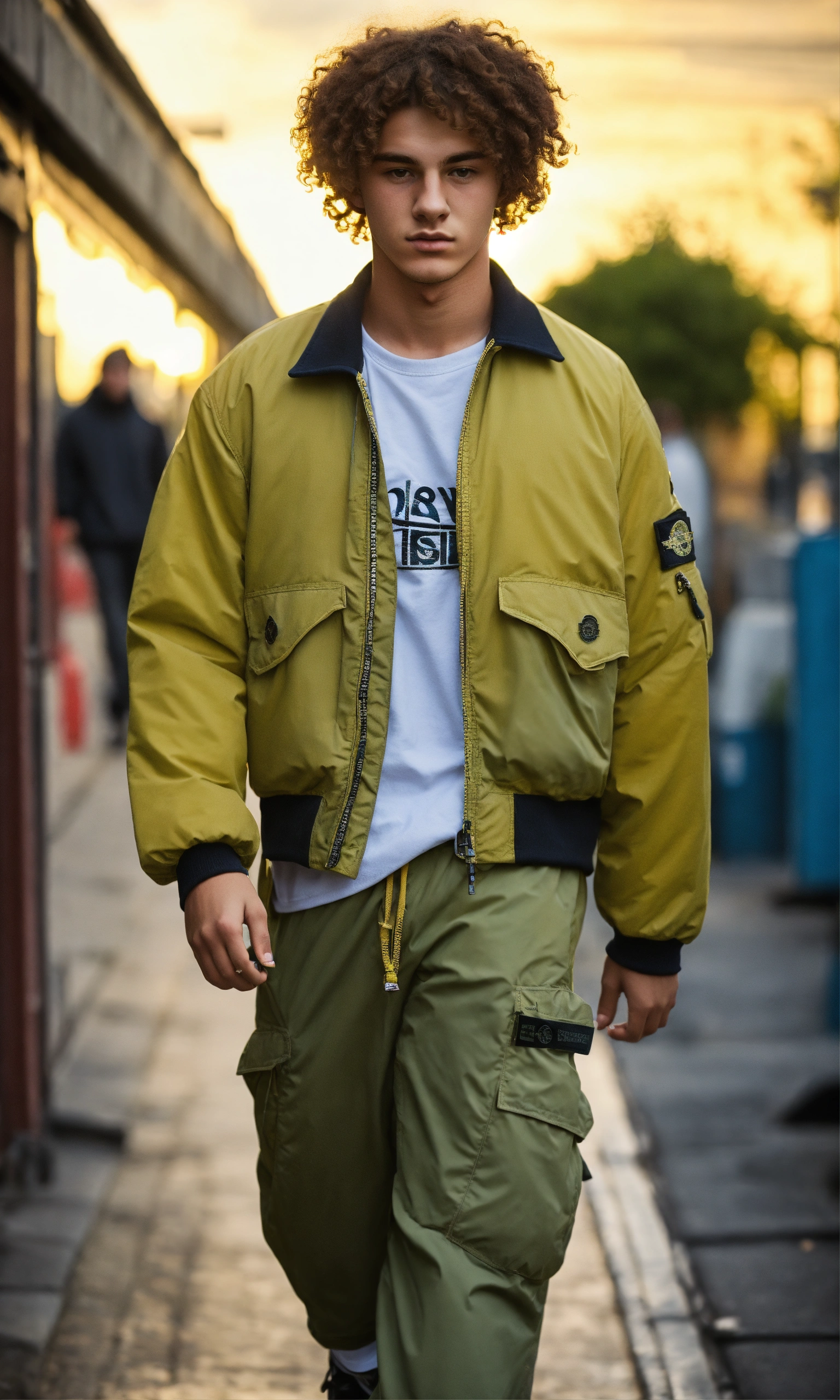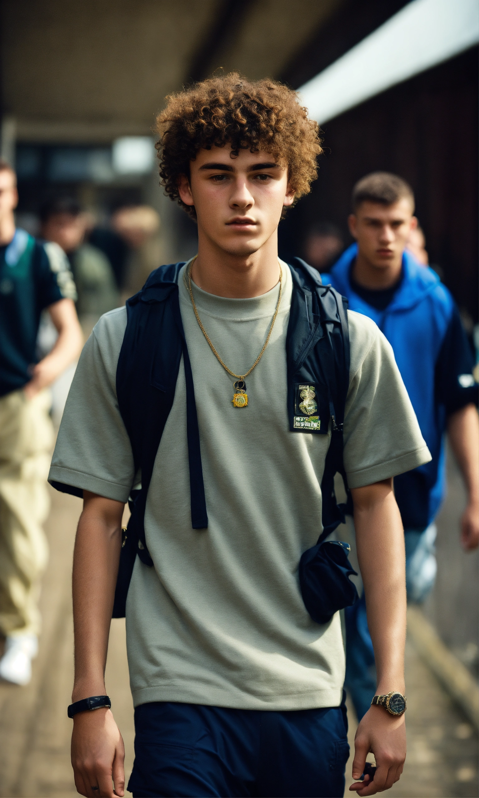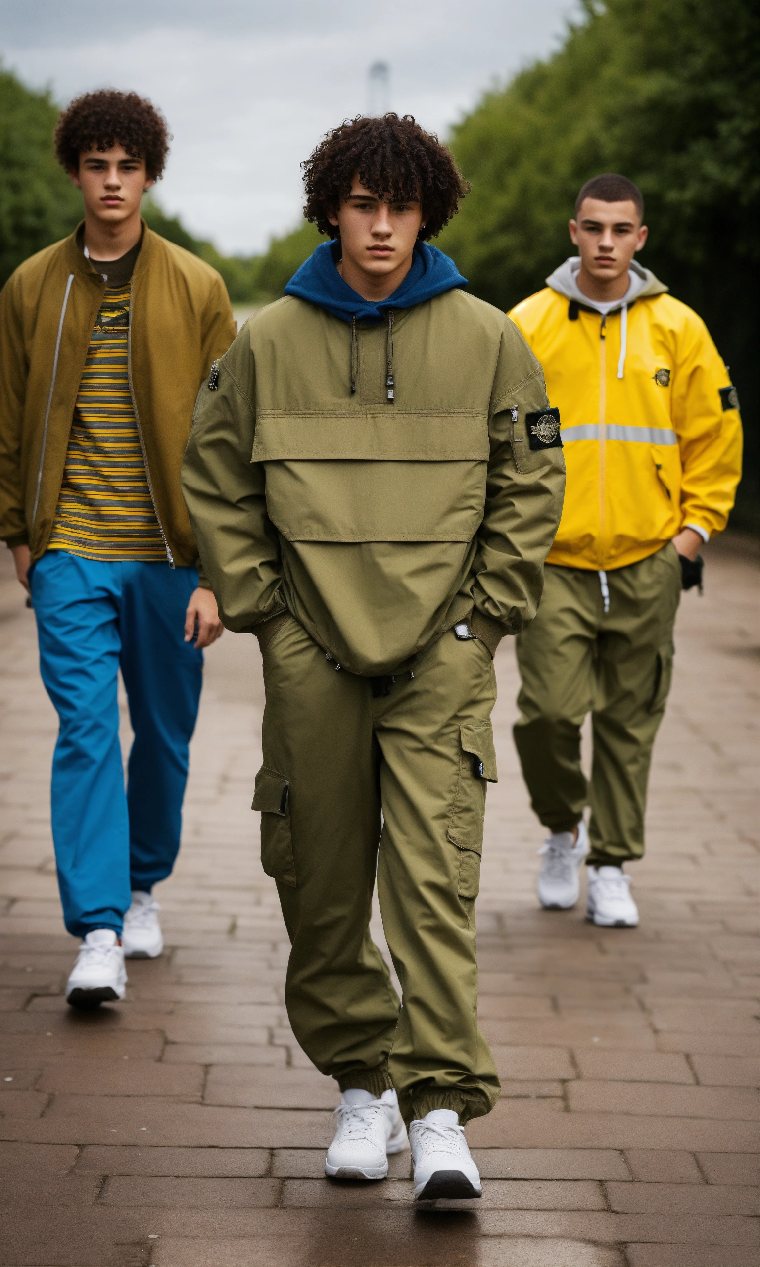 18 year old british chav, he has short curly hair, he is wearing stone island, he walking with 2 other chavs