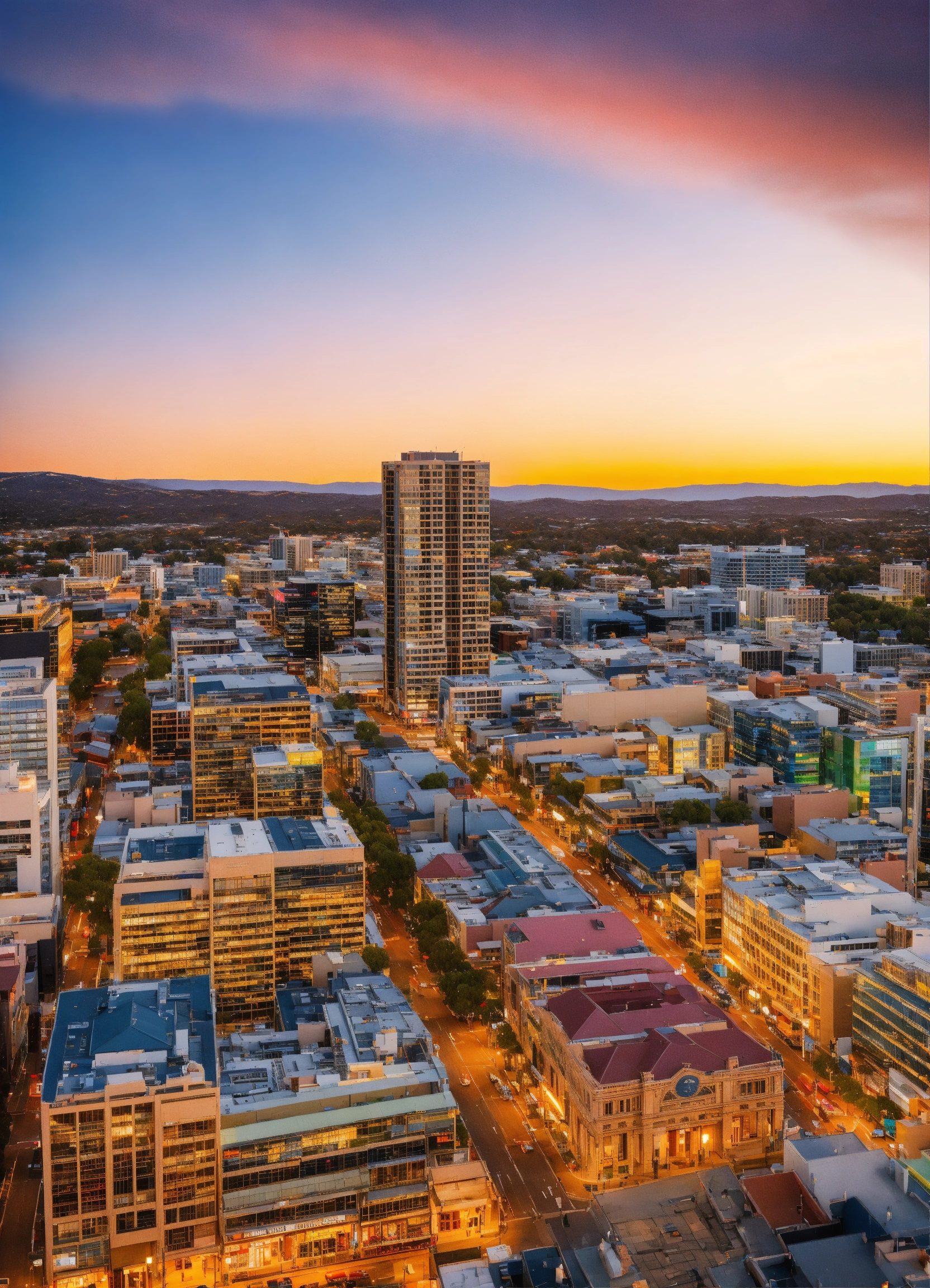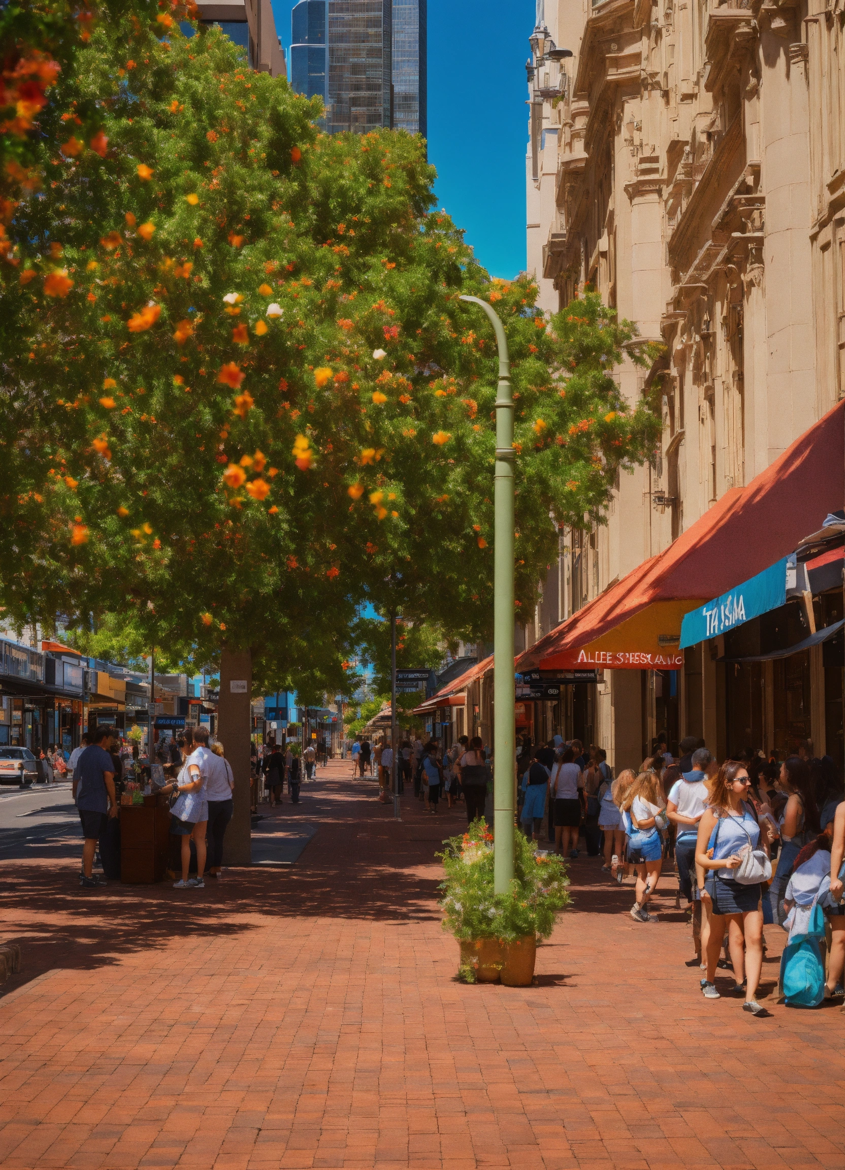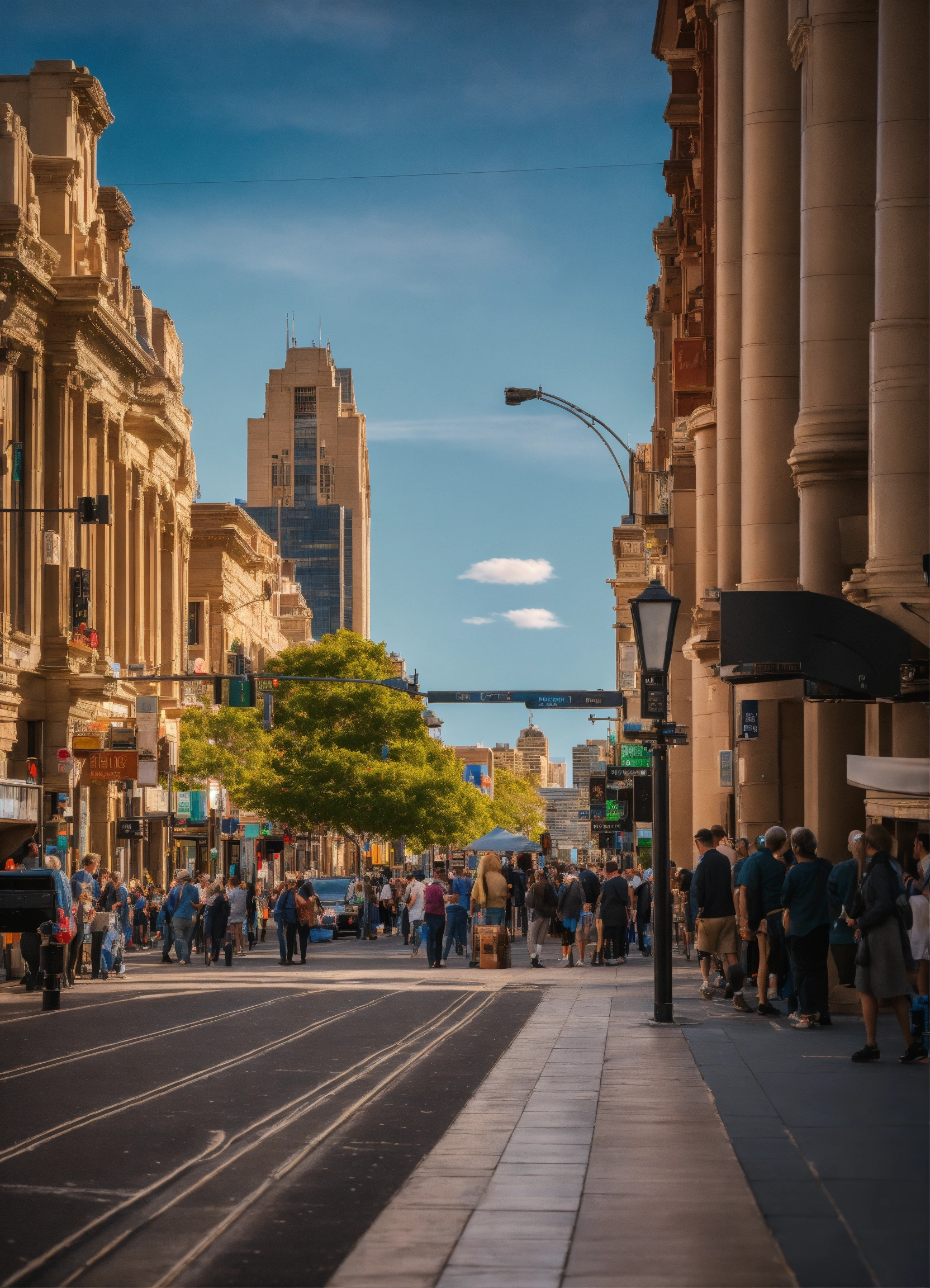 High quality, 8k ultra hd, masterpiece, realistic photo, wash technique, colorful, pale touch, smudged outline, ttartisan tilt 50mm lens, greater depth of field, miniature style, adelaide cbd, crowded, awesome full sharp colors, summer sky