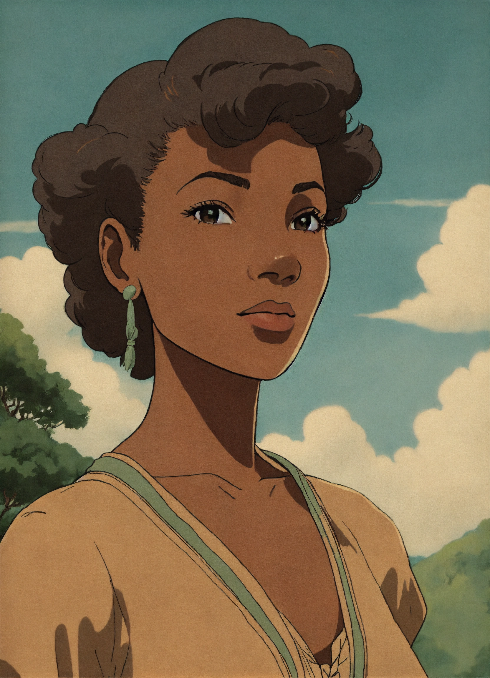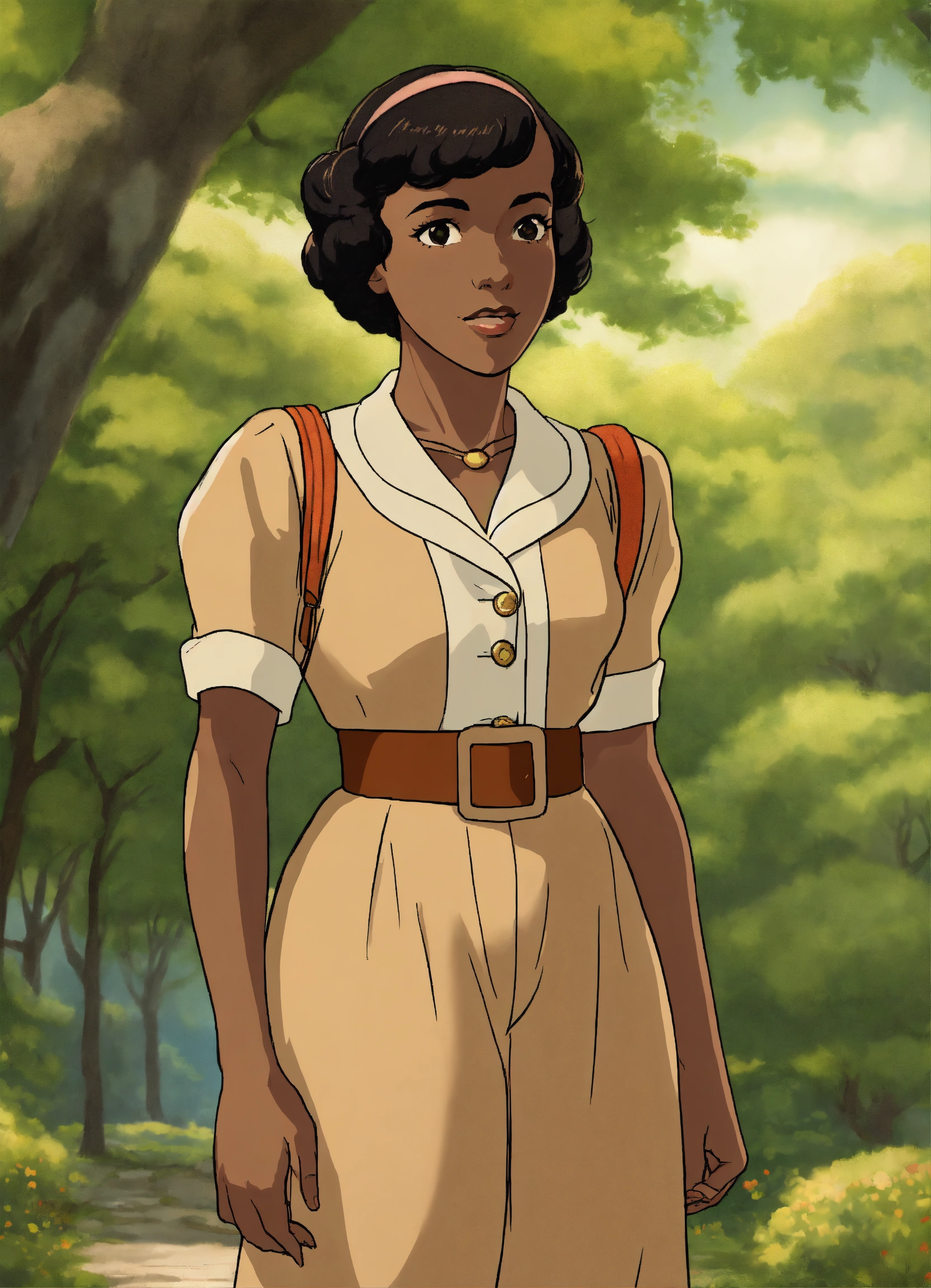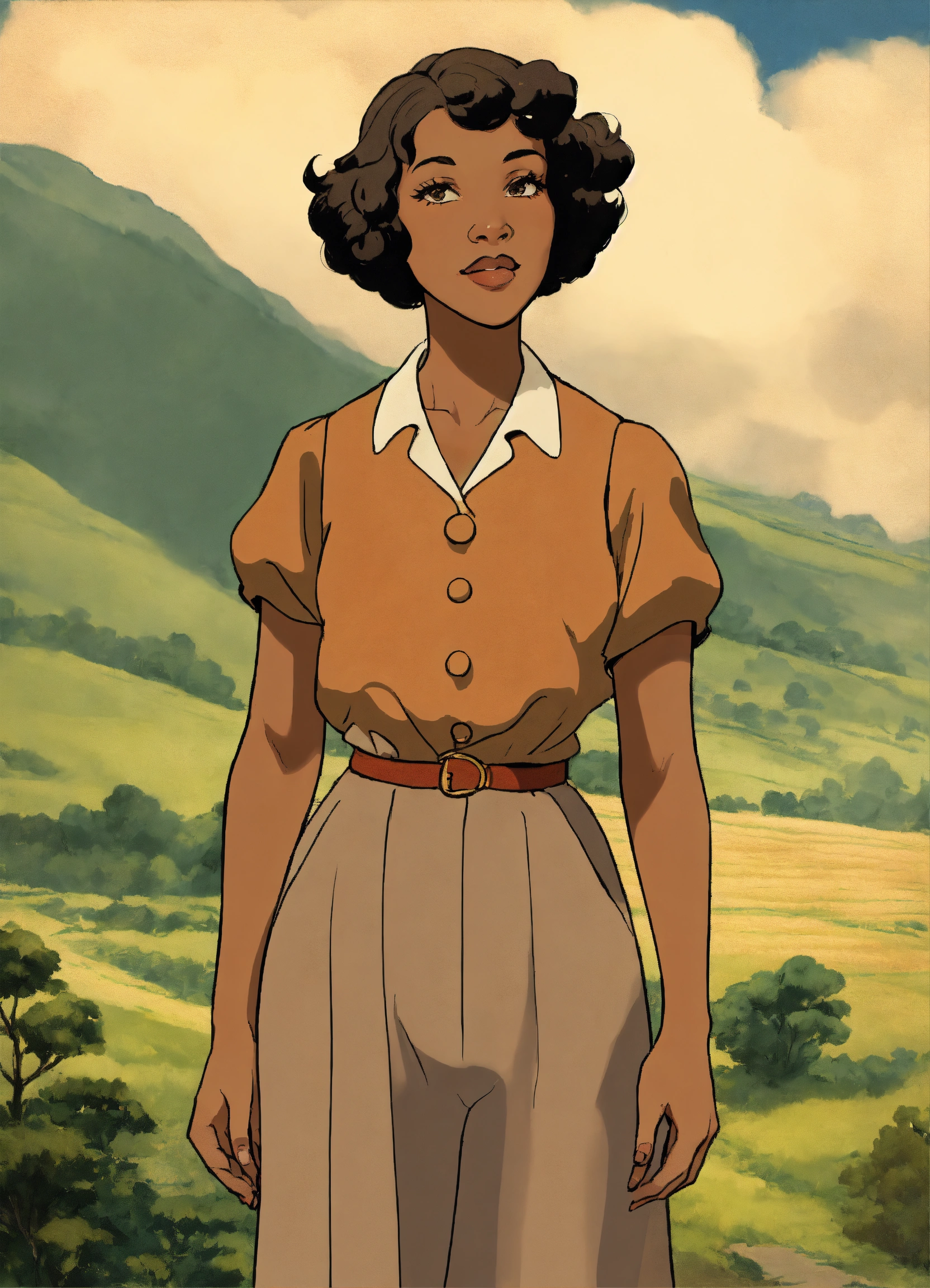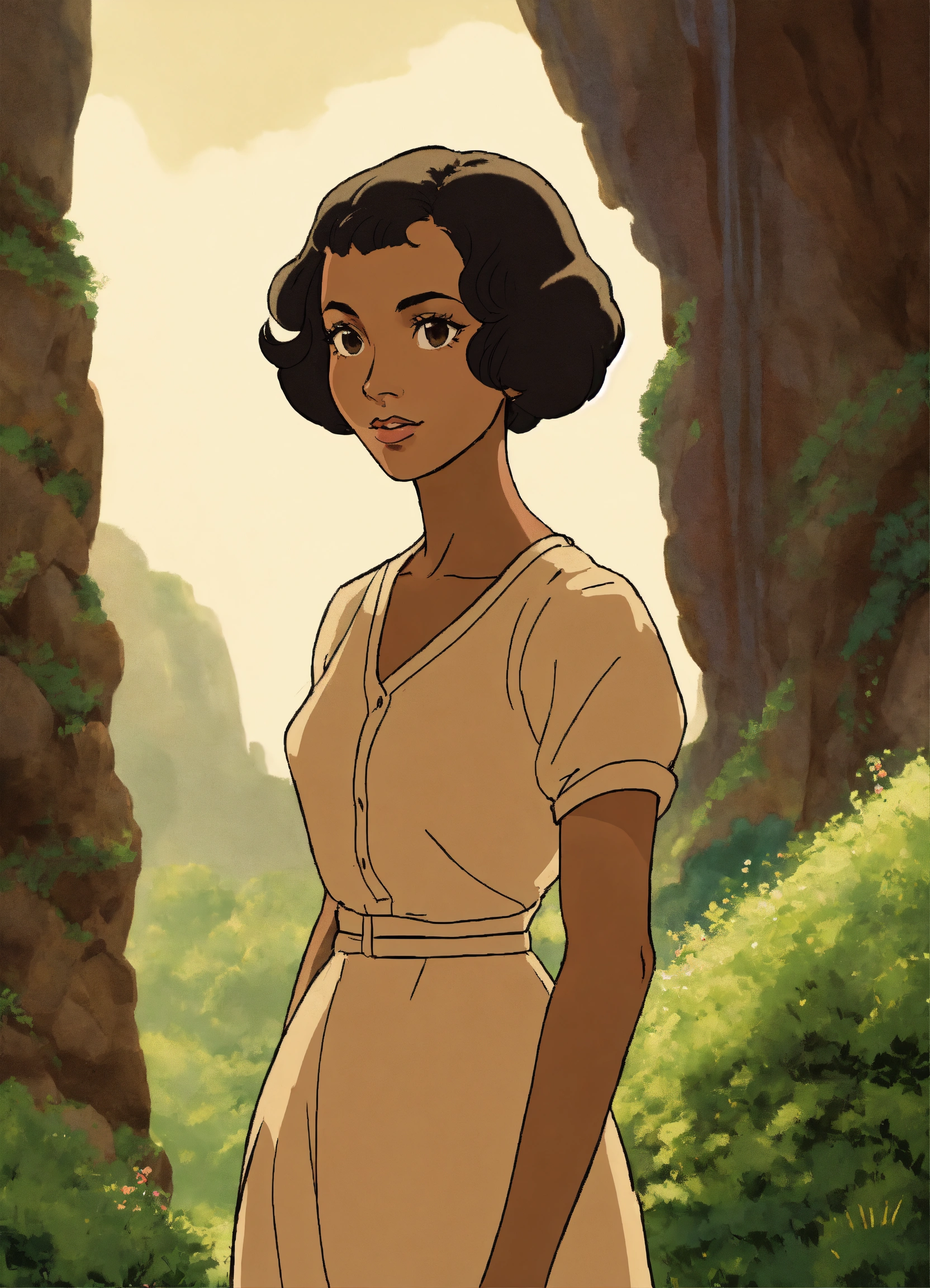 A 1930s head to toe picture of a light brown-skinned black woman with short 1930s hairstyle, very wide-nose, standing in a glen with bare feet by studio ghibli.