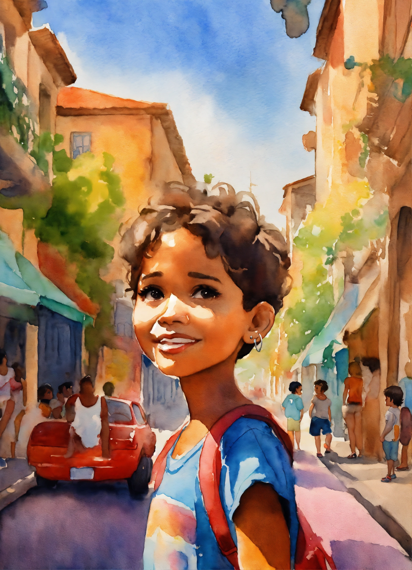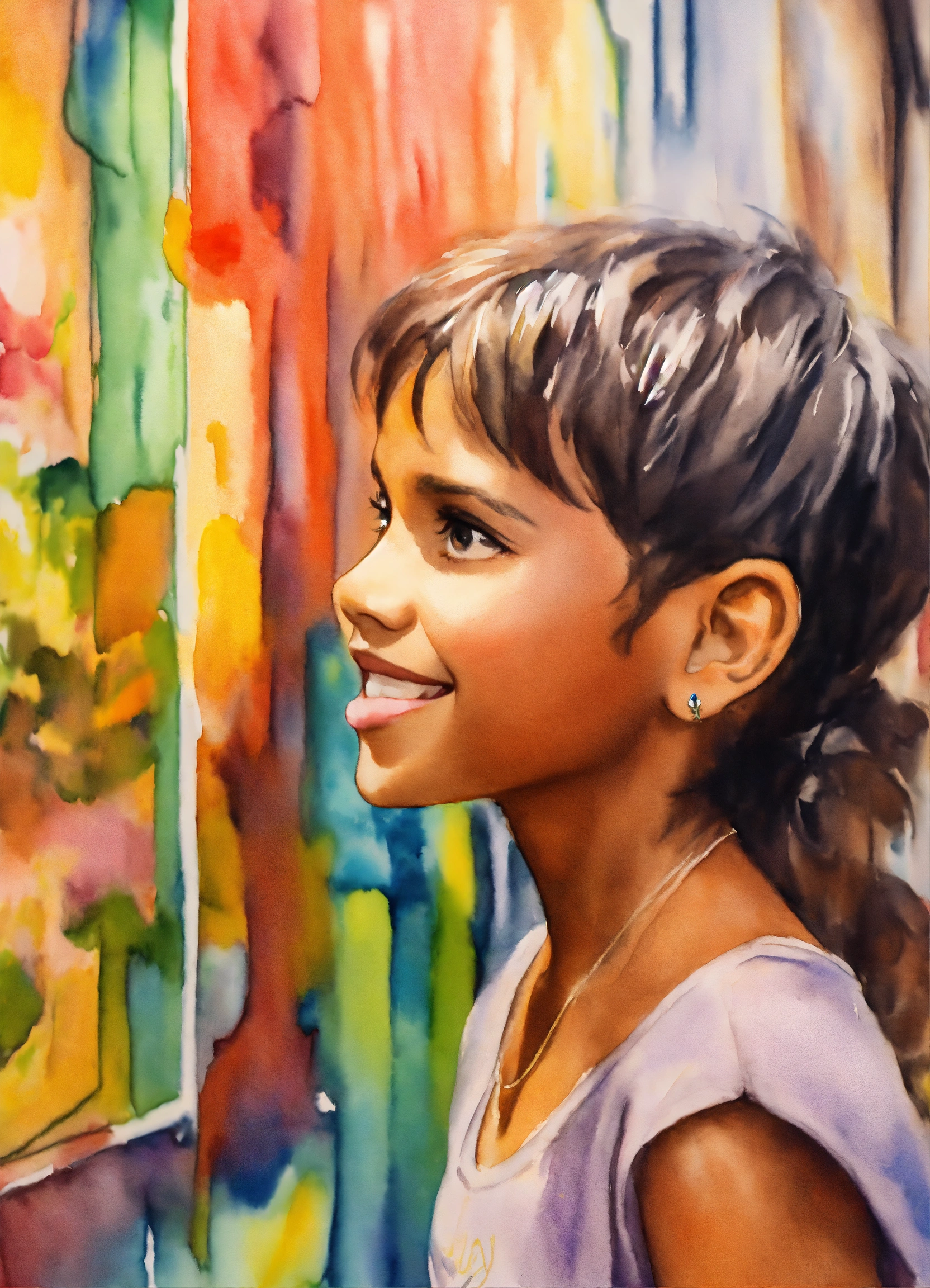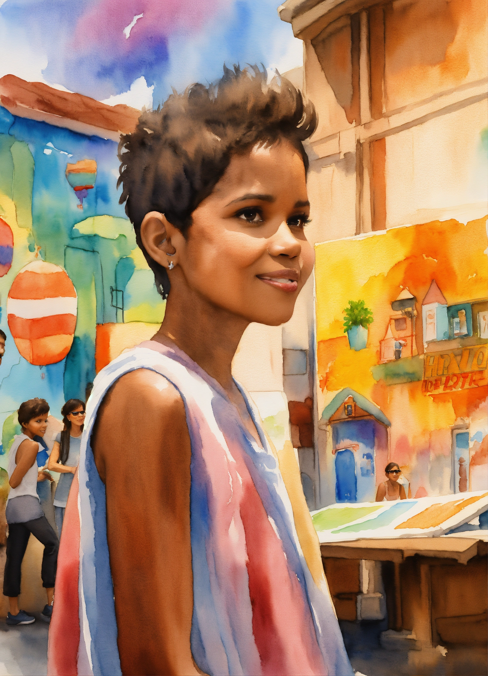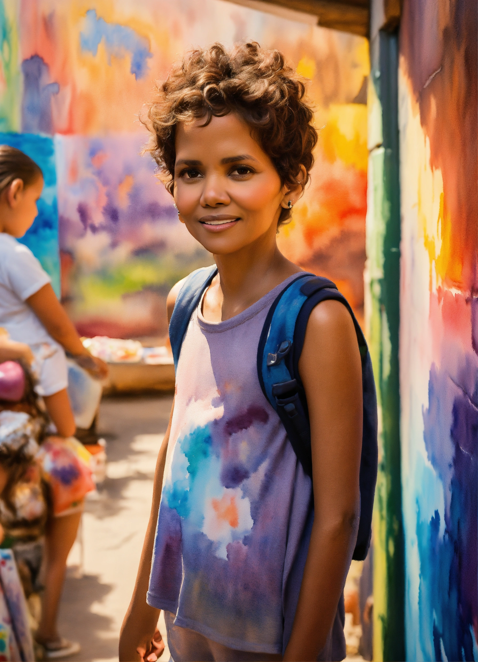Watercolor pixar painting of hispanic 8 year old halle berry talking to local artists with colorful murals in the background, watercolor pixar style cartoon