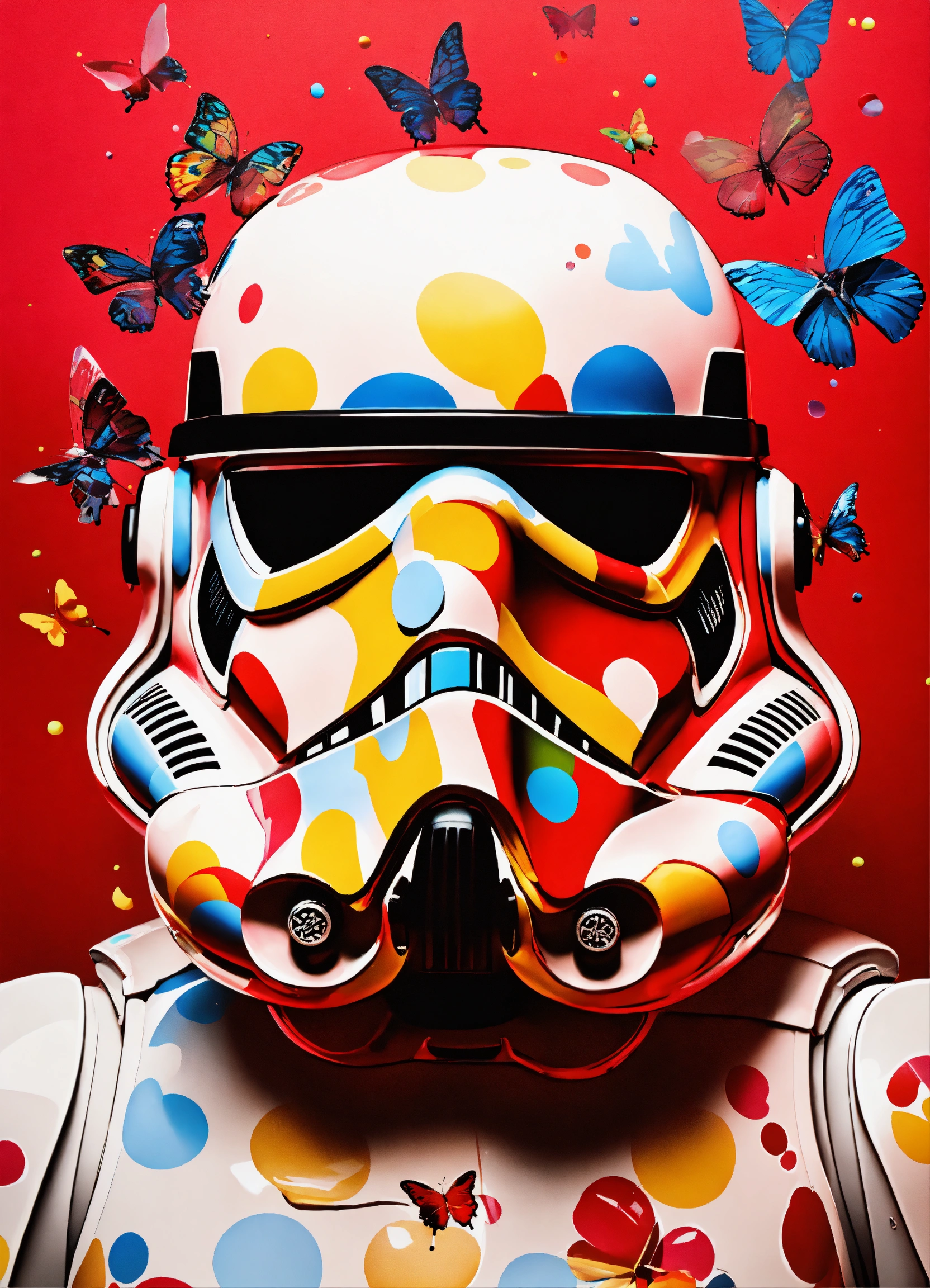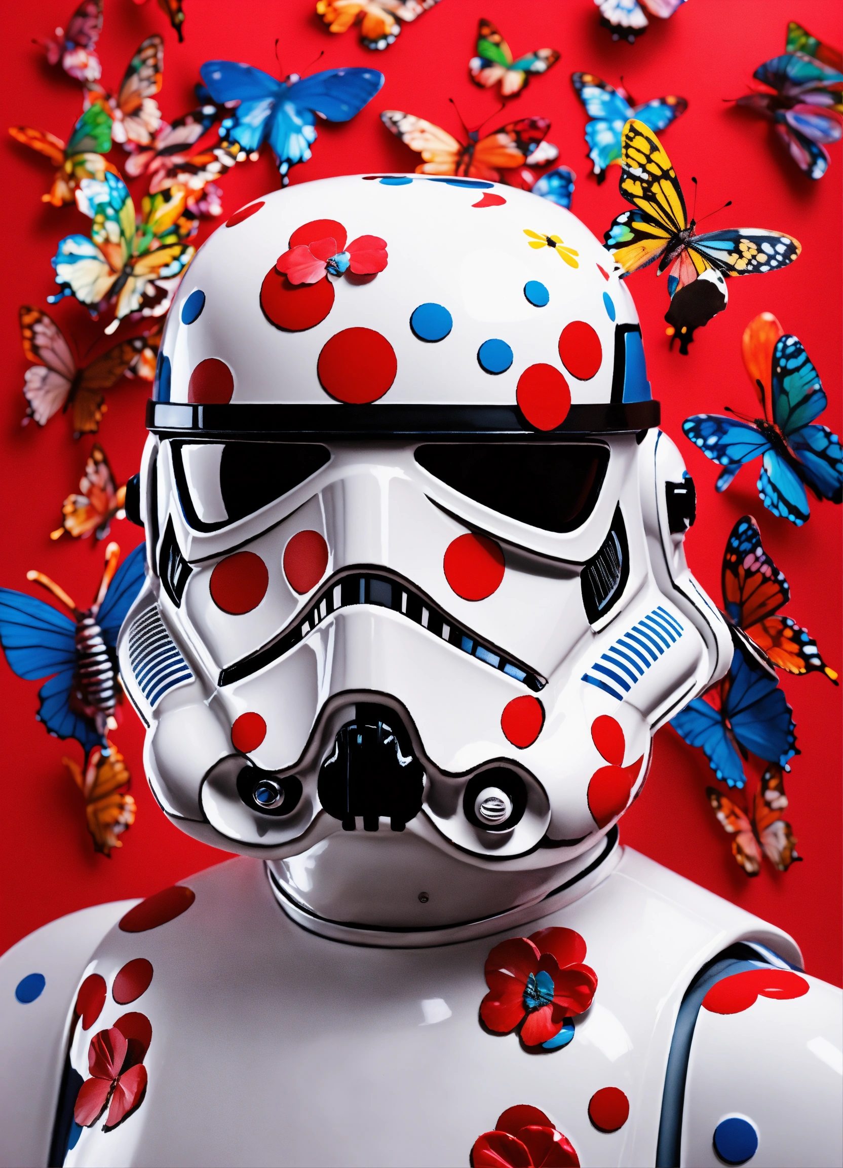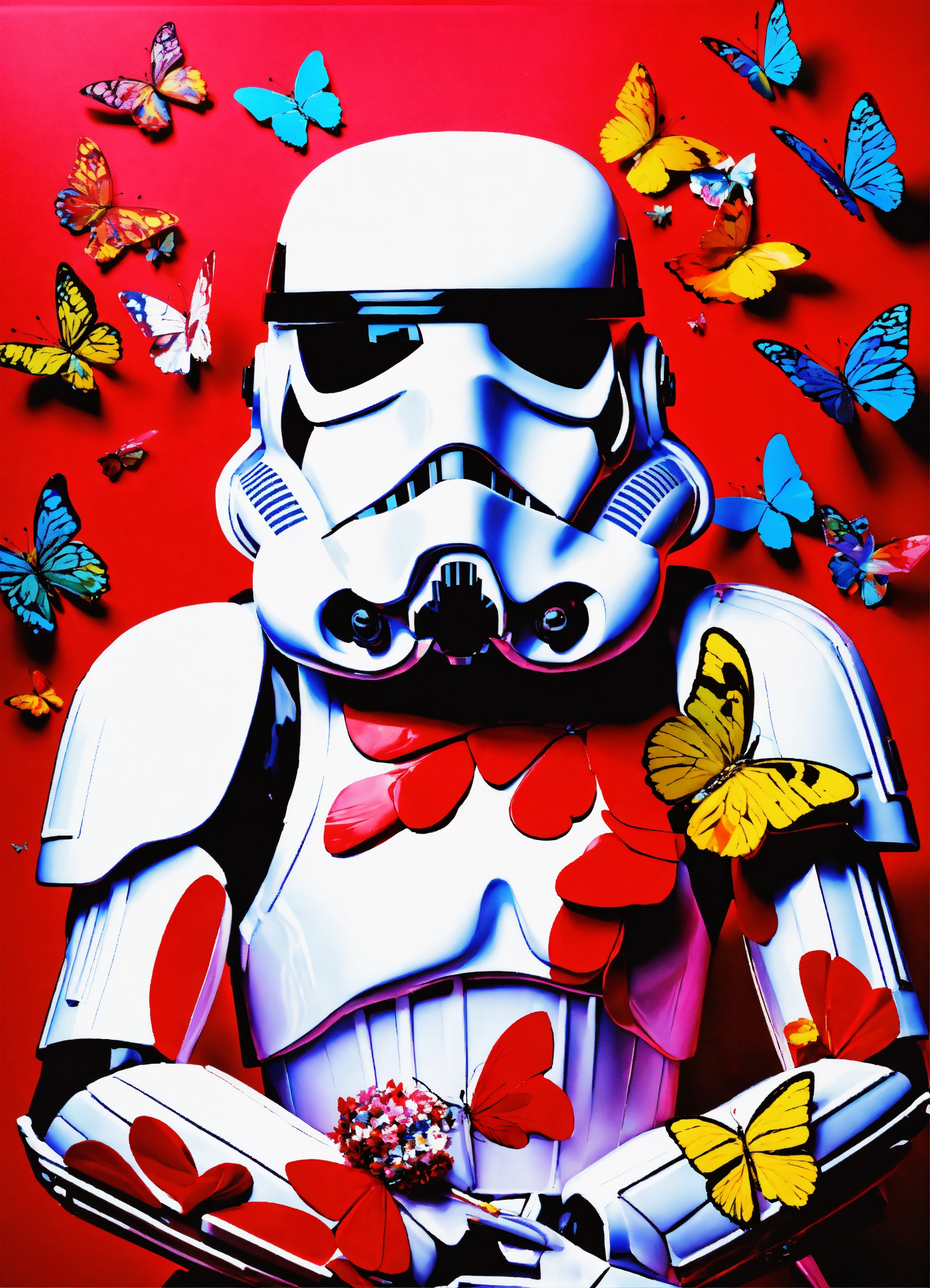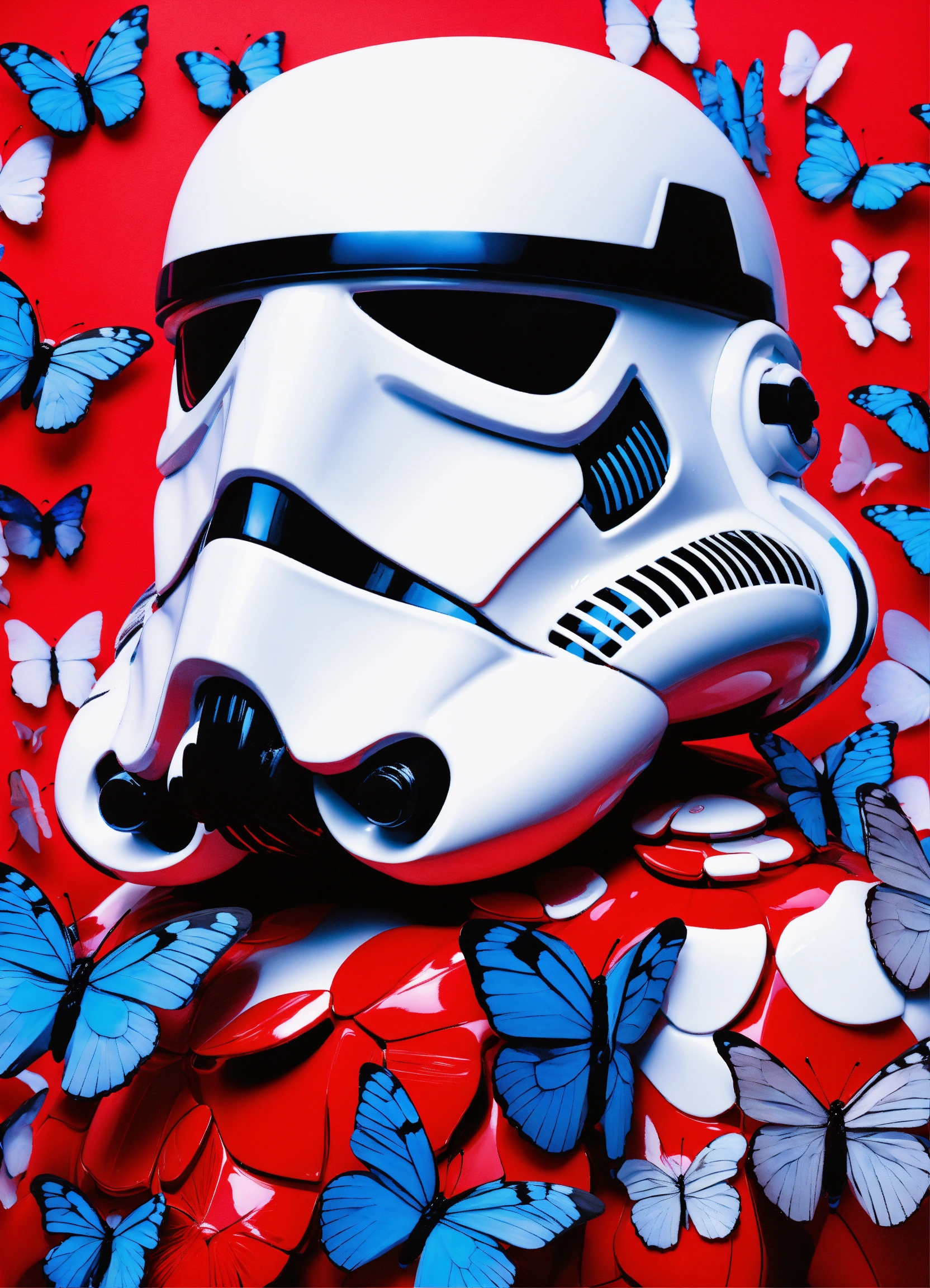 3d stormtrooper murakami butterflies jeff koons pop art red background