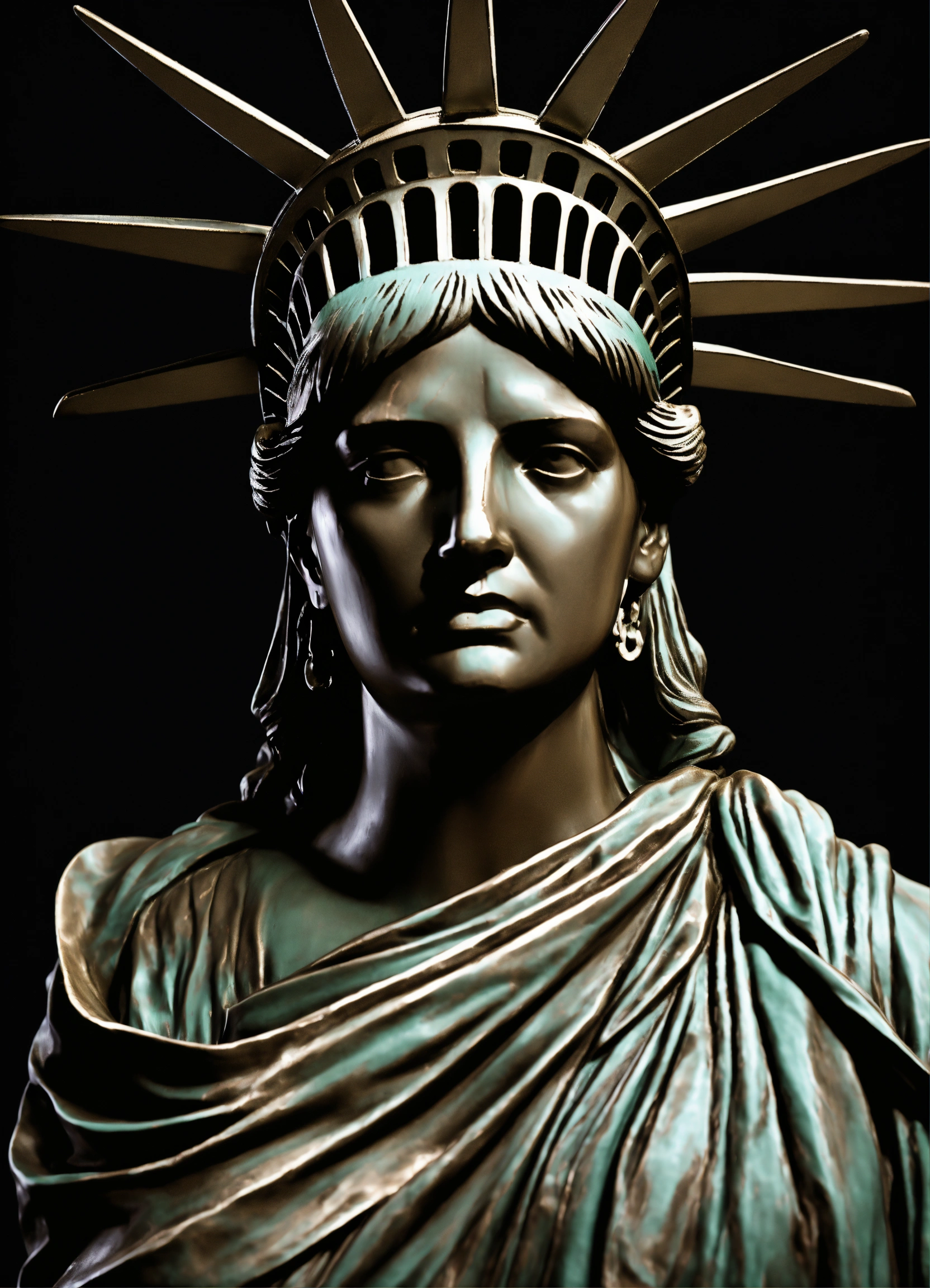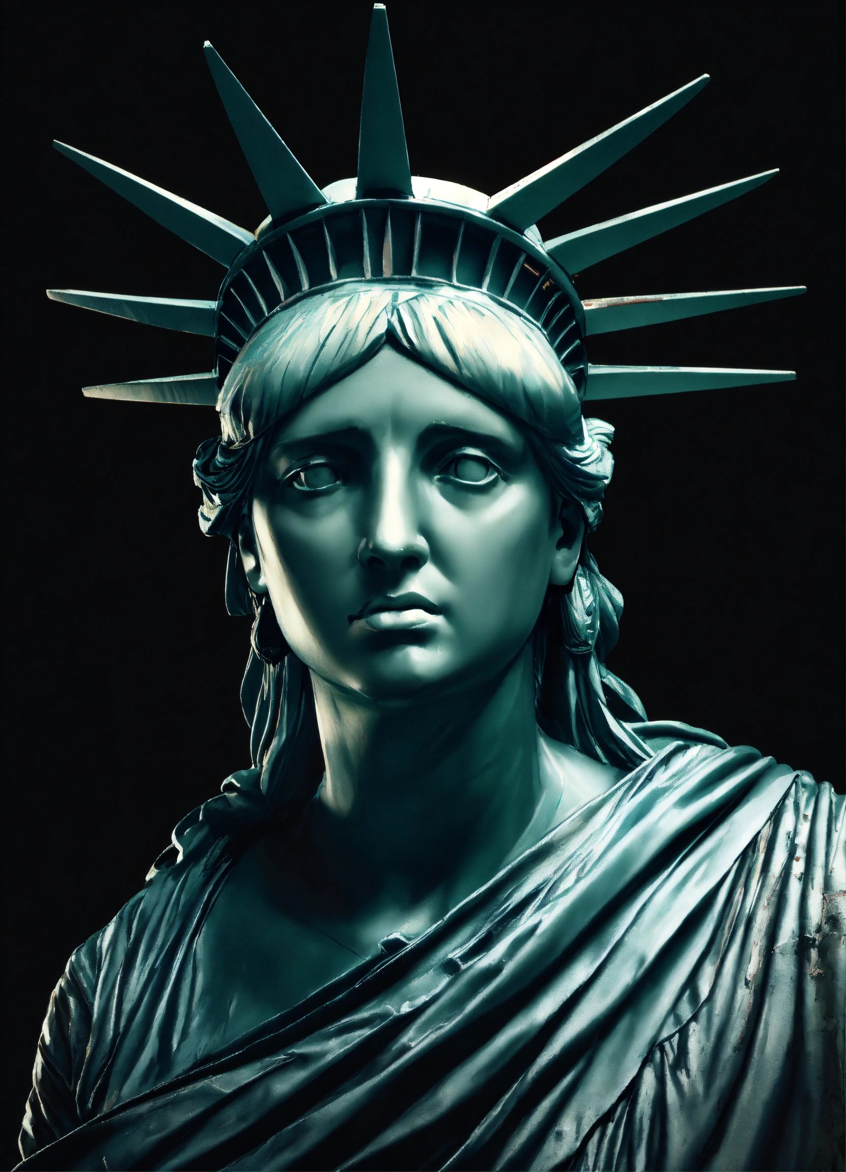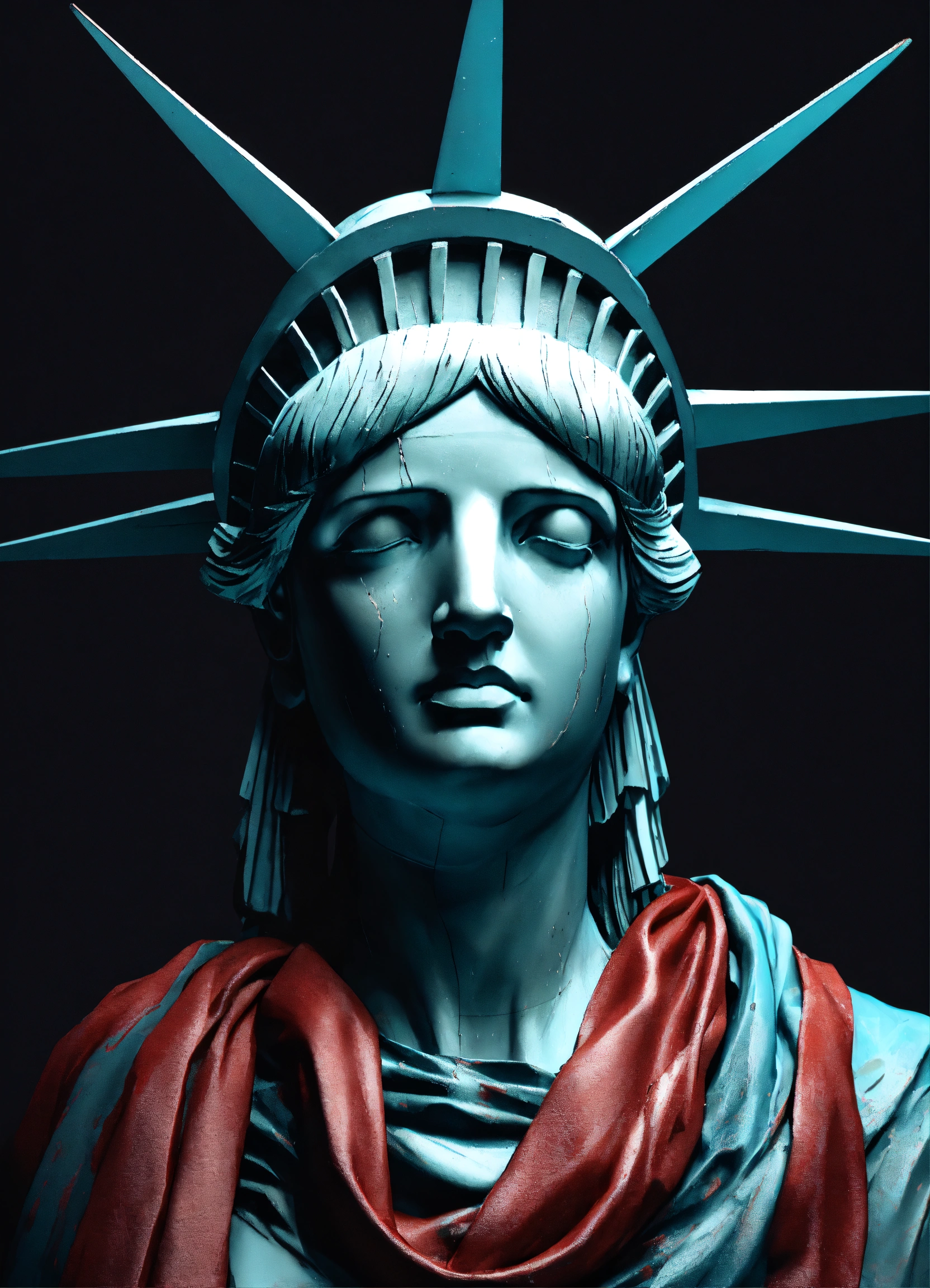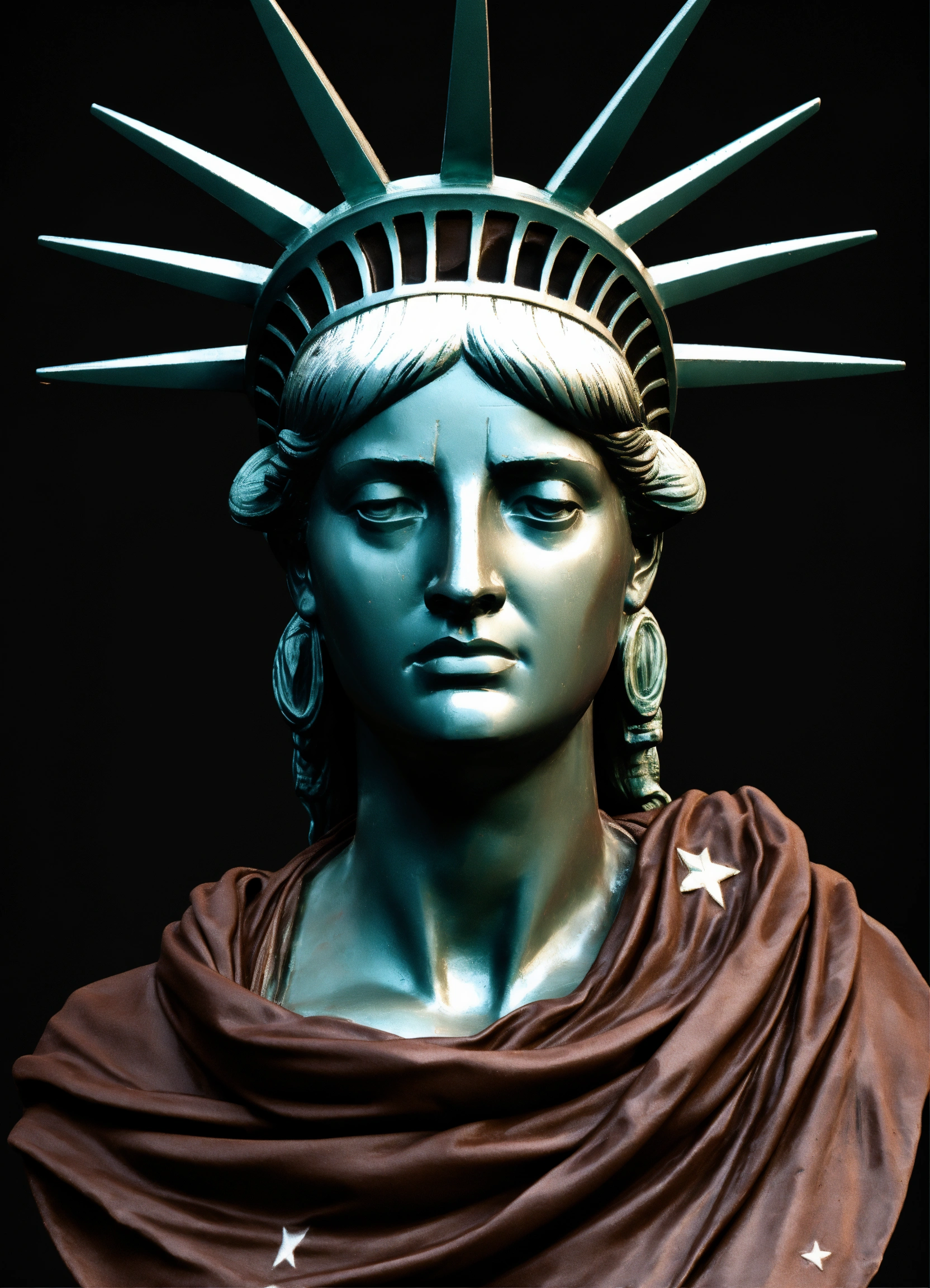 Bust sculpture of the statue of liberty, with a bandana wrapped around her mouth, image of head and shoulders, sadness, 4k render, hyperrealistic, grunge, surreal, solid black background