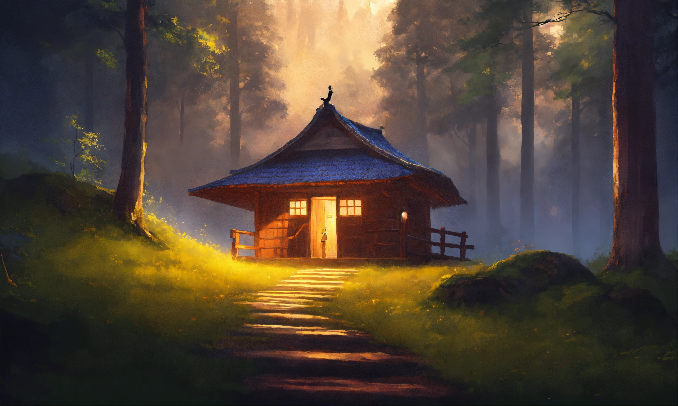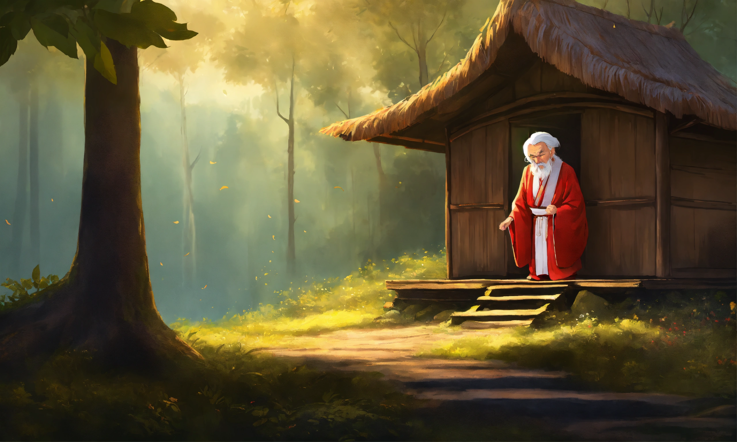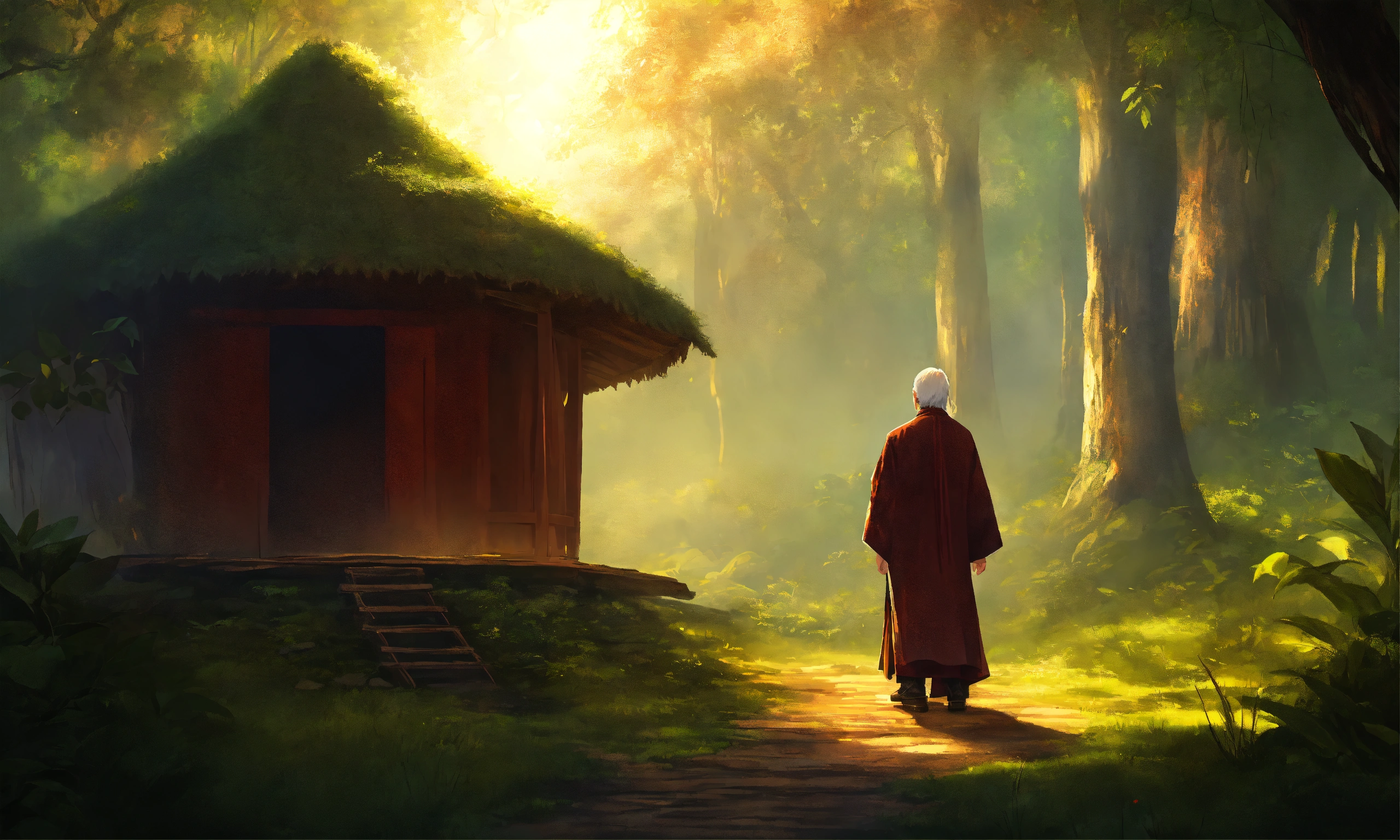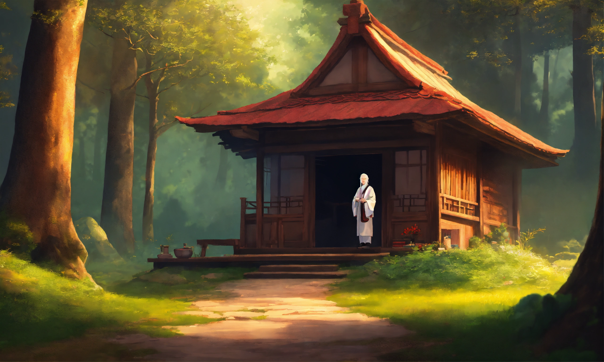 An old zen master standing in front of a hut in a forest in the style of illustrator donald zolan, 8k