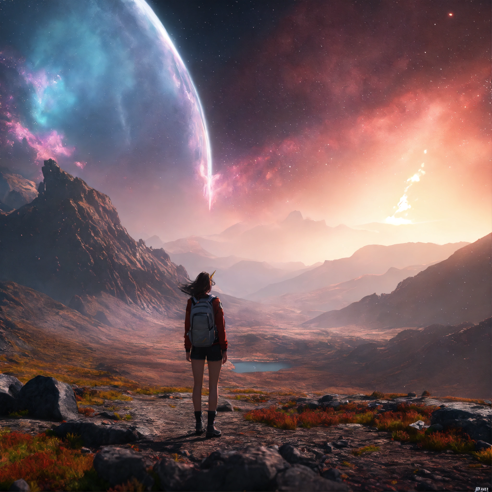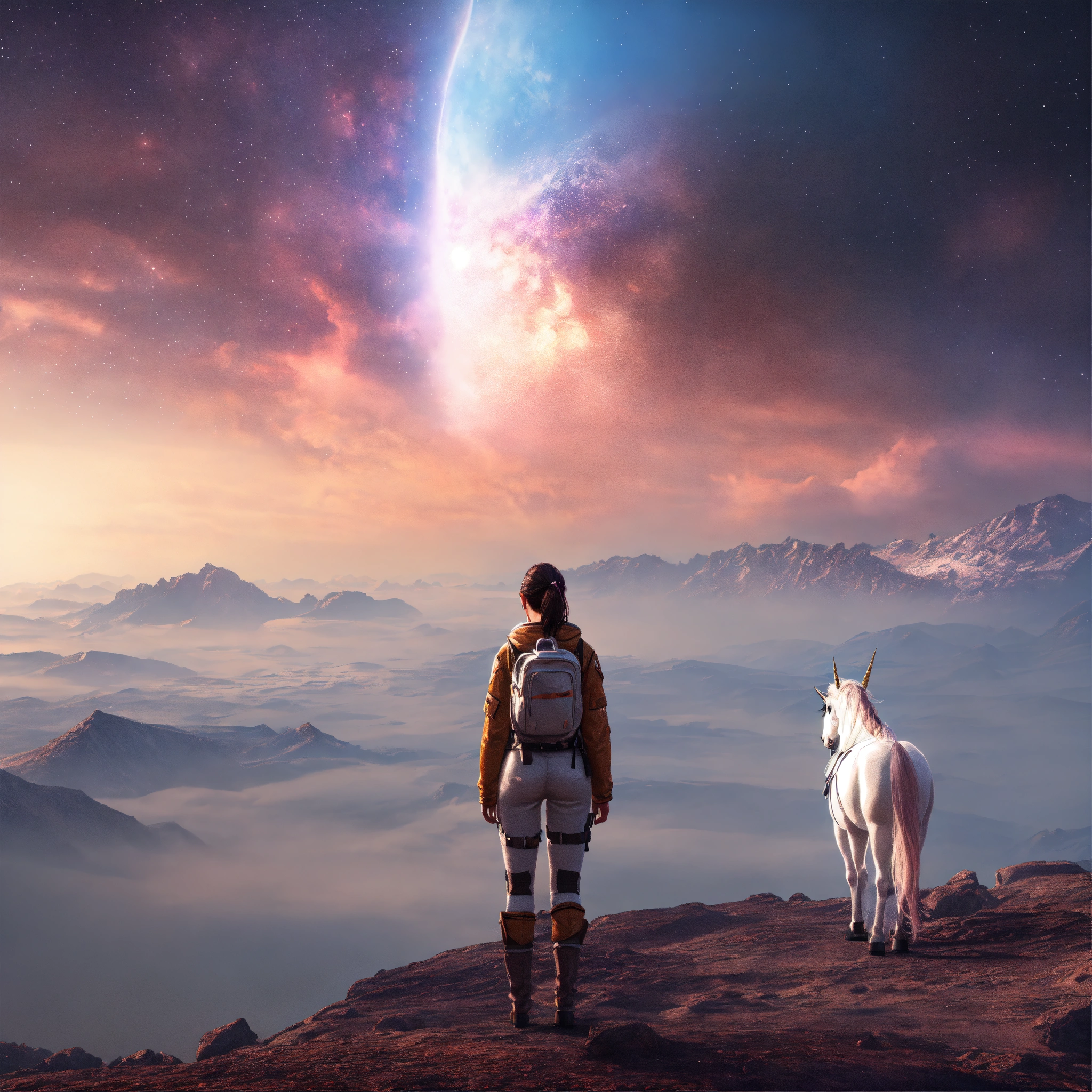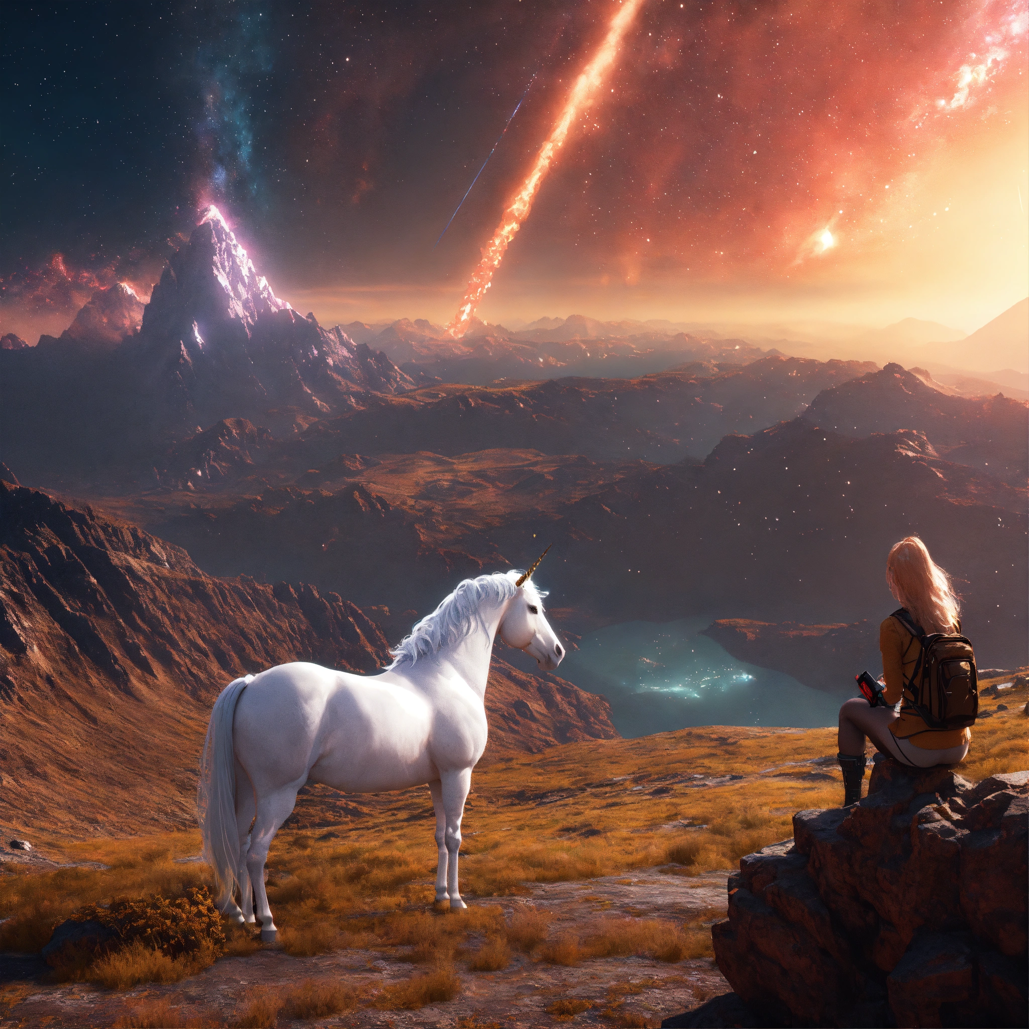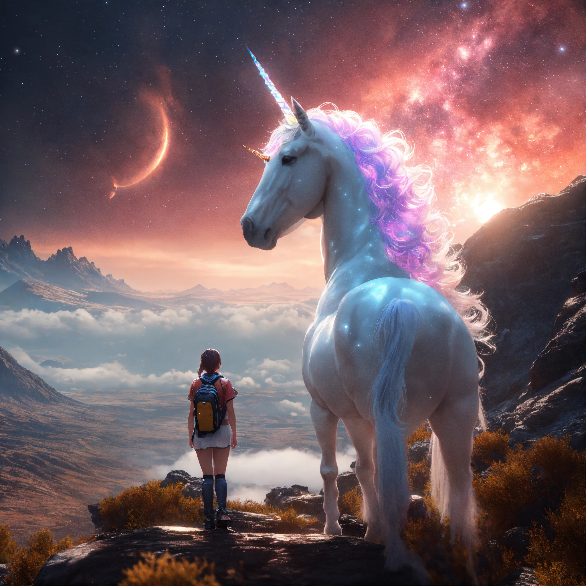 Text two unicorn white and young woman, mountain nebula, artstation scifi 3d scene of a showing, unreal engine, hyper realism, realistic shading, realistic render, octane render, detailed textures, photorealistic, wide shot, landscape