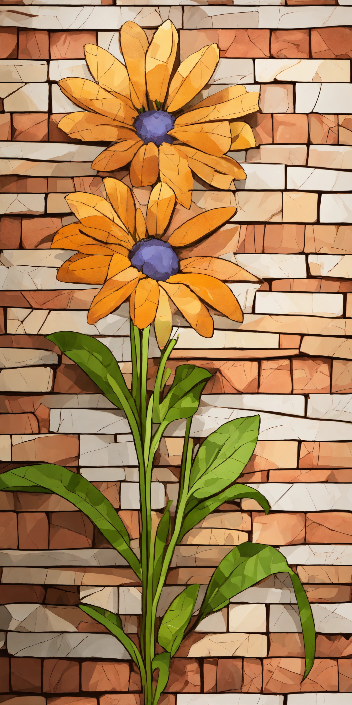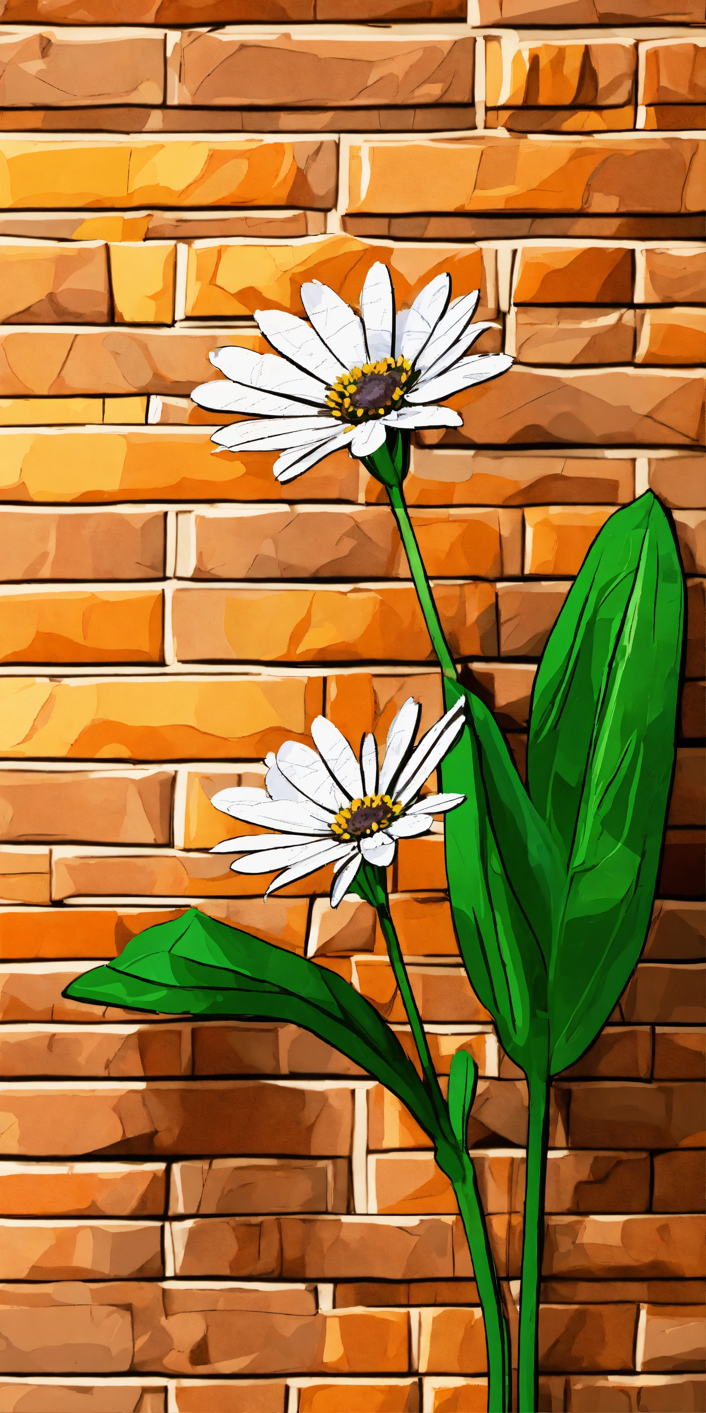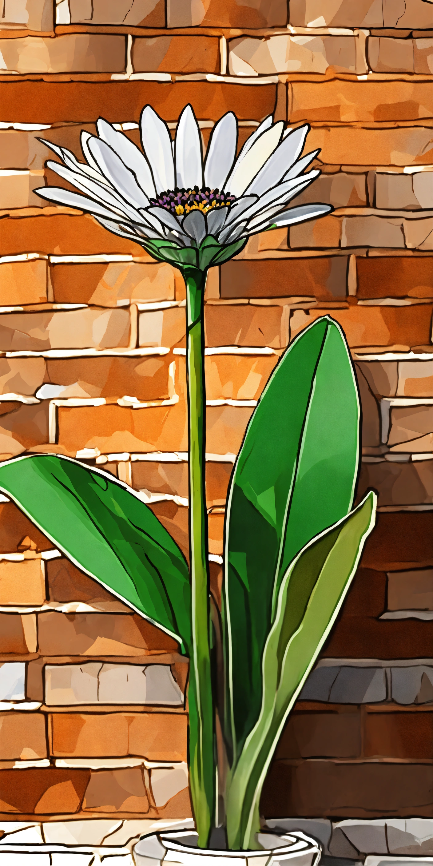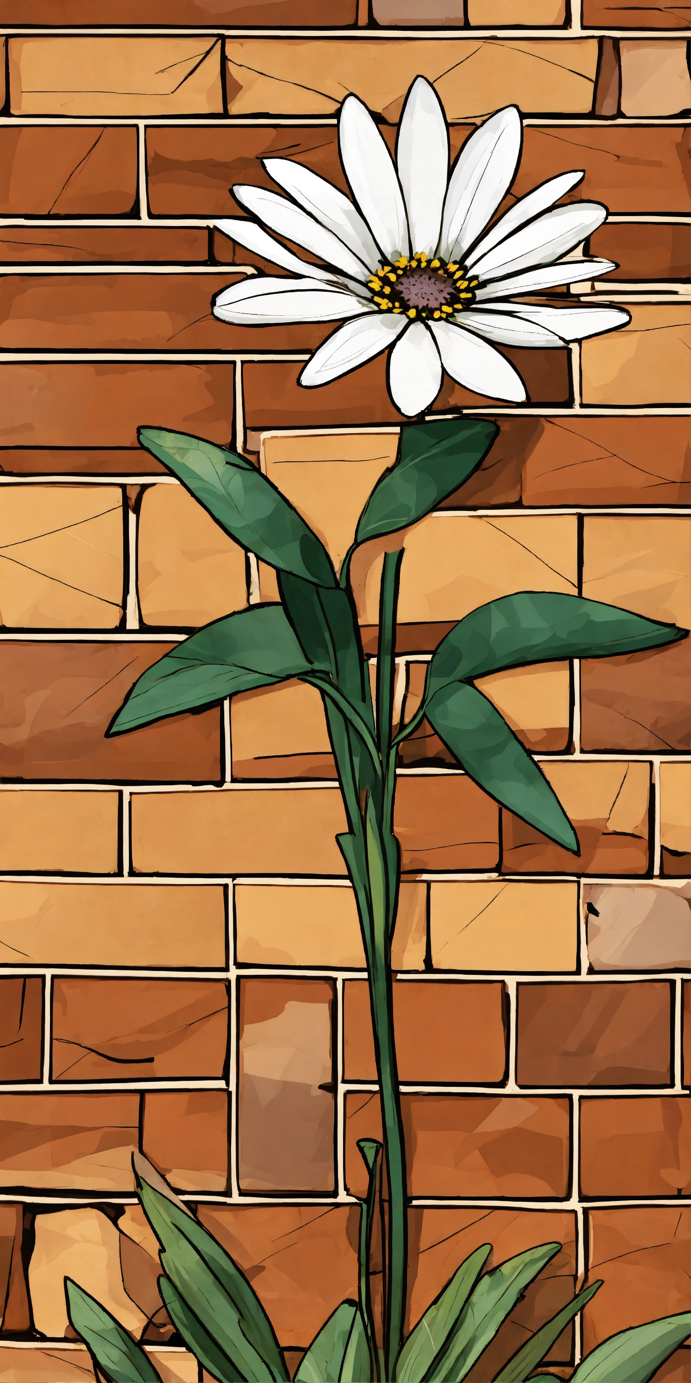 Single african daisy with elongated stem with attached low poly leaves, white scribble line drawing overlay, earth tone erratically laid brick background, paint slashes, cartoon