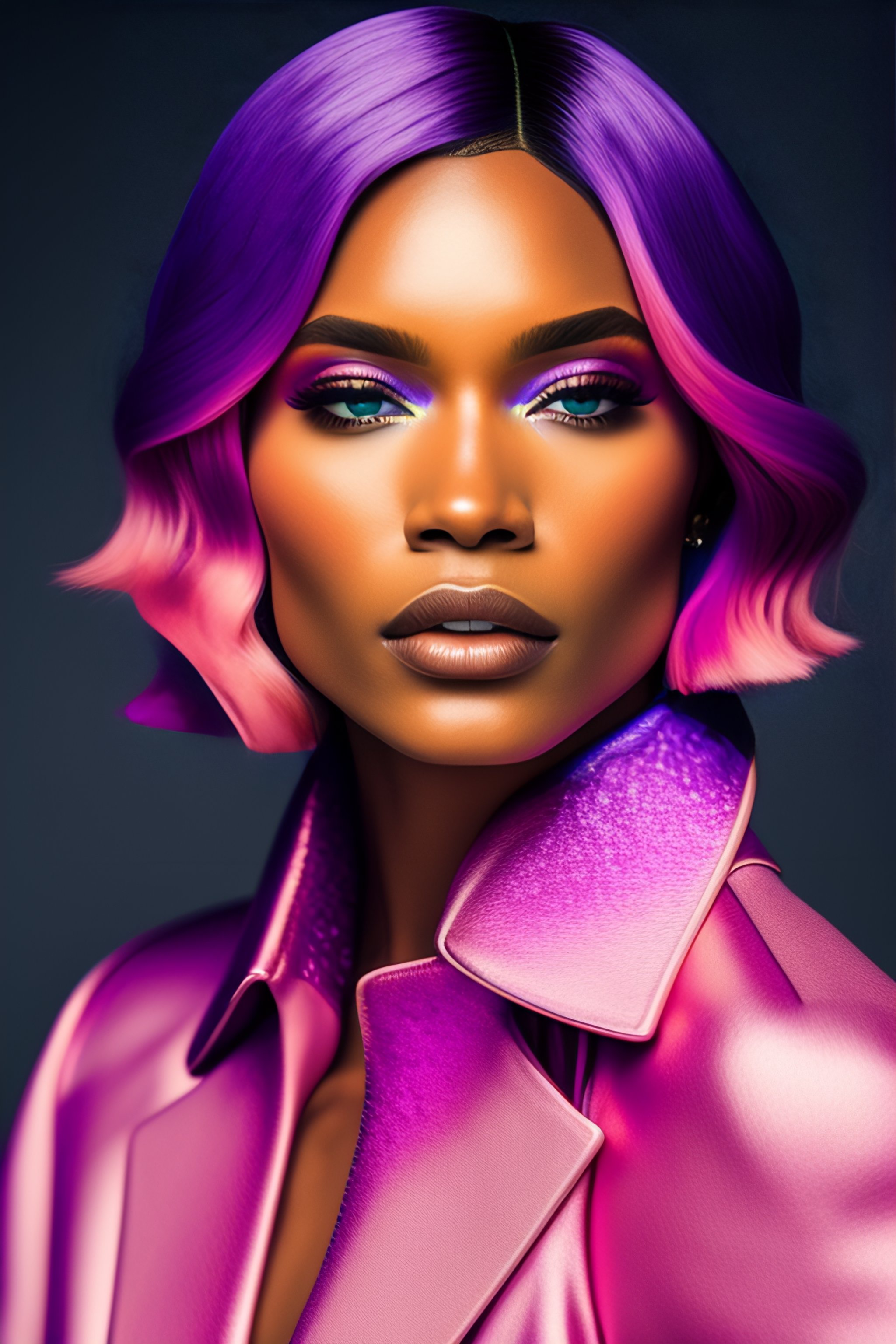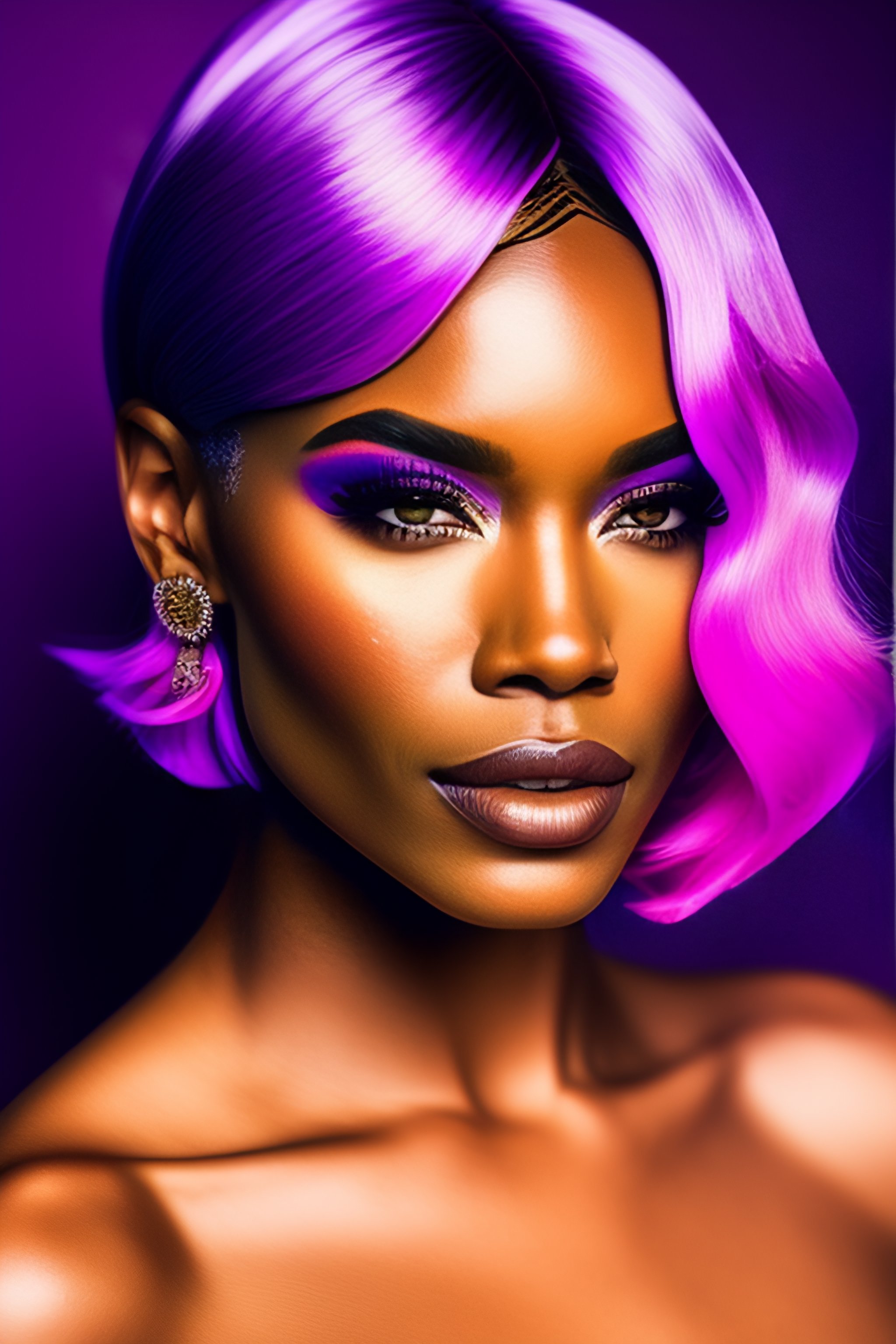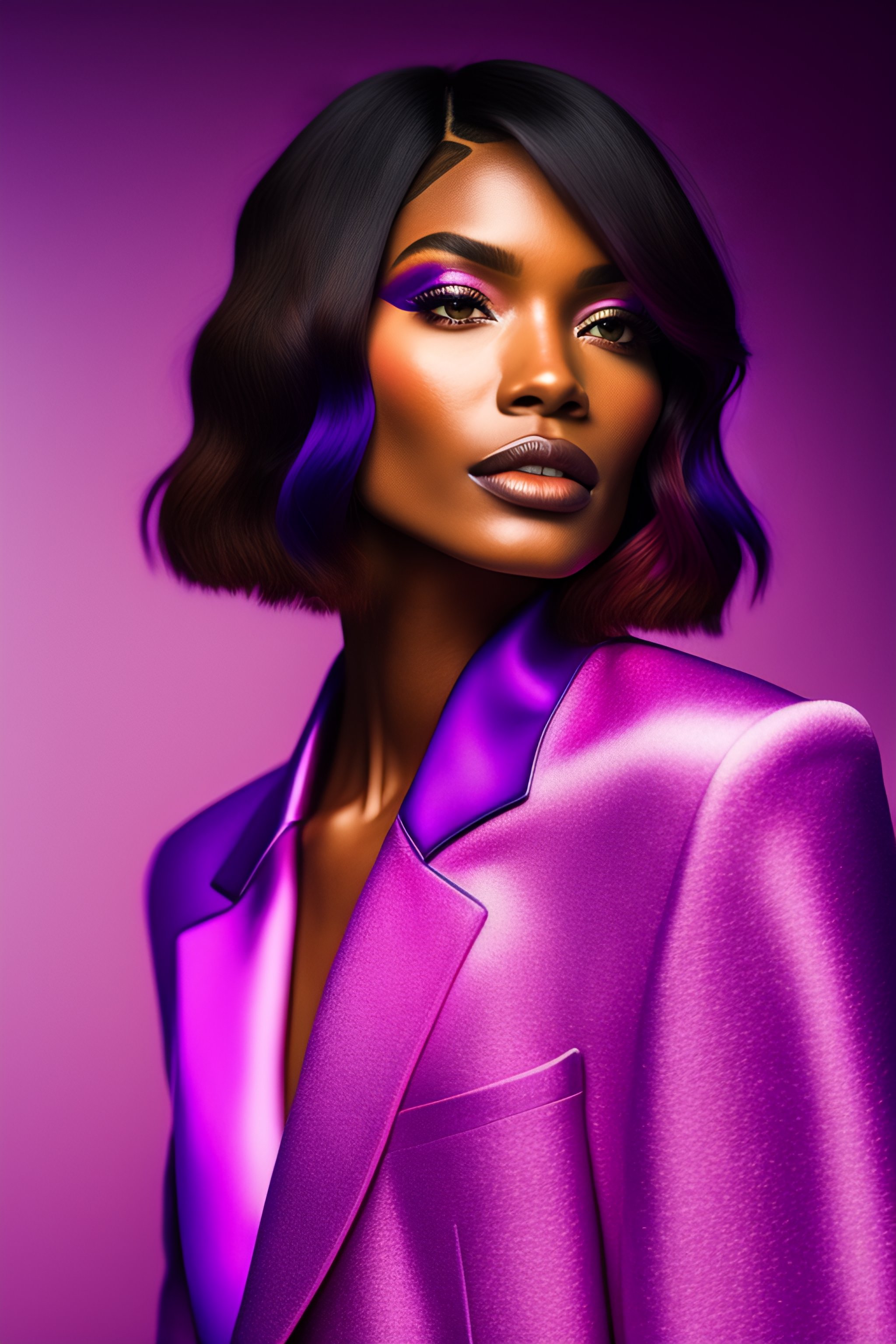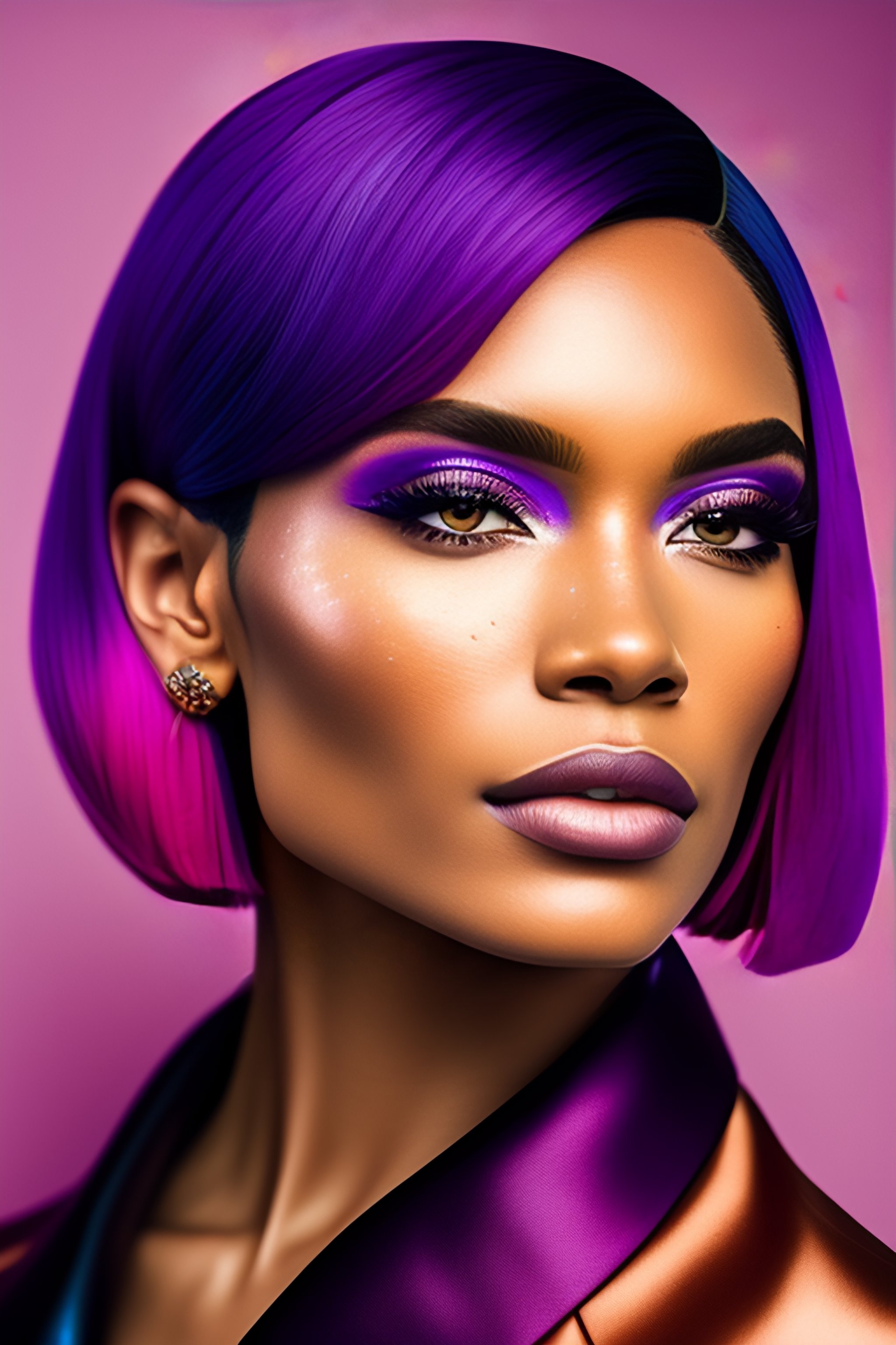 A photo close-up of a beautiful bob cut woman with freckles, fashion editorial, studio photography, magazine photography, pointed nose, wearing pink and purple colors, stunning, elegant, 8k, intricate, hyperdetailed, hd, blurry background
