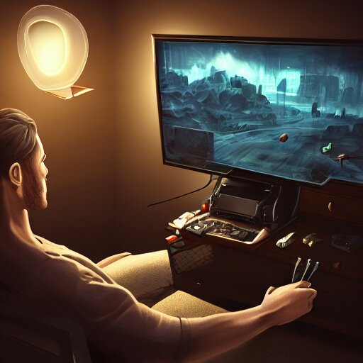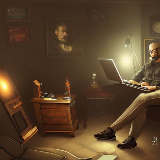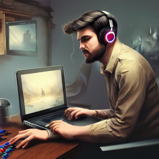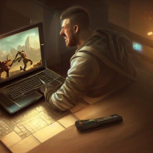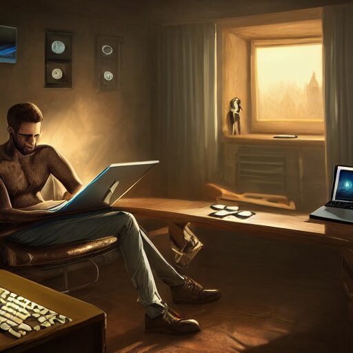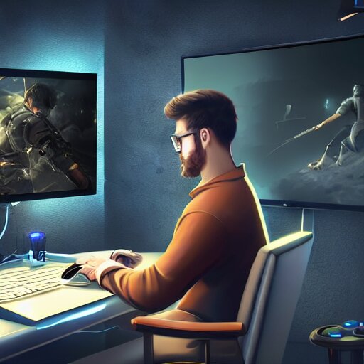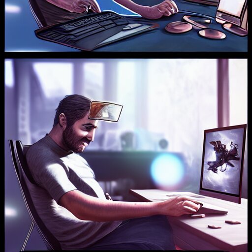 Realistic successful man using laptop in gaming room, artstation trends, future concept art, highly detailed, intricate, sharp focus, digital art, 8 k