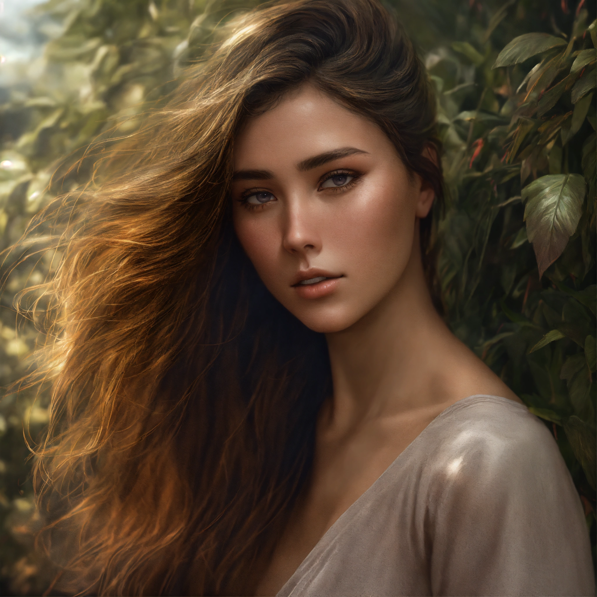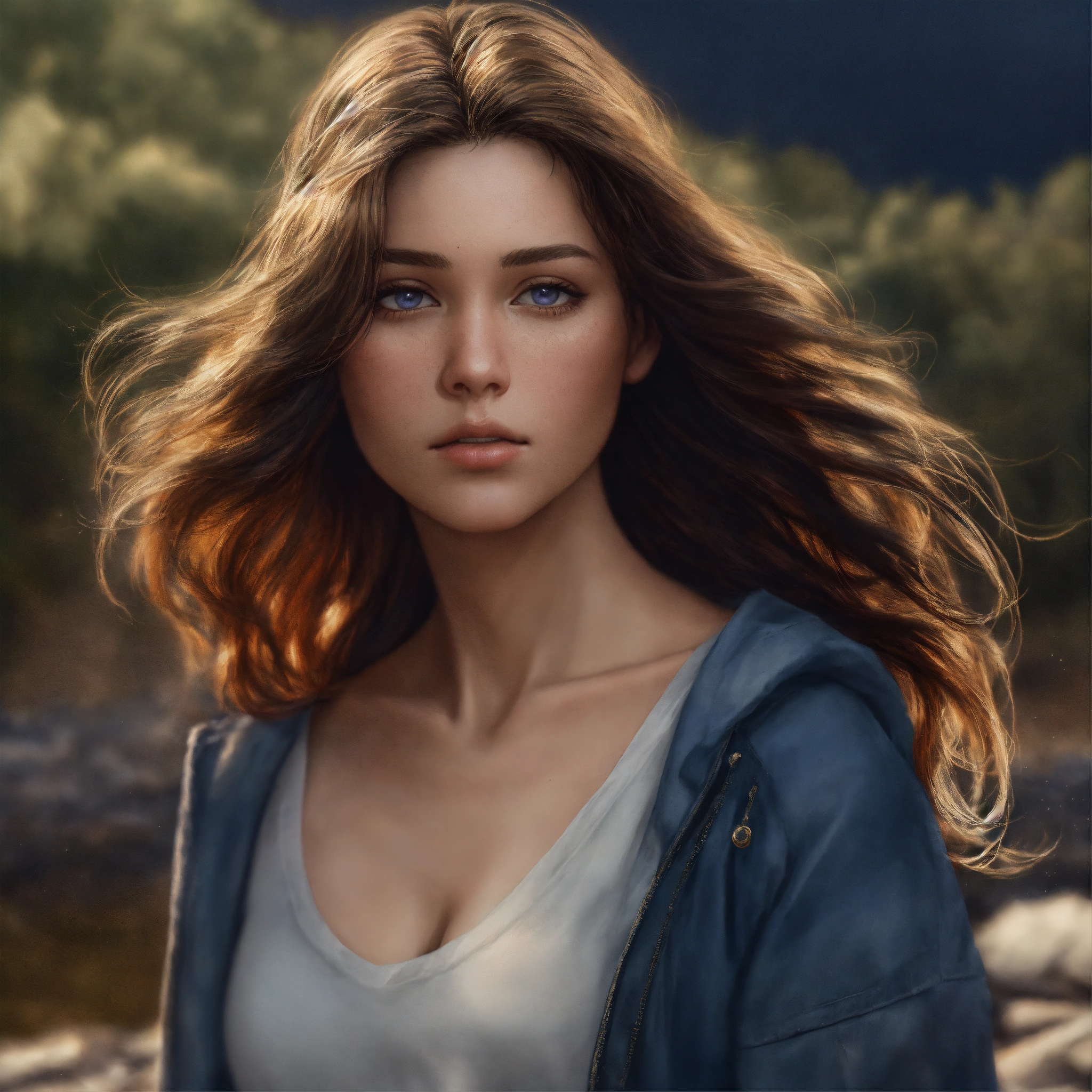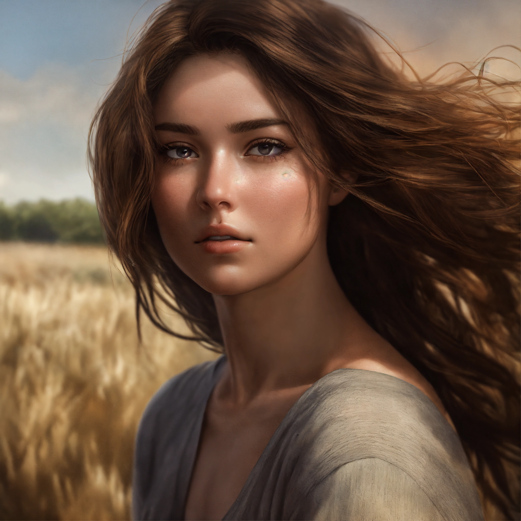 Face completely hidden by hair, all body, hyper realism, poetic, romantic, realistic shading, realistic render, detailed textures, photorealistic, wide shot, landscape