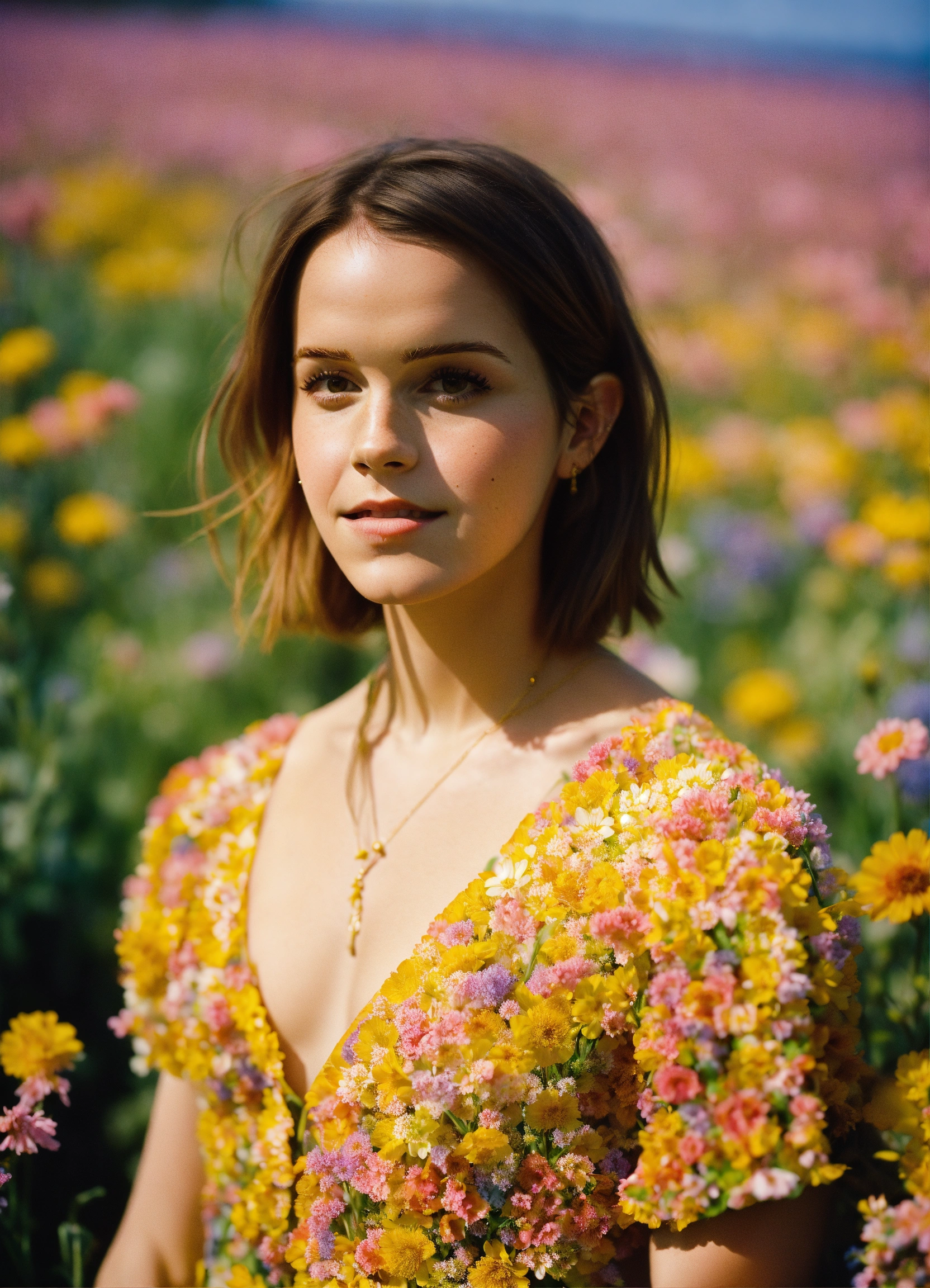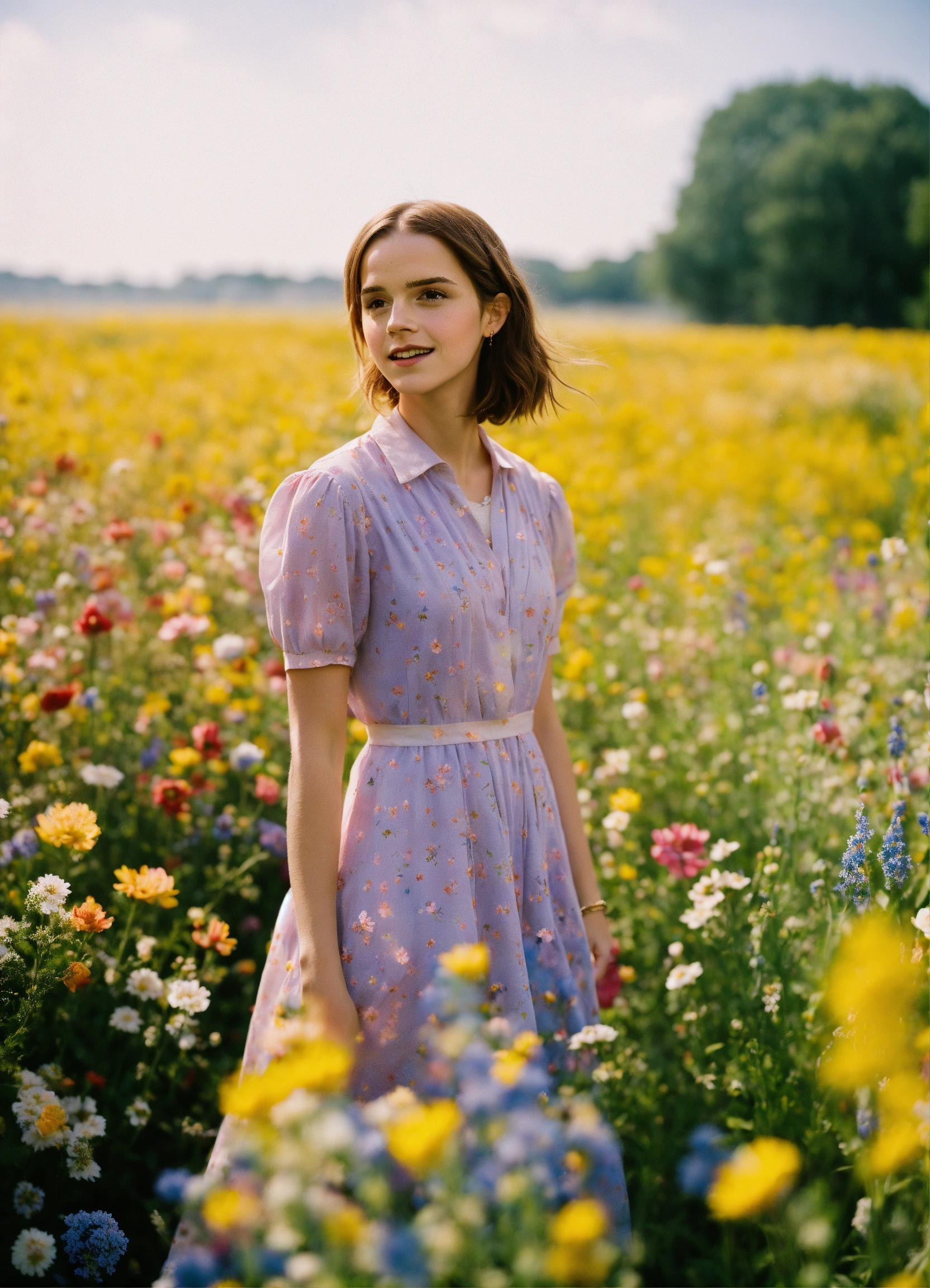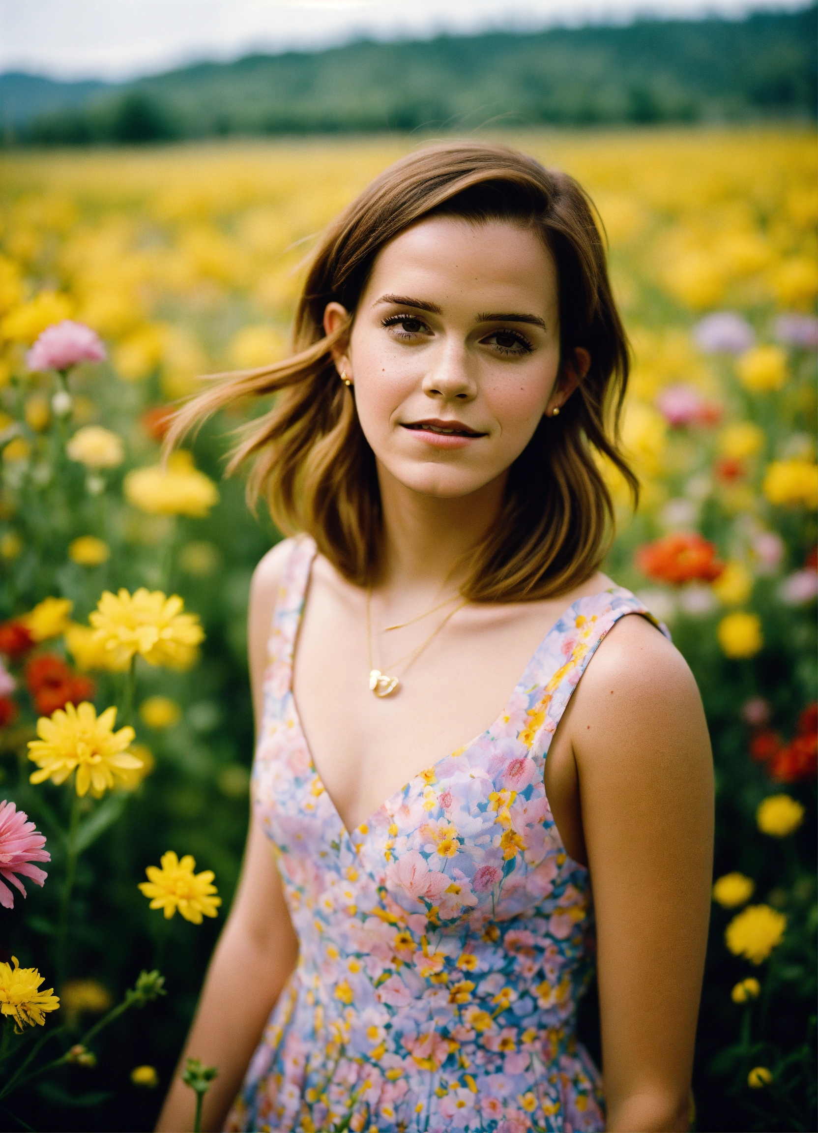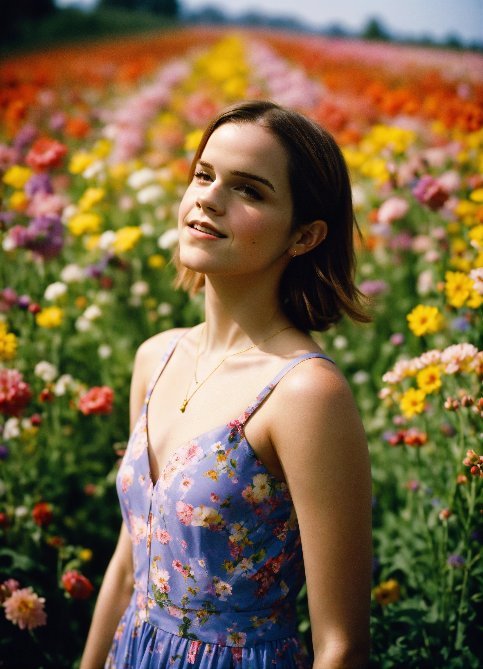 Happy emma watson standing in a beautiful field of flowers, colorful flowers everywhere, perfect lighting, leica summicron 35mm f2.0, kodak portra 400, film grain