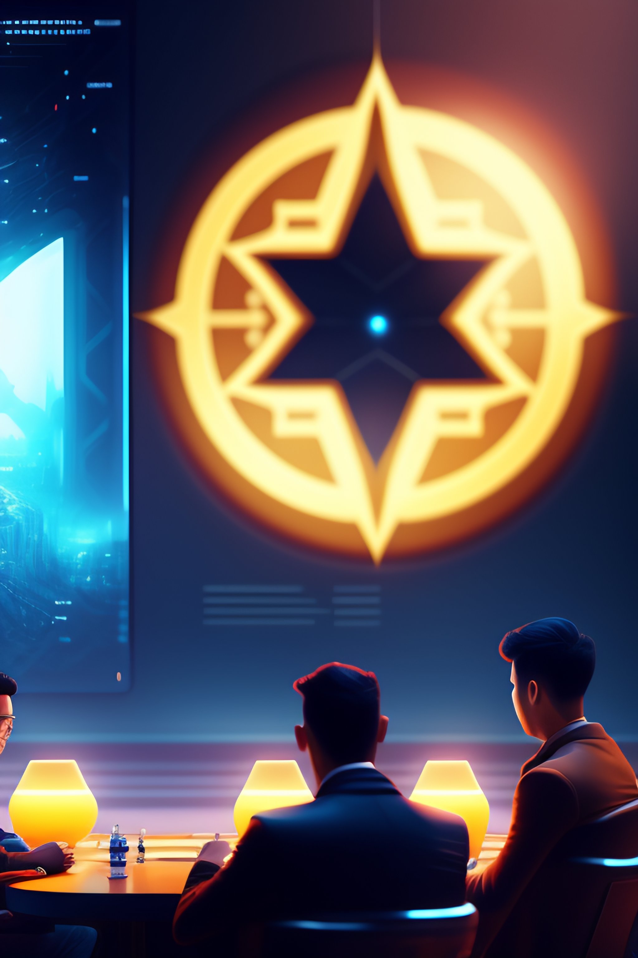 Symmetry of starutp founders team in a meeting, background a hacker in shadow, intricate, elegant, very detailed, digital painting, artstation, concept art, soft, sharp focus, illustration