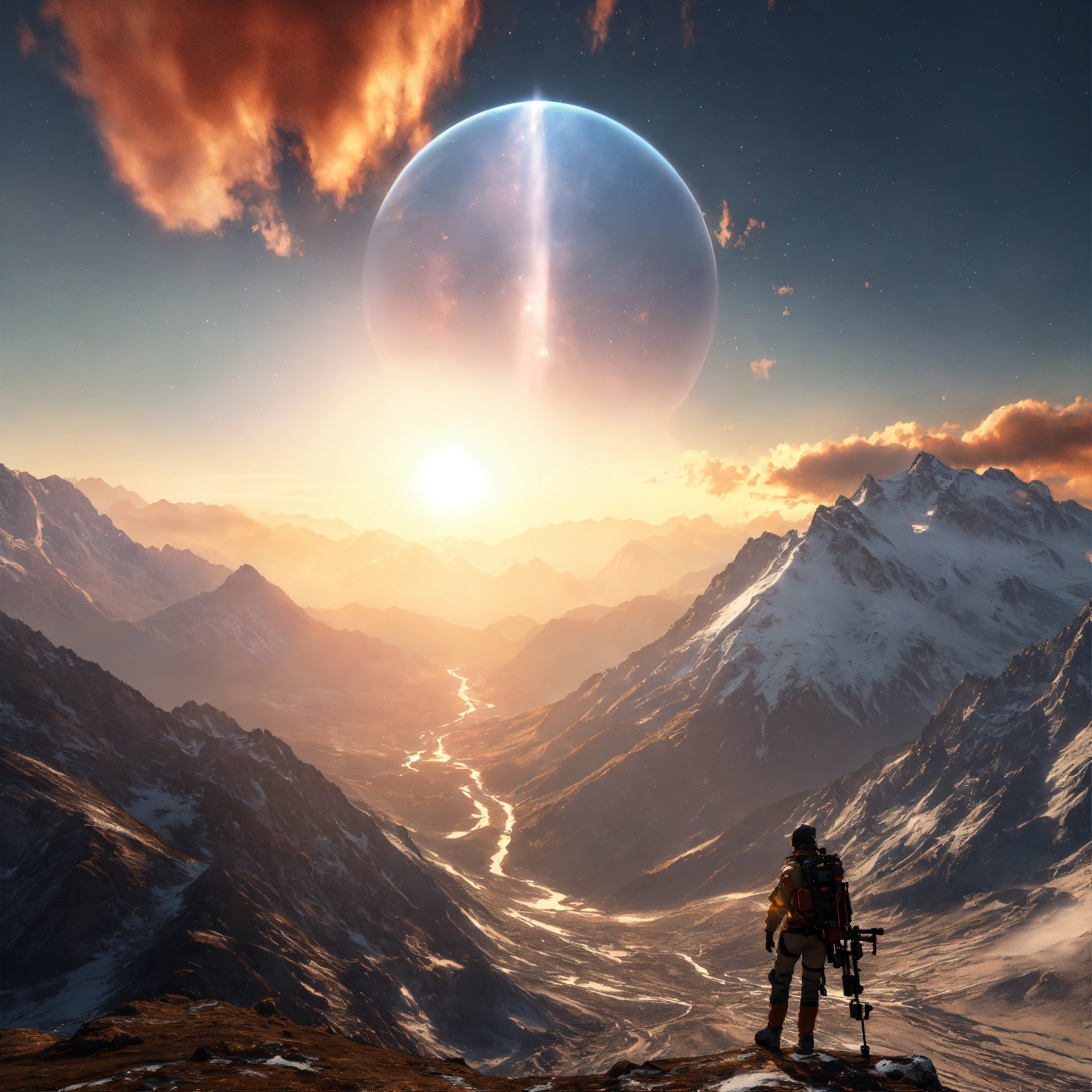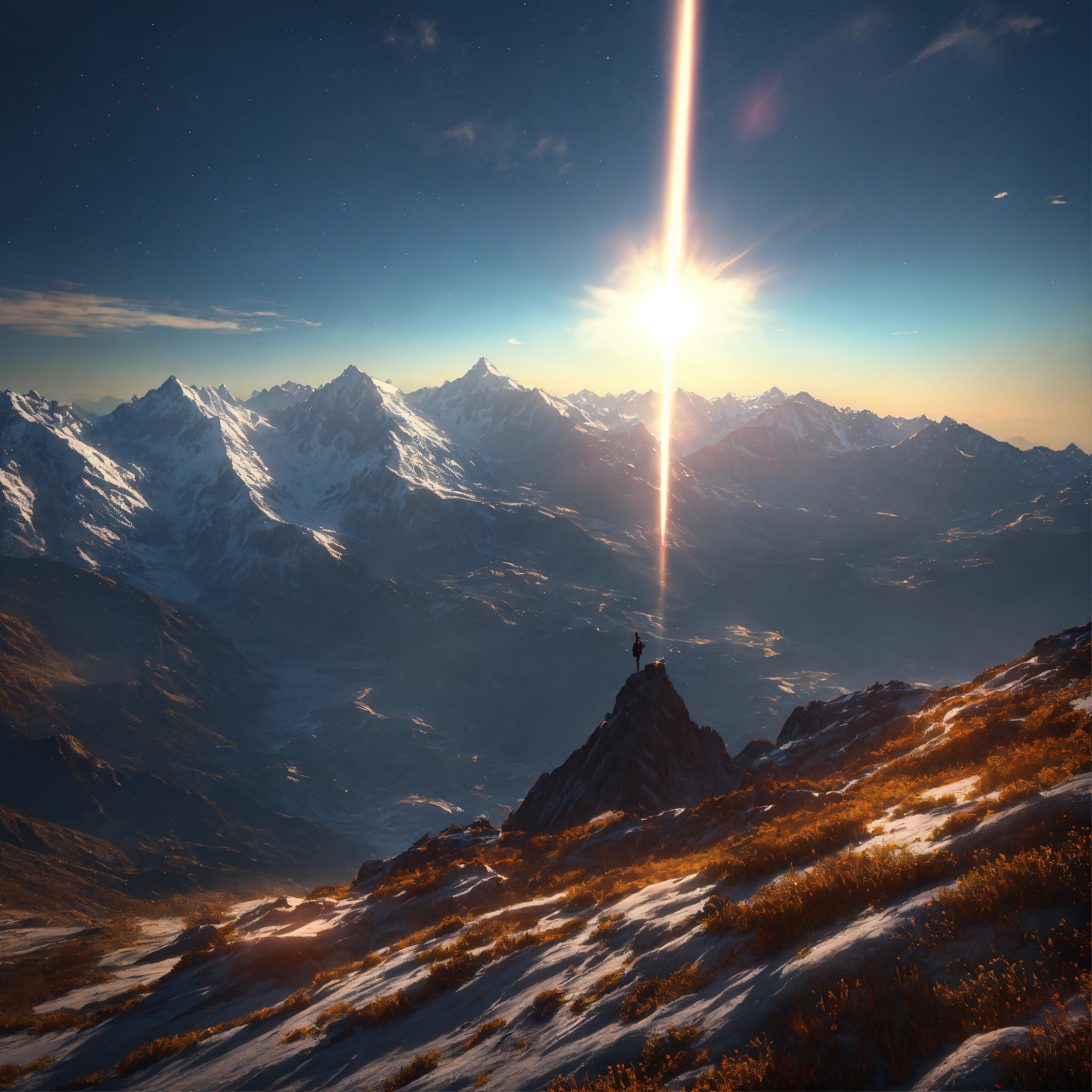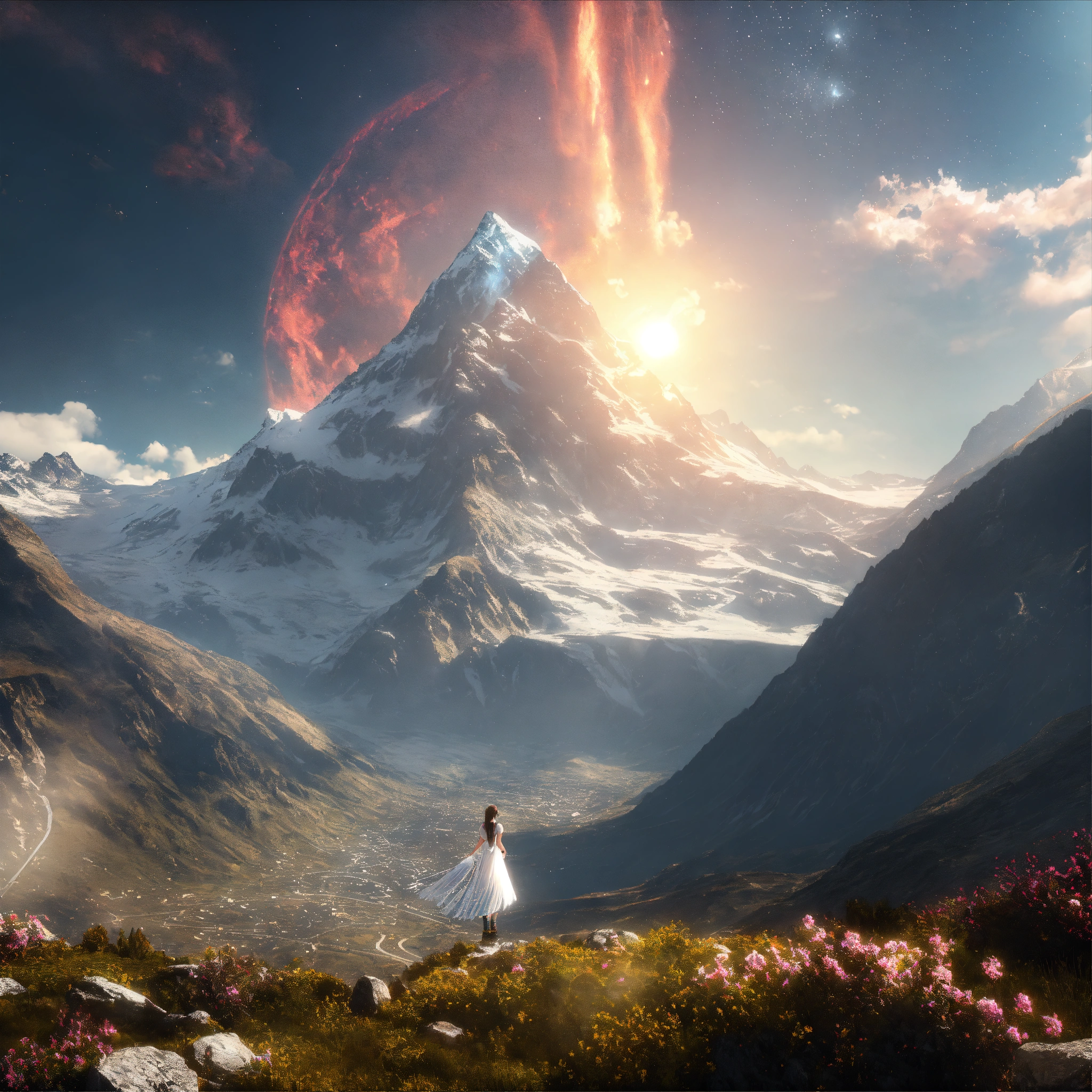 Angel in sky nebula, artstation scifi 3d scene of a showing mountains at lenzerheide, with a view to the parpaner rothorn very detailed, maximalism, ambient occlusion, volumetric light, sun beam, atmospheric haze, unreal engine, hyper realism, realistic shading, cinematic composition, realistic render, octane render, detailed textures, photorealistic, wide shot
