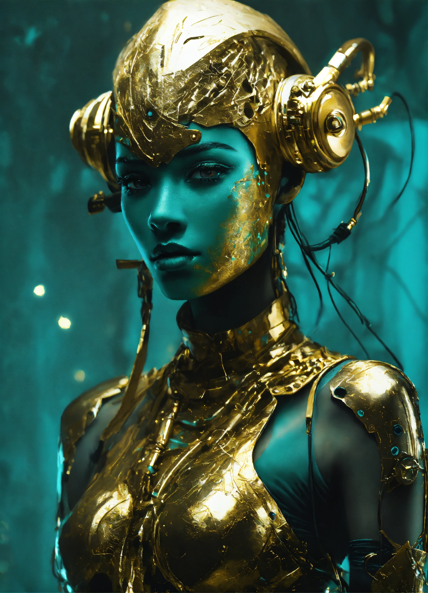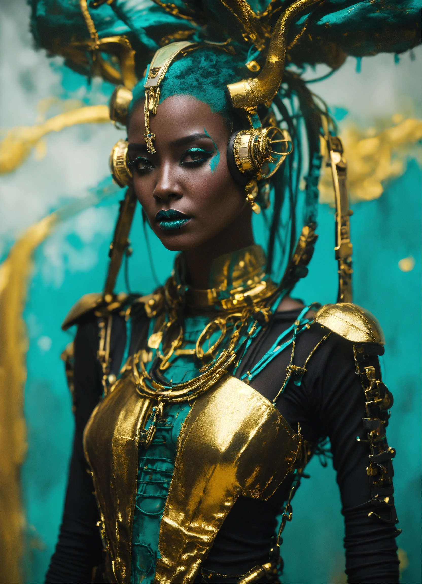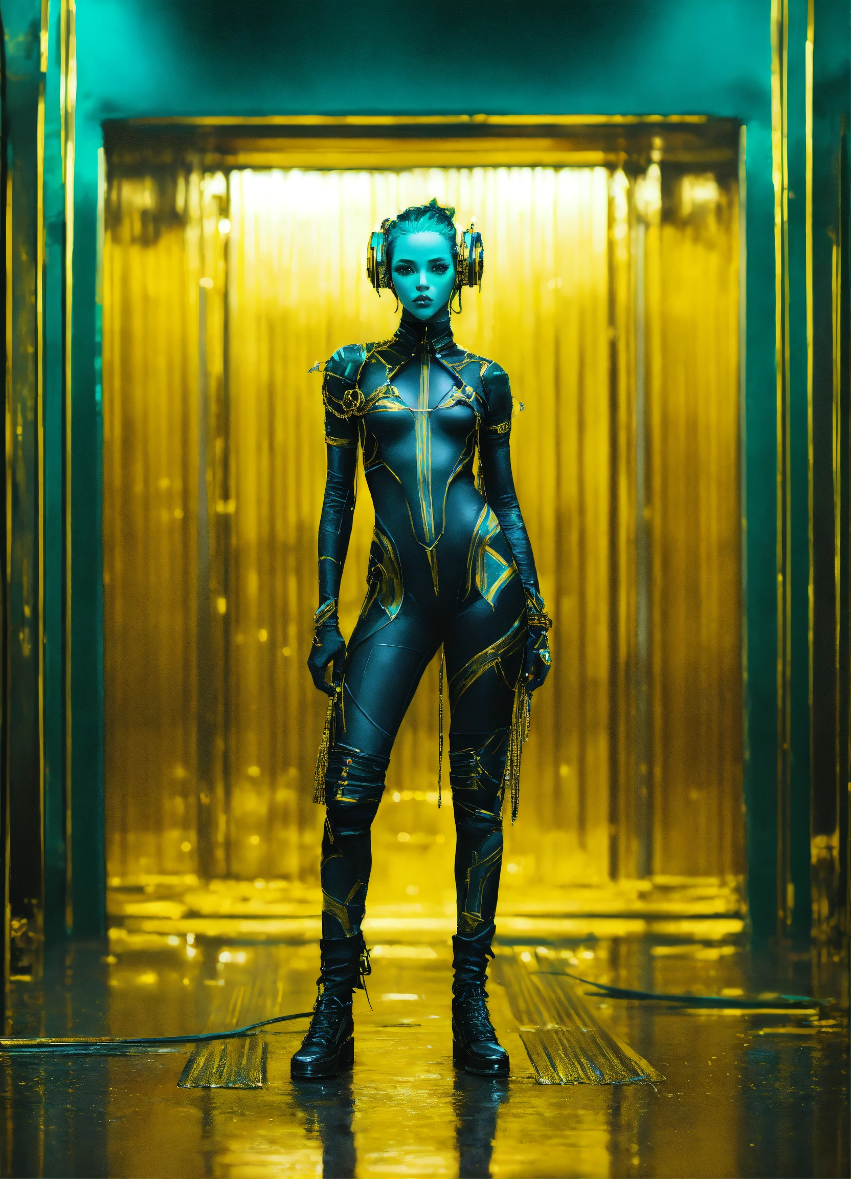 Ethereal minimalist black alien race cybergoth fashion photography painting, in the style of teal and gold, use of palette knives, full body wide shot painting oel of teachment, intricate, sharp_focus, concept_art, simple white backround