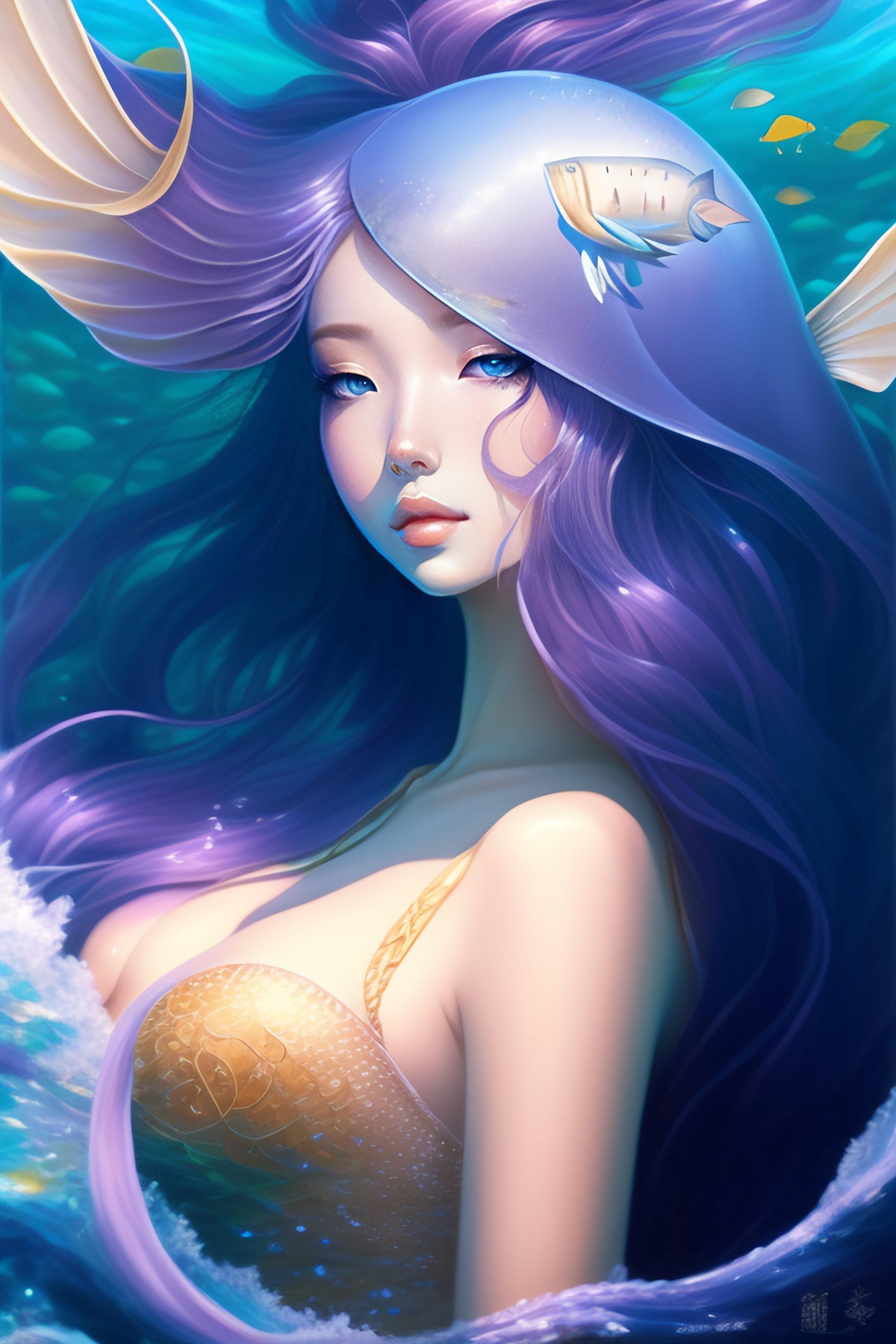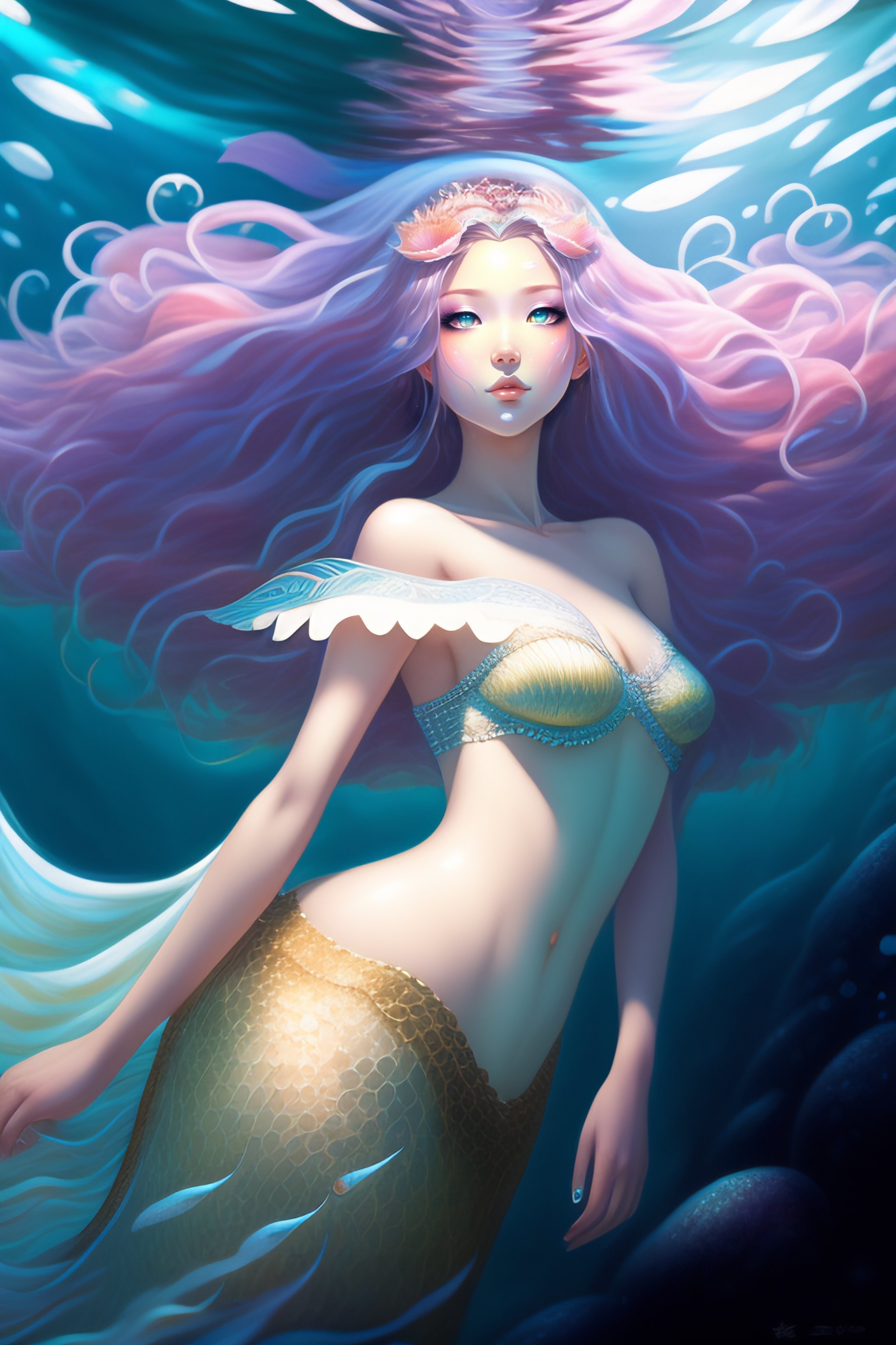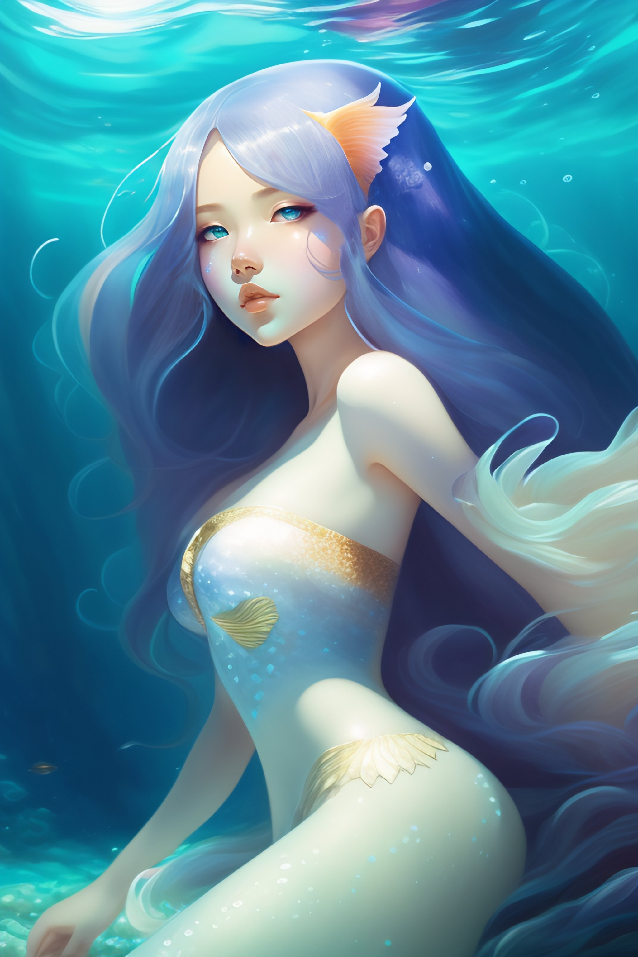 Underwater scene full body shot deep sea under water mermaid wearing a mermaid tail costume with clam shell top, anime, strong impressionism paint style, strong expressiveness and emotionality, cinematic lighting, visual clarity, art by krenz cushart, by relseiy, by miho hirano