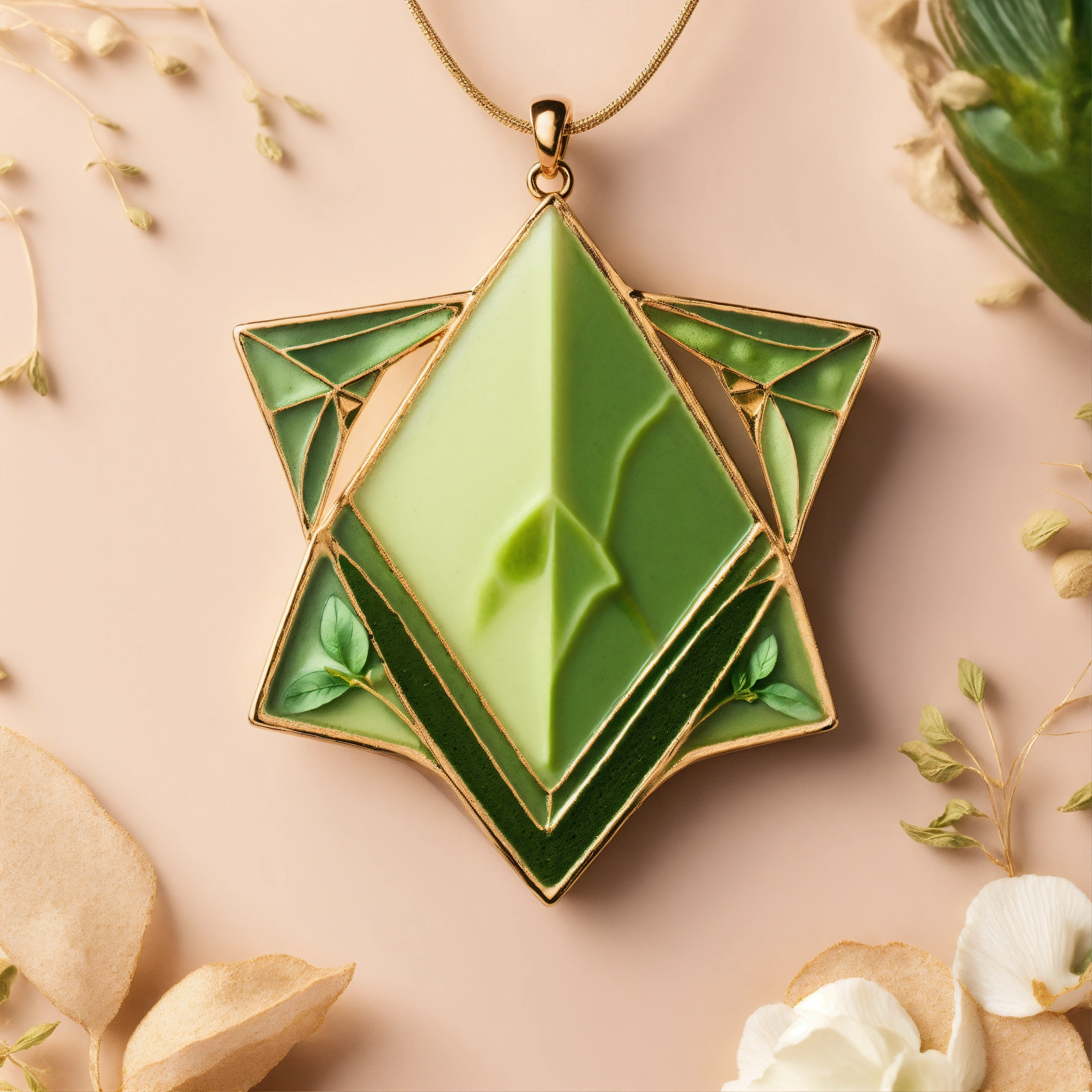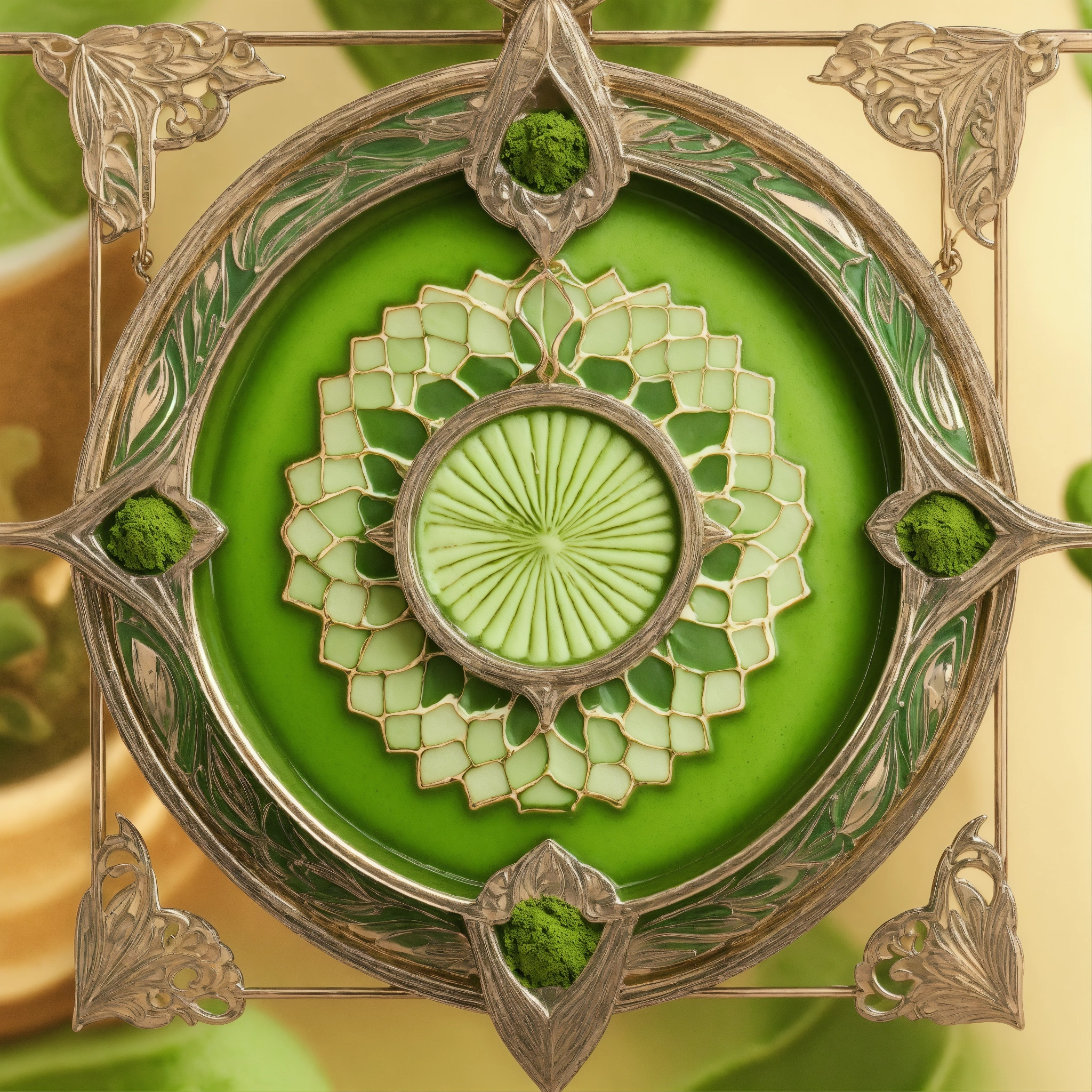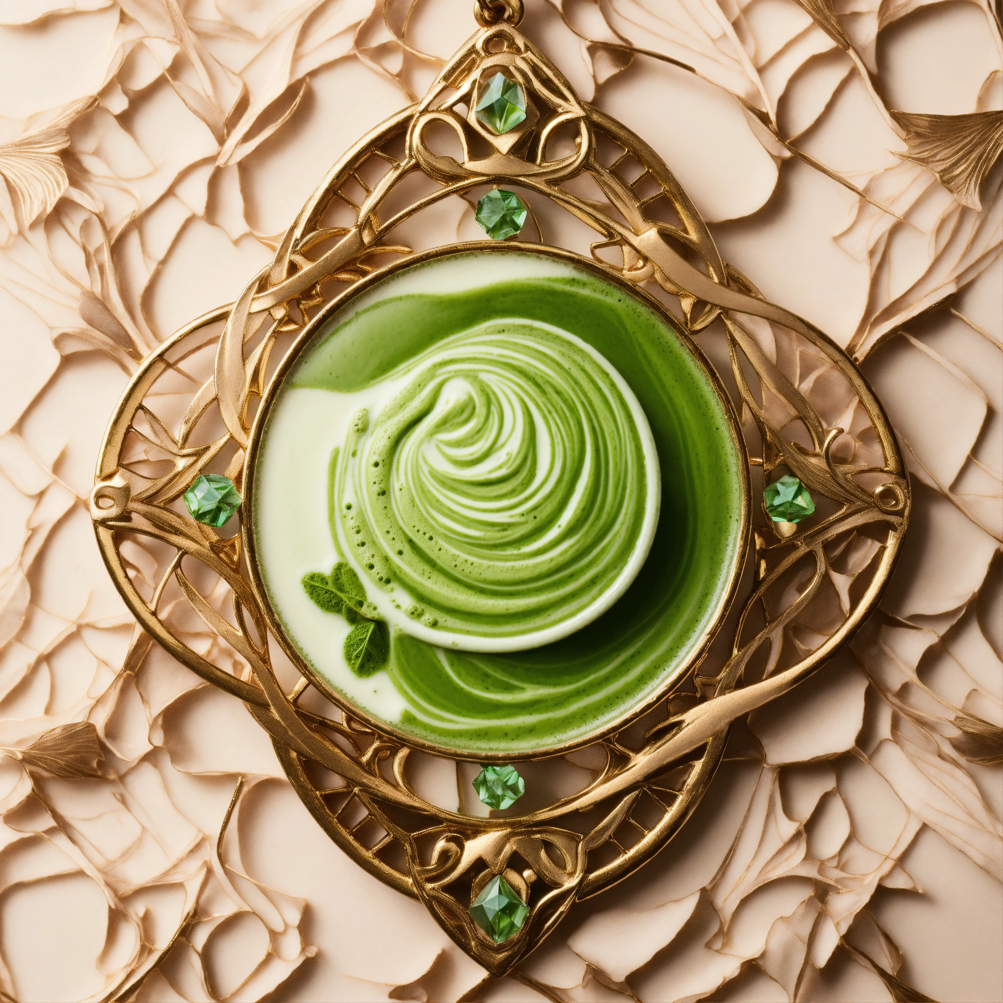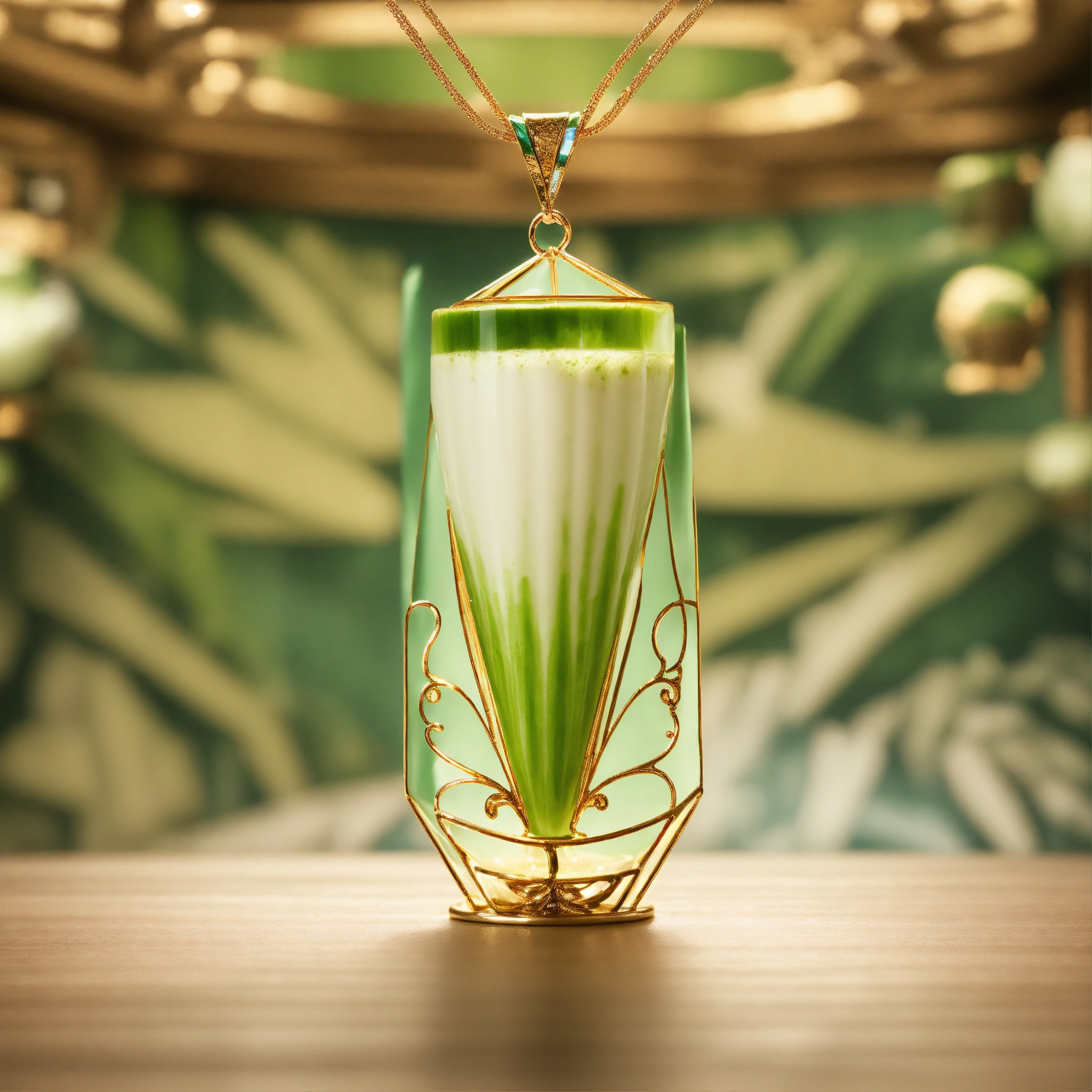 Matcha latte prism as art nouveau pendentif, hyperrealistic material, studio off white photo background