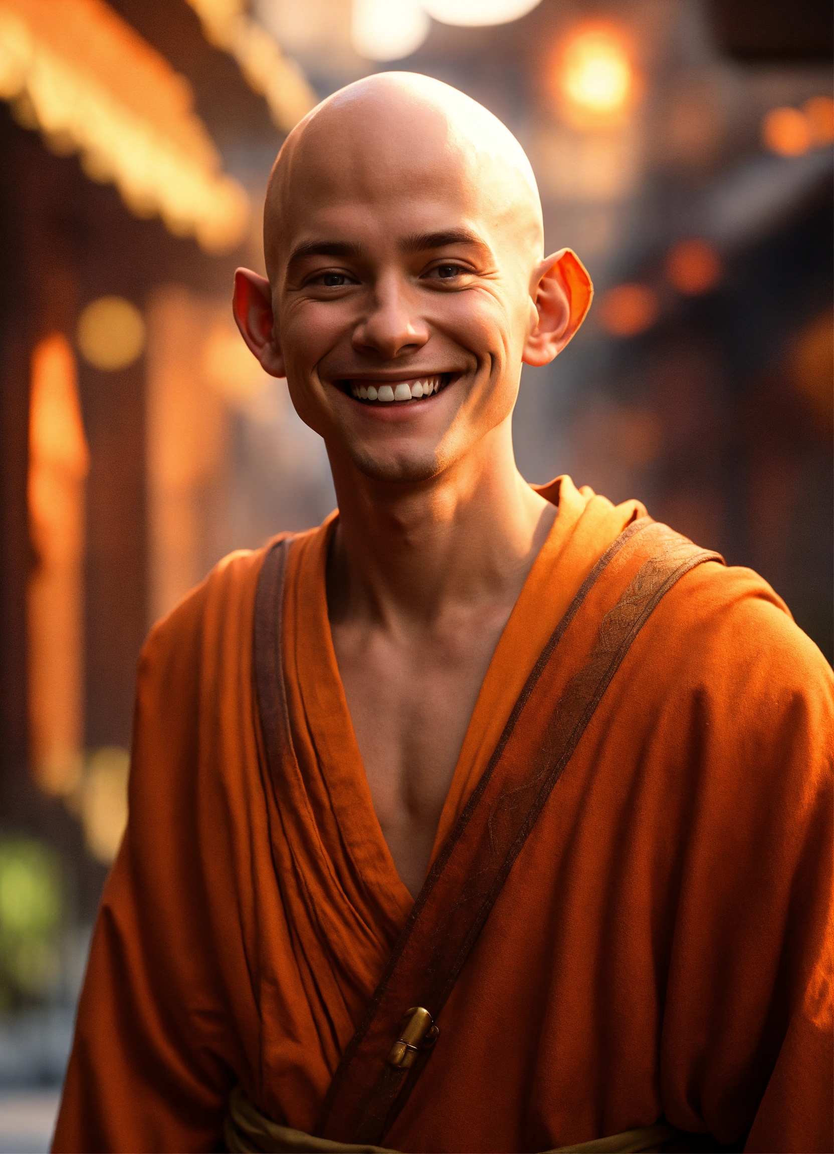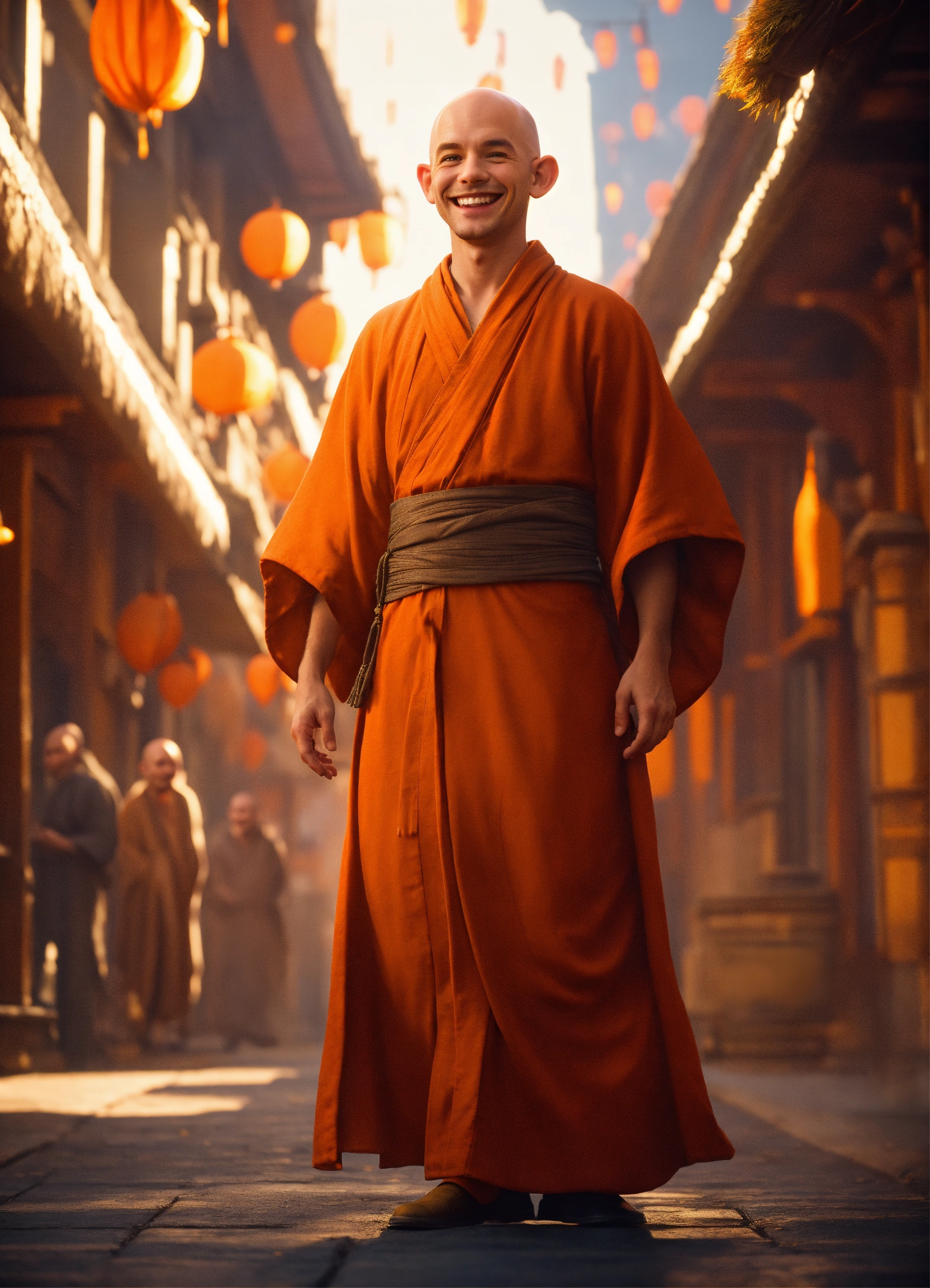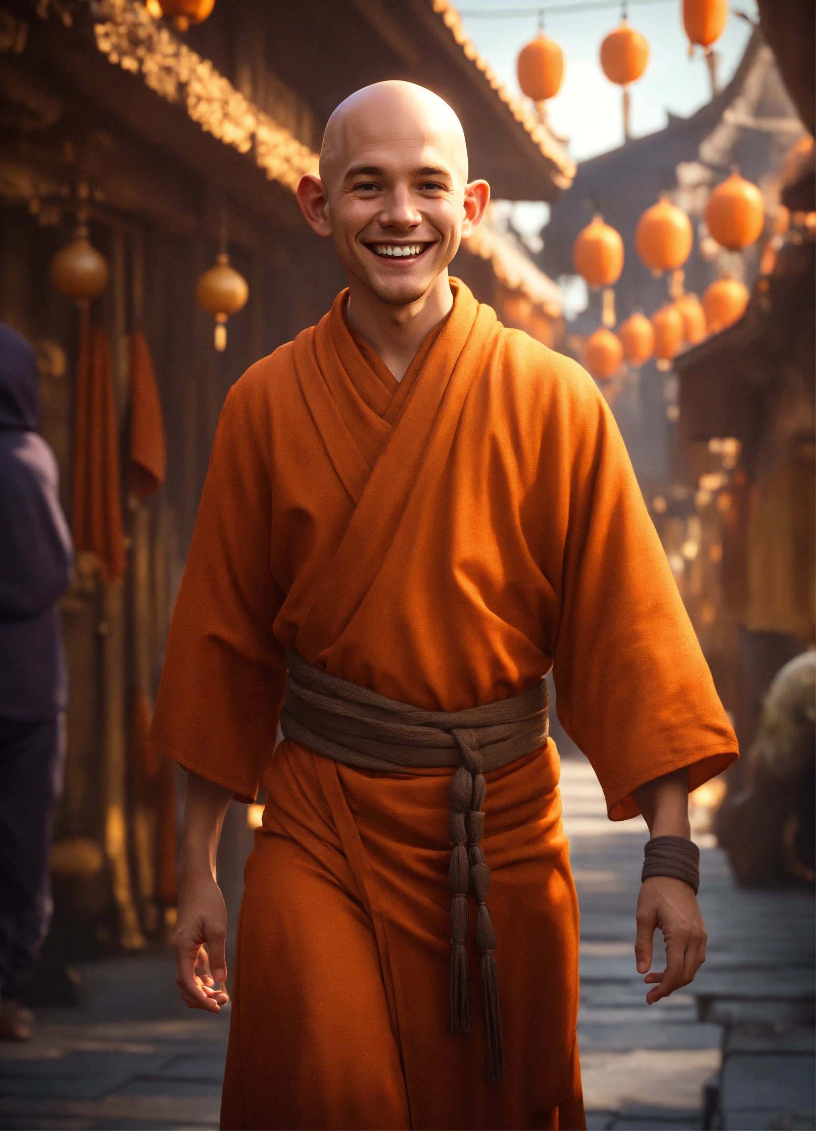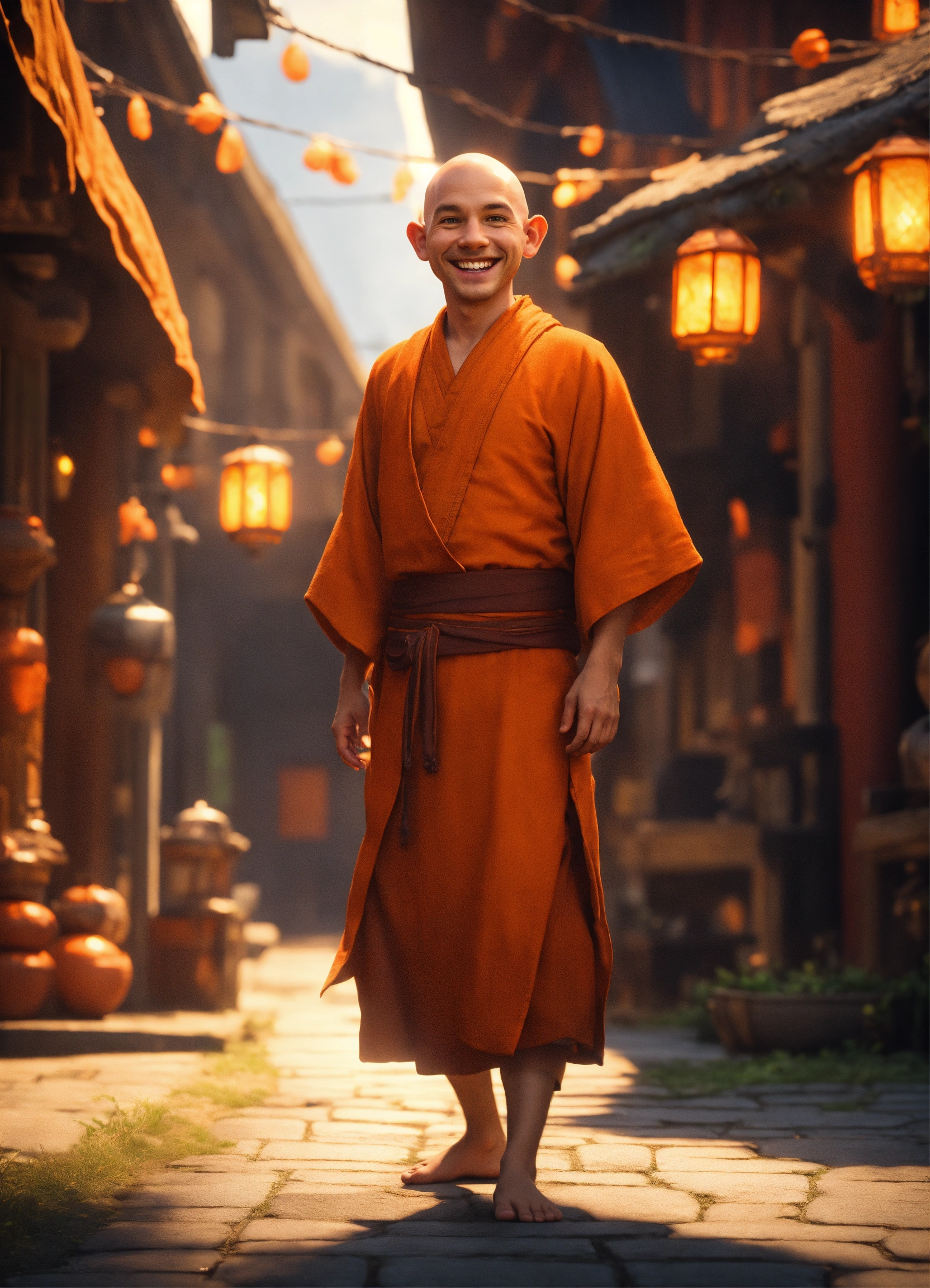 Detailed skinny childlike male halfling grinning with mischievous expression wearing orange monk robes in town, bald head with ponytail on top of head, stephen bliss, unreal engine, radiant light