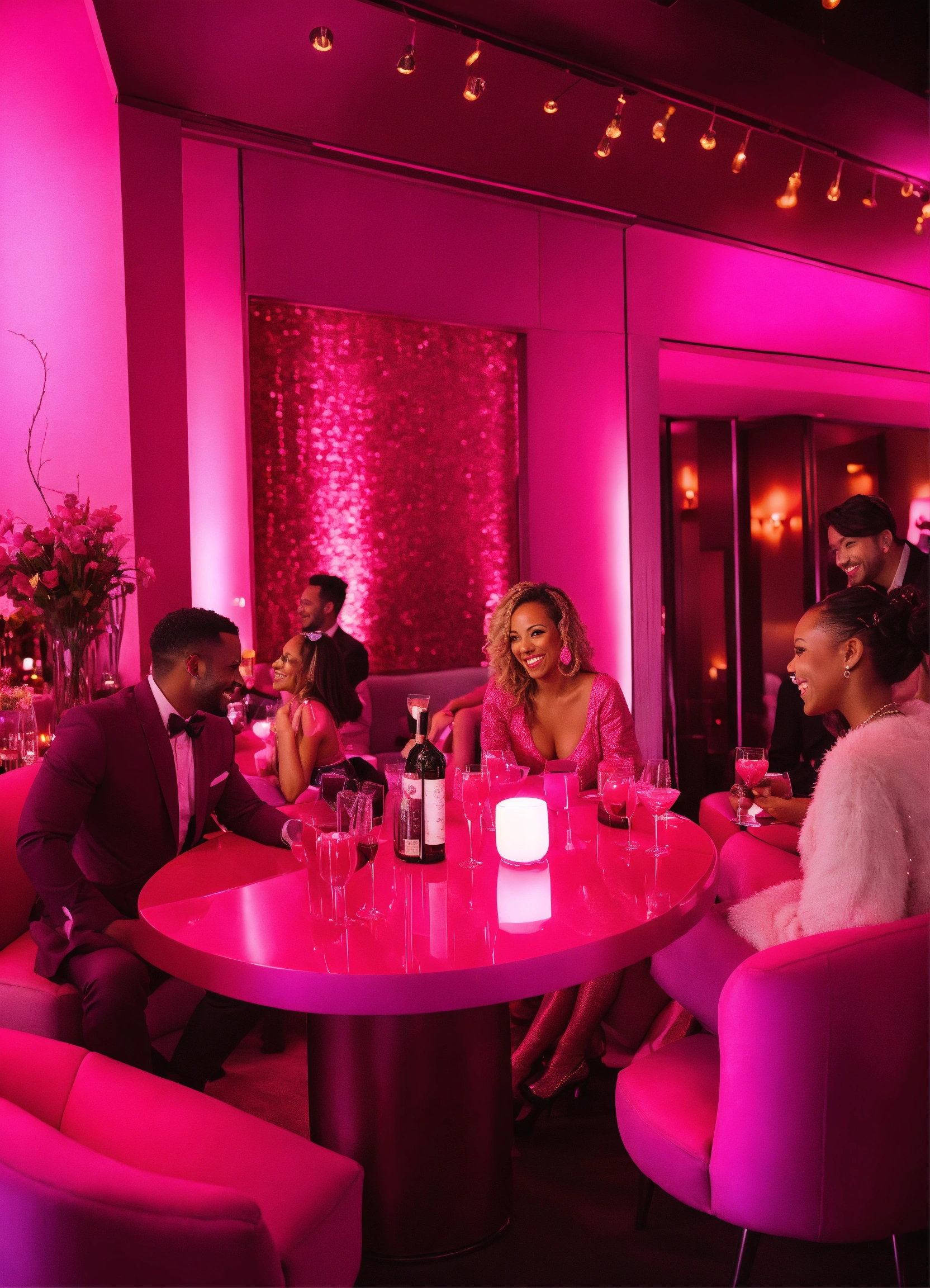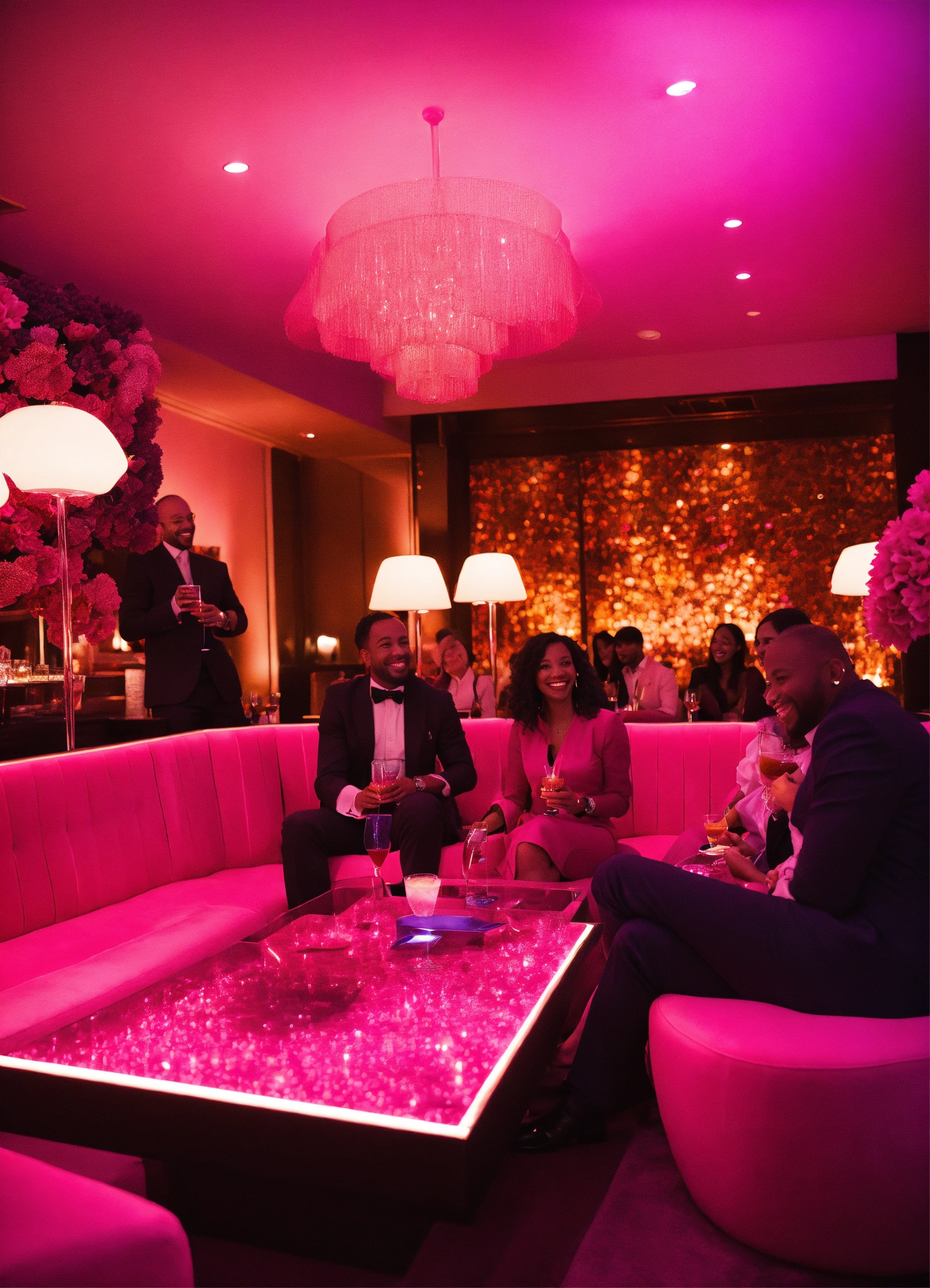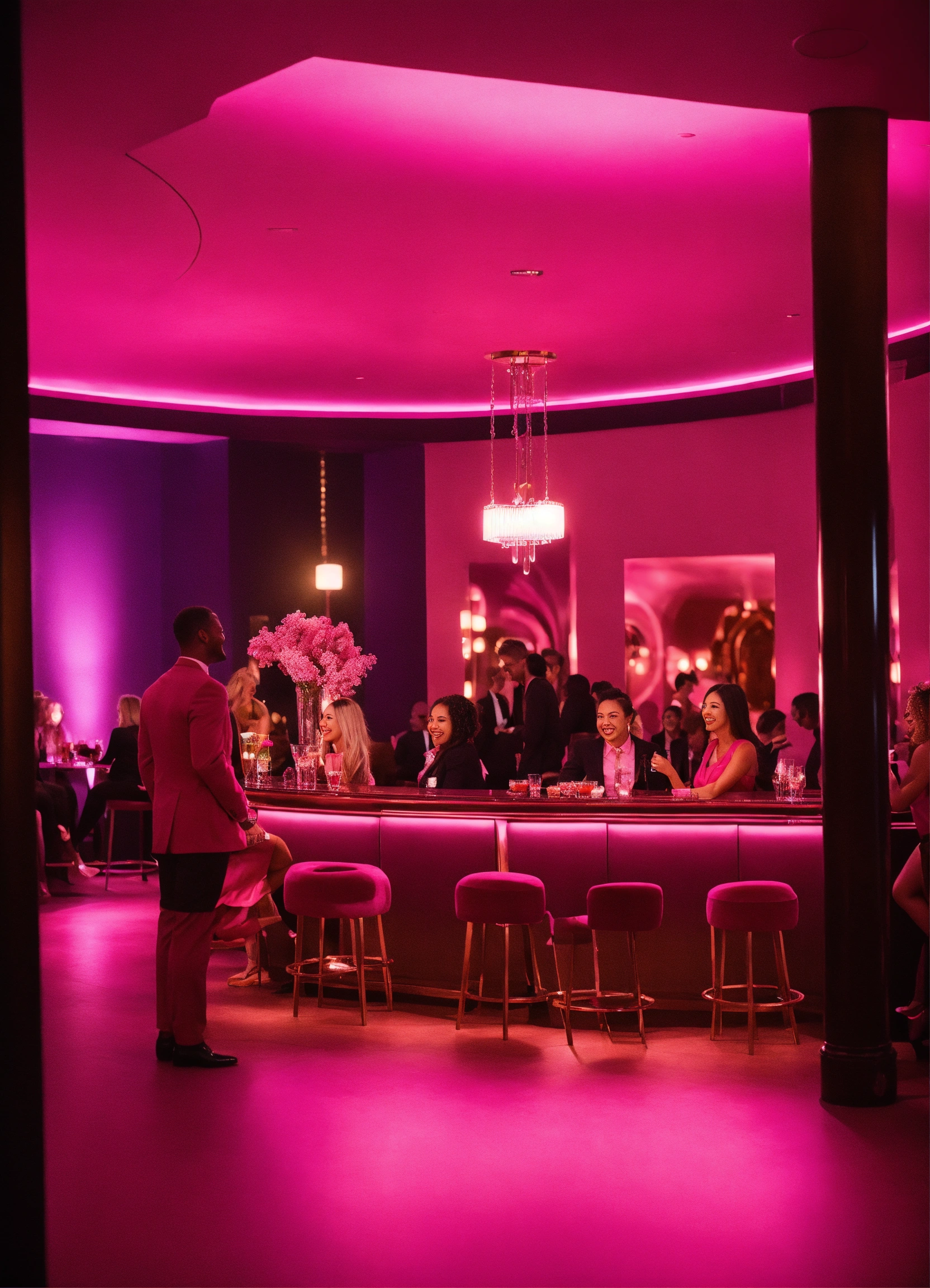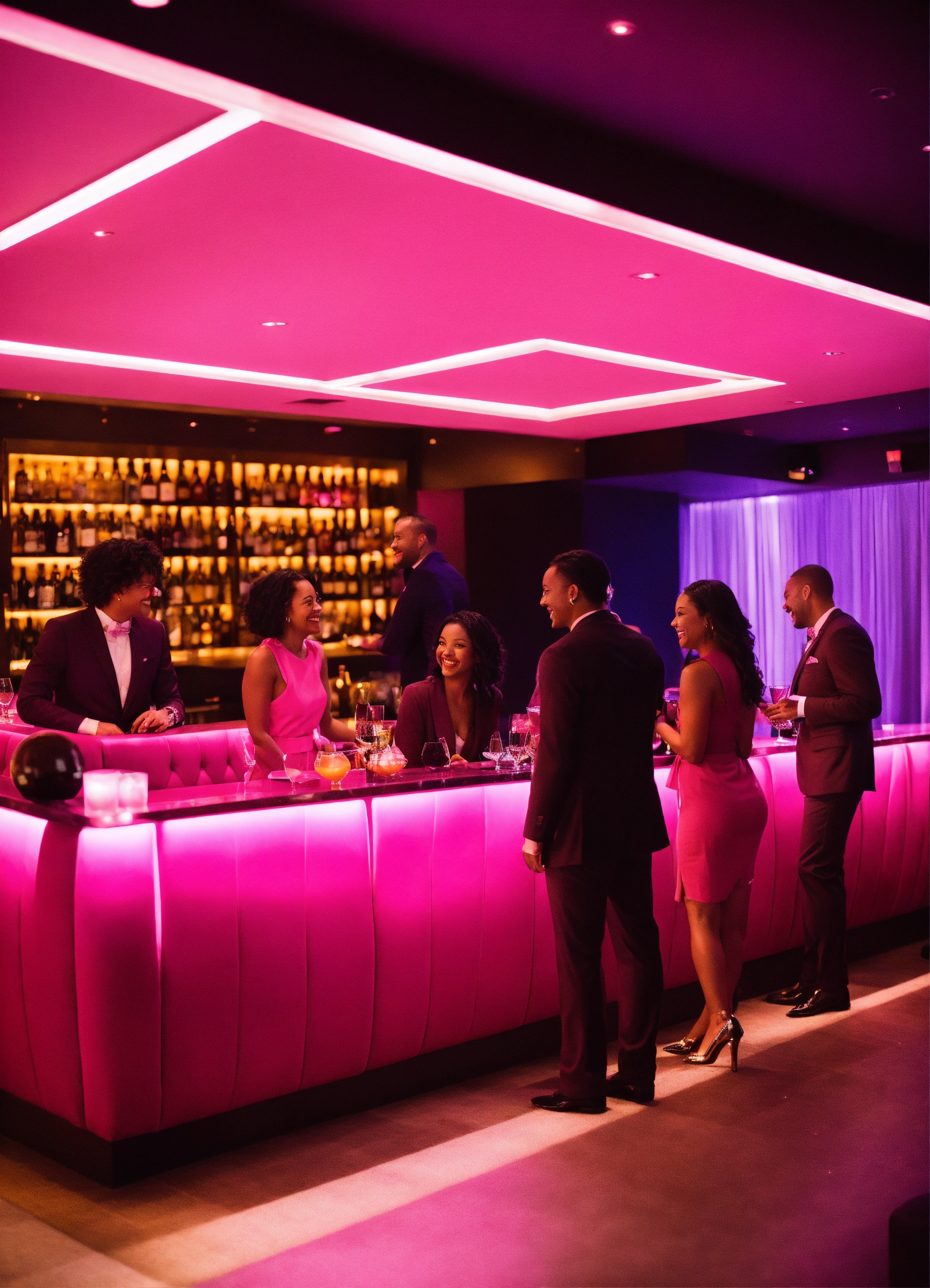 A long shot of a diverse group of people in a dark pink cocktail lounge setting talking, smiling, networking classy pink attire.