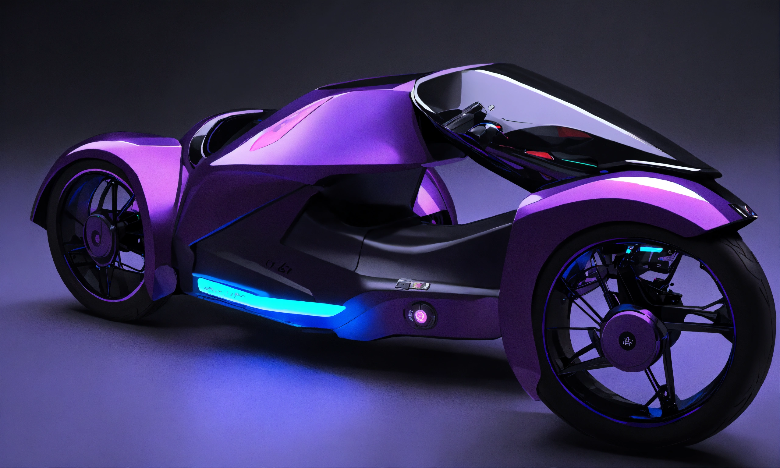 Concept futuristic, 3-wheel tricycle, black colour, design sheet, purple and black light, 3-wheel tricycle, top-down view